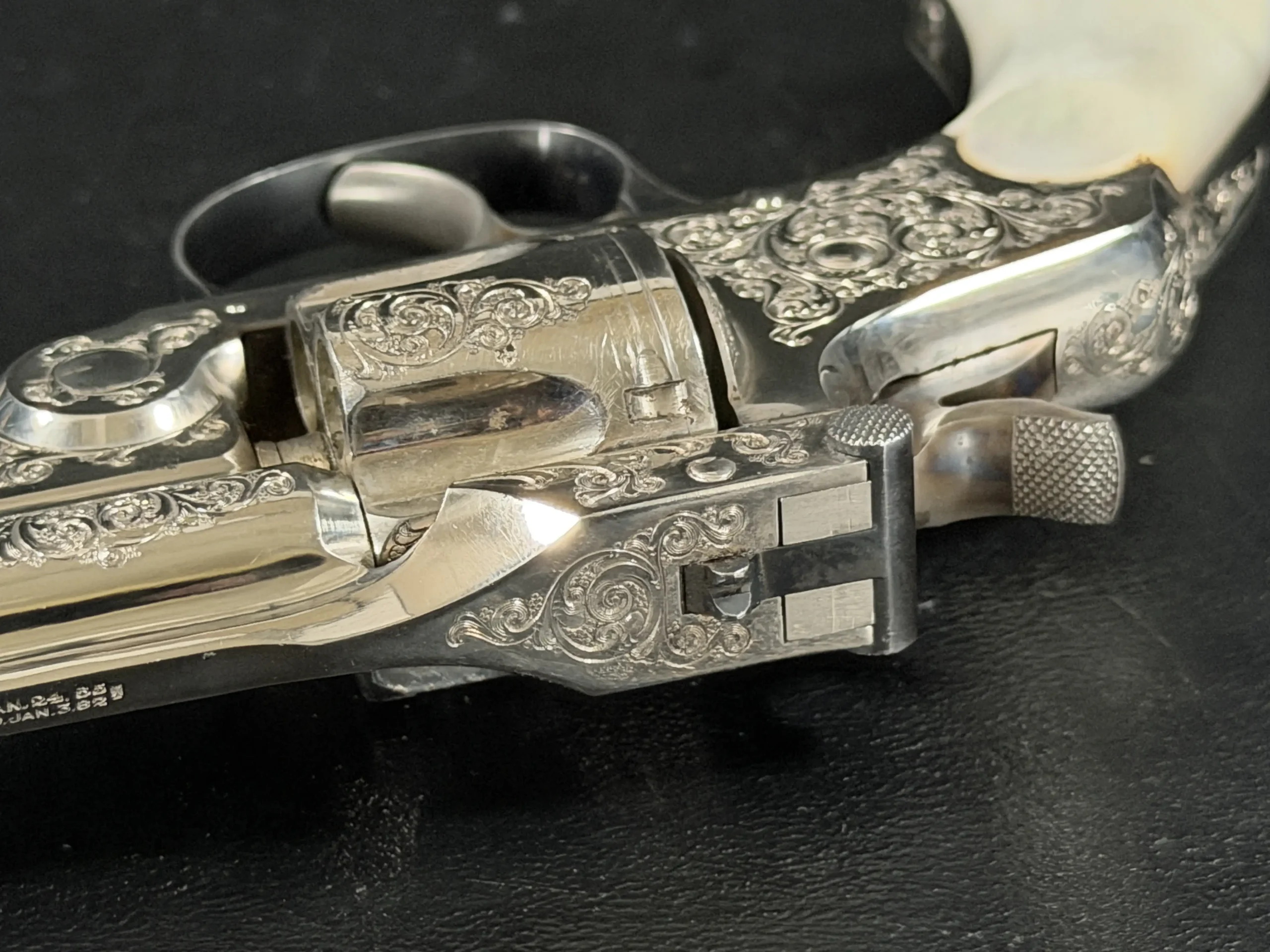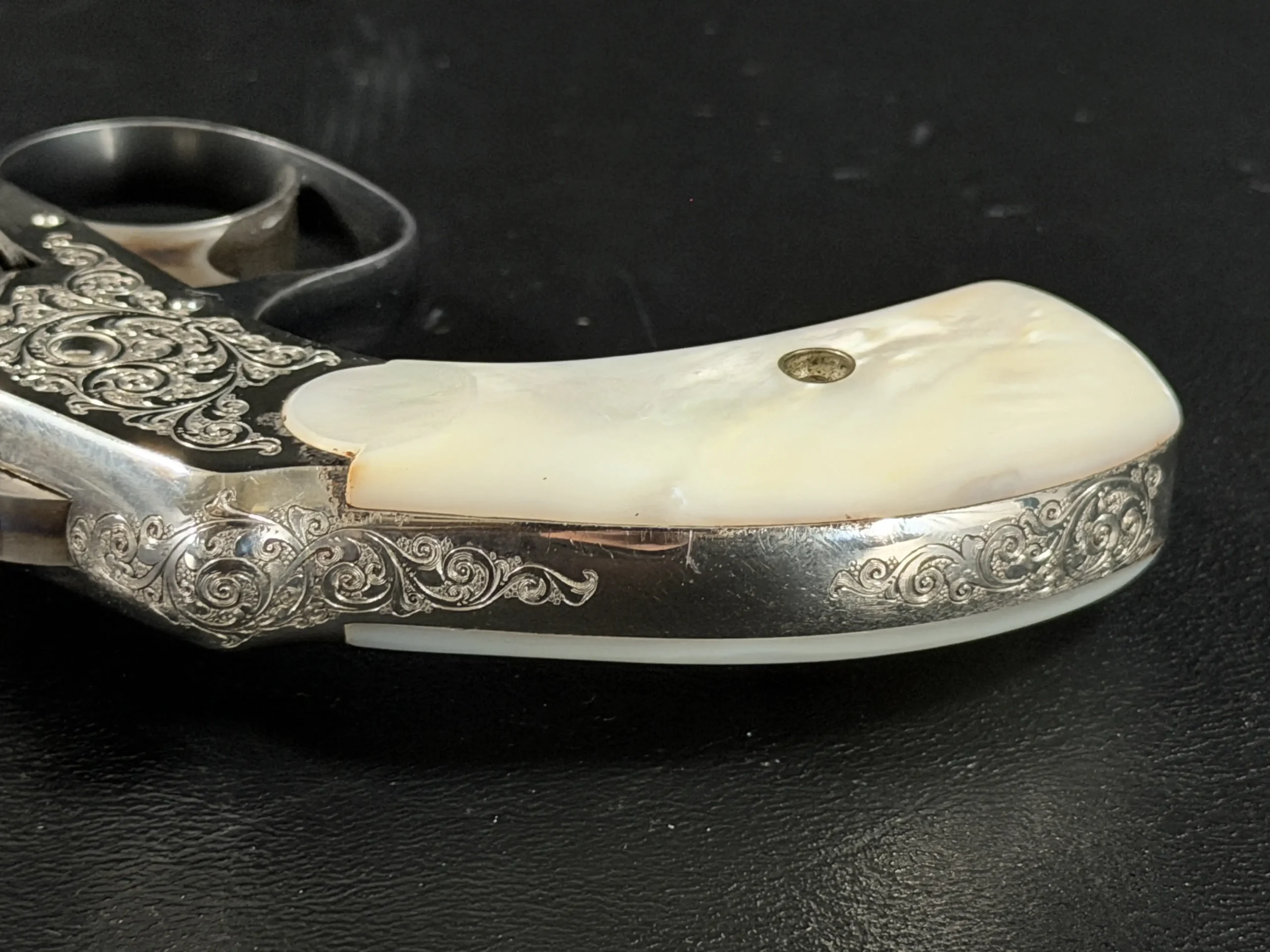 The finish, paired with mother-of-pearl grips, creates a striking contrast: cool, reflective steel against the soft, organic glow of pearl. It’s the kind of combination that was never meant for utility alone. This was built to be admired.