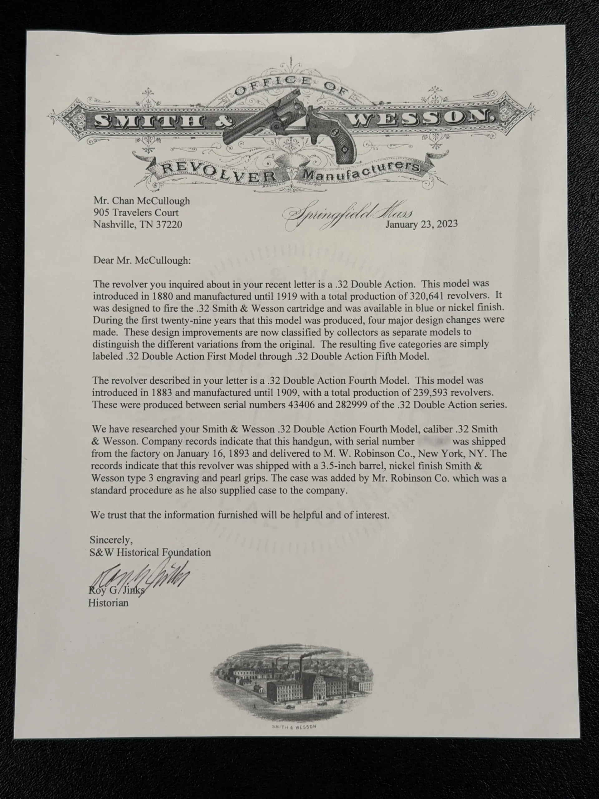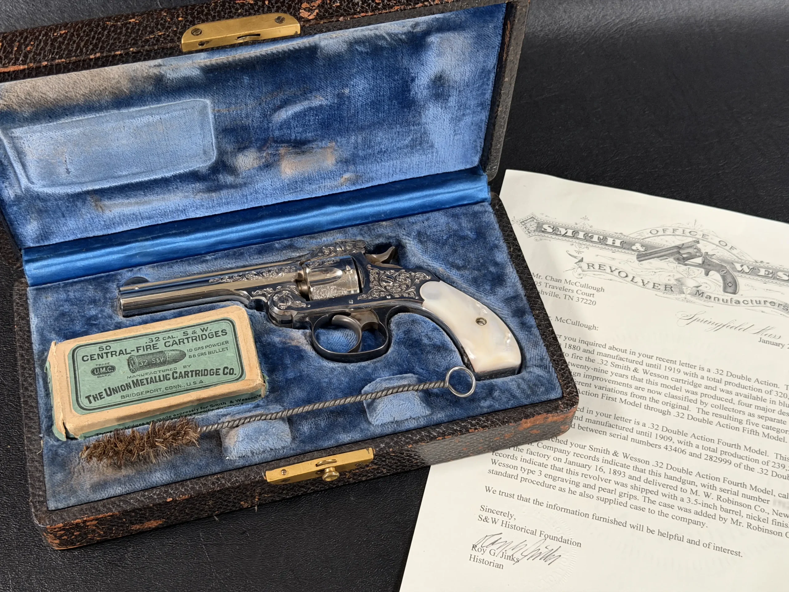 Accompanied by a factory historical letter, this revolver is confirmed as a .32 Double Action Fourth Model, originally shipped in the late 19th century with a 3.5-inch barrel, nickel finish, and factory embellishments. Even more compelling, it was delivered to M.W. Robinson Company of New York, a well-known retailer of fine arms during the period, further reinforcing its status as a high-grade, special-order piece.