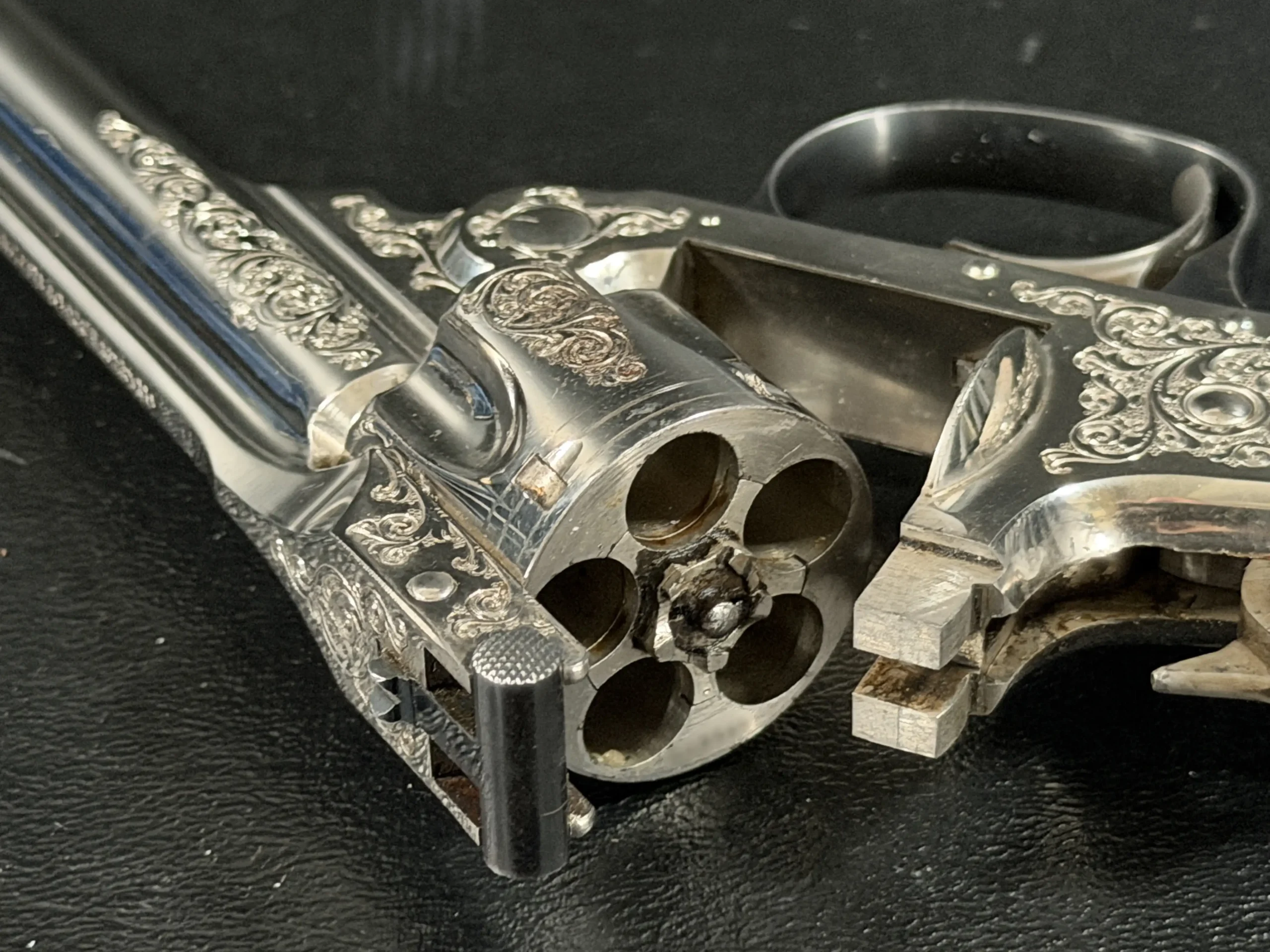 From the barrel flats to the cylinder, across the frame and into the smallest contours of the action, the engraving is both refined and confident. It doesn’t overwhelm the revolver’s form; it enhances it, following the lines of the gun in a way that feels intentional, balanced, and deeply personal.