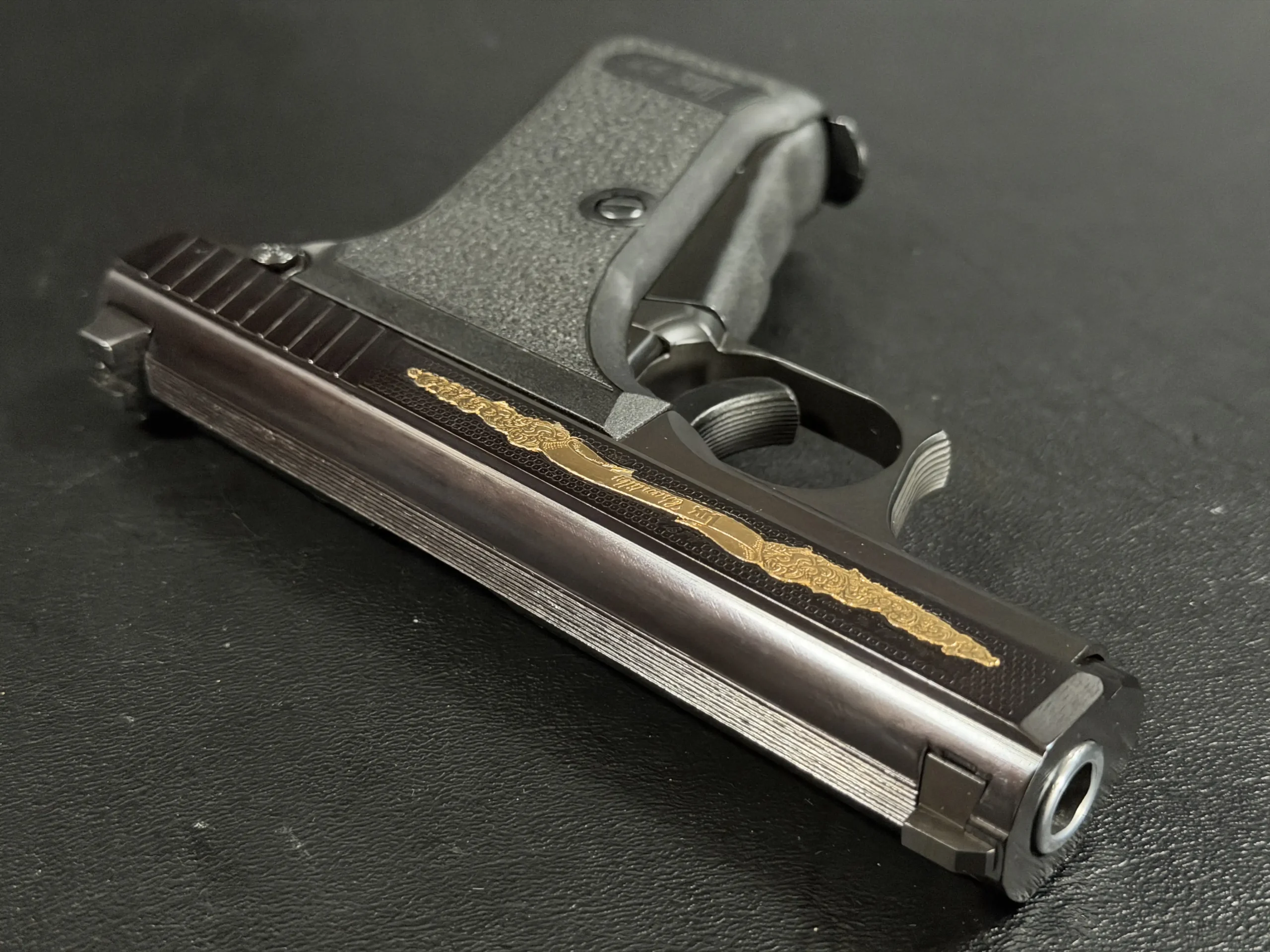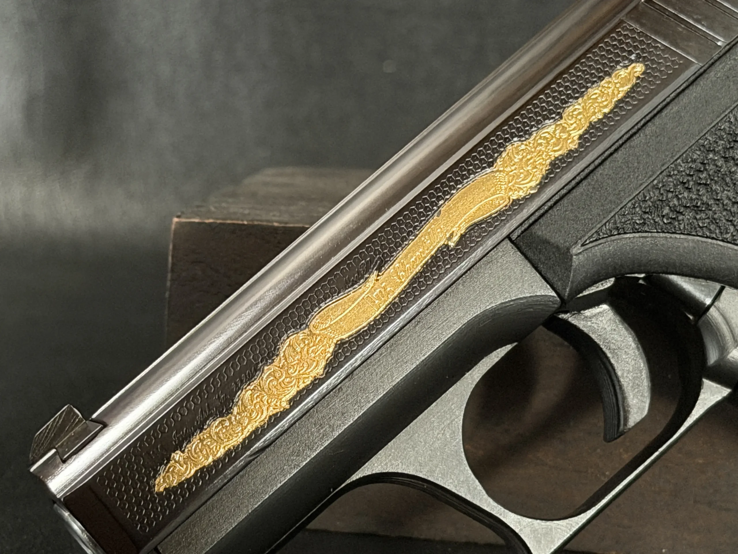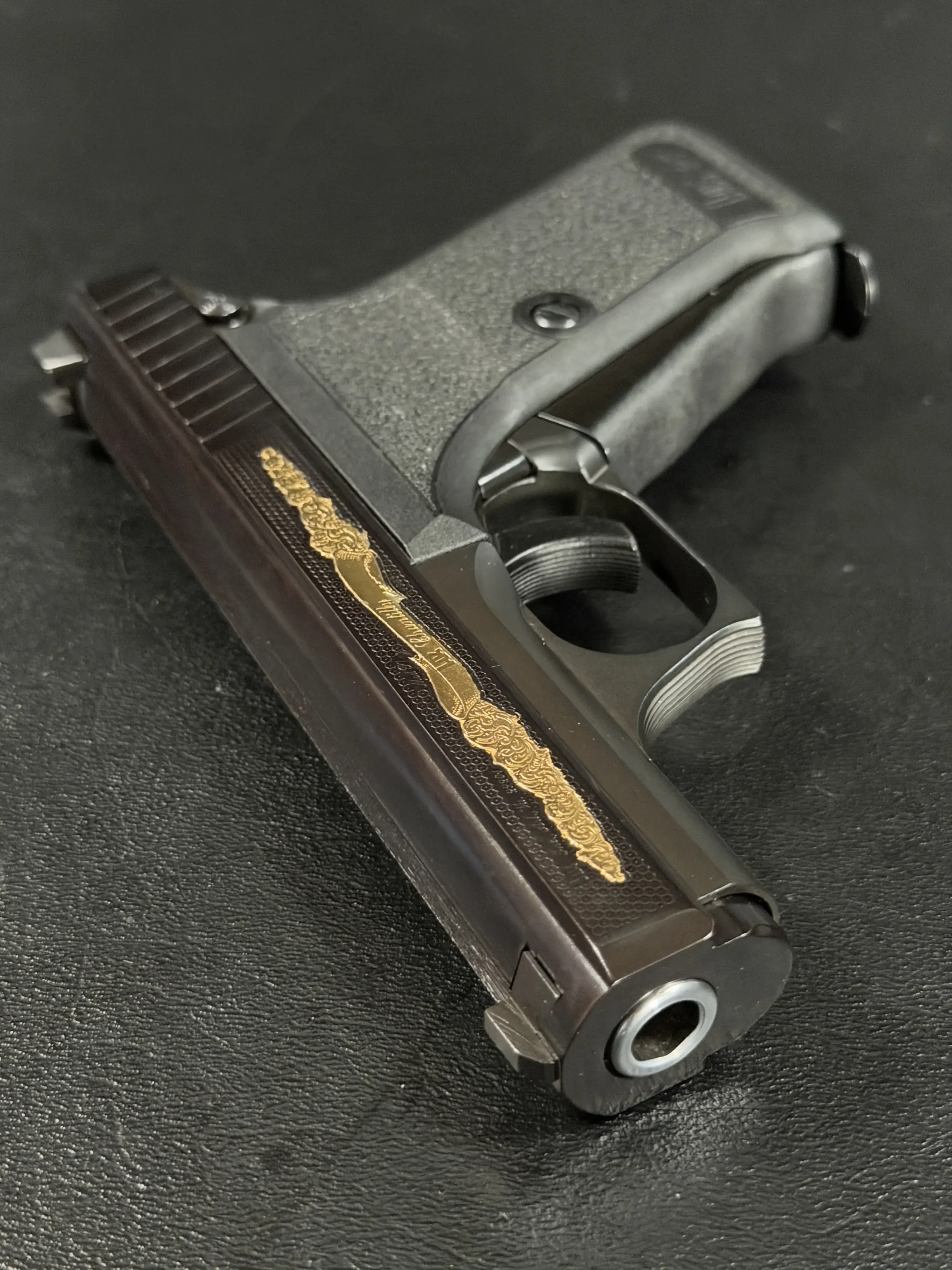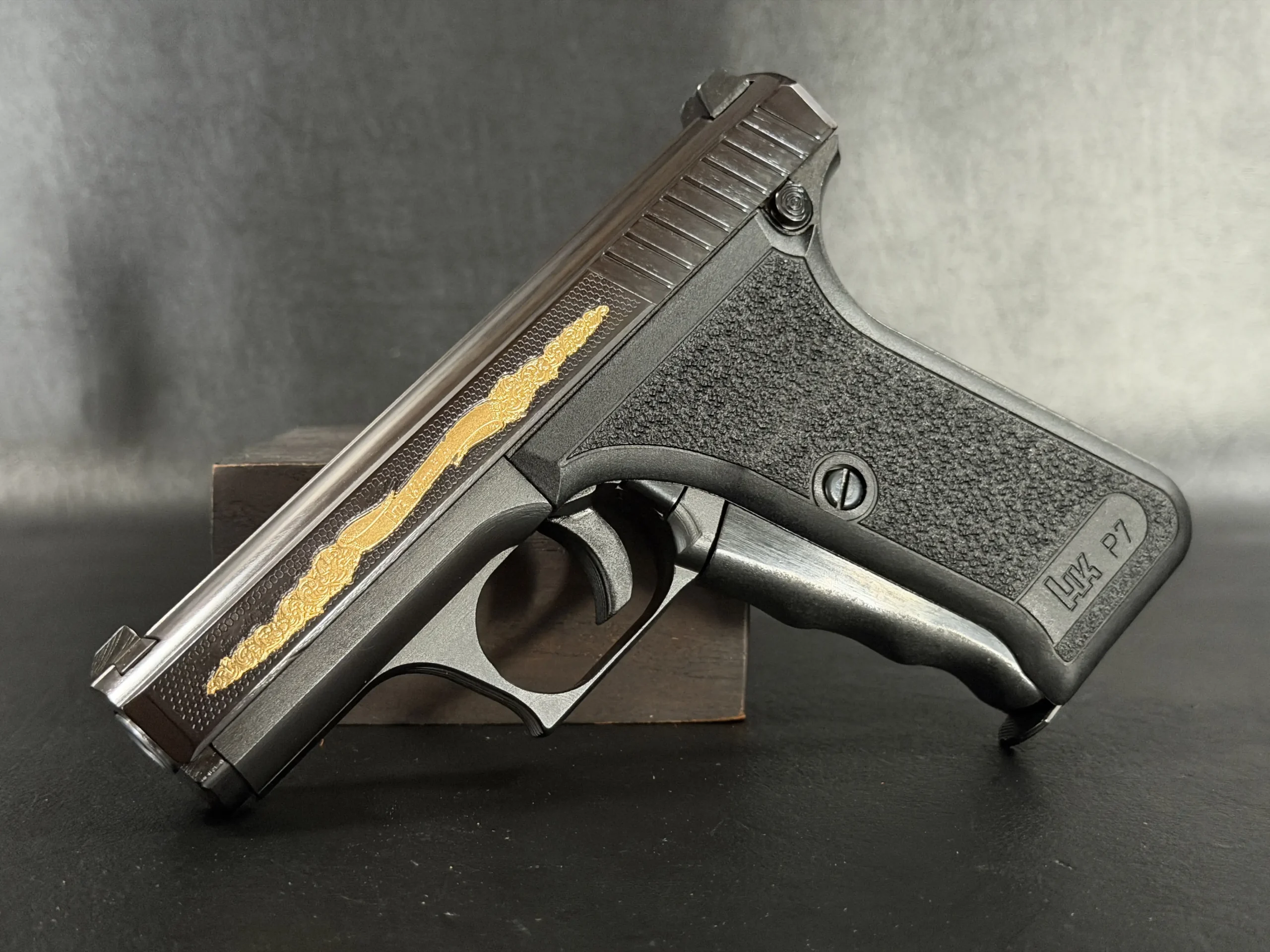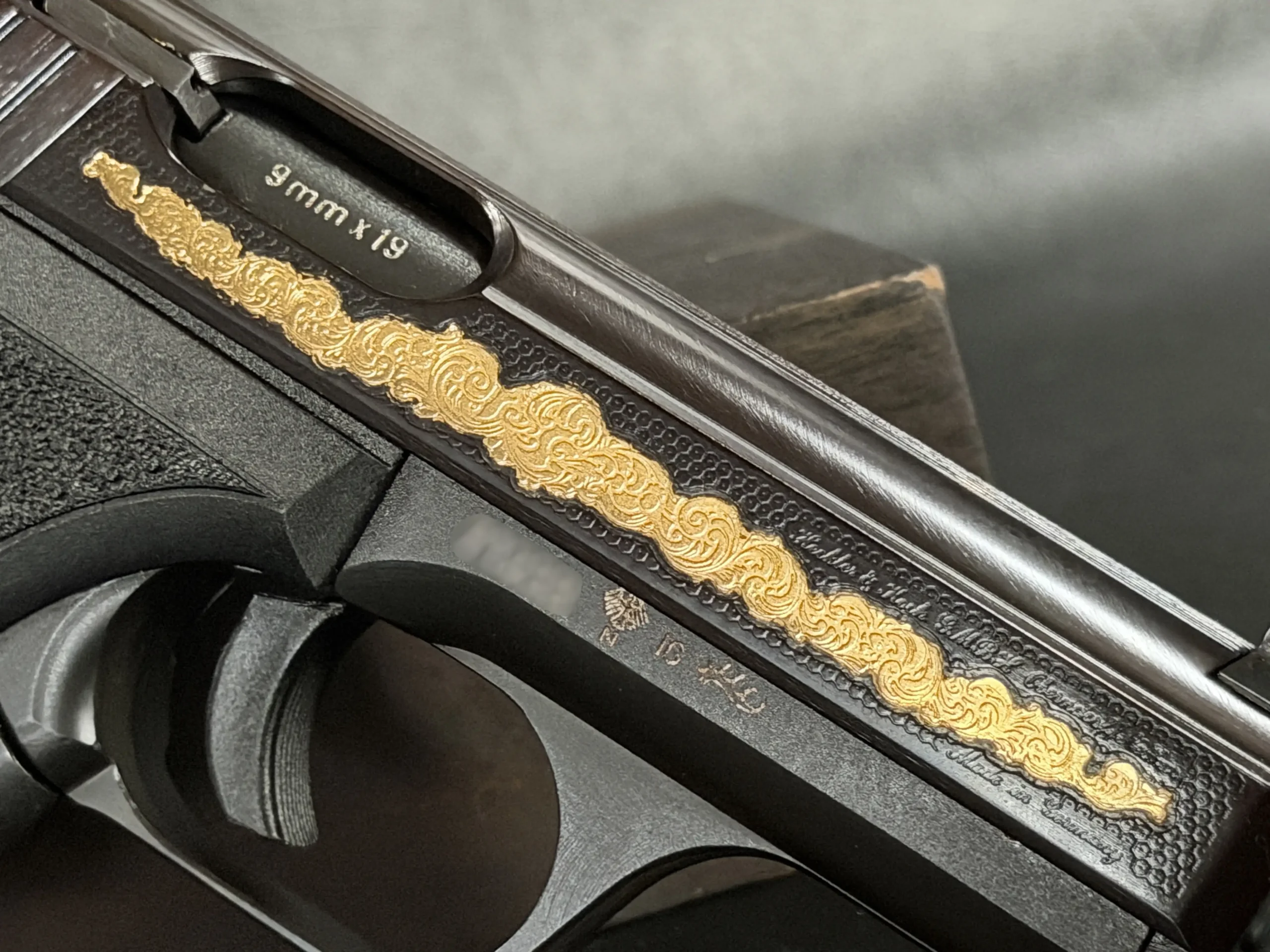 The motif itself is finely executed in gold, set against a textured background that contrasts beautifully with the pistol’s deep black finish. The flowing engraving is reminiscent of traditional European scrollwork, blending classic decorative elements with the modern industrial lines of the P7. The result is a piece that feels both contemporary and timeless—a mechanical object elevated into functional art.