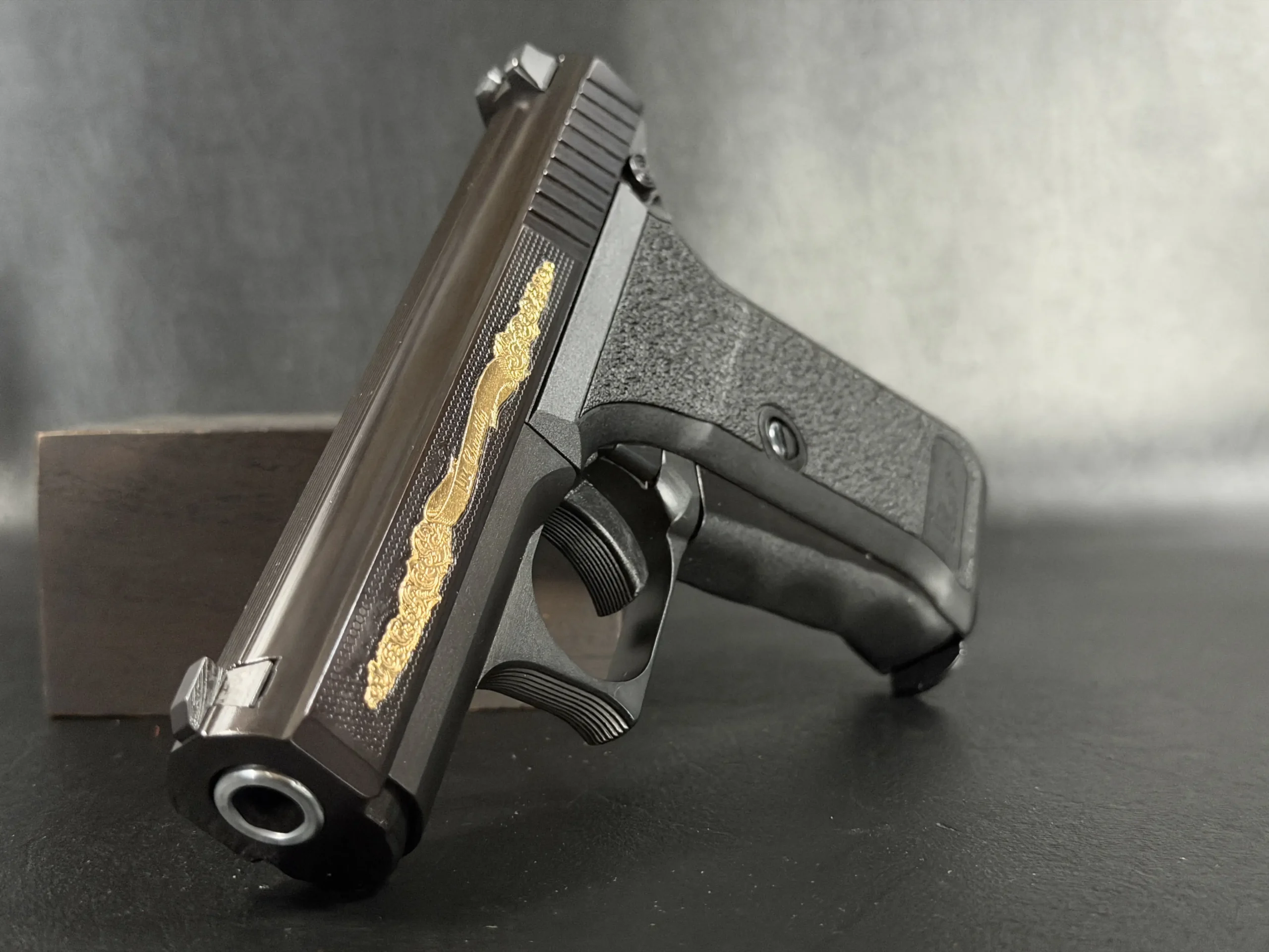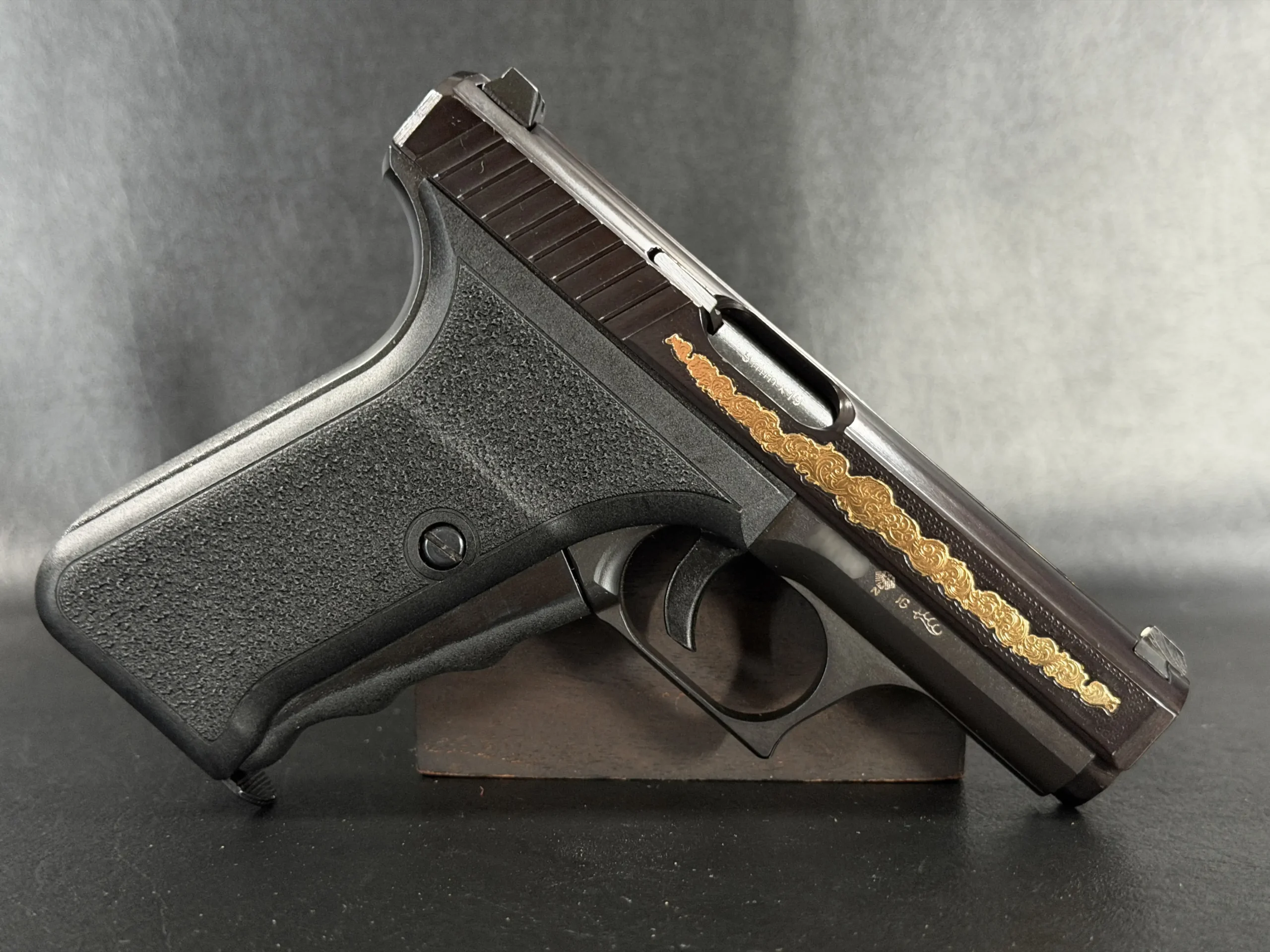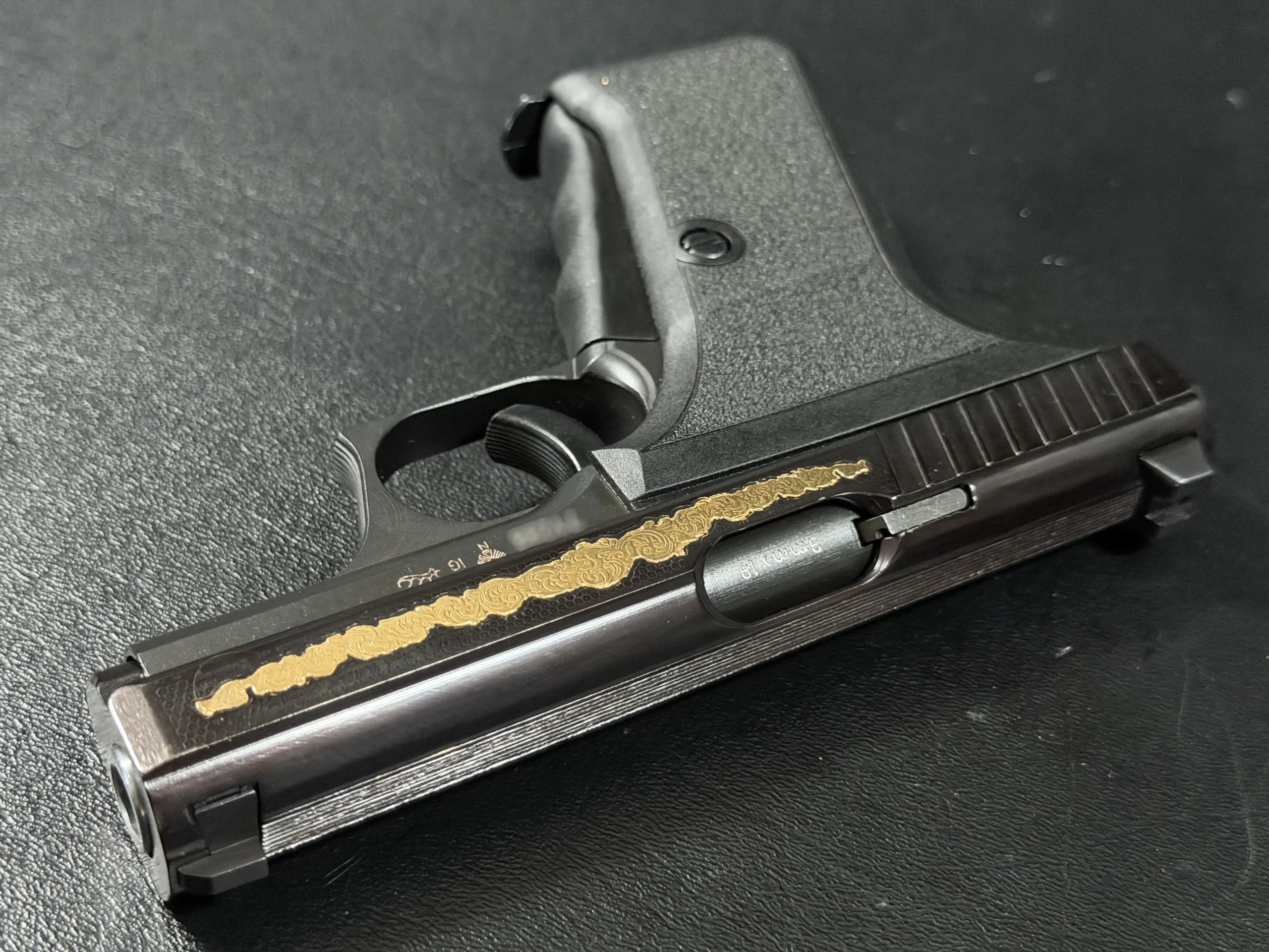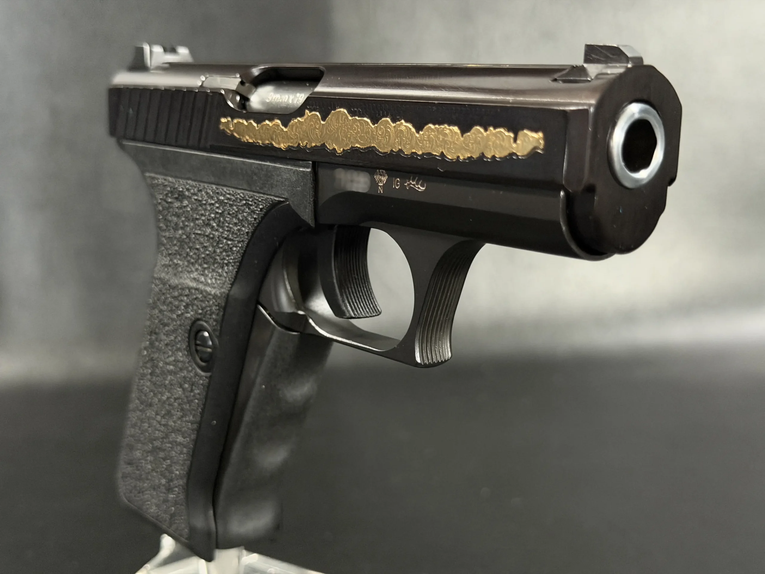 The motif itself is finely executed in gold, set against a textured background that contrasts beautifully with the pistol’s deep black finish. The flowing engraving is reminiscent of traditional European scrollwork, blending classic decorative elements with the modern industrial lines of the P7. The result is a piece that feels both contemporary and timeless—a mechanical object elevated into functional art.
