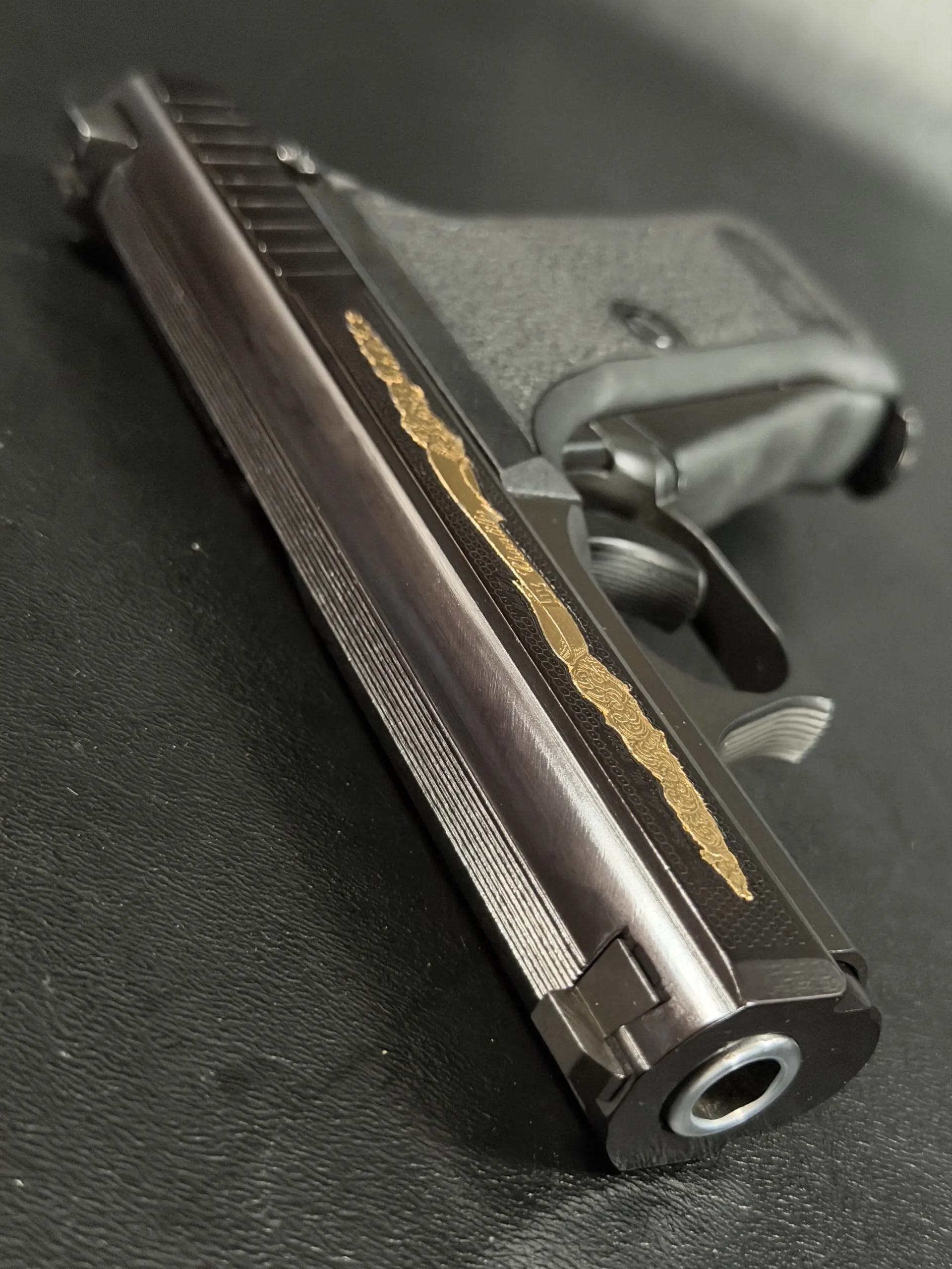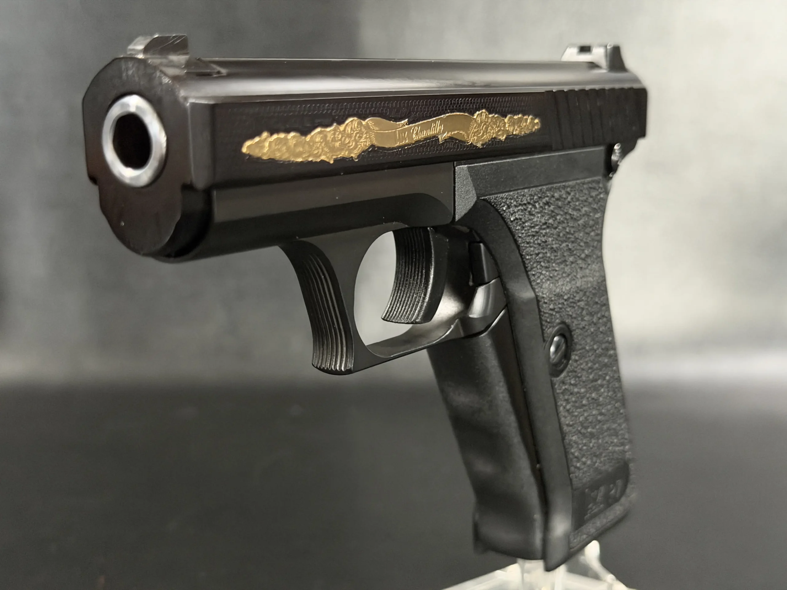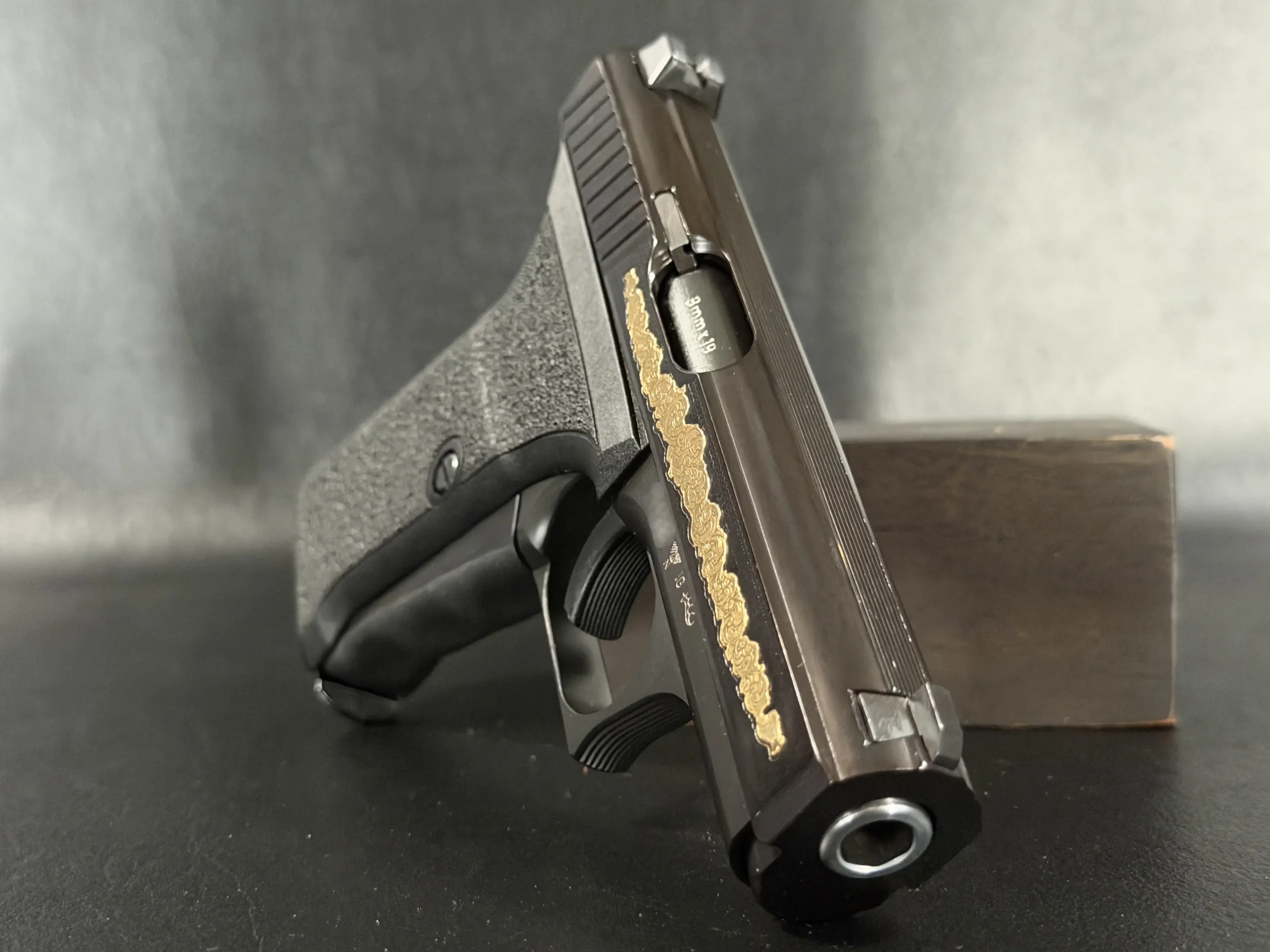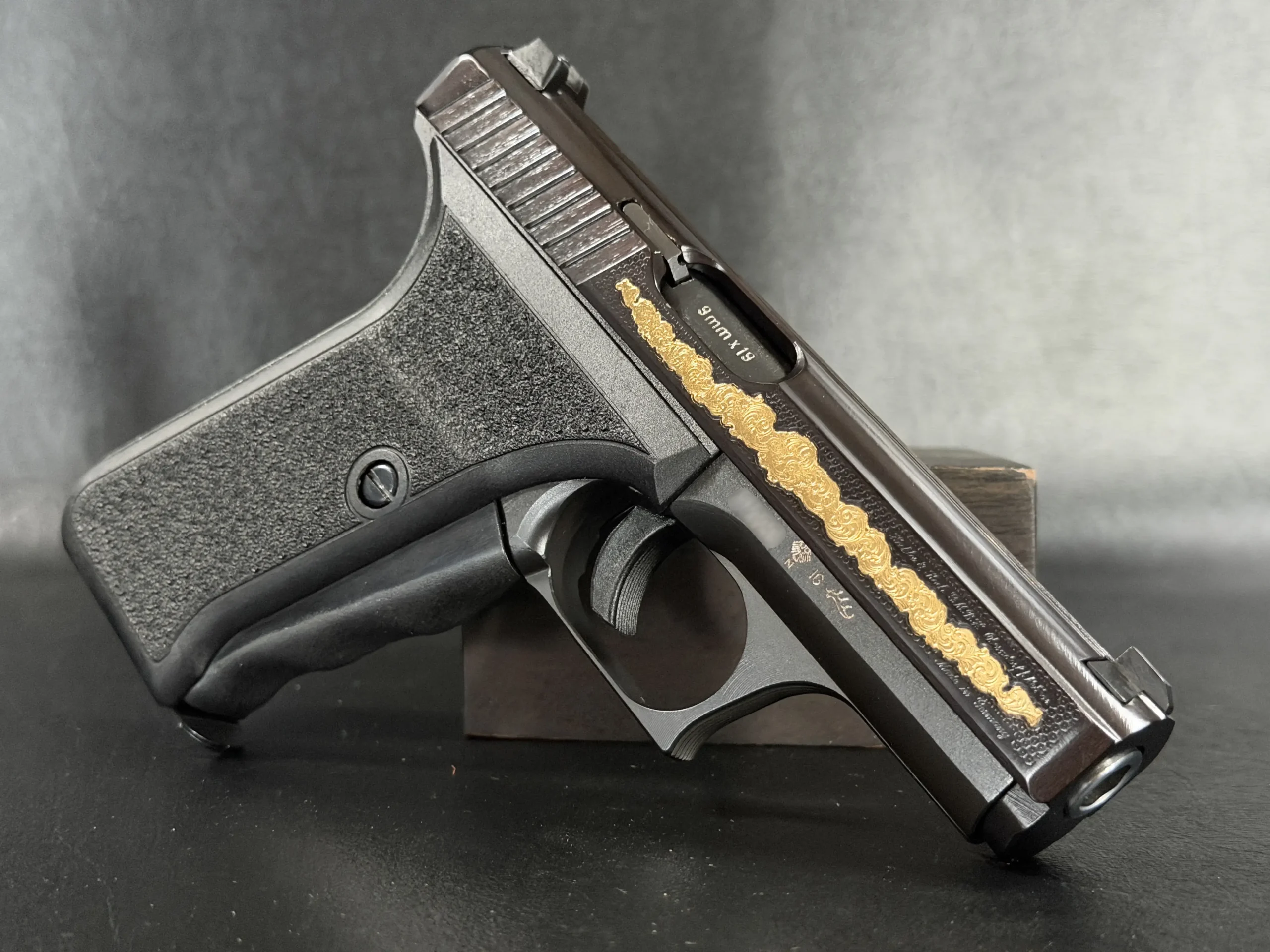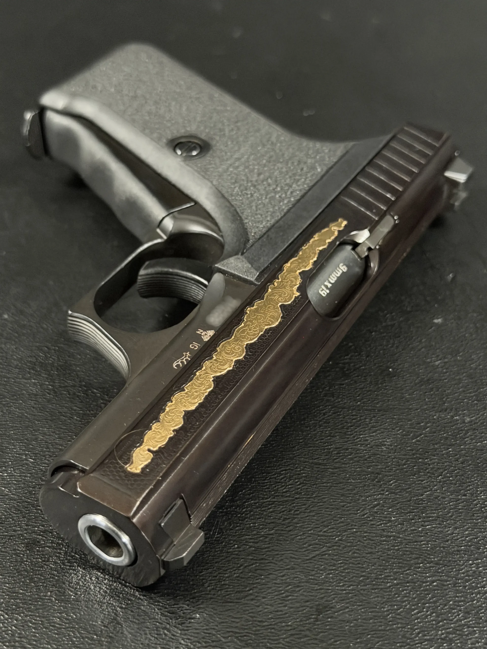 The motif itself is finely executed in gold, set against a textured background that contrasts beautifully with the pistol’s deep black finish. The flowing engraving is reminiscent of traditional European scrollwork, blending classic decorative elements with the modern industrial lines of the P7. The result is a piece that feels both contemporary and timeless—a mechanical object elevated into functional art.