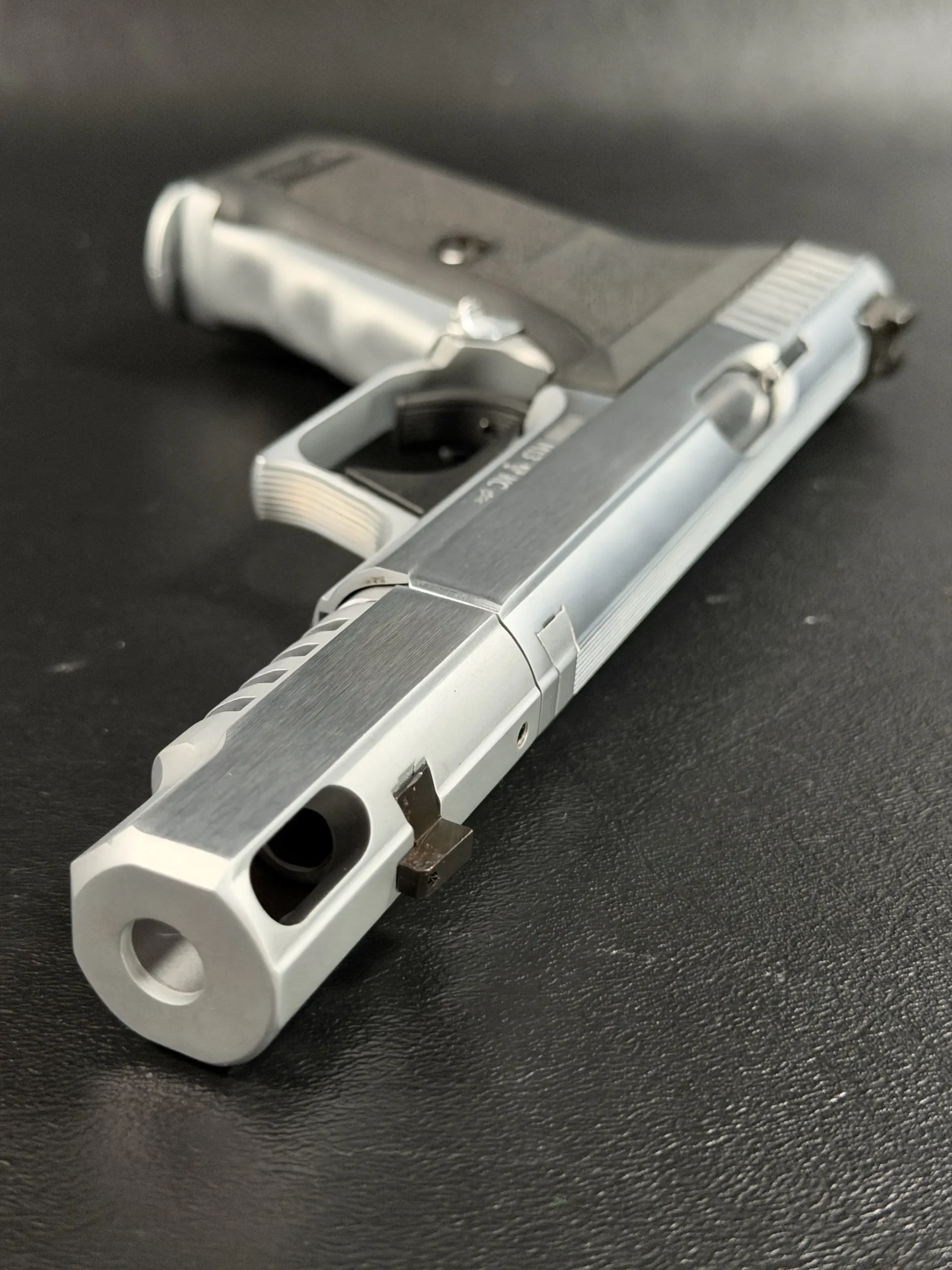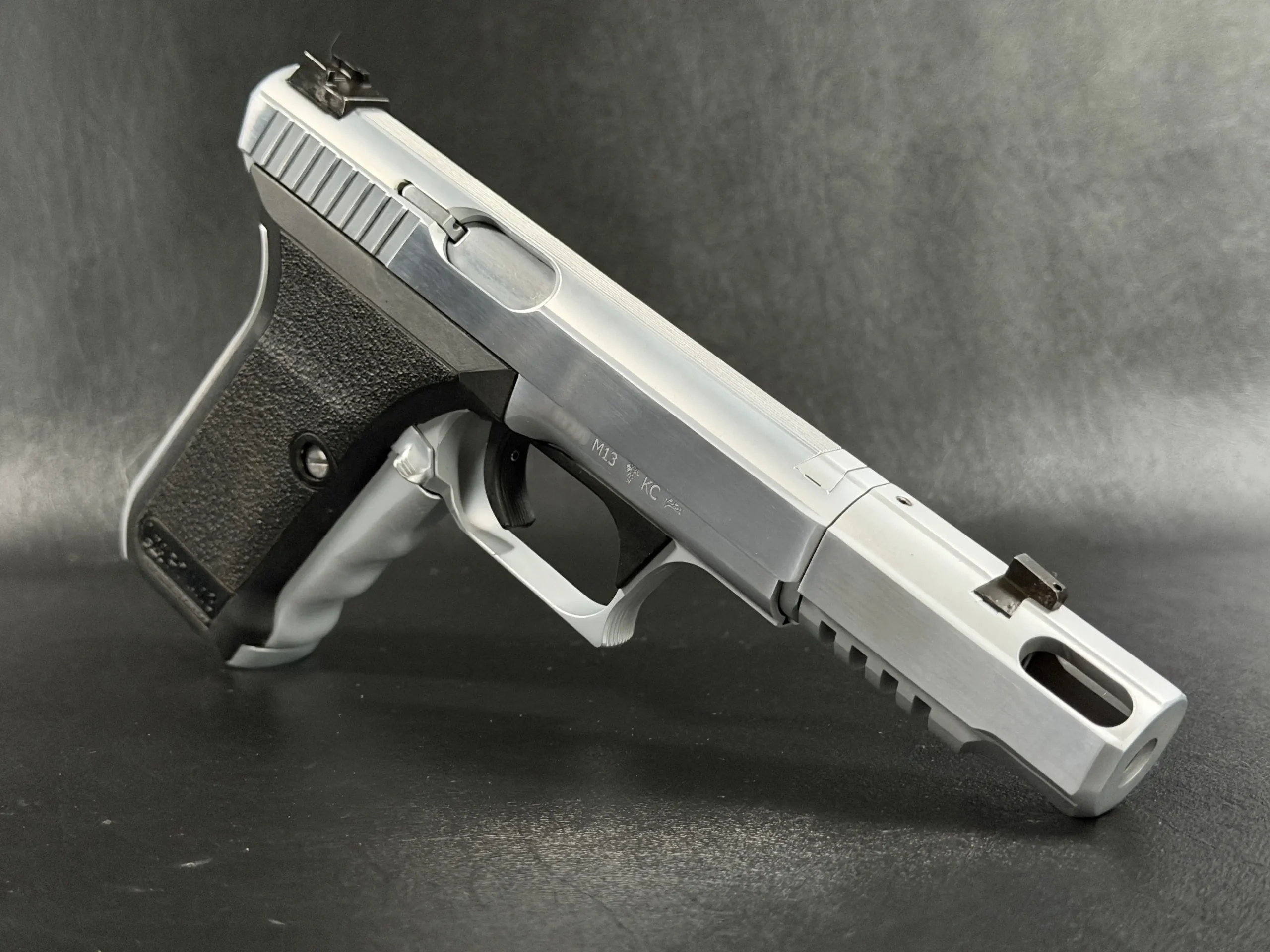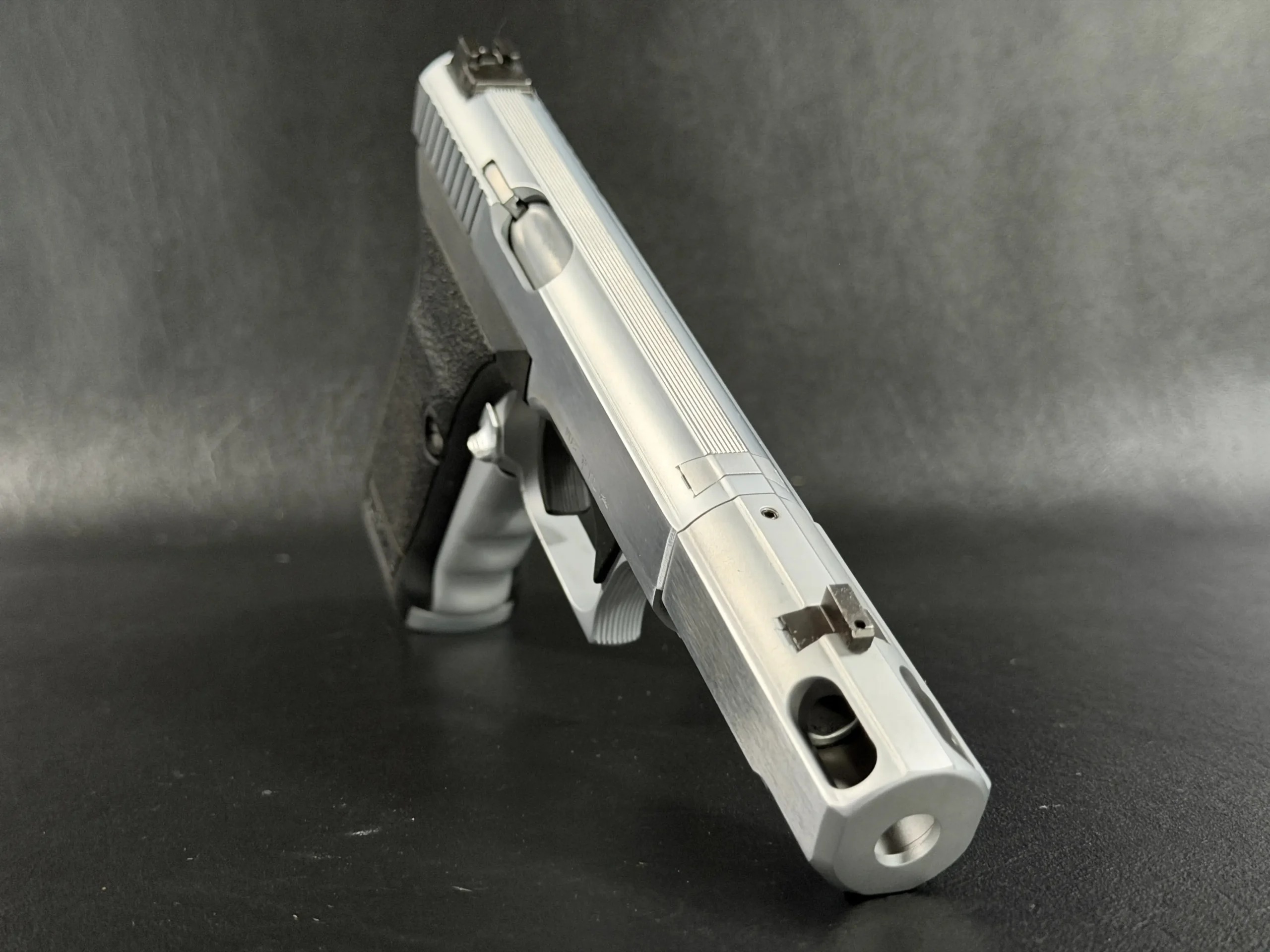 This is where engineering brilliance meets custom artistry. Presented here is a highly refined Heckler & Koch P7 M13, transformed into an eye-catching Nickel Long Slide configuration complete with a precision-machined compensator. The result is a striking, elevated interpretation of one of HK’s most iconic and technically advanced pistols.