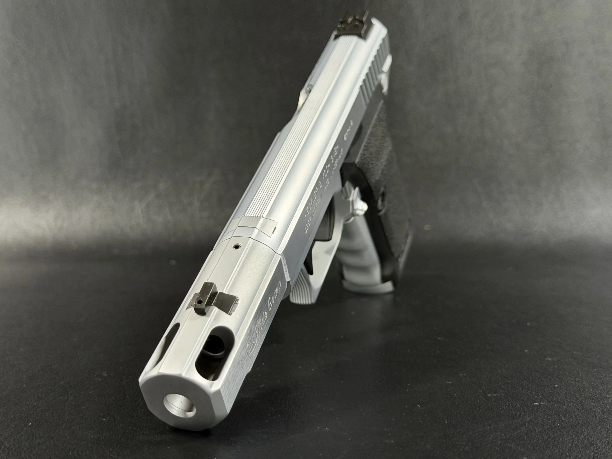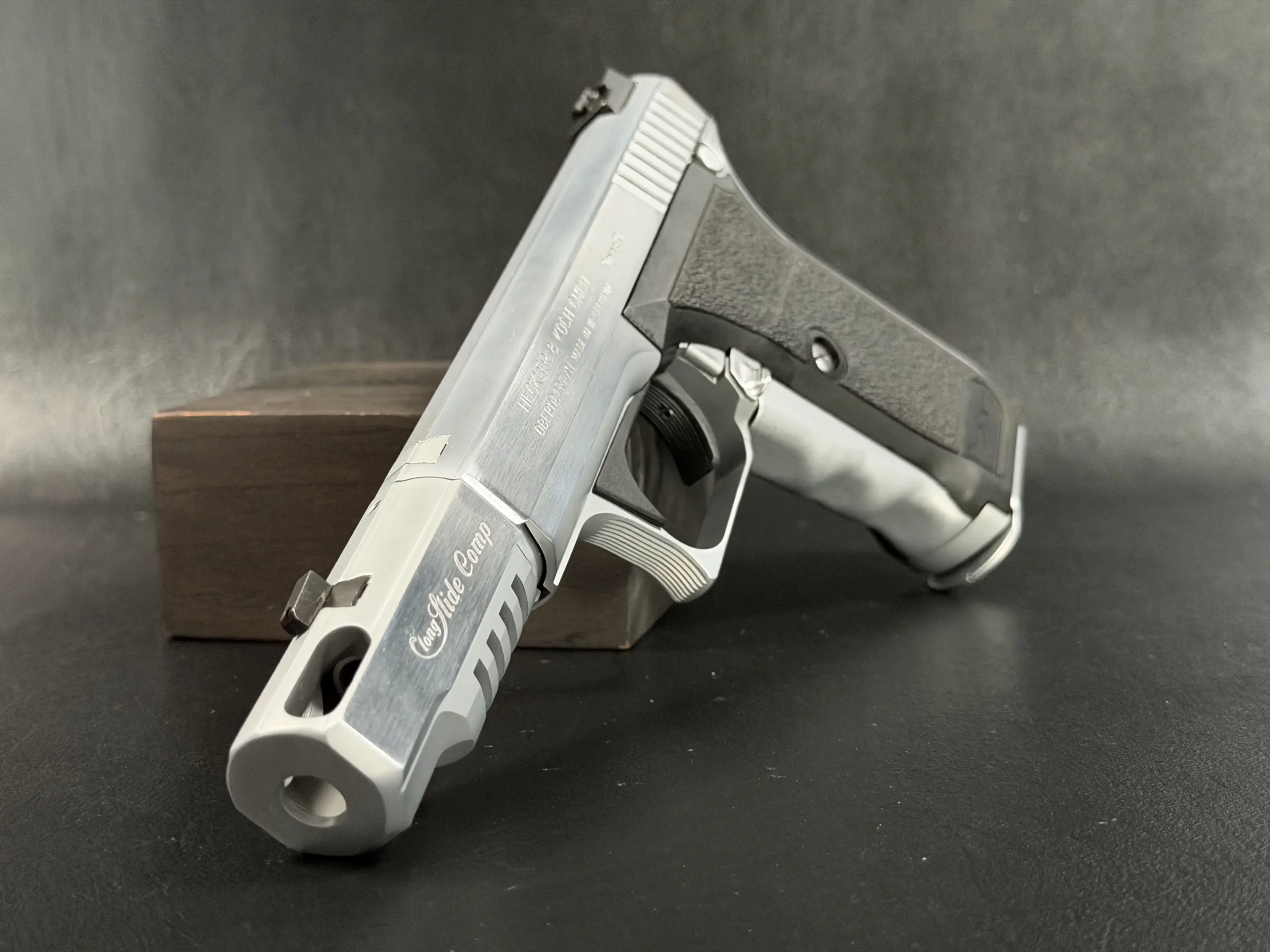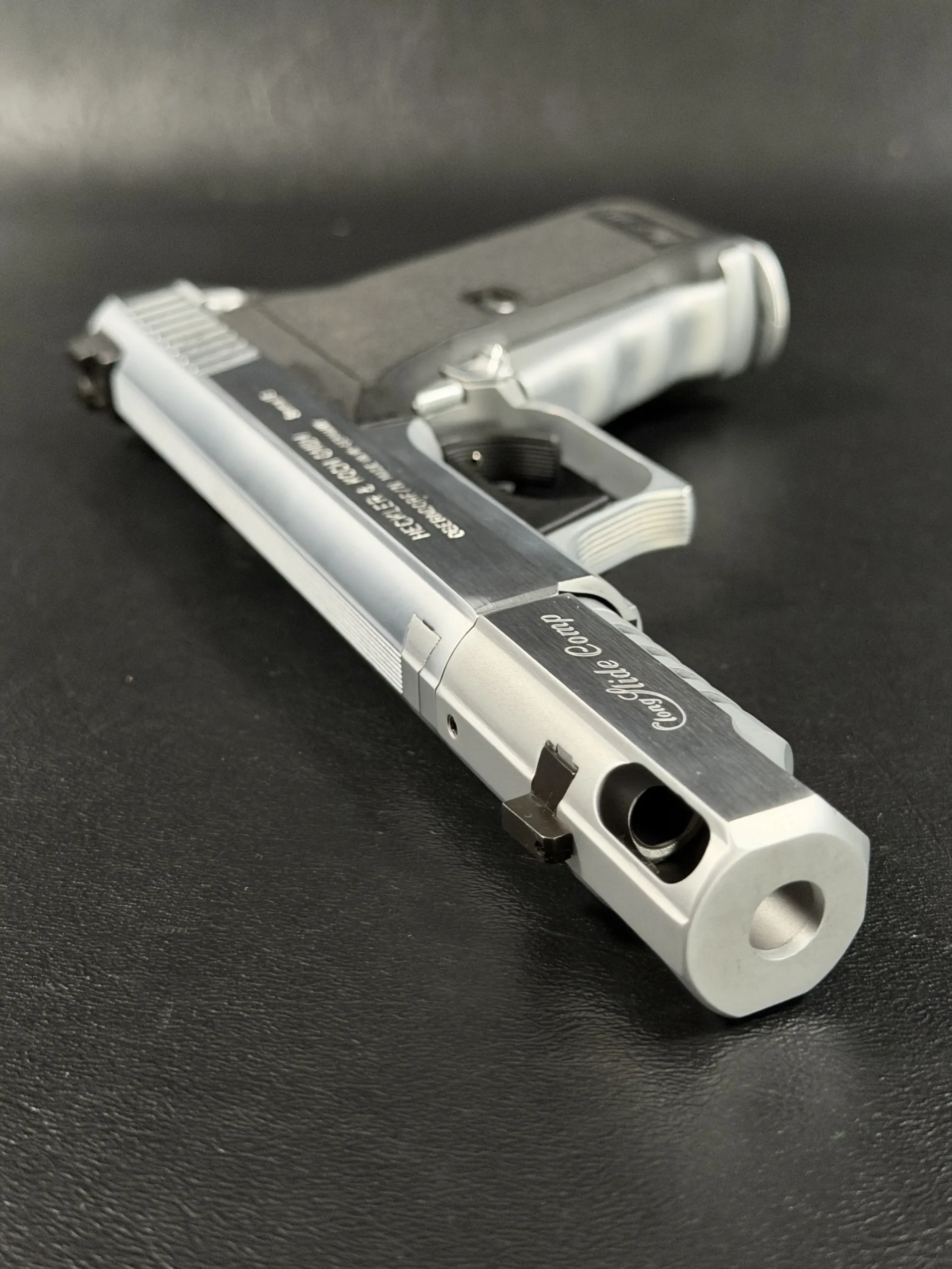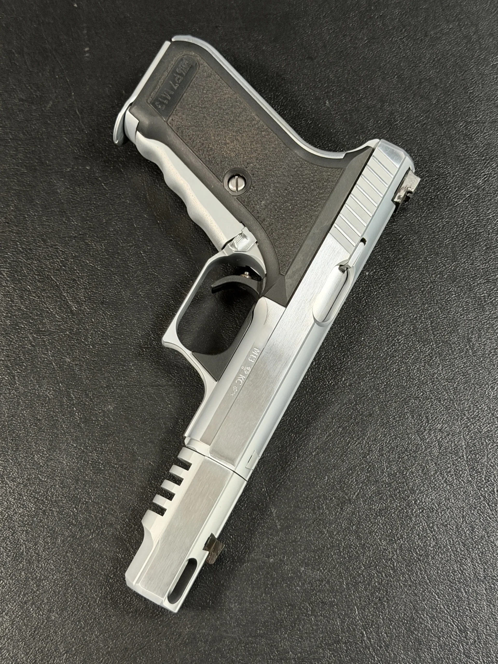 This is where engineering brilliance meets custom artistry. Presented here is a highly refined Heckler & Koch P7 M13, transformed into an eye-catching Nickel Long Slide configuration complete with a precision-machined compensator. The result is a striking, elevated interpretation of one of HK’s most iconic and technically advanced pistols.