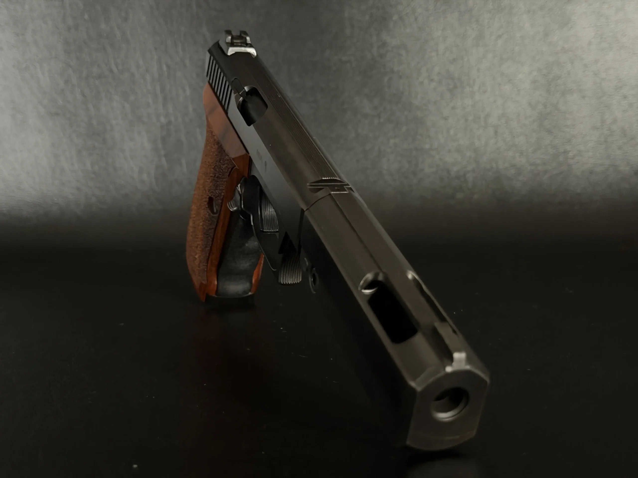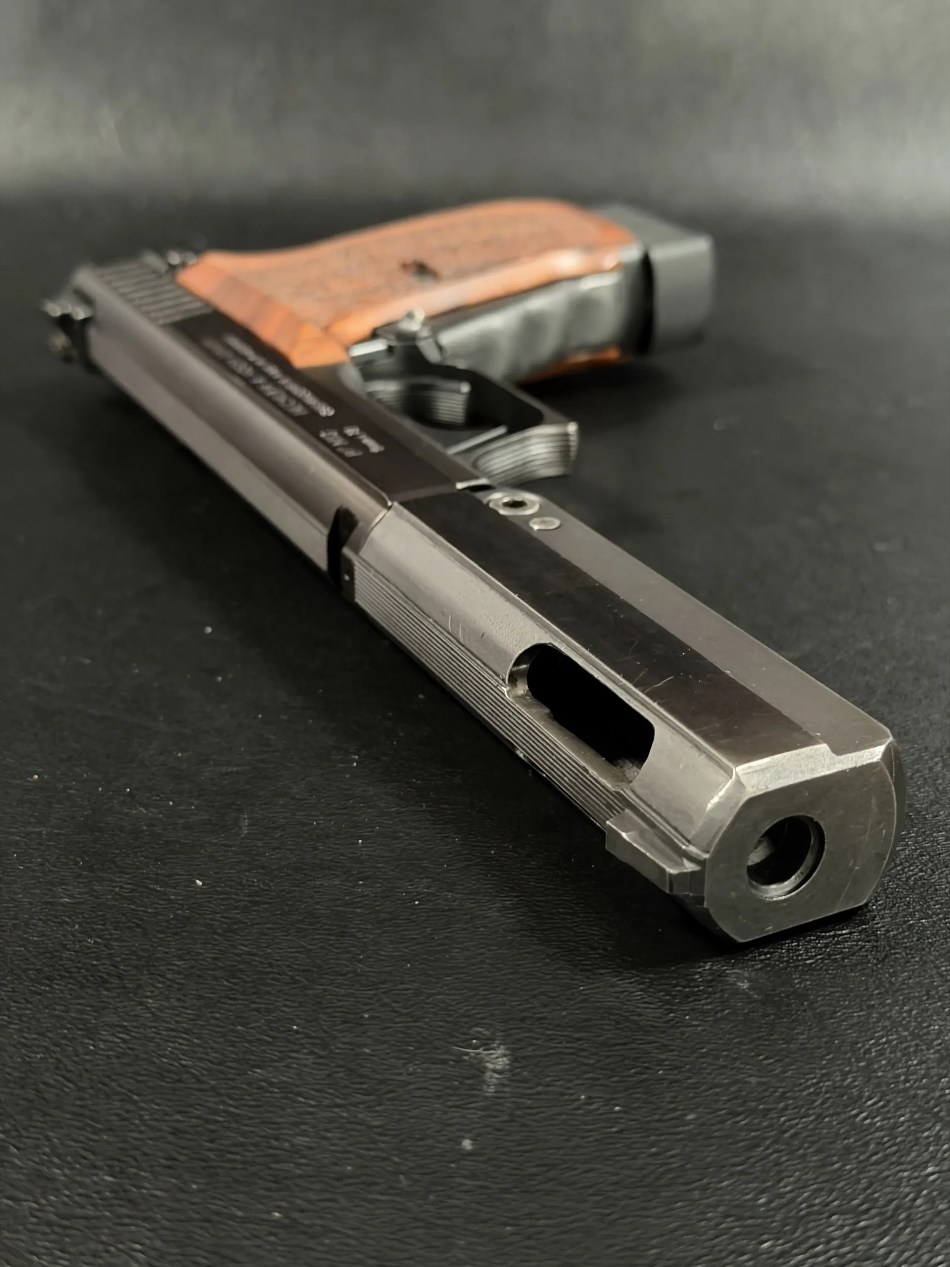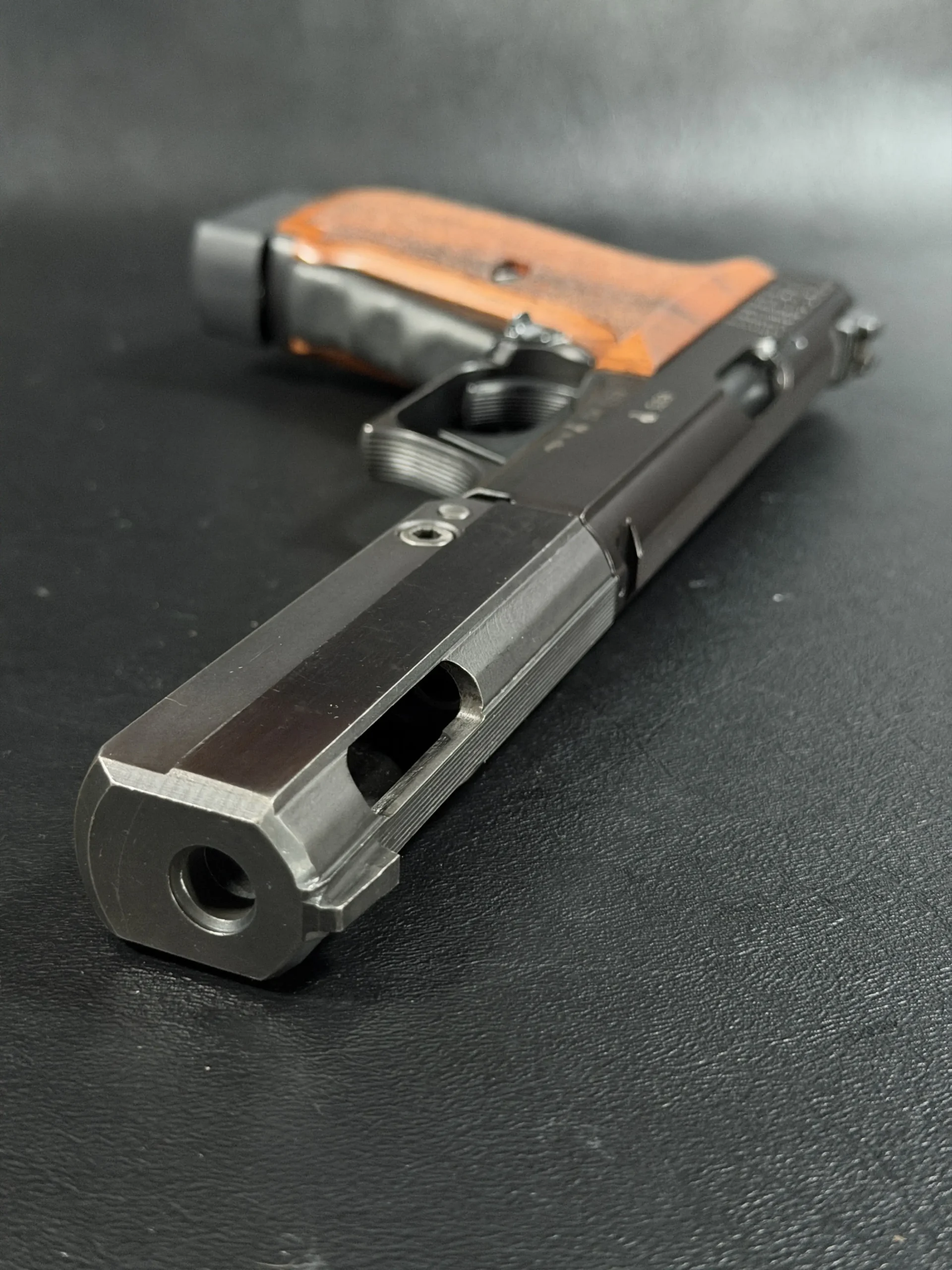 Chambered in 9mm, this long-slide configuration brings the P7’s famous gas-delayed blowback system into a completely different balance profile. The additional slide length gives the pistol a stretched, almost monolithic silhouette, enhancing sight radius, smoothing recoil impulse, and adding a sense of subdued authority. Paired with the factory compensator integrated at the end of the barrel, the pistol feels uniquely planted, redirecting gas forward to reduce muzzle rise and give each shot that tuned, match-grade flatness competitors dream of.