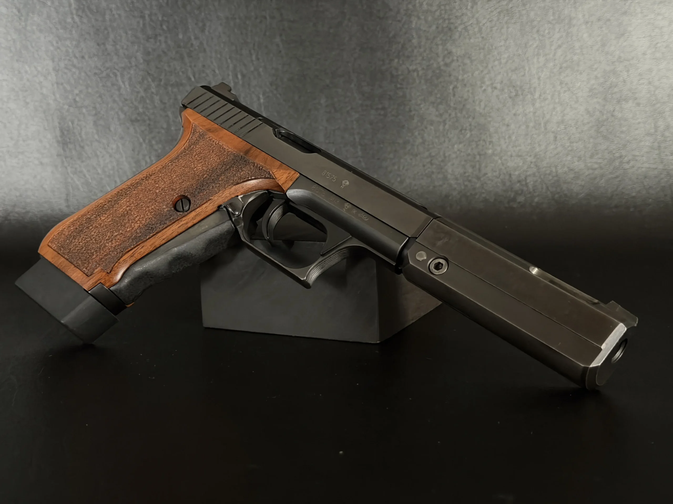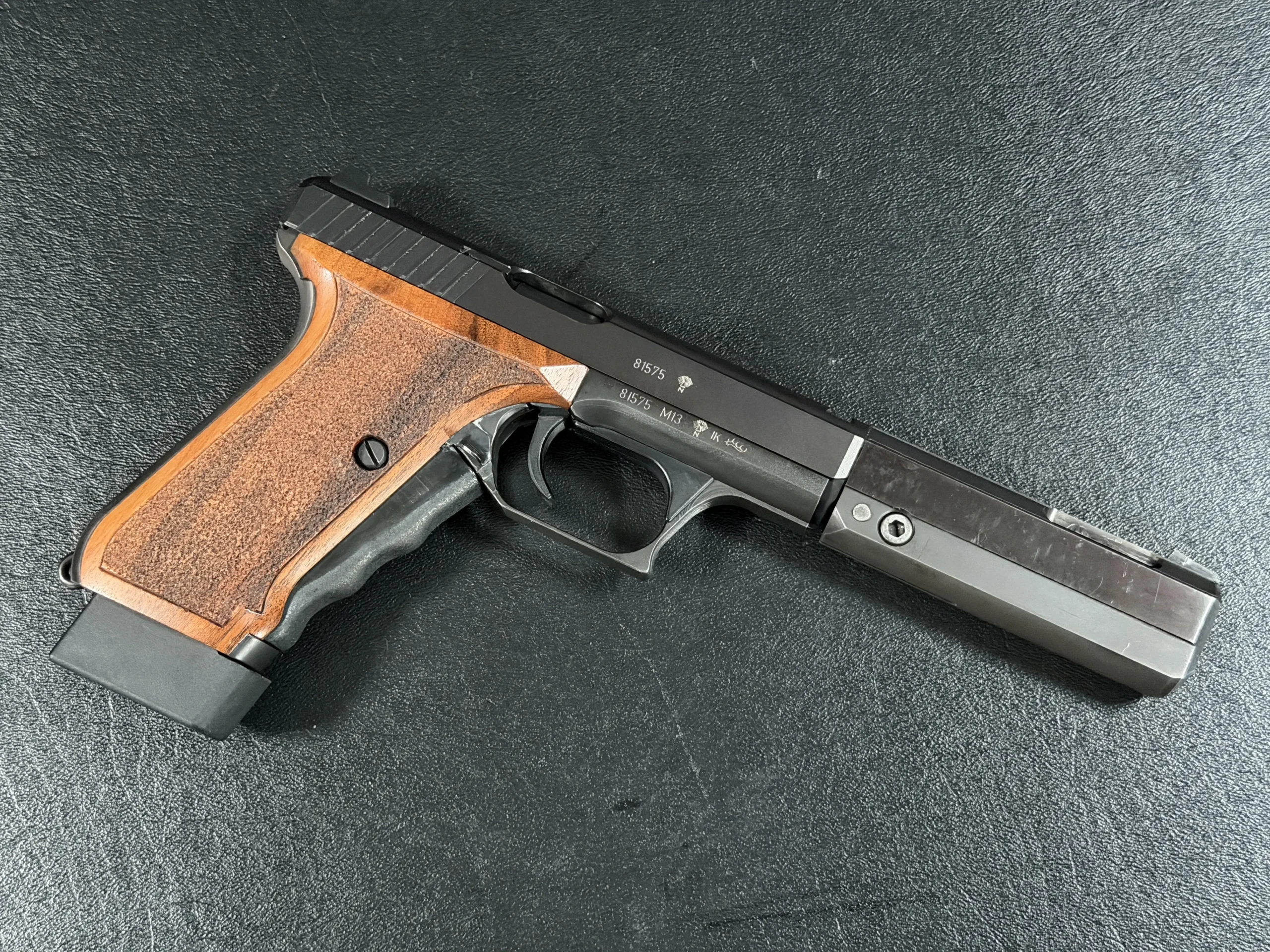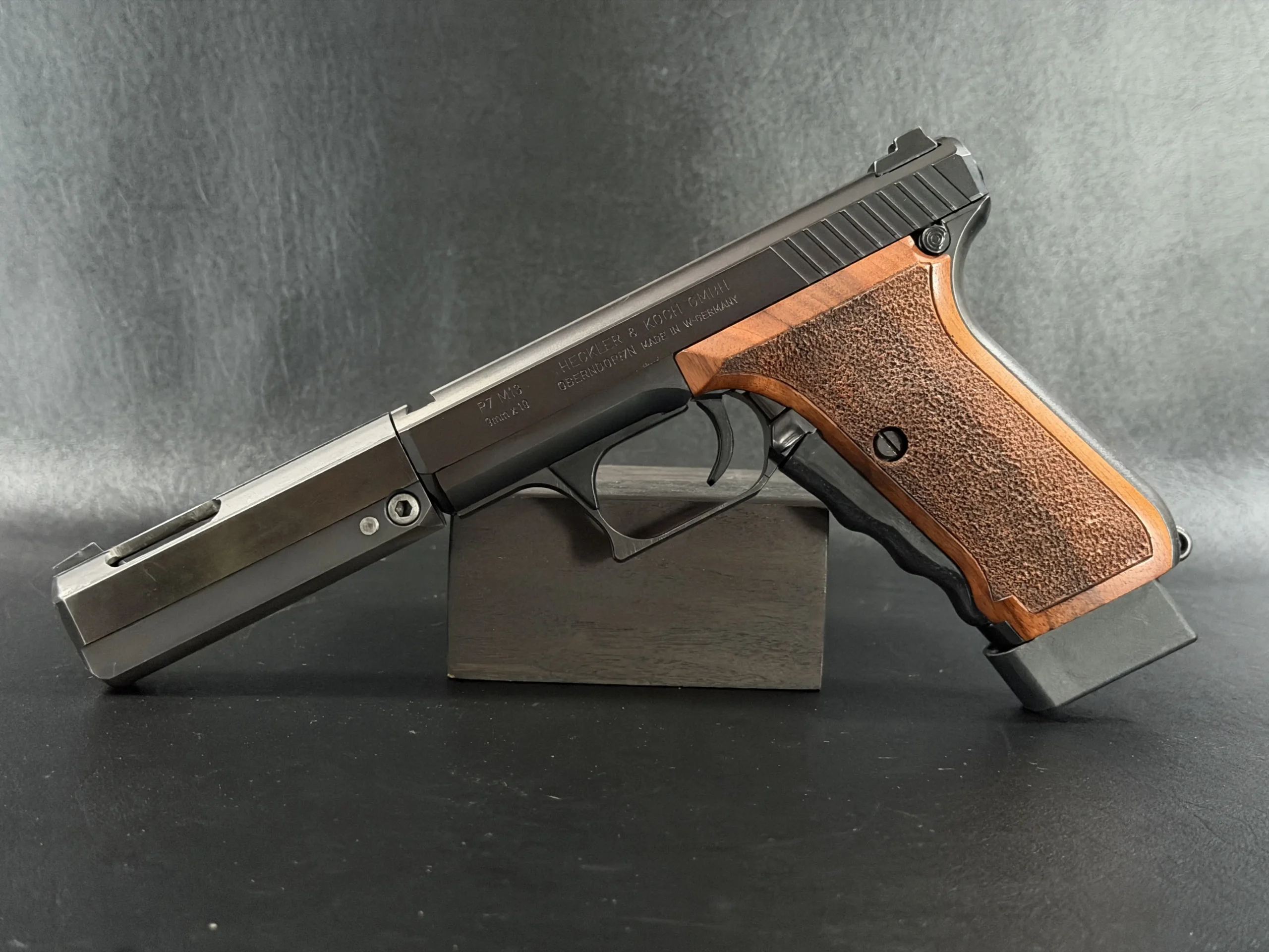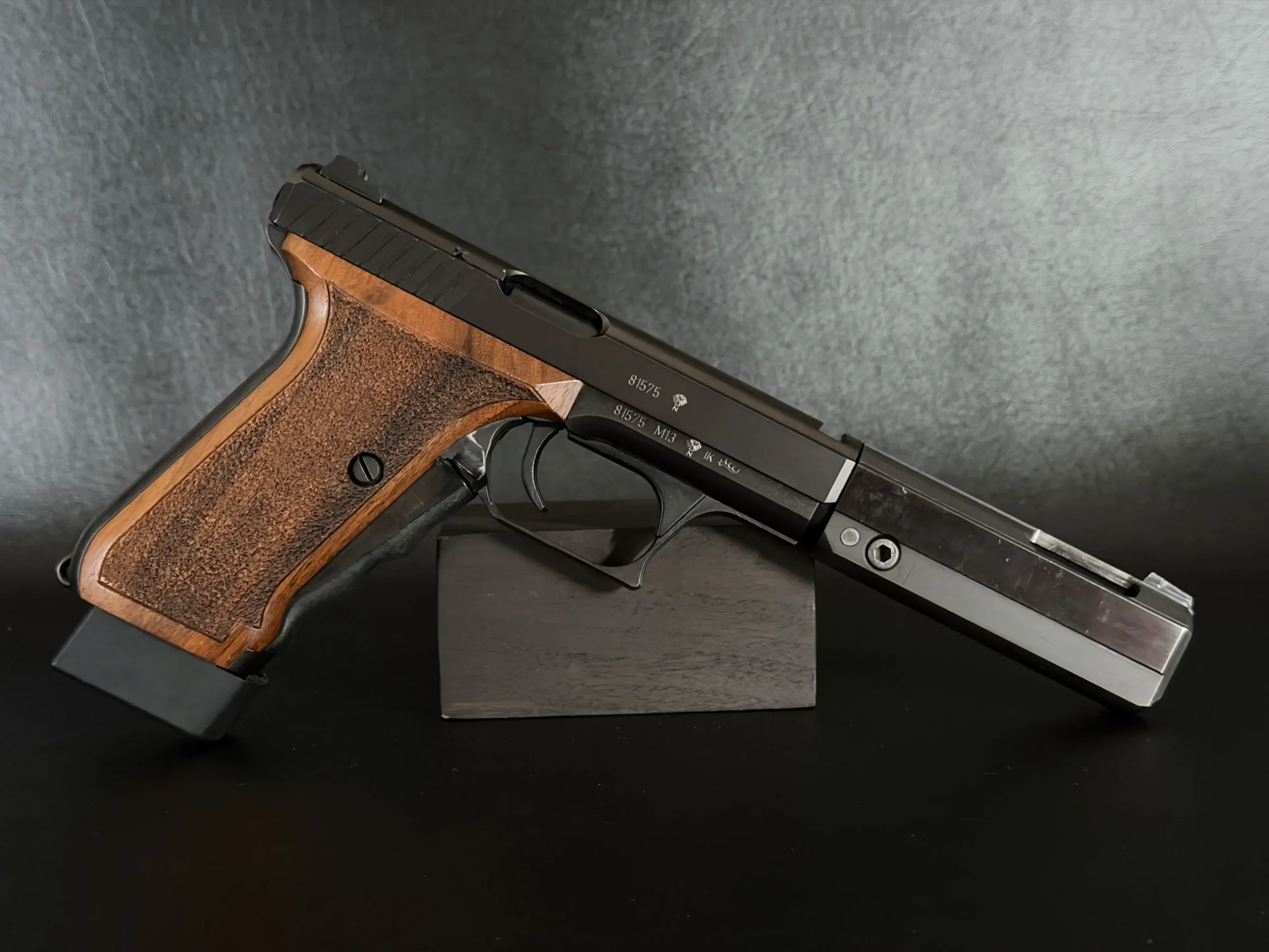 This is one of those pieces that stops you in your tracks, not because it’s loud or ornate, but because every surface, every line, every angle feels intentional. The Heckler & Koch P7 M13 Nickel Long Slide is already an uncommon configuration in the world of P7 variants, but this example stands apart even within that rarefied category. It is built in the spirit of HK’s finest special-order work: extended slide, nickel-finished upper assembly, wood-gripped frame, and the unmistakable engineering DNA that made the P7 platform legendary.