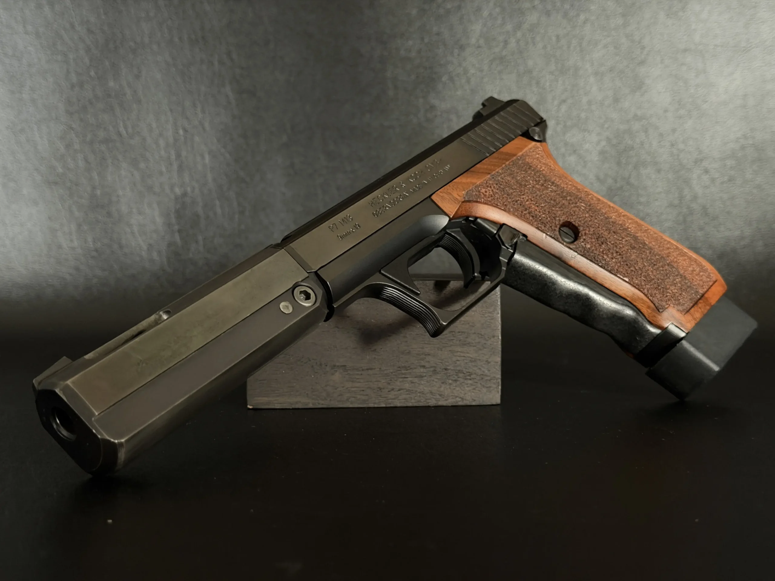 The nickel-finished slide and compensator create a bold contrast to the dark, finely machined steel frame. It reflects light in a muted, almost liquid way, subtle, not mirror-bright, showcasing sharp facets along the slide and the distinctive HK machine work around the ejection port and front flats. The hand-cut wood grips add warmth and texture, tying together an aesthetic that feels both elegant and mechanical, almost like a prototype built for a senior HK engineer rather than a catalog offering.