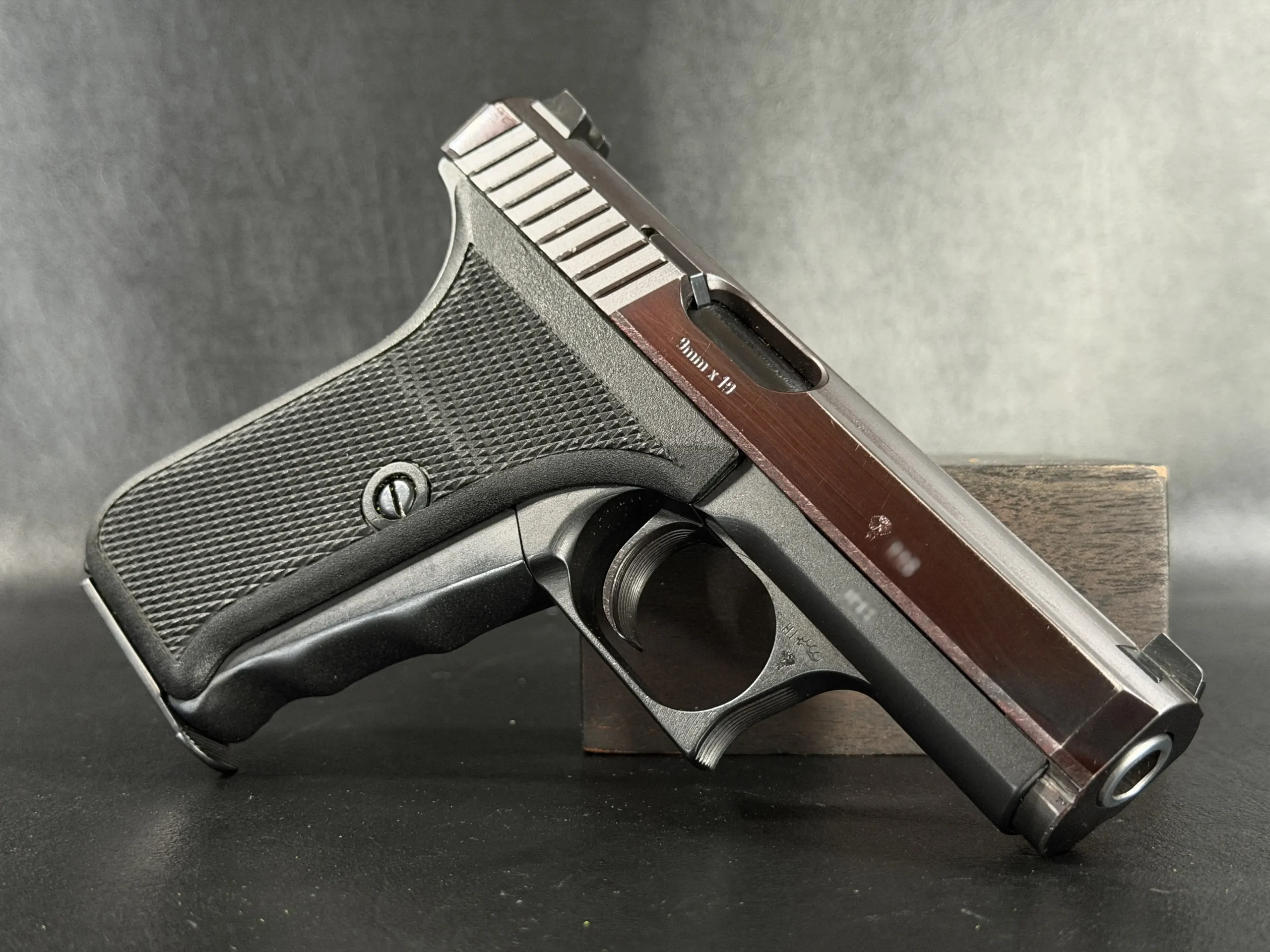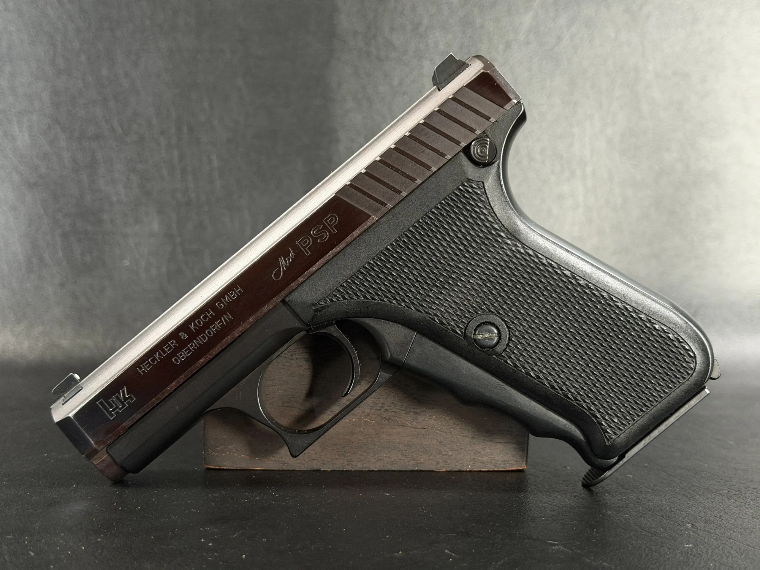 The finish presents a striking contrast between the dark slide surfaces and the matte black frame, highlighting the careful machining typical of Heckler & Koch’s production during this era. The pistol retains its original black grip panels, sharply checkered for positive handling, and exhibits the purposeful engineering aesthetic that collectors often associate with early German service arms.