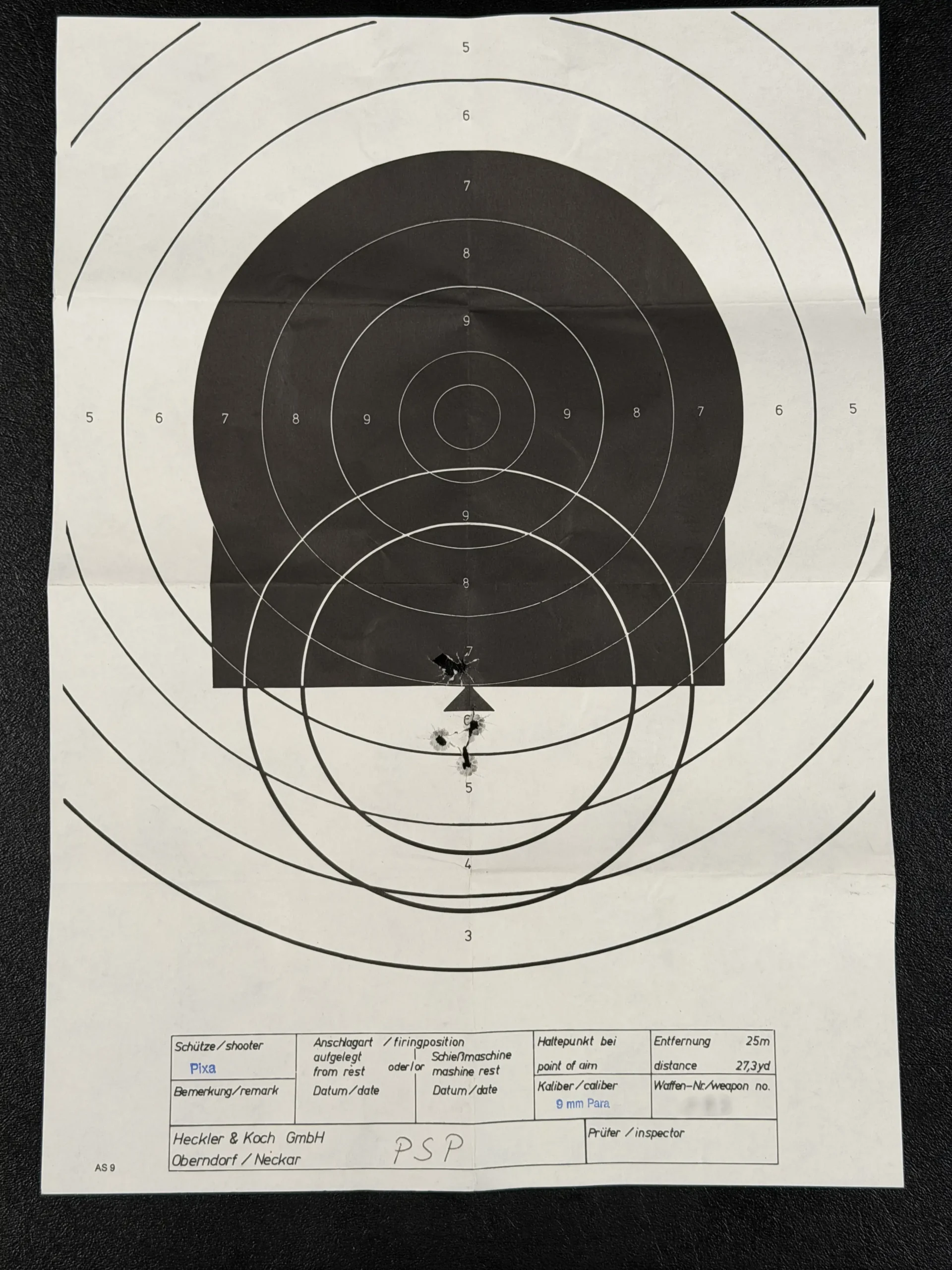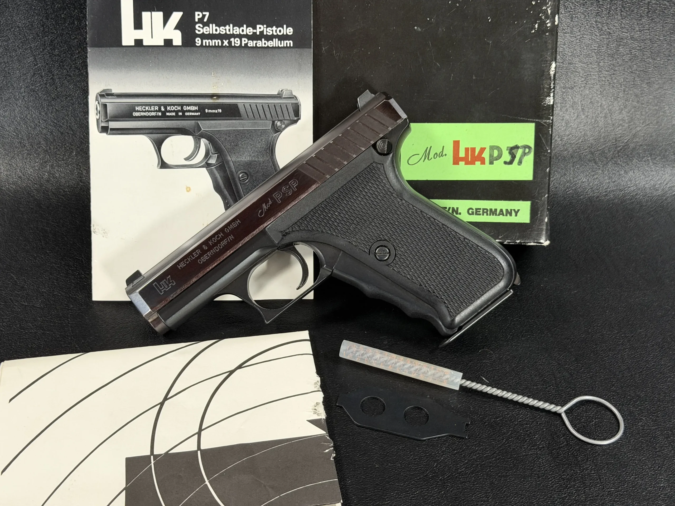 Accompanying the pistol are period items, including the factory box, documentation, and original target, the latter demonstrating the accuracy standard expected from the P7 platform. Even today, the P7 remains widely admired for its inherent precision, smooth trigger characteristics, and mechanical reliability, qualities that made it a trusted sidearm for numerous police agencies throughout Europe and beyond.