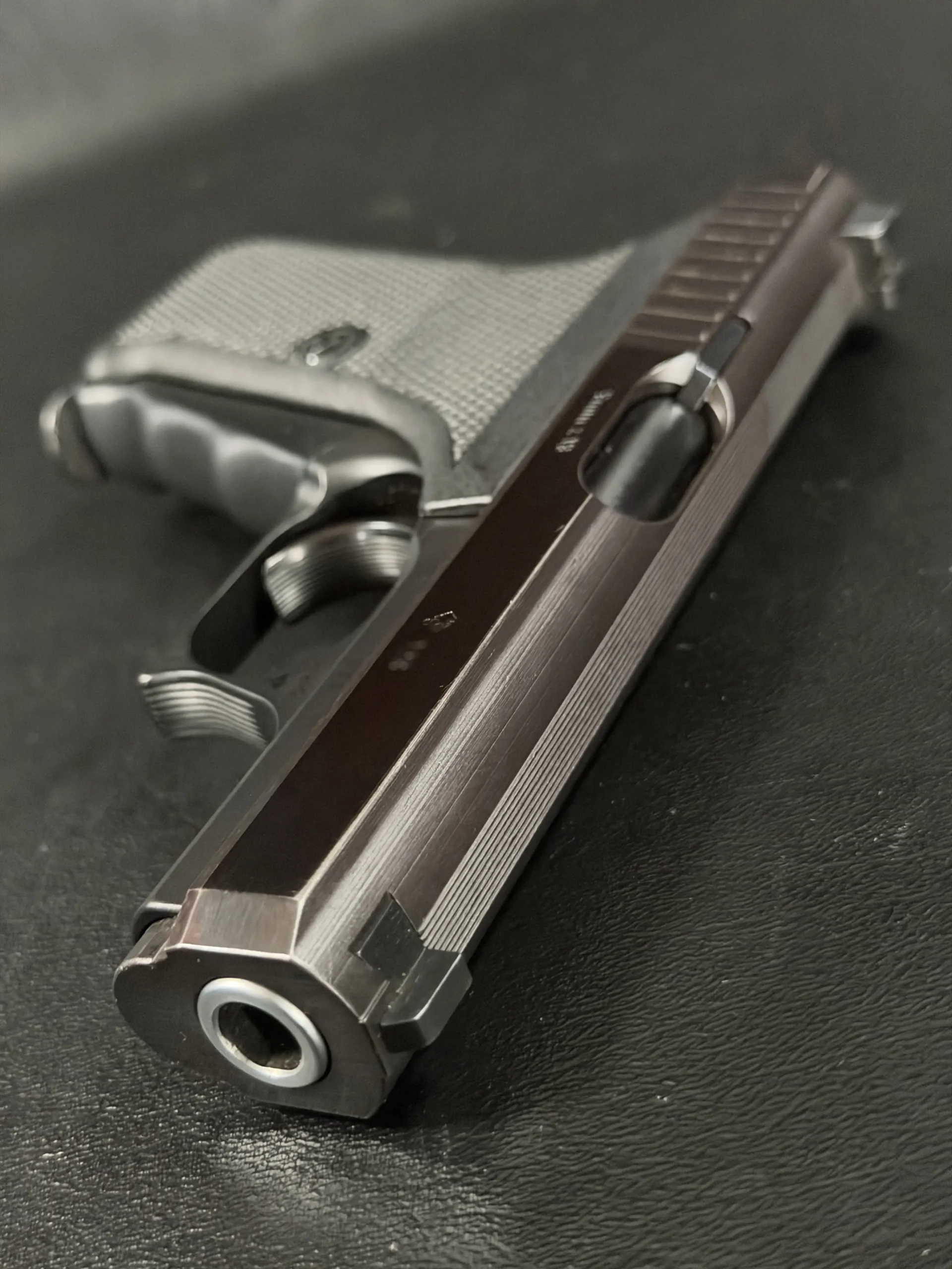 Developed in the 1970s at the famed Heckler & Koch facility in Oberndorf am Neckar, the P7 was designed in response to German police trials seeking a modern, safe, and compact sidearm chambered in 9×19mm Parabellum. The result was a pistol unlike anything else on the market. Rather than relying on traditional locked-breech systems, the P7 employed gas-delayed blowback operation, a clever design that uses expanding gas tapped from the barrel to regulate slide movement. The system allowed the pistol to remain exceptionally accurate while maintaining a fixed barrel and a remarkably low bore axis.