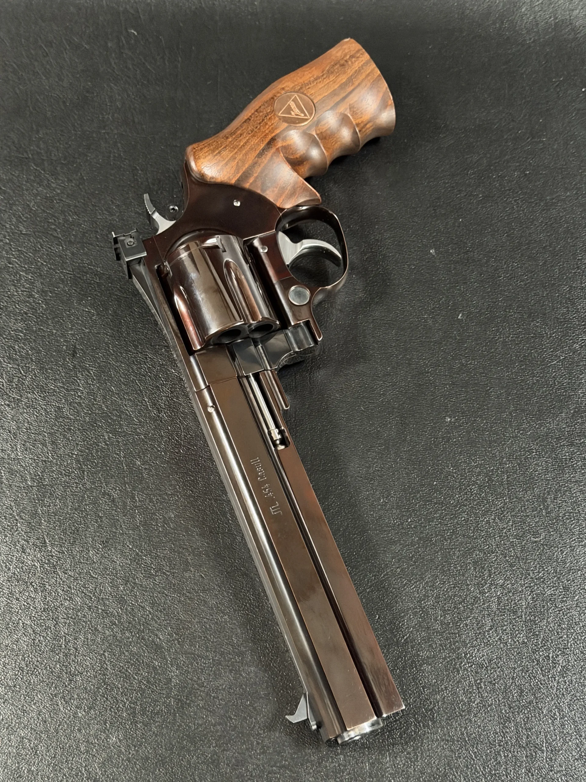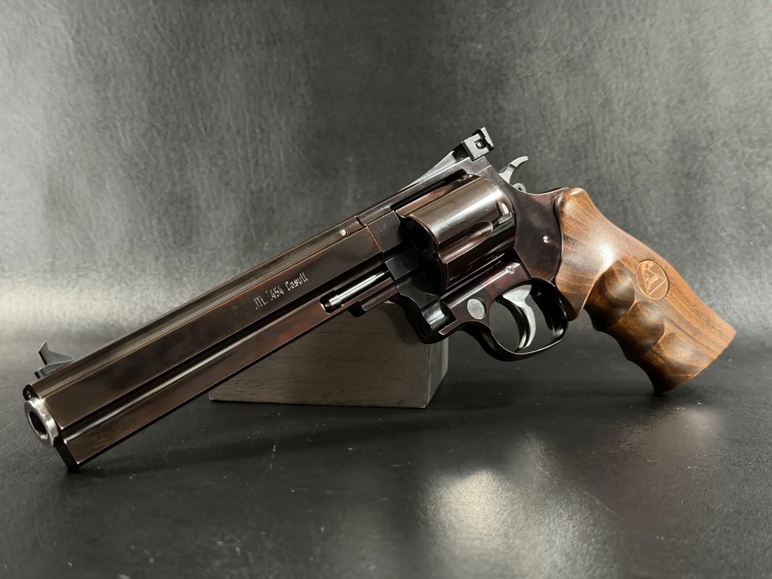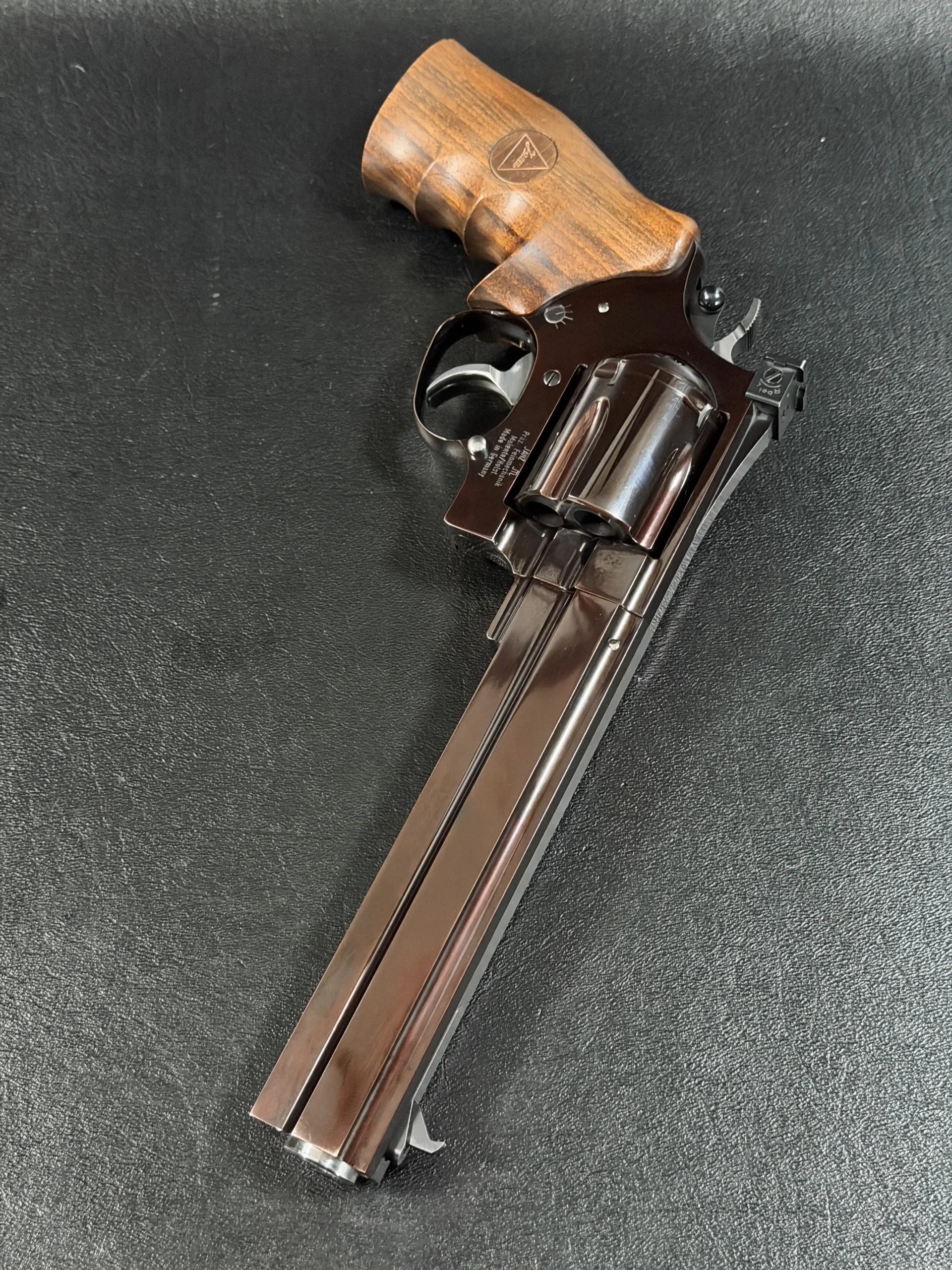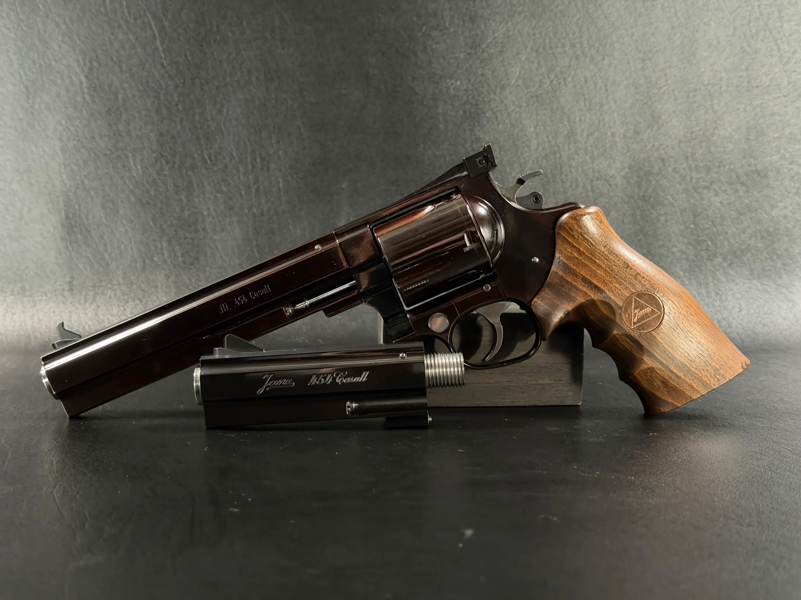 Presented as a matching-set system, the revolver arrives with both the 6-inch and 5-inch barrels, each finished to a mirror-like depth that brings out the warm, almost liquid sheen of the polished steel. The frame is equally refined, displaying the kind of precision machining and perfect lockup that Janz collectors and connoisseurs immediately recognize. Its walnut ergonomic grip, inlaid with the Janz medallion, adds warmth and sculptural character, transforming the revolver into both a mechanical instrument and an heirloom-level art piece.