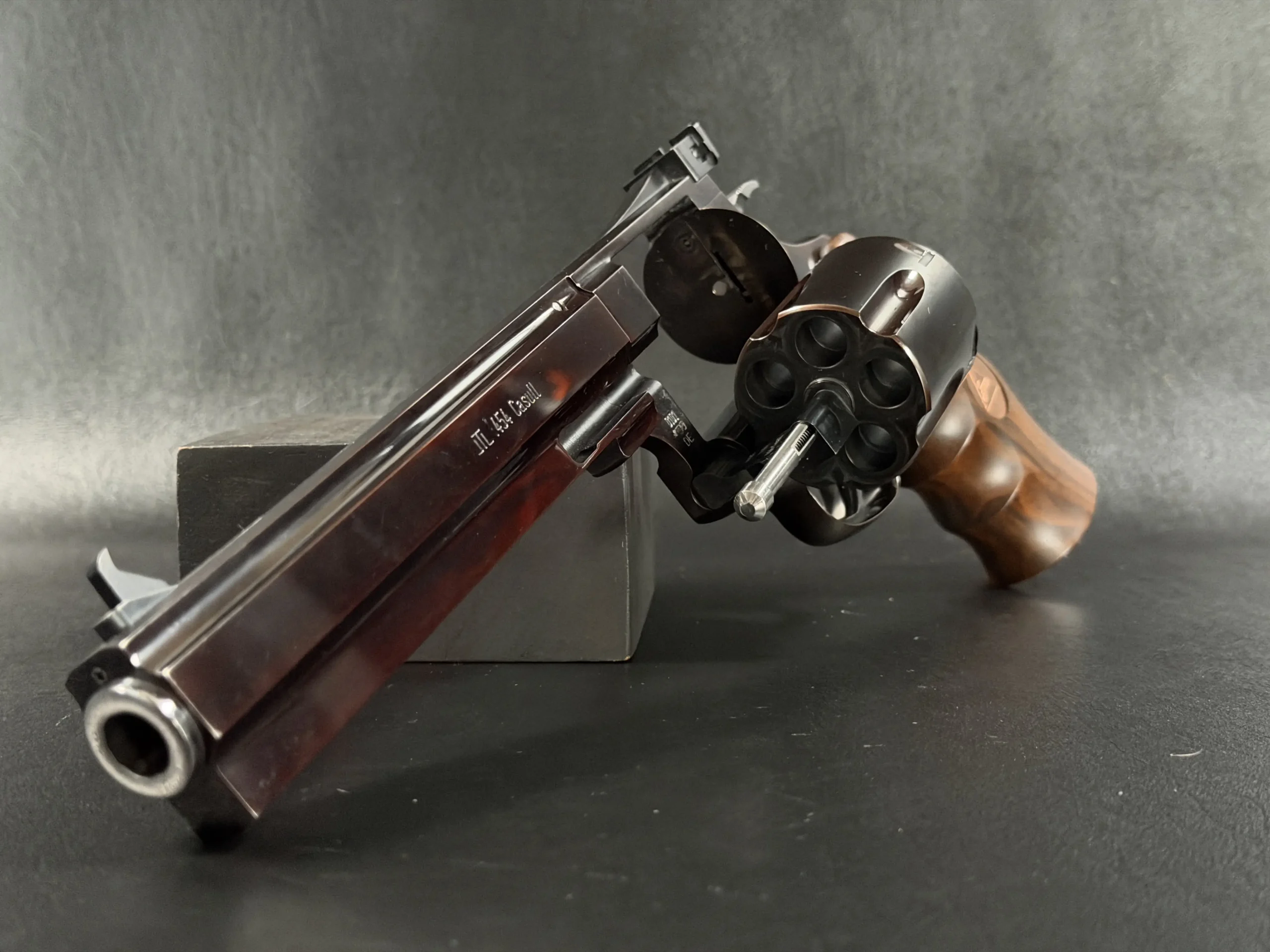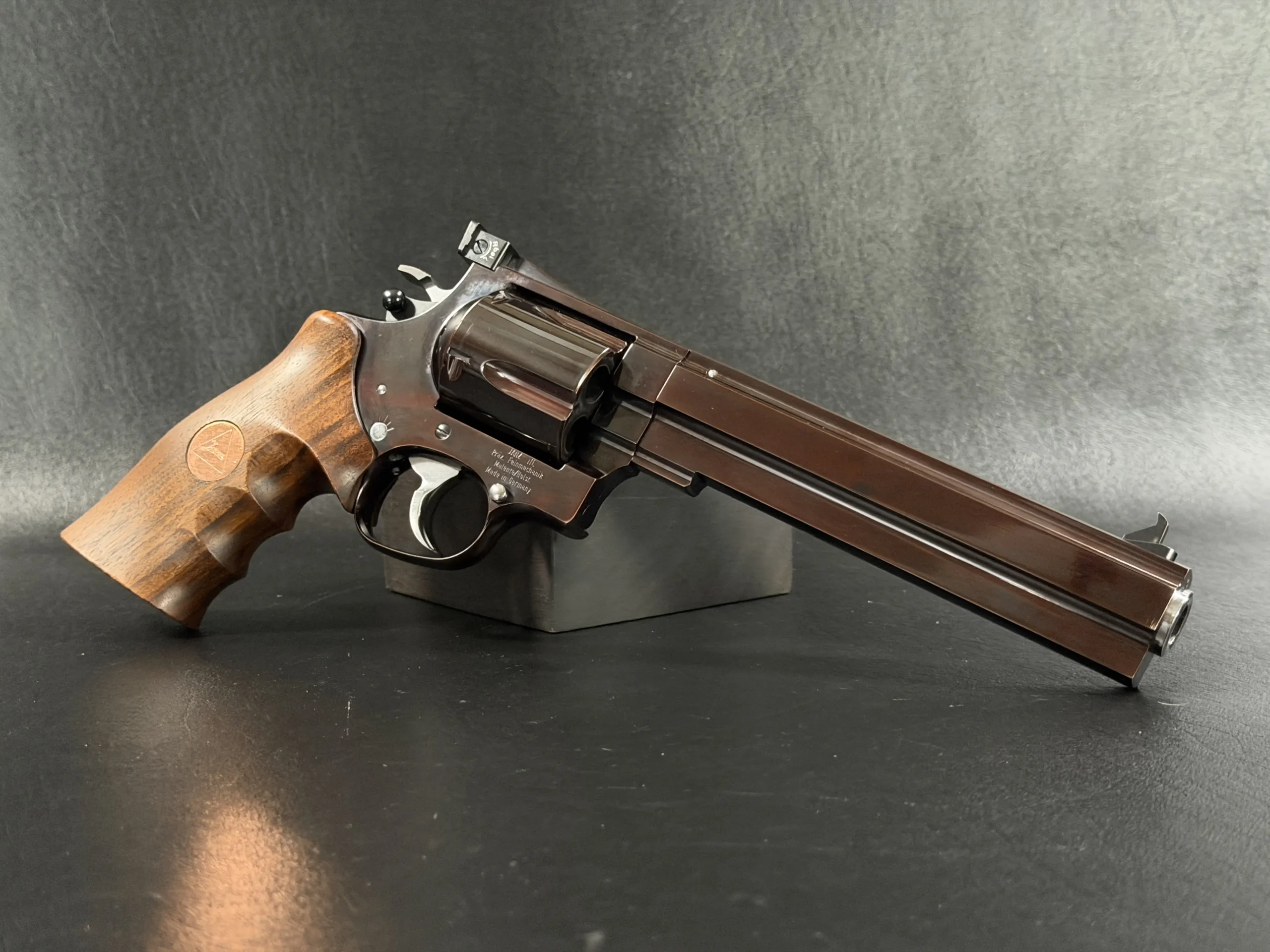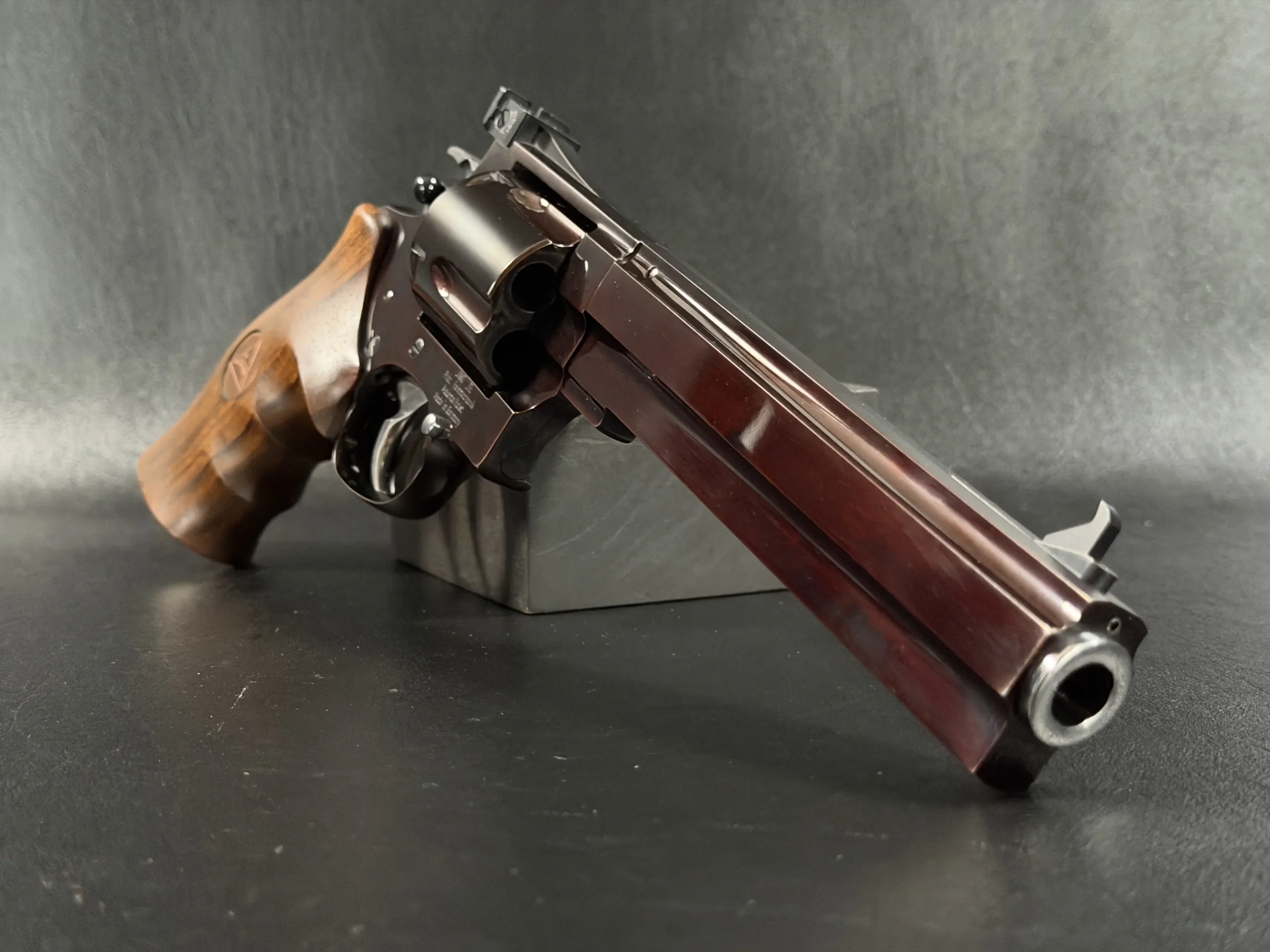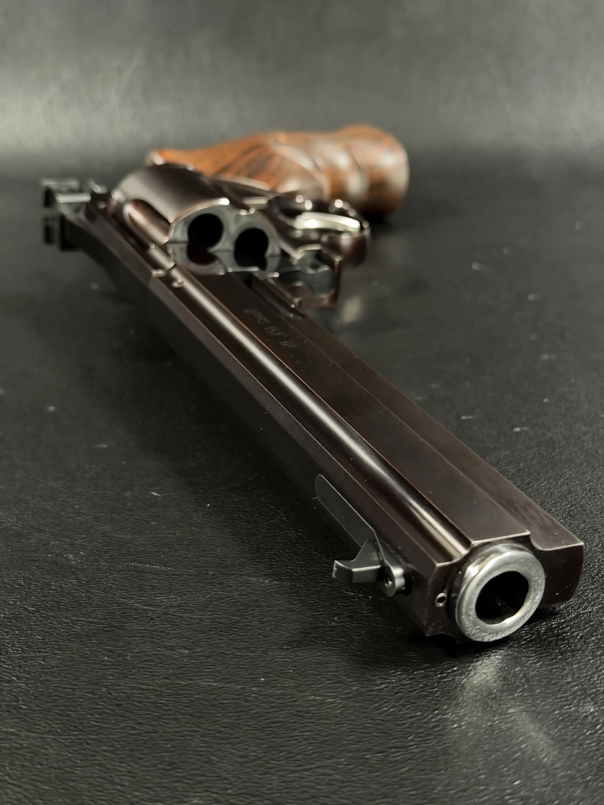 Presented as a matching-set system, the revolver arrives with both the 6-inch and 5-inch barrels, each finished to a mirror-like depth that brings out the warm, almost liquid sheen of the polished steel. The frame is equally refined, displaying the kind of precision machining and perfect lockup that Janz collectors and connoisseurs immediately recognize. Its walnut ergonomic grip, inlaid with the Janz medallion, adds warmth and sculptural character, transforming the revolver into both a mechanical instrument and an heirloom-level art piece.