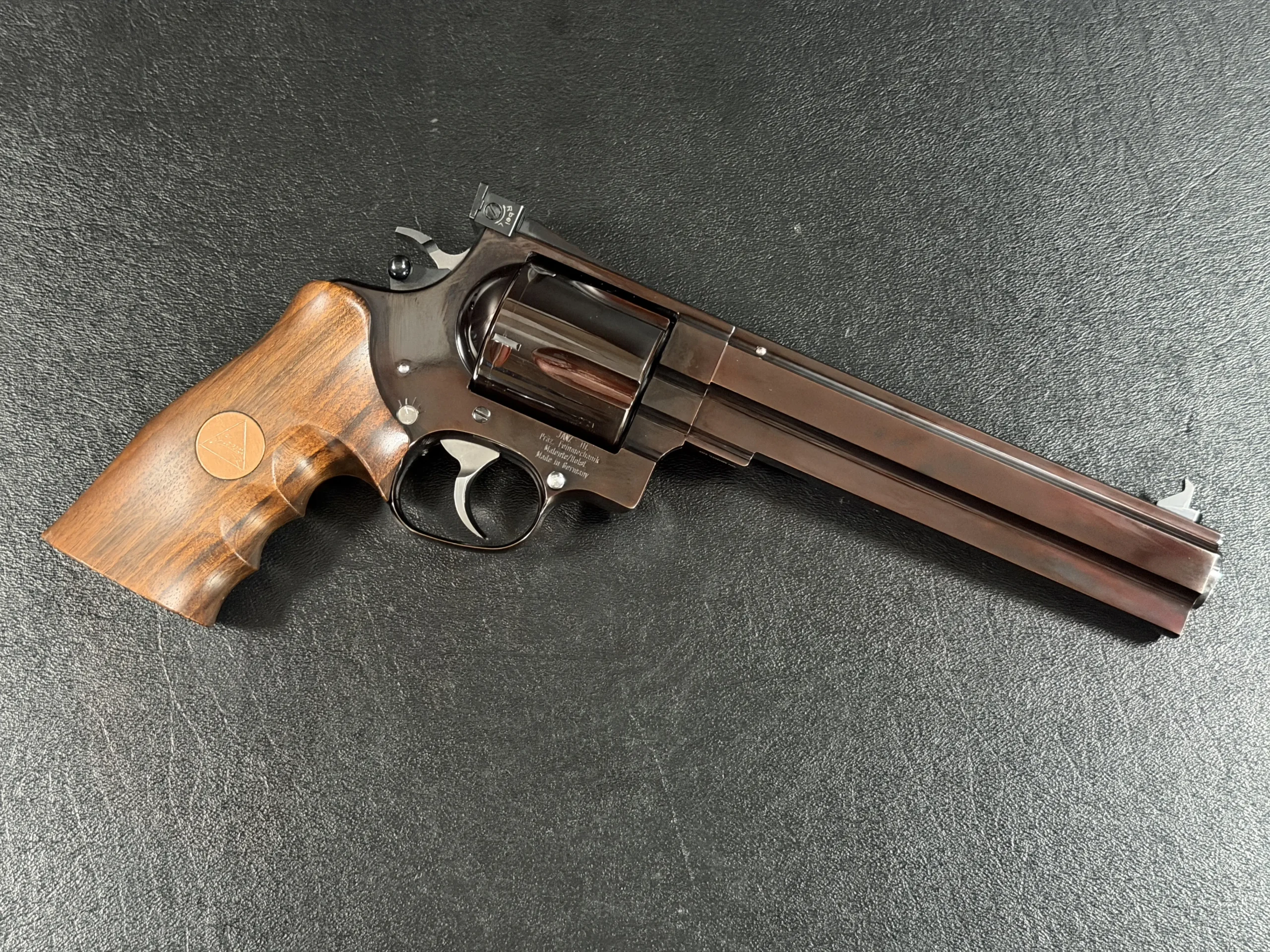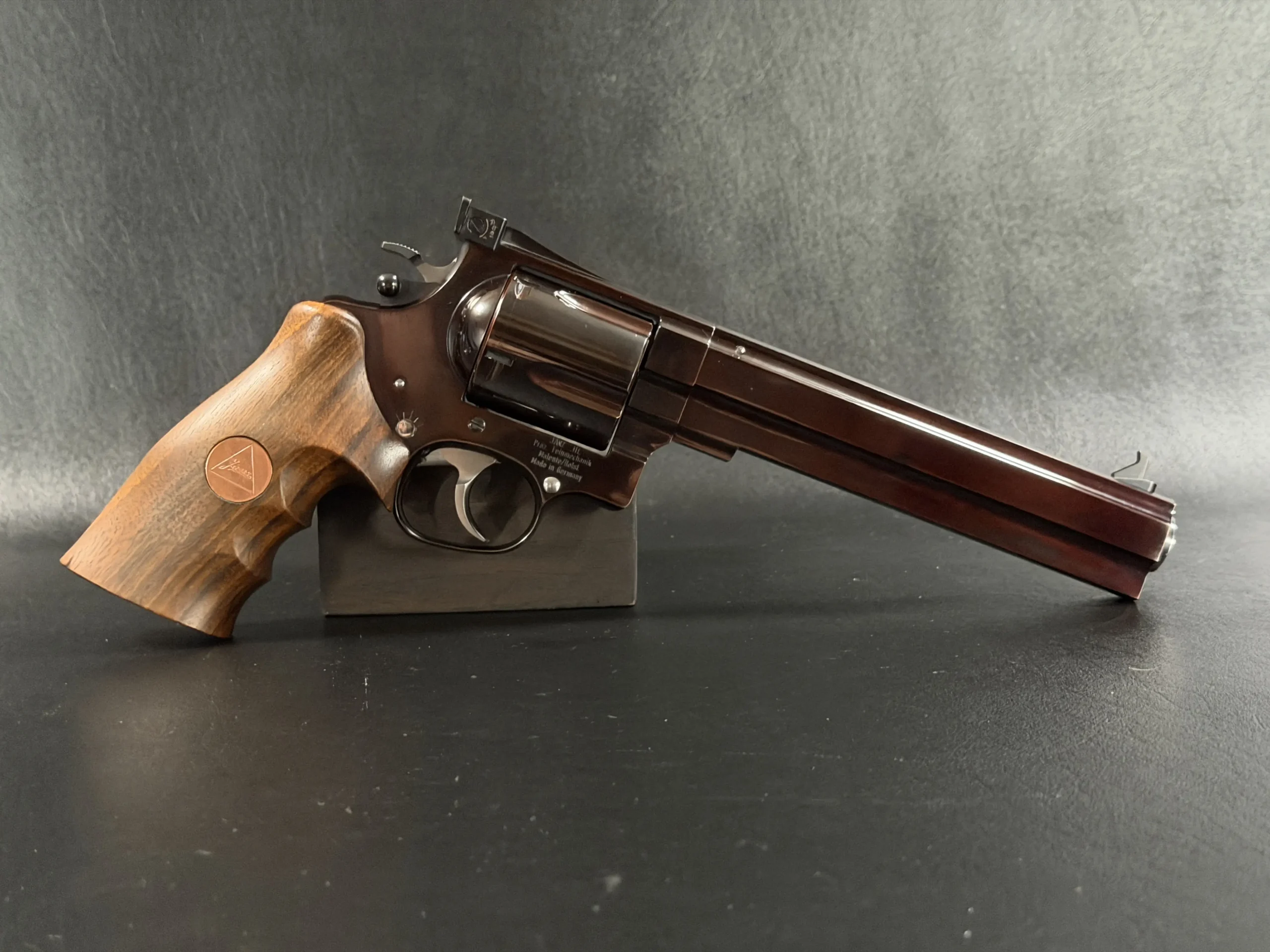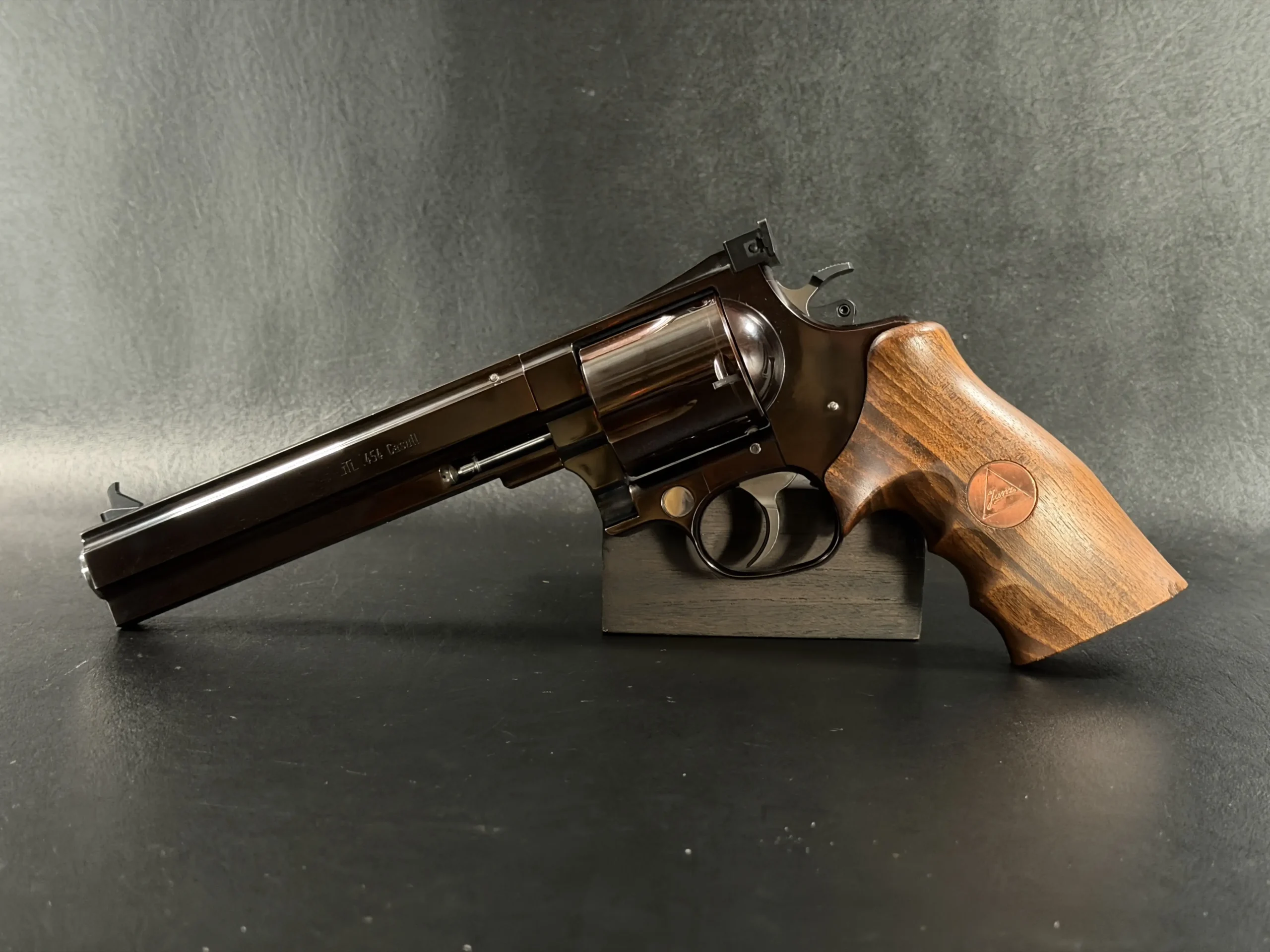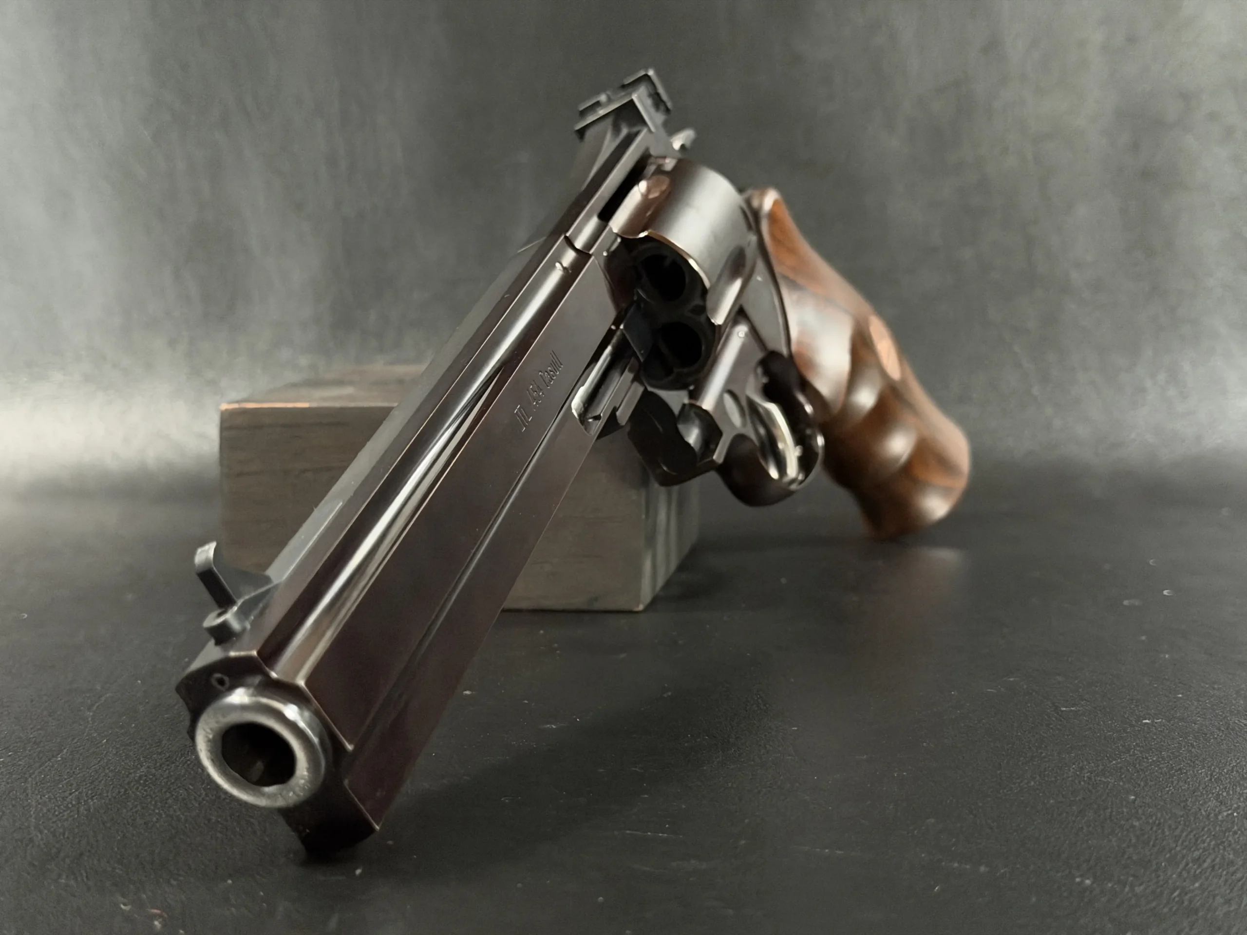 Presented as a matching-set system, the revolver arrives with both the 6-inch and 5-inch barrels, each finished to a mirror-like depth that brings out the warm, almost liquid sheen of the polished steel. The frame is equally refined, displaying the kind of precision machining and perfect lockup that Janz collectors and connoisseurs immediately recognize. Its walnut ergonomic grip, inlaid with the Janz medallion, adds warmth and sculptural character, transforming the revolver into both a mechanical instrument and an heirloom-level art piece.