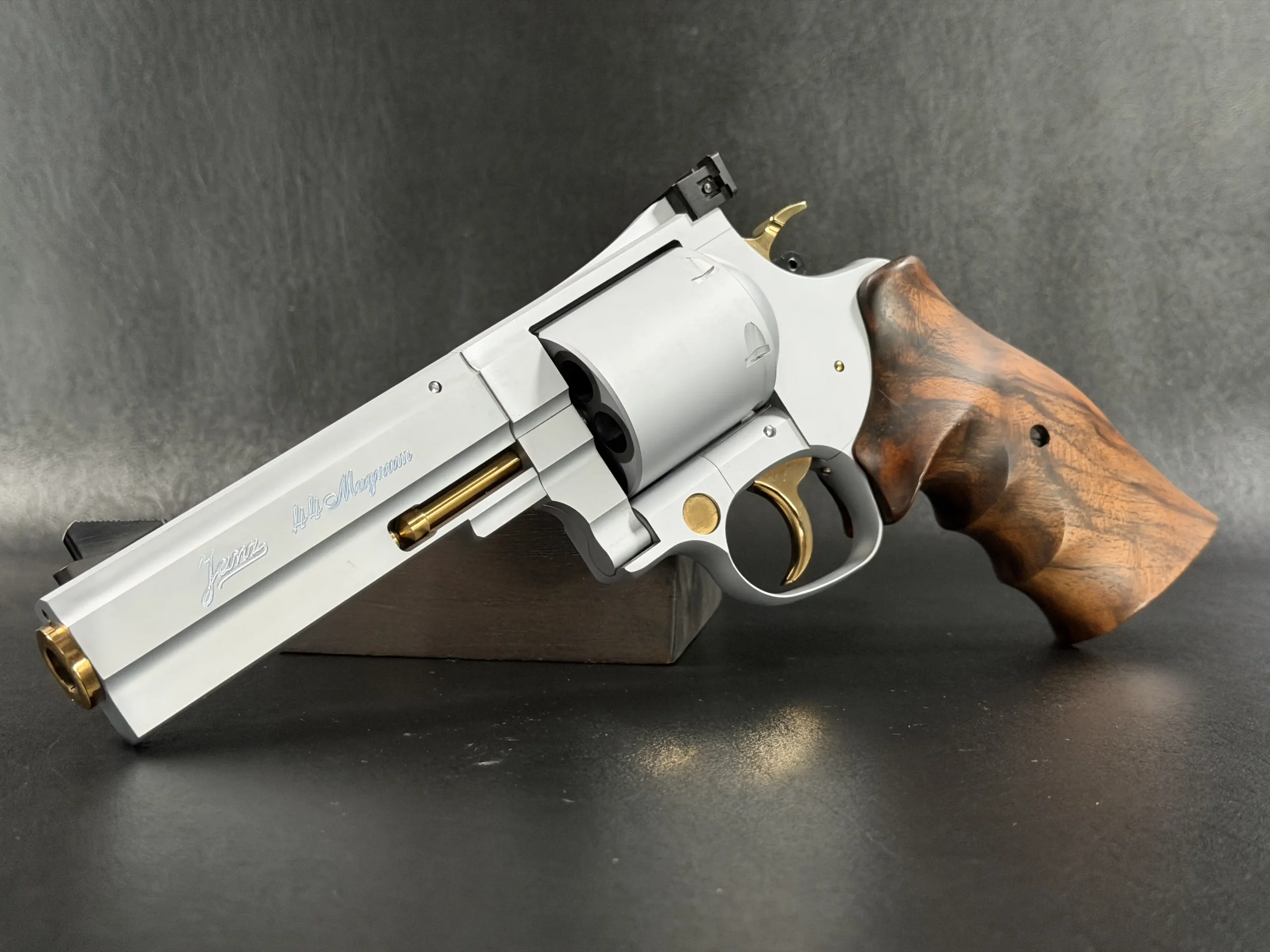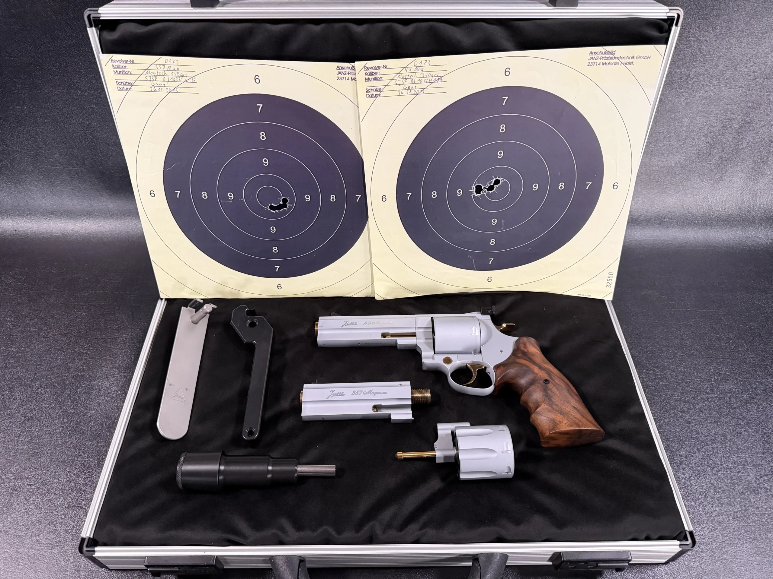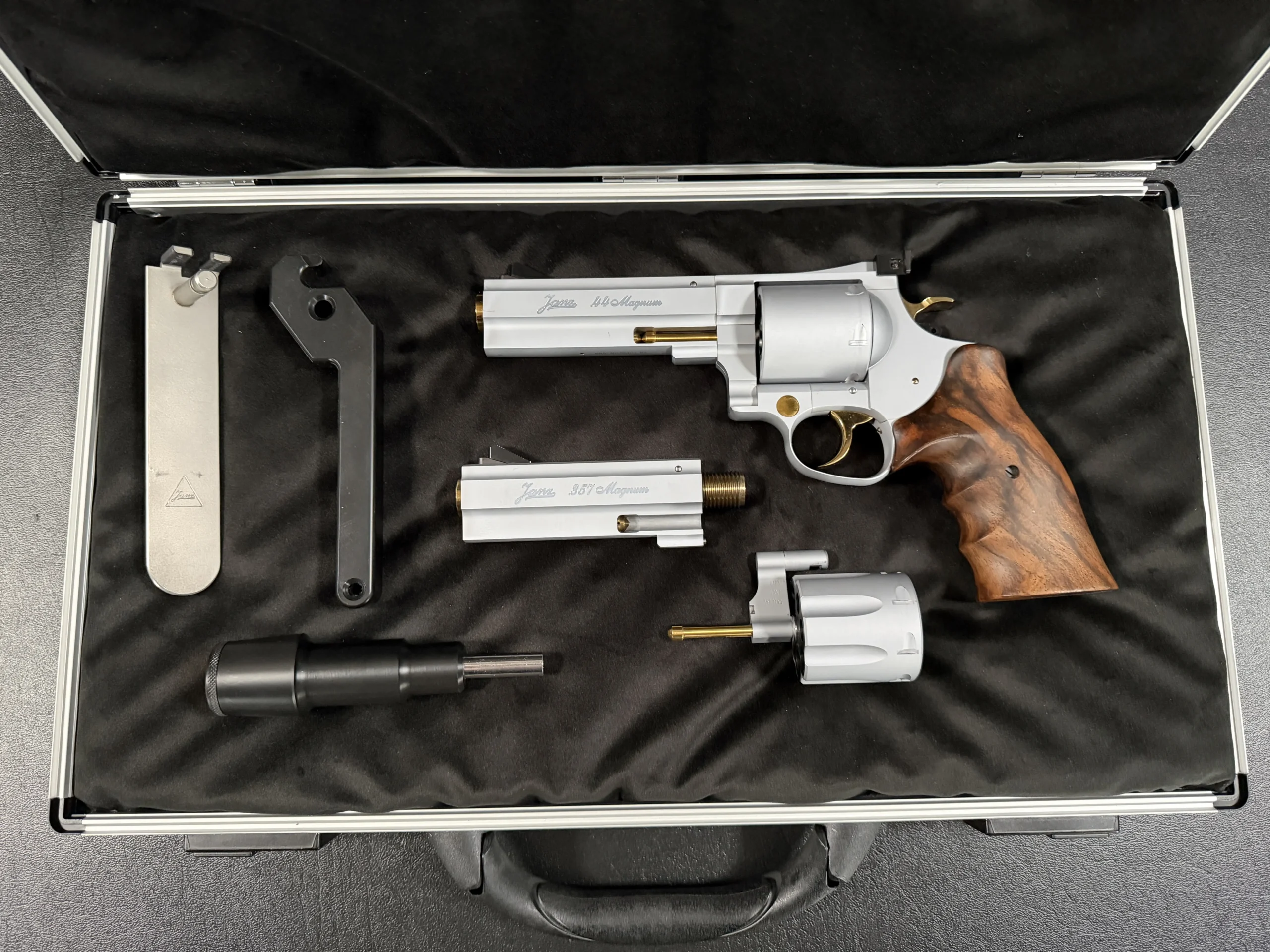 This set includes both .44 Magnum and .357 Magnum configurations, each with its own dedicated, matching barrel and cylinder. The swap-over process is part of the magic: Janz designed the system so each component locks in with a level of tolerance that borders on obsessive. Included in the case are the factory tools needed to perform the caliber conversions, each piece engineered with the same uncompromising quality as the revolver itself.