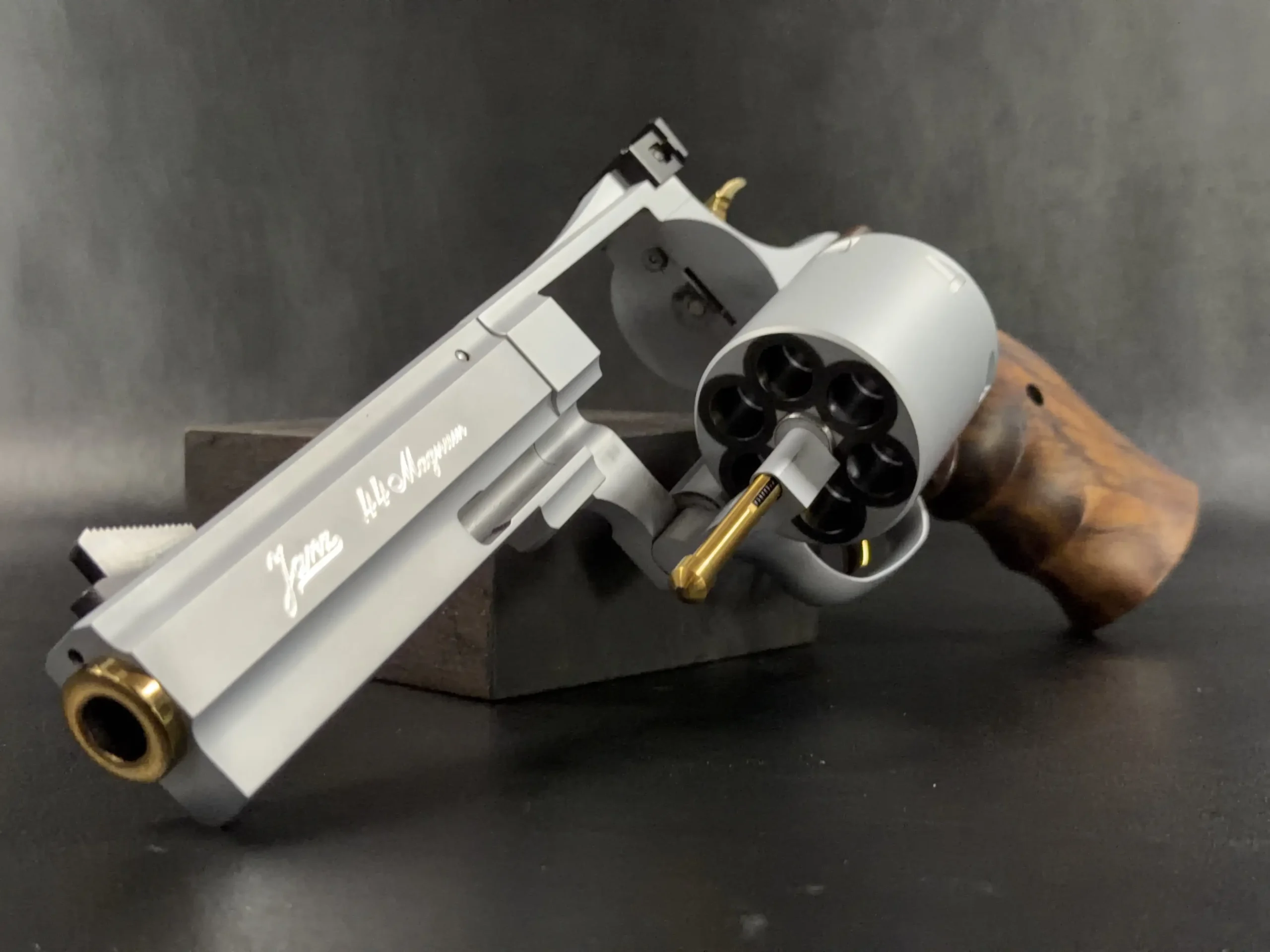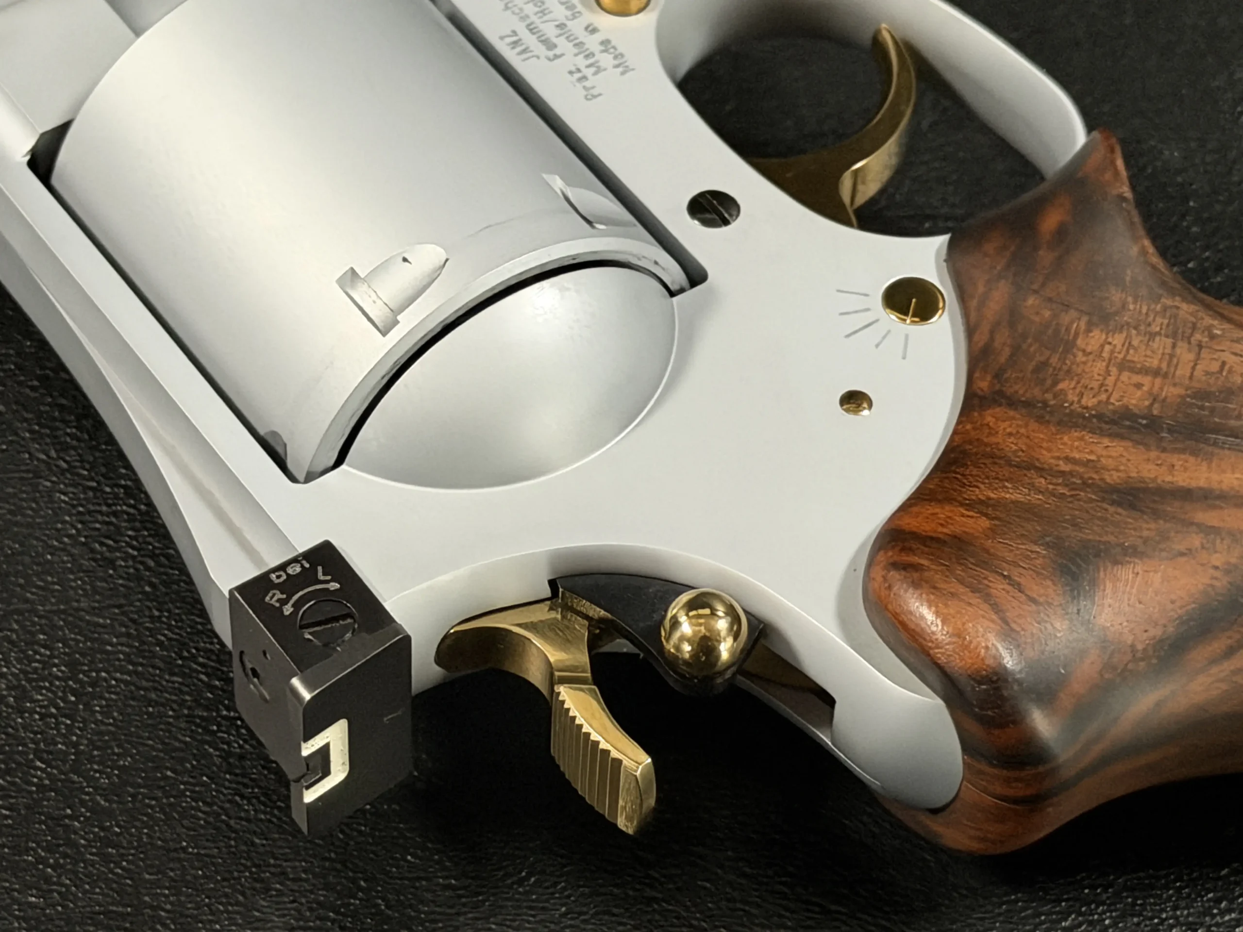 Deeply figured wood grips complete the presentation, adding warmth to the otherwise technical aesthetic. Gold-toned accents throughout the revolver and conversion components underscore the luxury and attention to detail Janz puts into every firearm.
