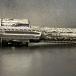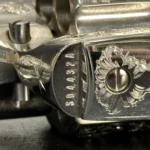 The first thing that catches your eye is the engraving. Dual bands wrap around the muzzle and frame, anchoring the floral scrollwork that dances down the barrel. It’s not random; it’s composed, like music etched in metal. The scrolls flow naturally, wrapping around the original Colt markings as if they were meant to be there from the beginning.