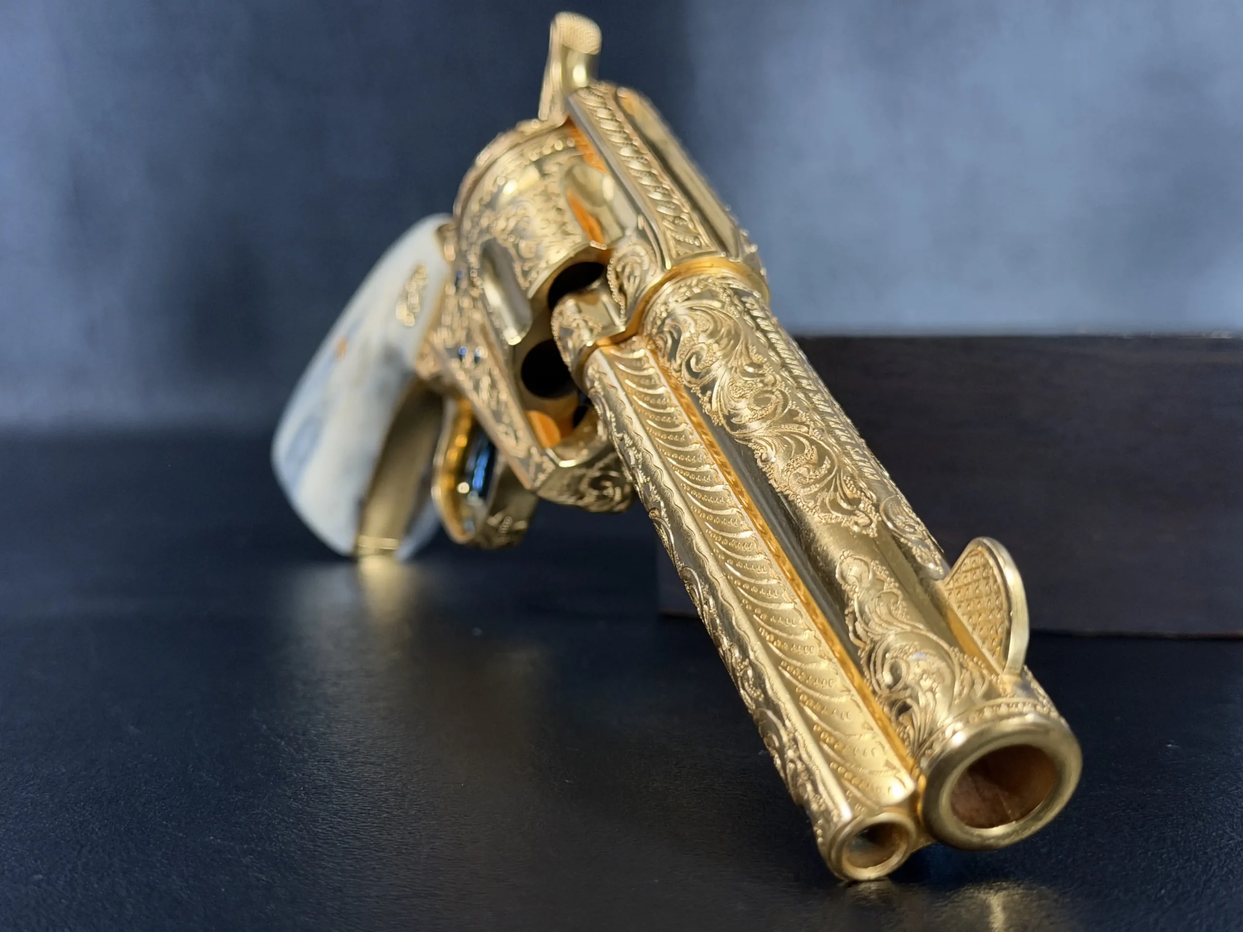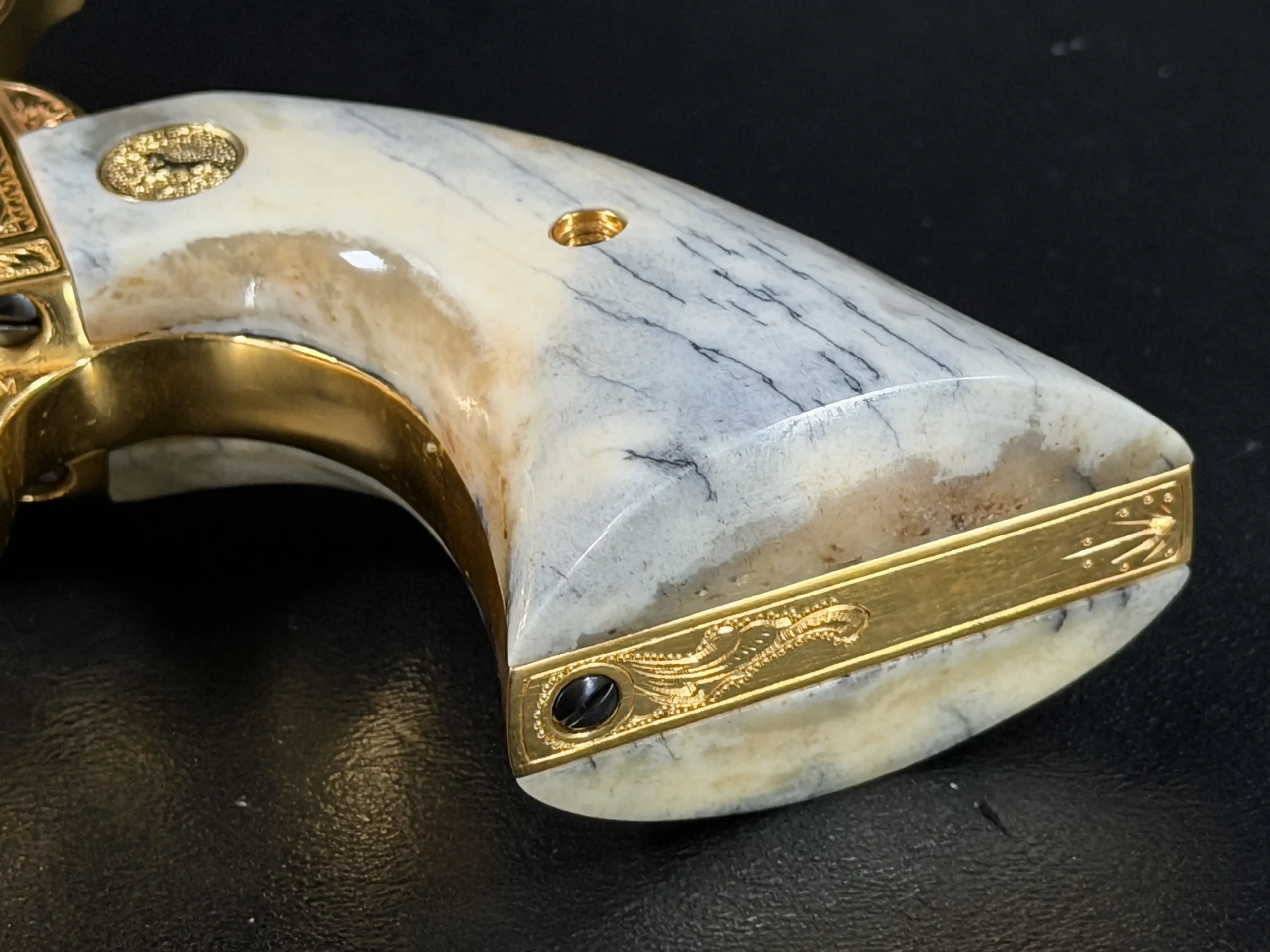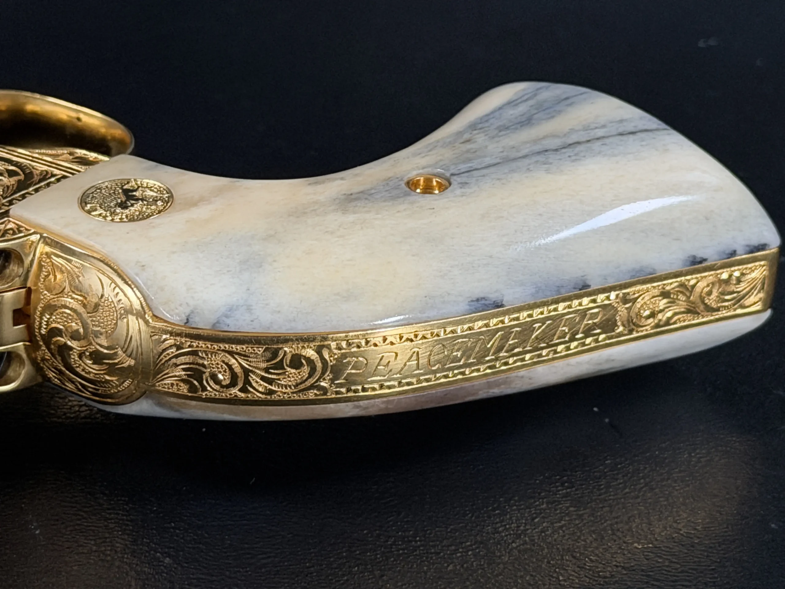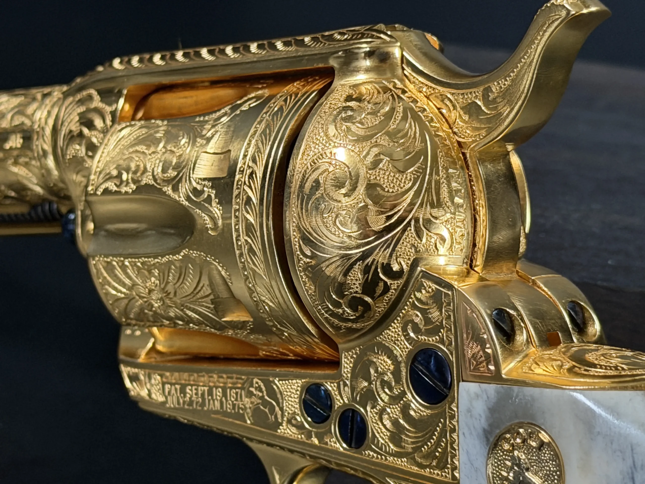 Equally impressive are the grips. The smooth, ivory-toned stocks display natural grain and coloration, offering a soft contrast to the warm brilliance of the gold finish. The classic Colt medallions are perfectly set, reinforcing the revolver’s authenticity and pedigree. The backstrap engraving includes a personalized banner, adding an additional layer of individuality to the piece.
