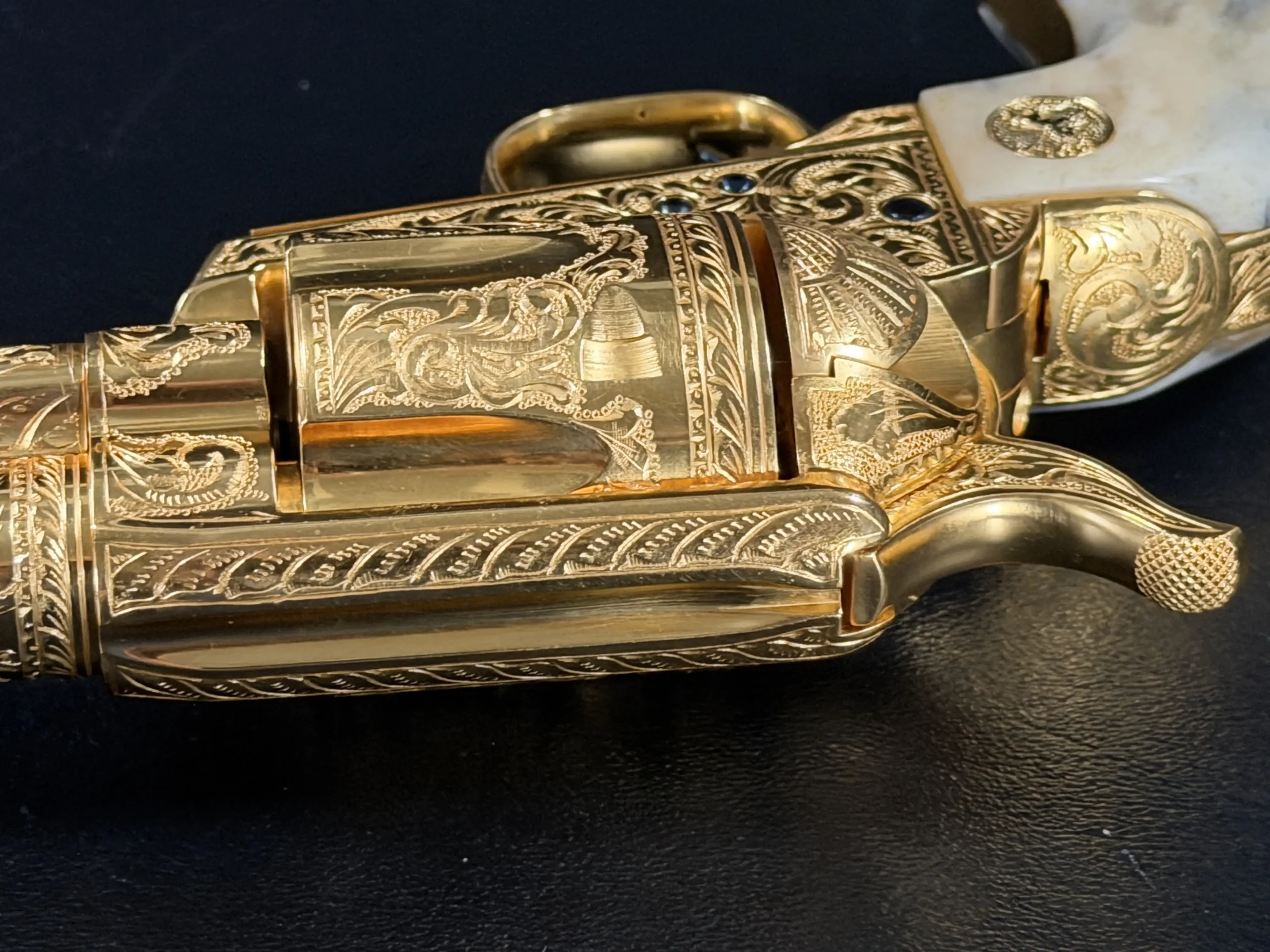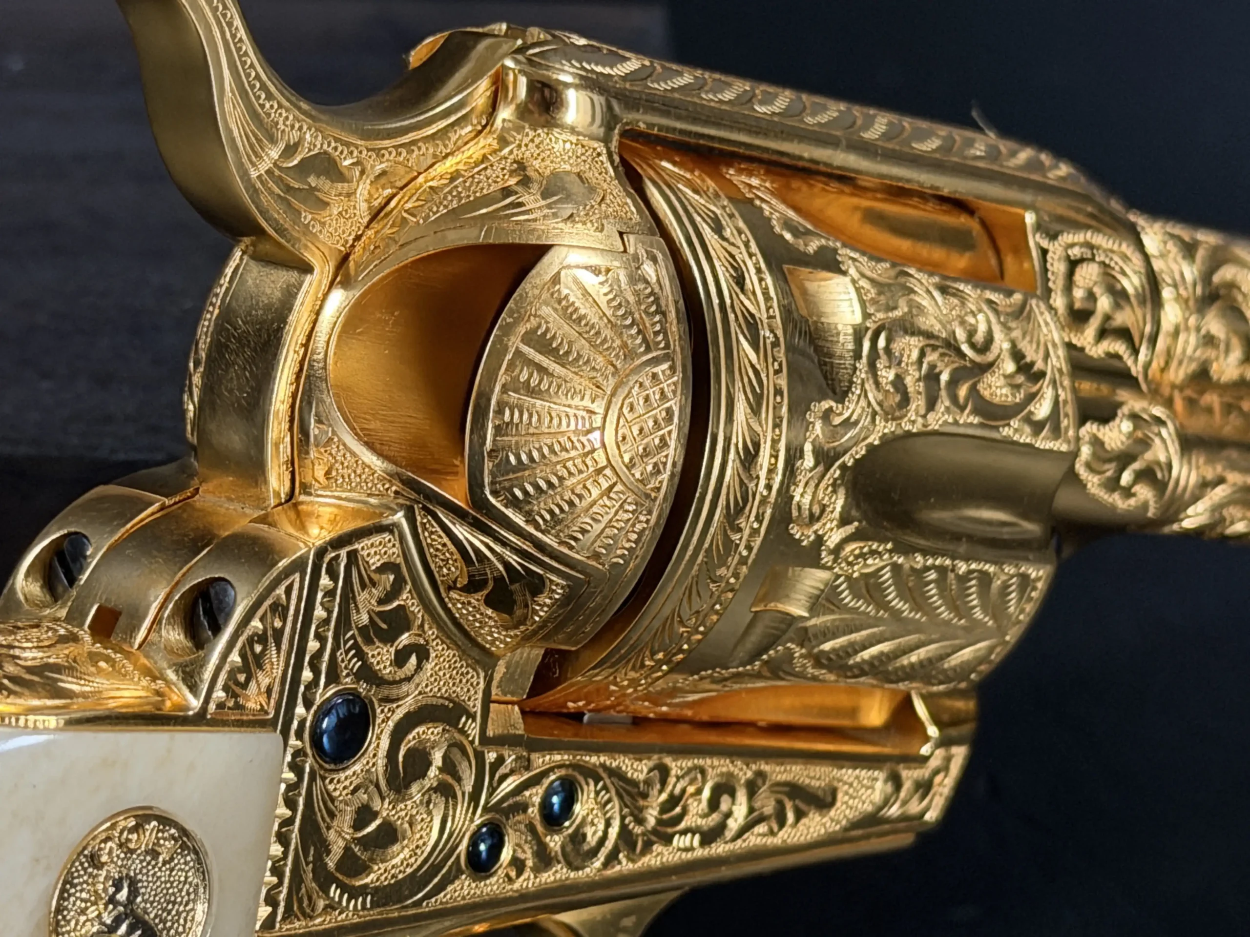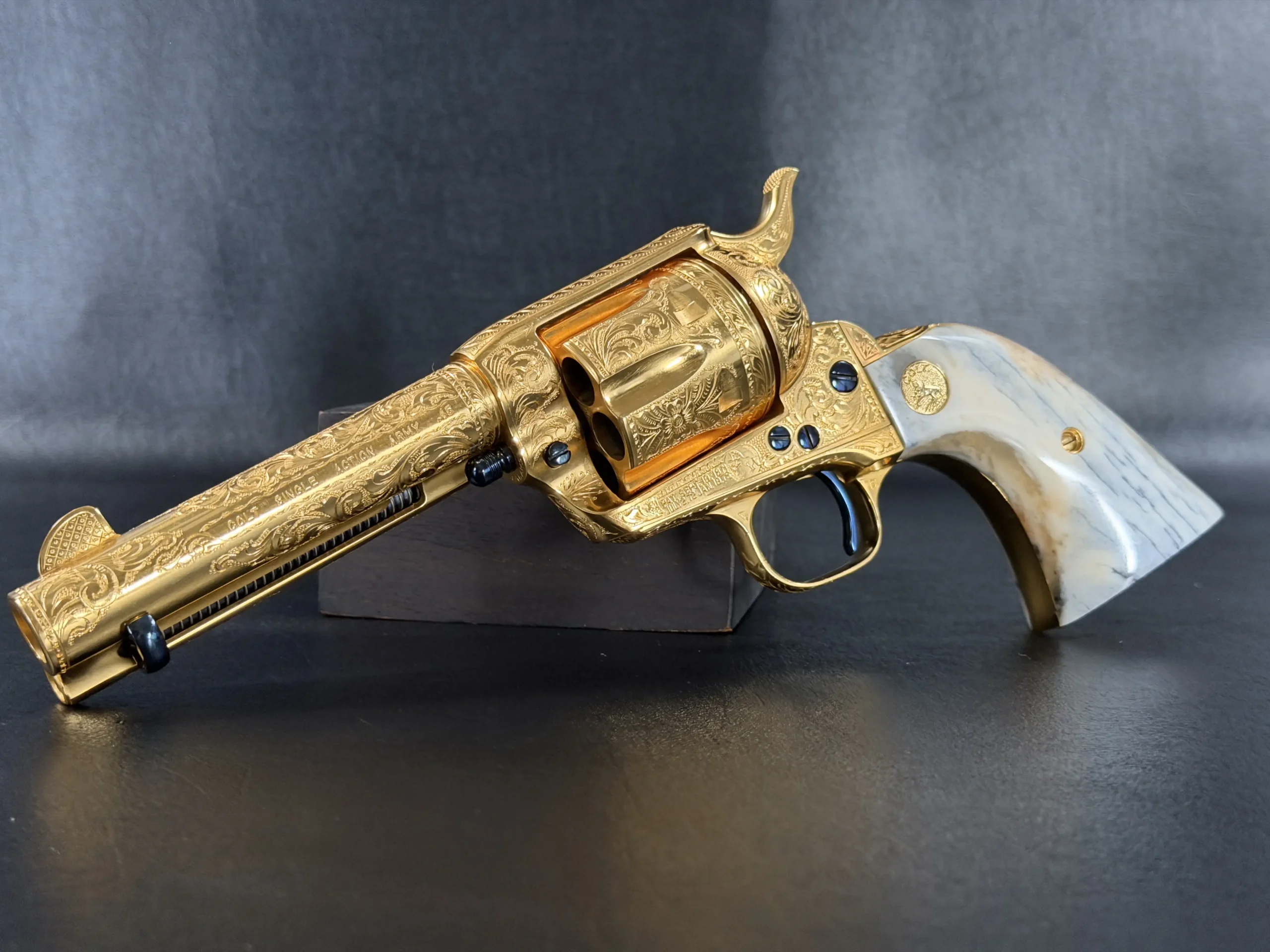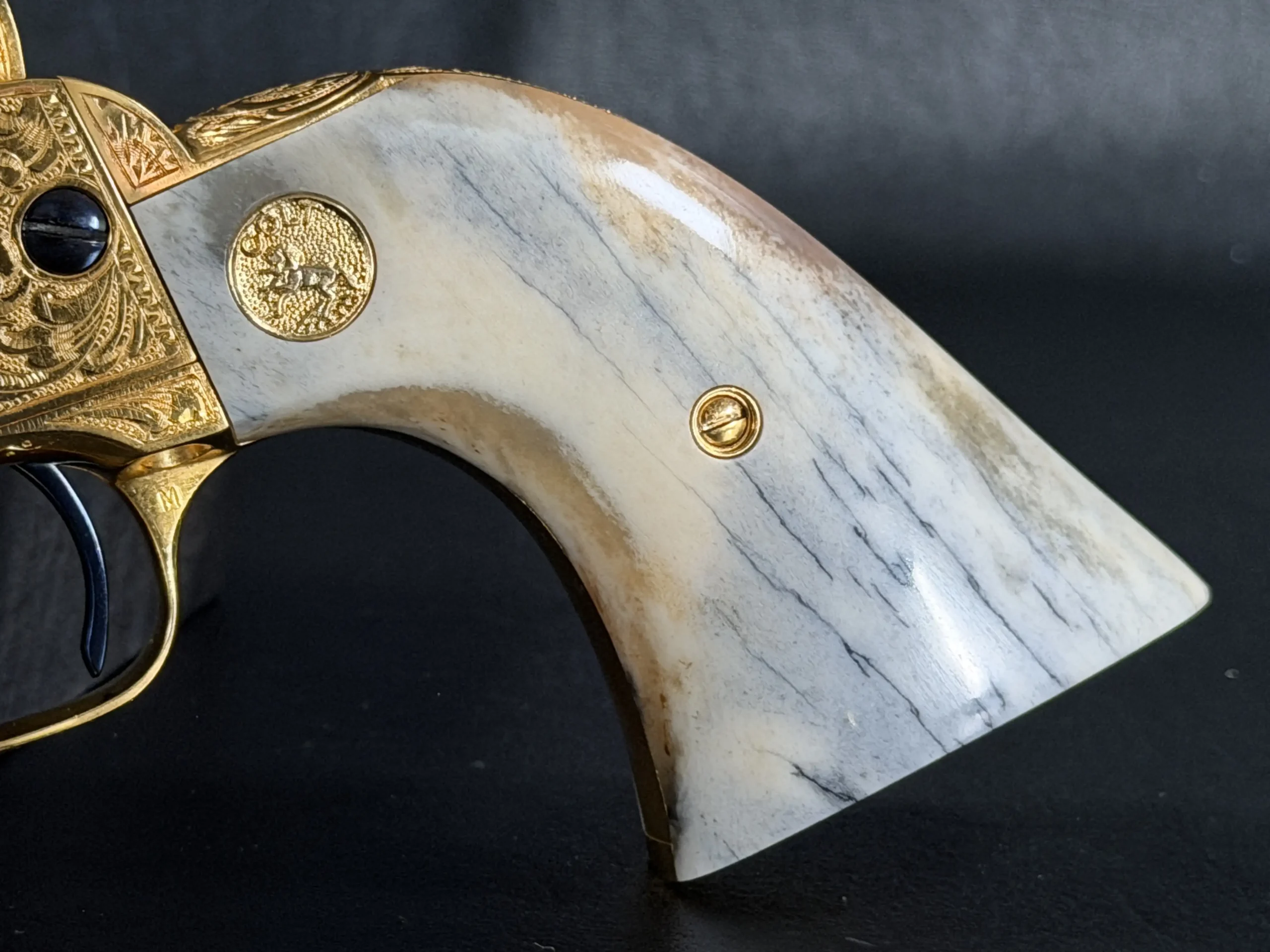 Equally impressive are the grips. The smooth, ivory-toned stocks display natural grain and coloration, offering a soft contrast to the warm brilliance of the gold finish. The classic Colt medallions are perfectly set, reinforcing the revolver’s authenticity and pedigree. The backstrap engraving includes a personalized banner, adding an additional layer of individuality to the piece.