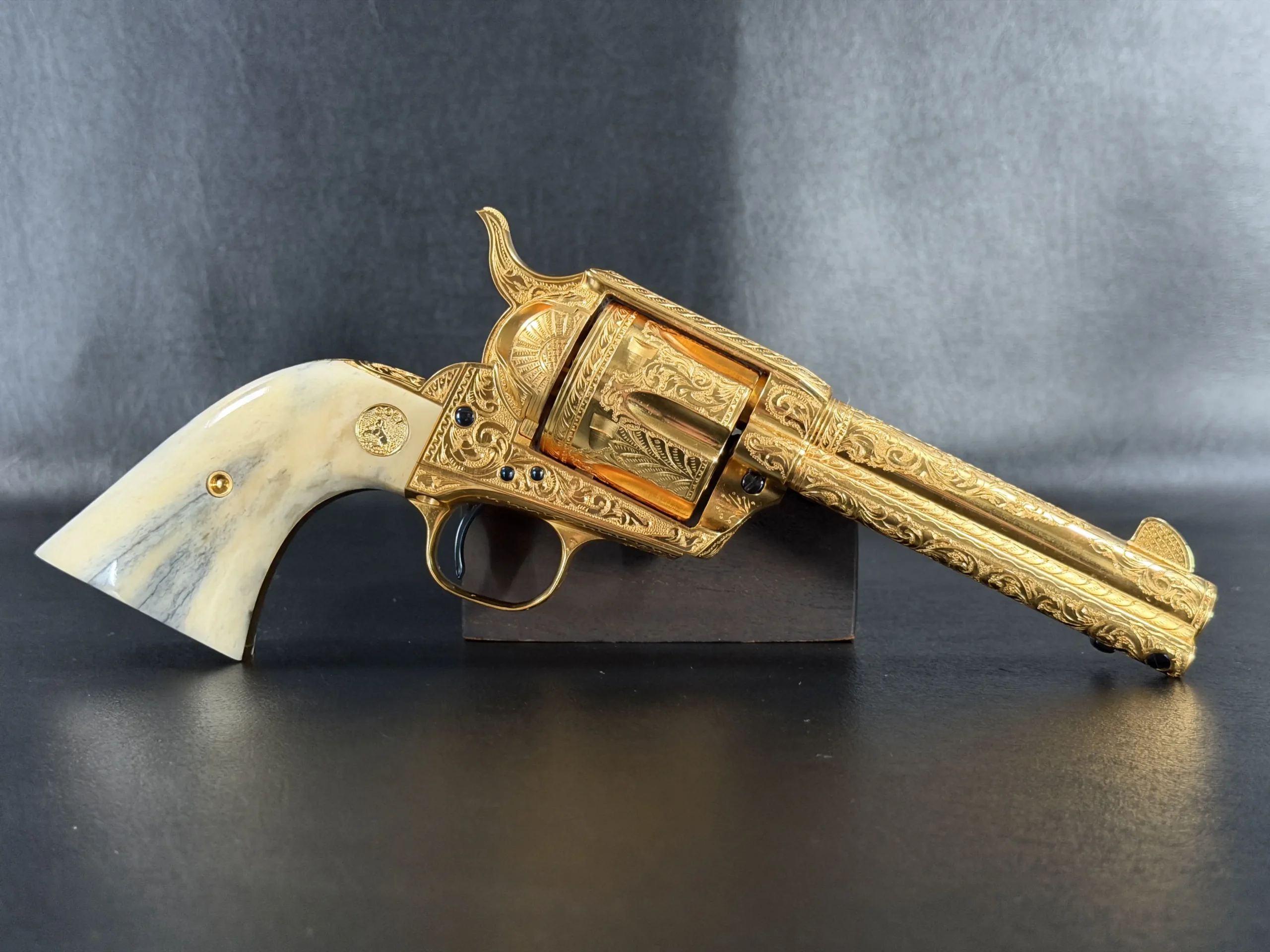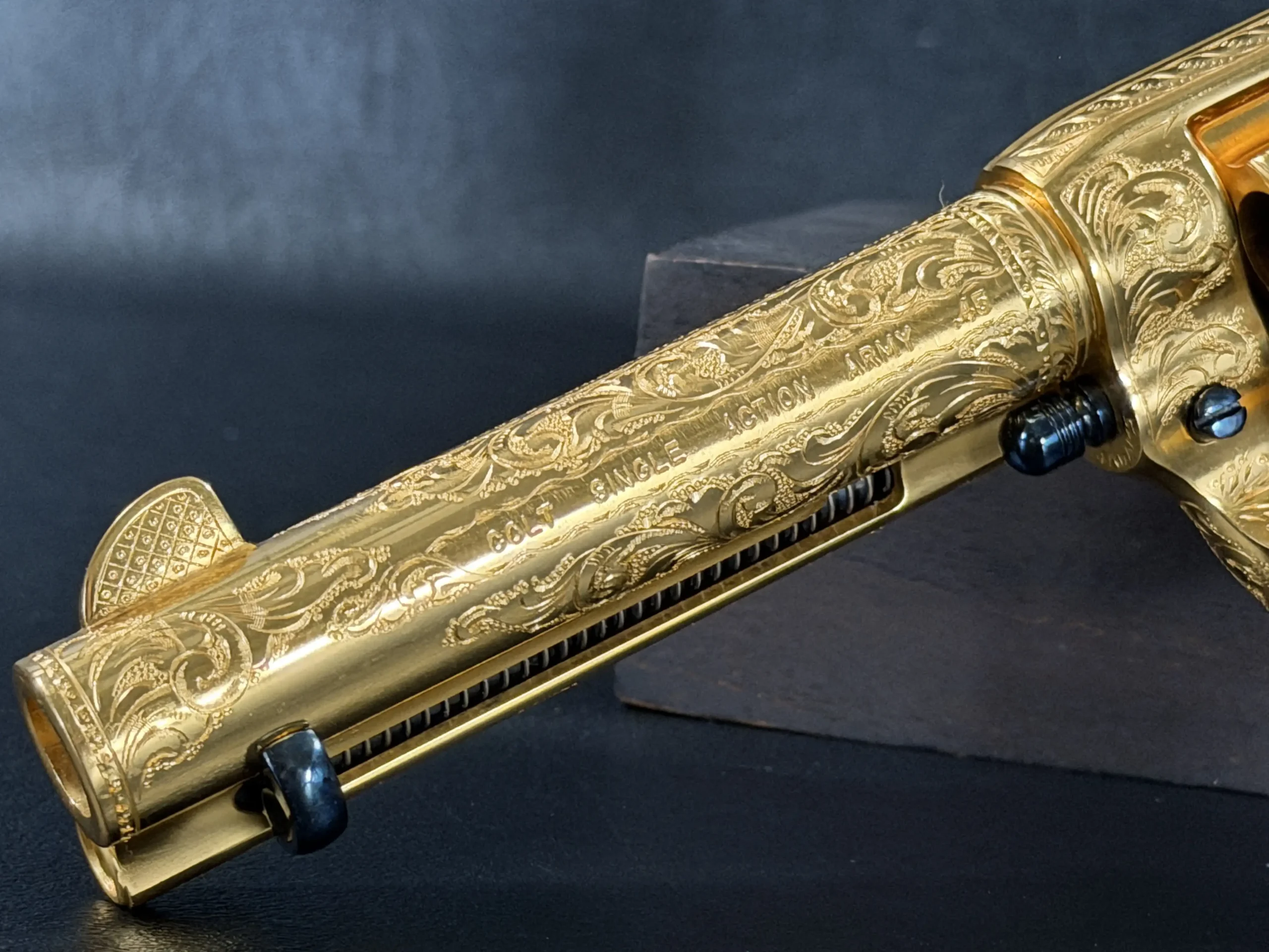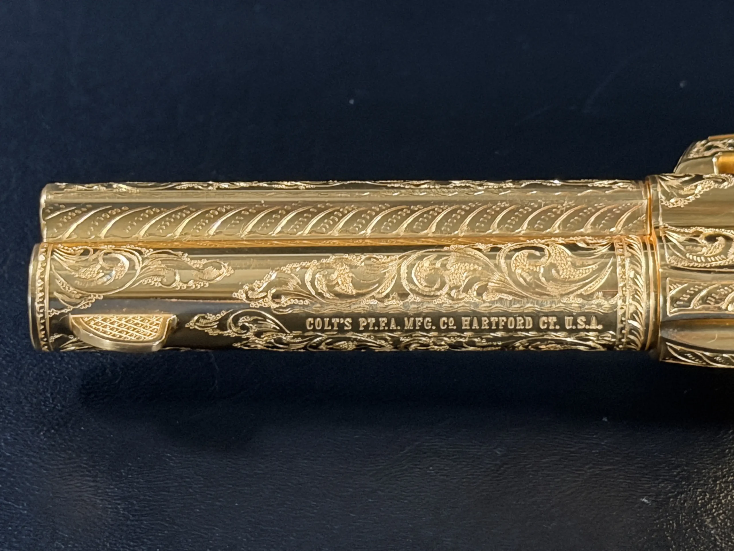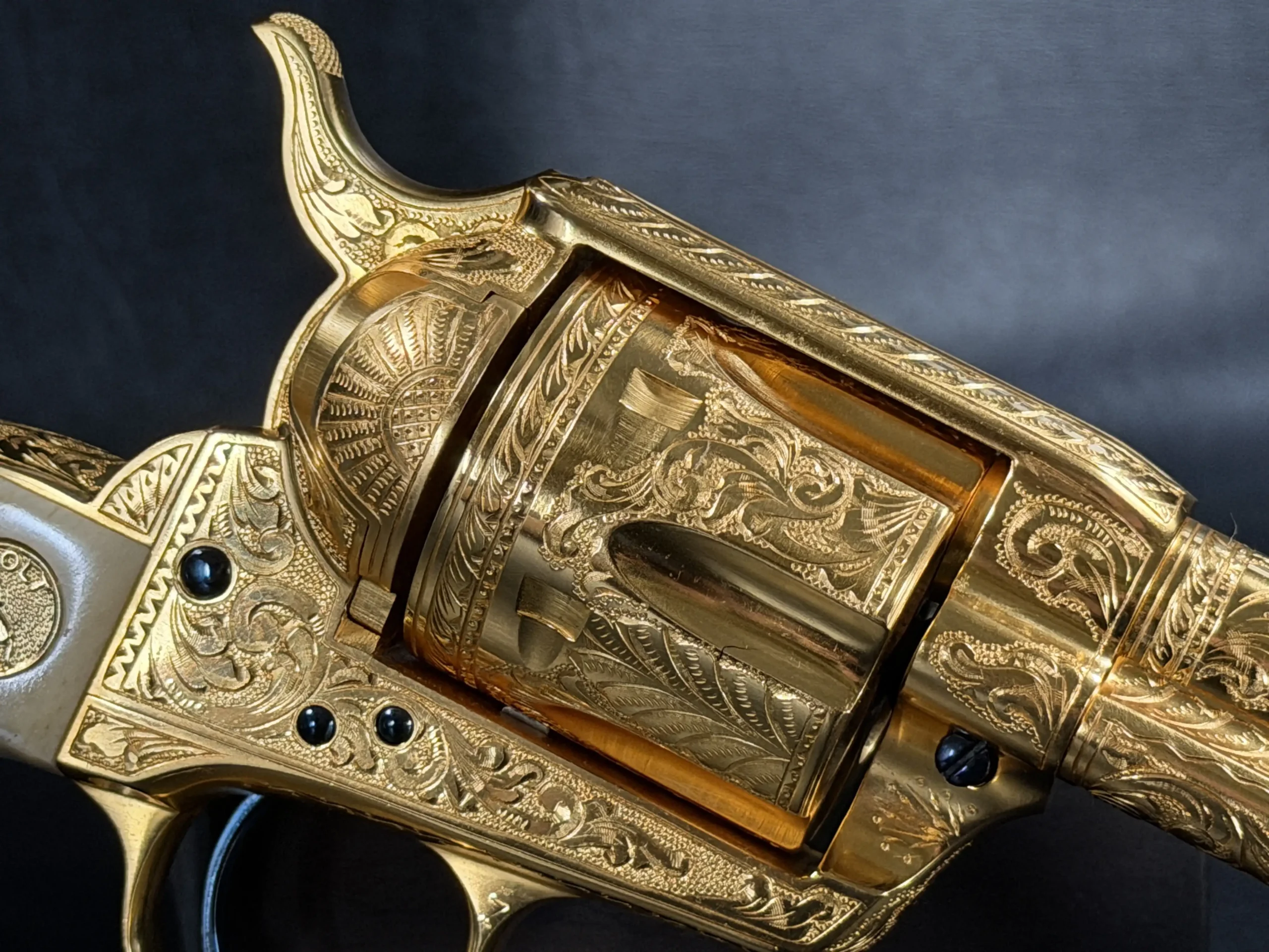 Equally impressive are the grips. The smooth, ivory-toned stocks display natural grain and coloration, offering a soft contrast to the warm brilliance of the gold finish. The classic Colt medallions are perfectly set, reinforcing the revolver’s authenticity and pedigree. The backstrap engraving includes a personalized banner, adding an additional layer of individuality to the piece.