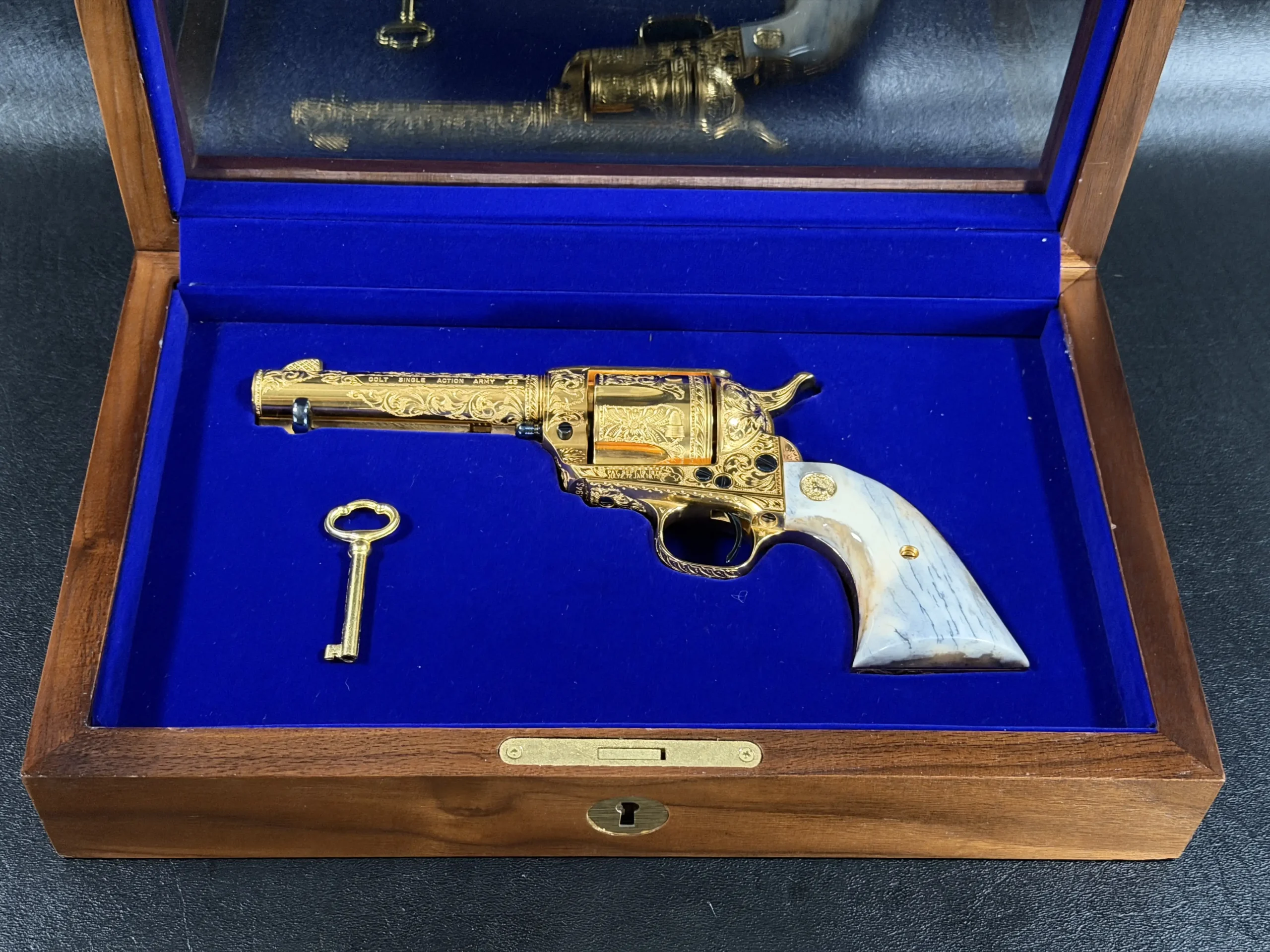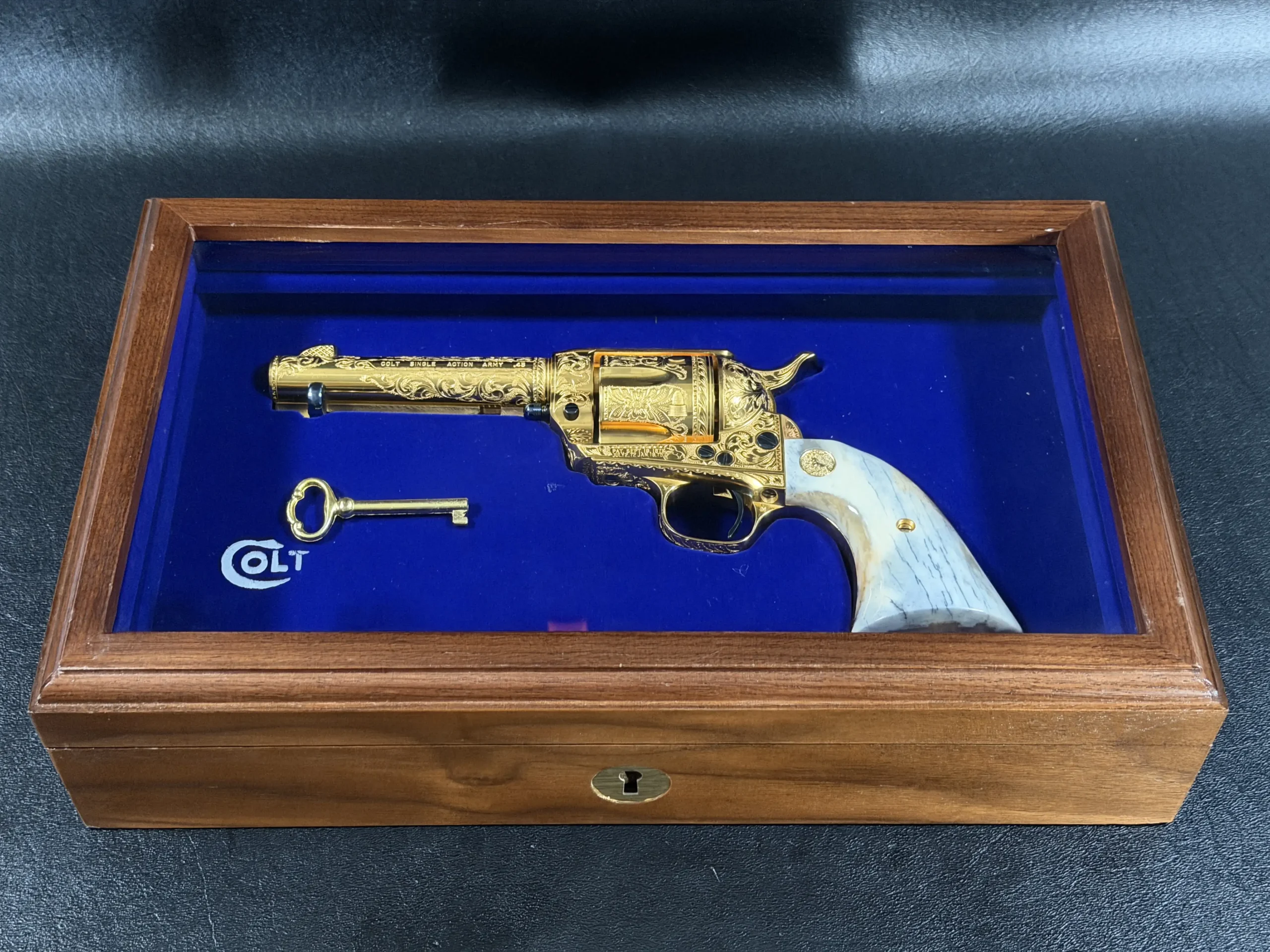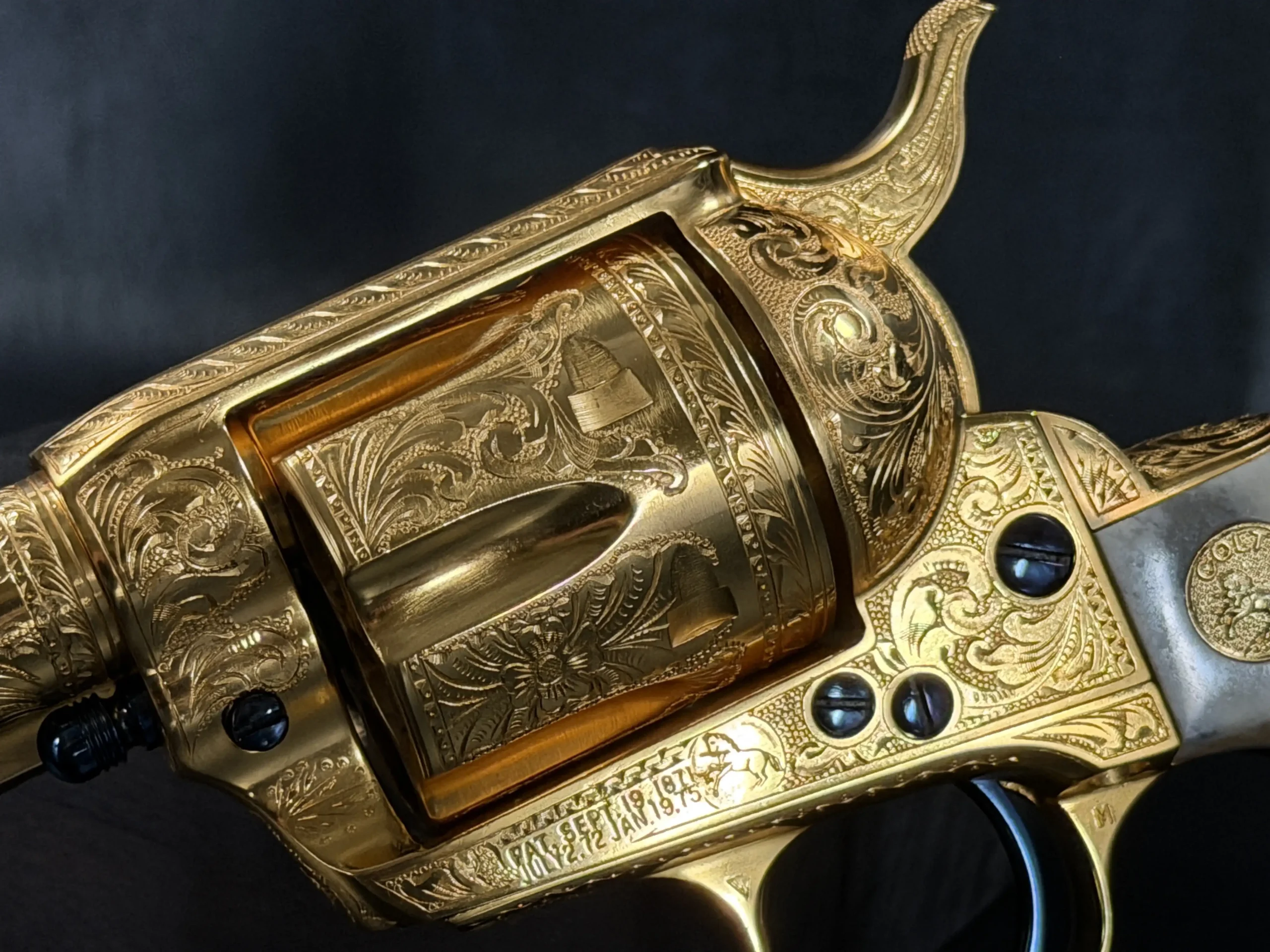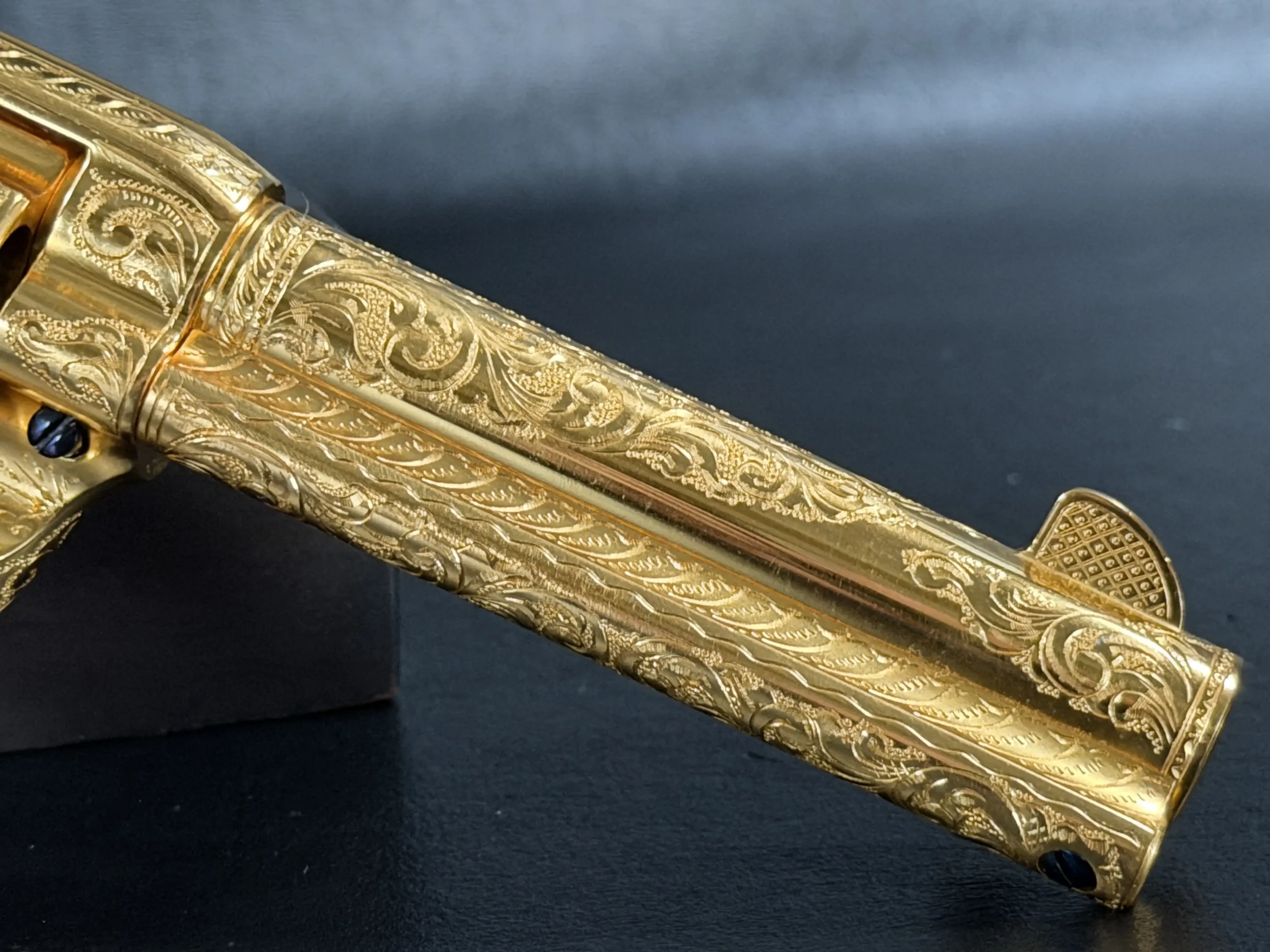 Equally impressive are the grips. The smooth, ivory-toned stocks display natural grain and coloration, offering a soft contrast to the warm brilliance of the gold finish. The classic Colt medallions are perfectly set, reinforcing the revolver’s authenticity and pedigree. The backstrap engraving includes a personalized banner, adding an additional layer of individuality to the piece.