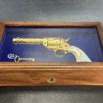 Manufactured in 1975 and still in near-new condition, this Colt hasn’t lost its luster—literally or figuratively. It’s housed in a walnut and glass-top Colt display case, etched with the classic logo and lined with blue velvet. It’s not just a case—it’s a stage. And for a revolver like this, that’s precisely what it deserves.