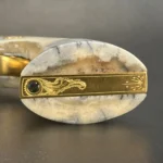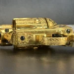 Finished in lustrous full gold, the revolver doesn’t shy away from making a statement. But it’s the contrast that brings it to life—fire-blued screws, trigger, ejector head, and cylinder pin cut through the gold like a sharp suit with just the right tie. Then you get to the grips: two slabs of what’s believed to be ancient mammoth ivory streaked with deep blues, rich browns, and creamy whites. It’s like holding a piece of natural history wrapped in elegance.