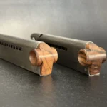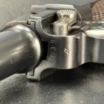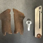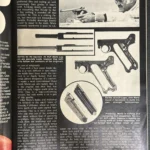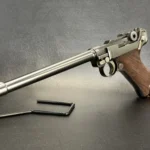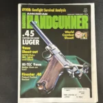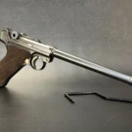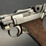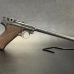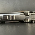 Manufactured using a combination of new-made components and vintage Luger parts, this pistol takes an overall form and configuration similar to a Imperial German Navy Pattern Luger, up-sized to run the larger .45 ACP cartridge. Features fixed blade front and notch rear sights, “2002” date on top of the extension, “crown/N” proof on the left side of the extension, “JVM” marked on the front toggle link, “MSTR” on the left frame rail for Martz Safe Toggle Release mechanism (which converts the safety switch into a dual purpose safety and toggle release lever), “74” and “JVM” in an oval under the side plate on the frame.