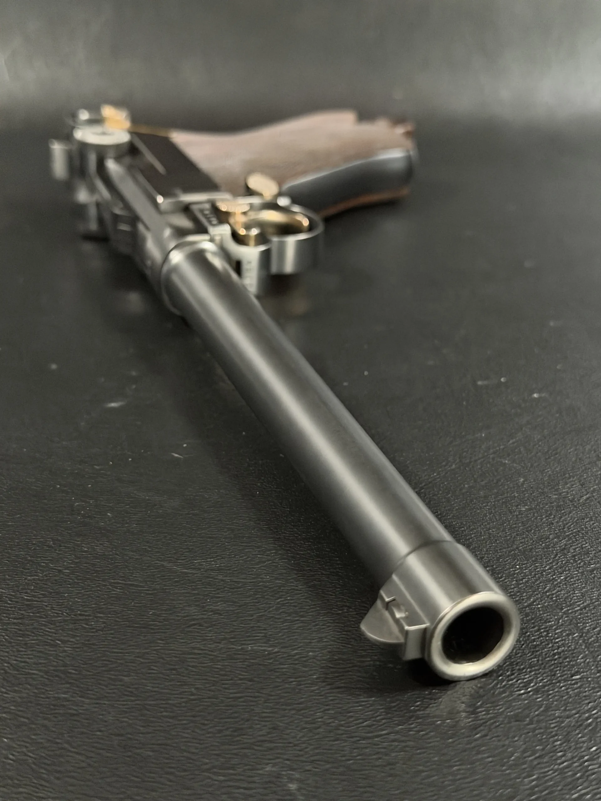 The pistol retains the unmistakable Luger profile while exhibiting Martz’s hallmark craftsmanship throughout. The long barrel, finely finished metal surfaces, and beautifully fitted grips give the gun an elegant, almost restrained appearance, belying the complexity beneath. Subtle gold-tone controls and accents provide visual contrast without overpowering the design, while the precision-cut toggle assembly and markings confirm its bespoke nature.