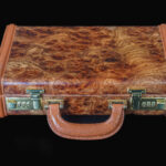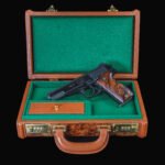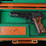 To complement its exquisite design, the Korriphila HSP 701 is presented in a finely crafted wood display case. The interior of the case is lined with plush green felt, providing a luxurious and protective environment for the handgun. The case is meticulously designed with custom cuts to hold the firearm and magazine in place securely. Furthermore, it includes a lid that ensures the contents remain stable and protected from shifting during storage or transportation.