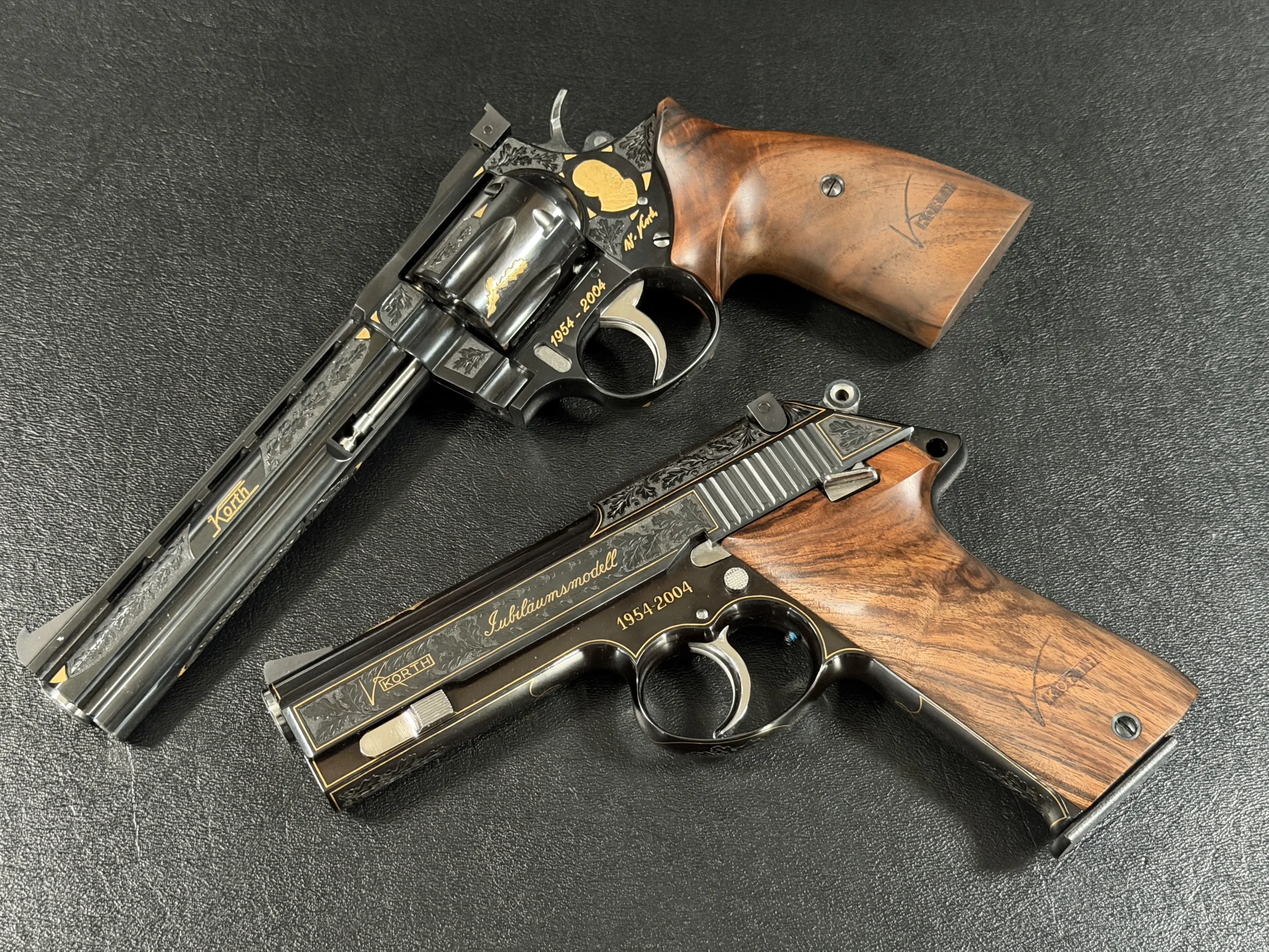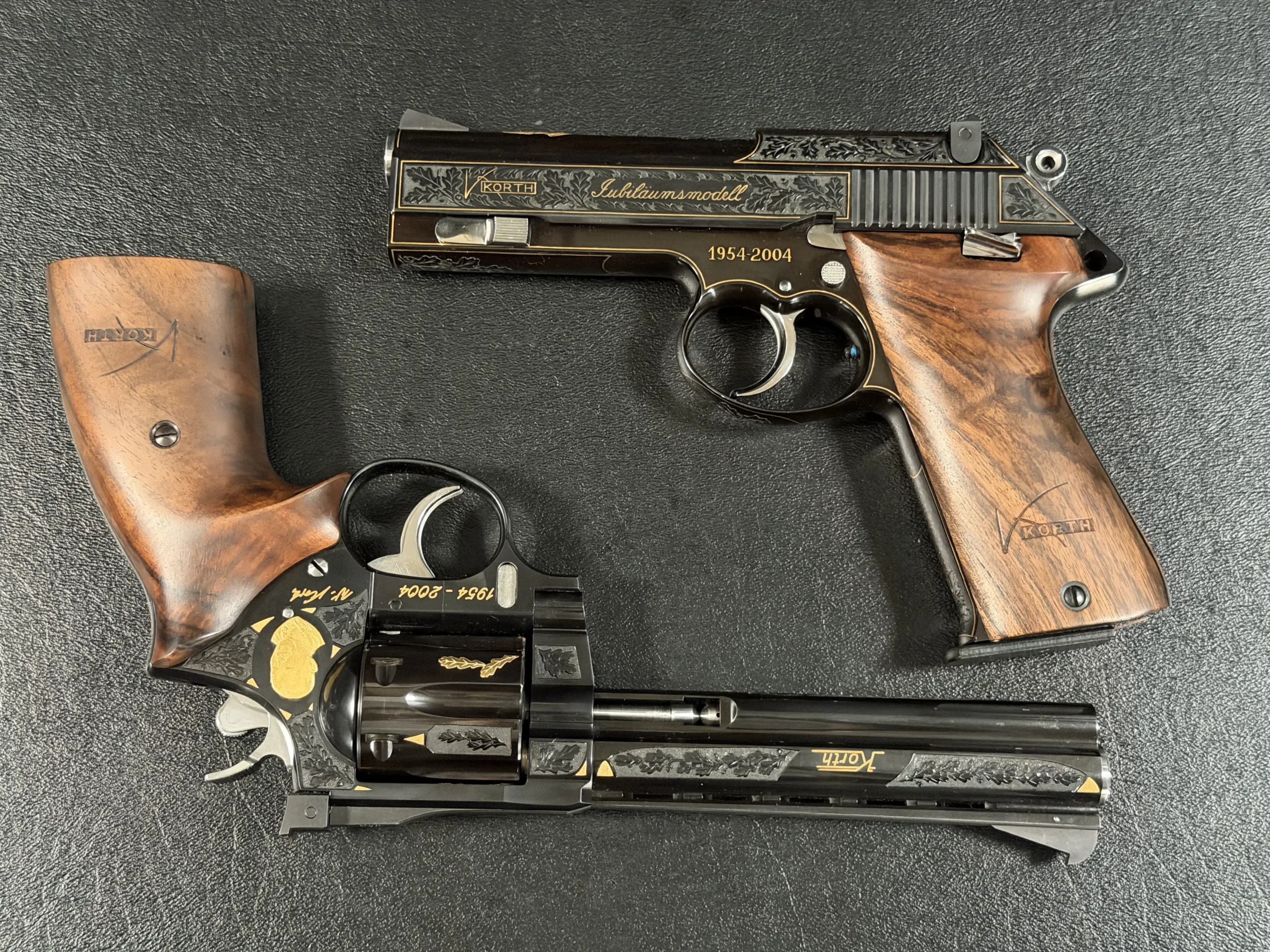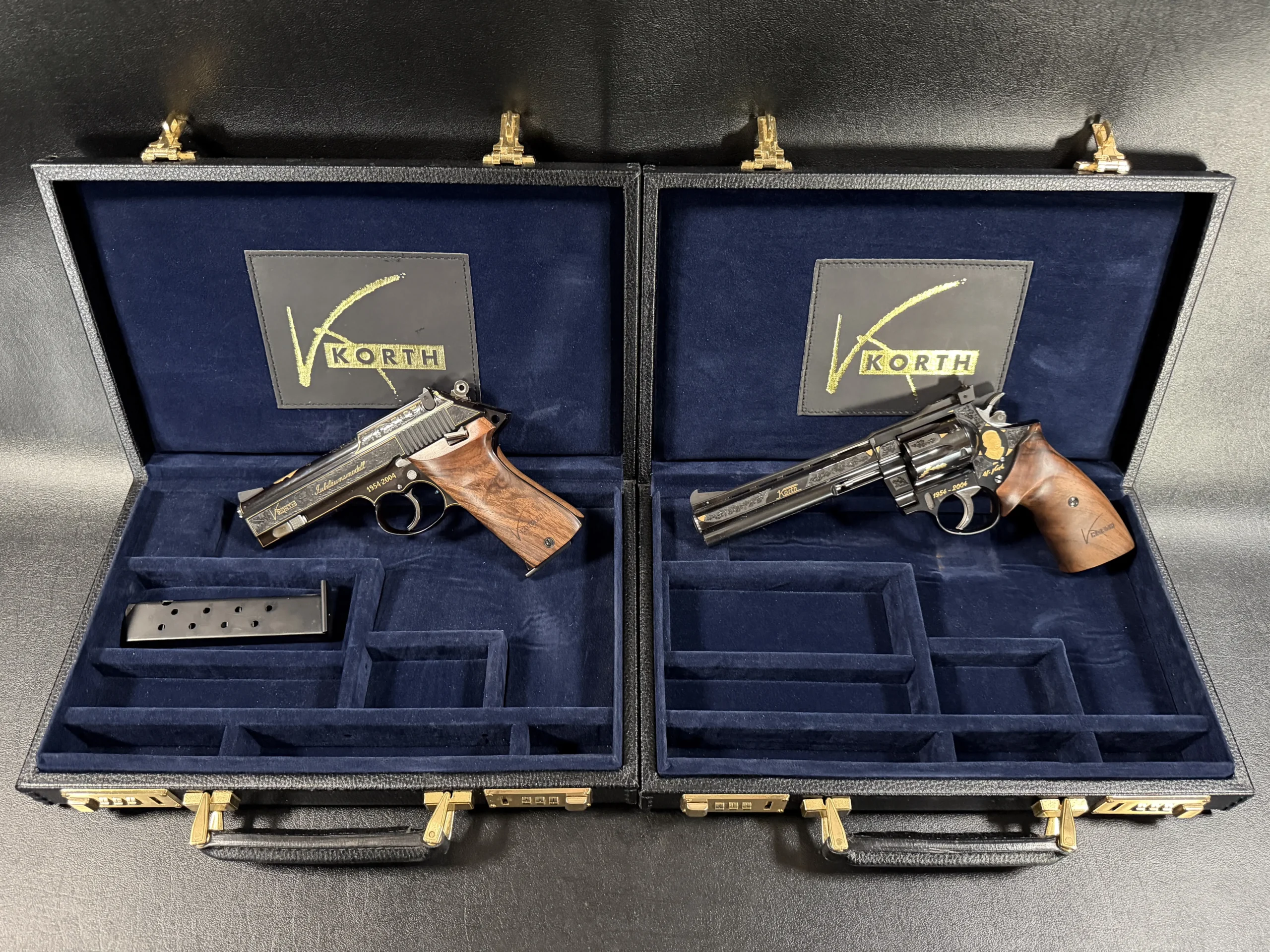 The semi-auto, chambered in 9mm, carries the sleek lines and signature lockwork of Korth’s early semi-automatic designs. The revolver, chambered in .357 Magnum, features Korth’s renowned precision-machined cylinder and impeccably tuned trigger—hallmarks of the brand’s reputation among elite collectors and competitive marksmen.
