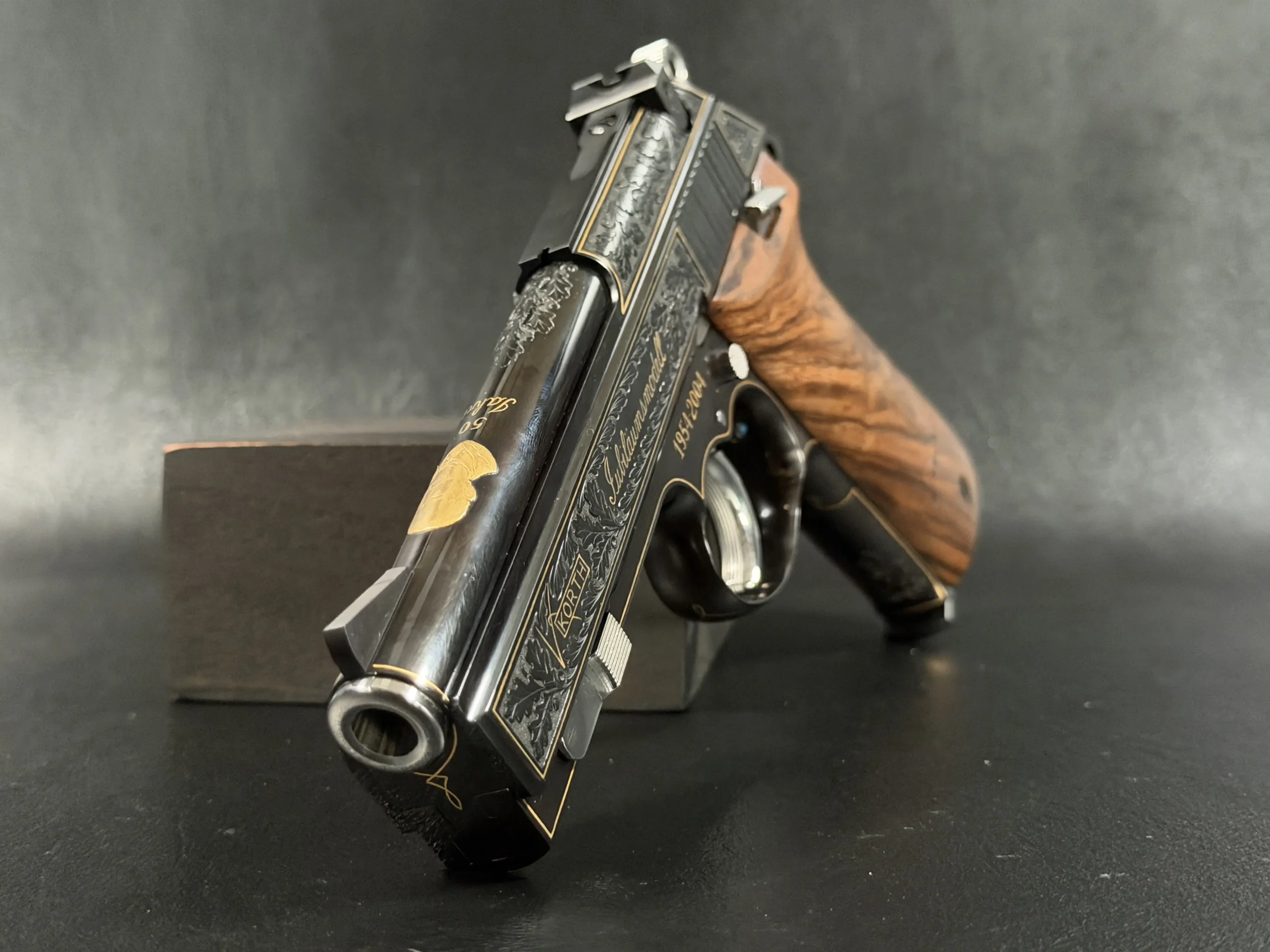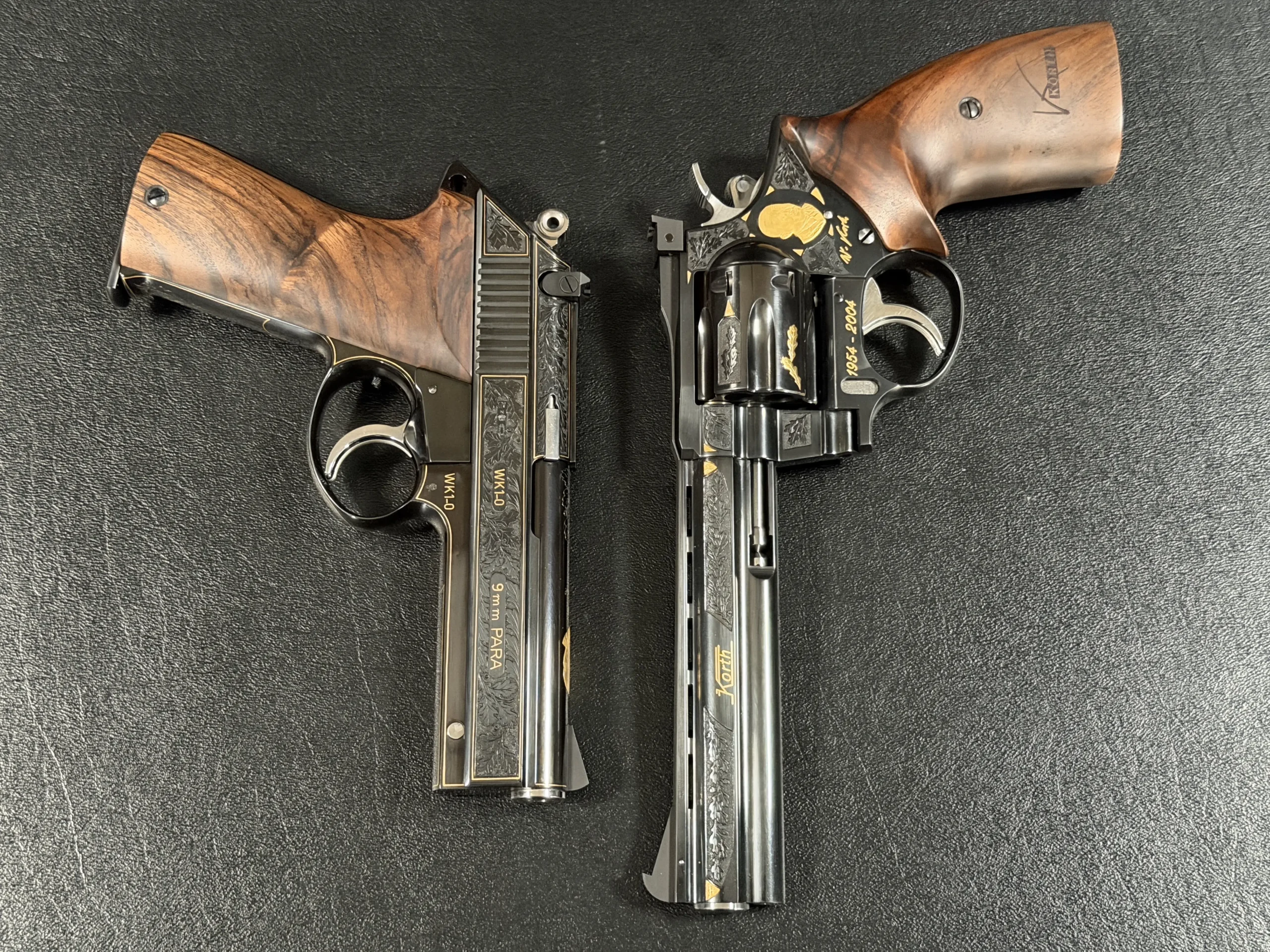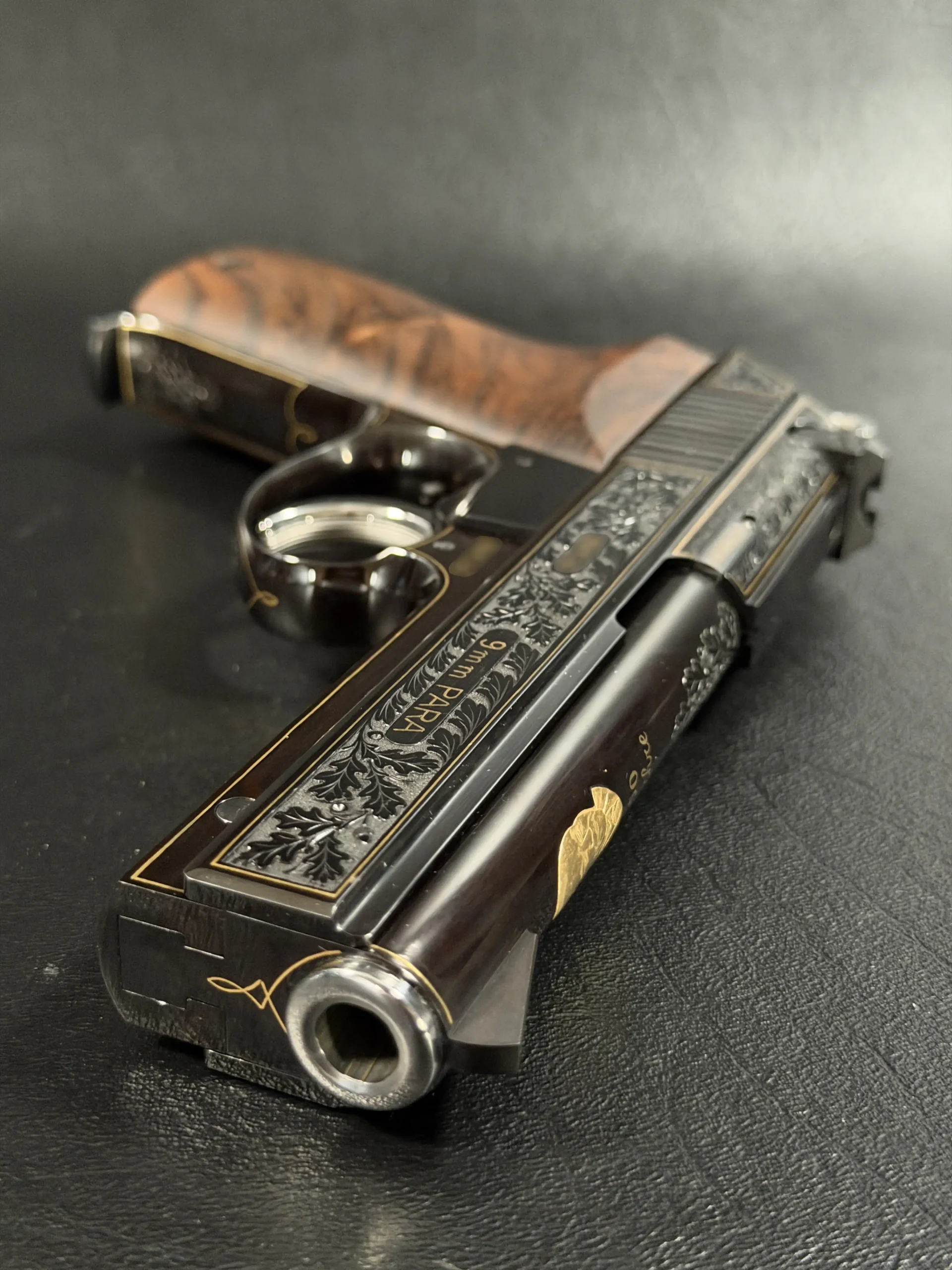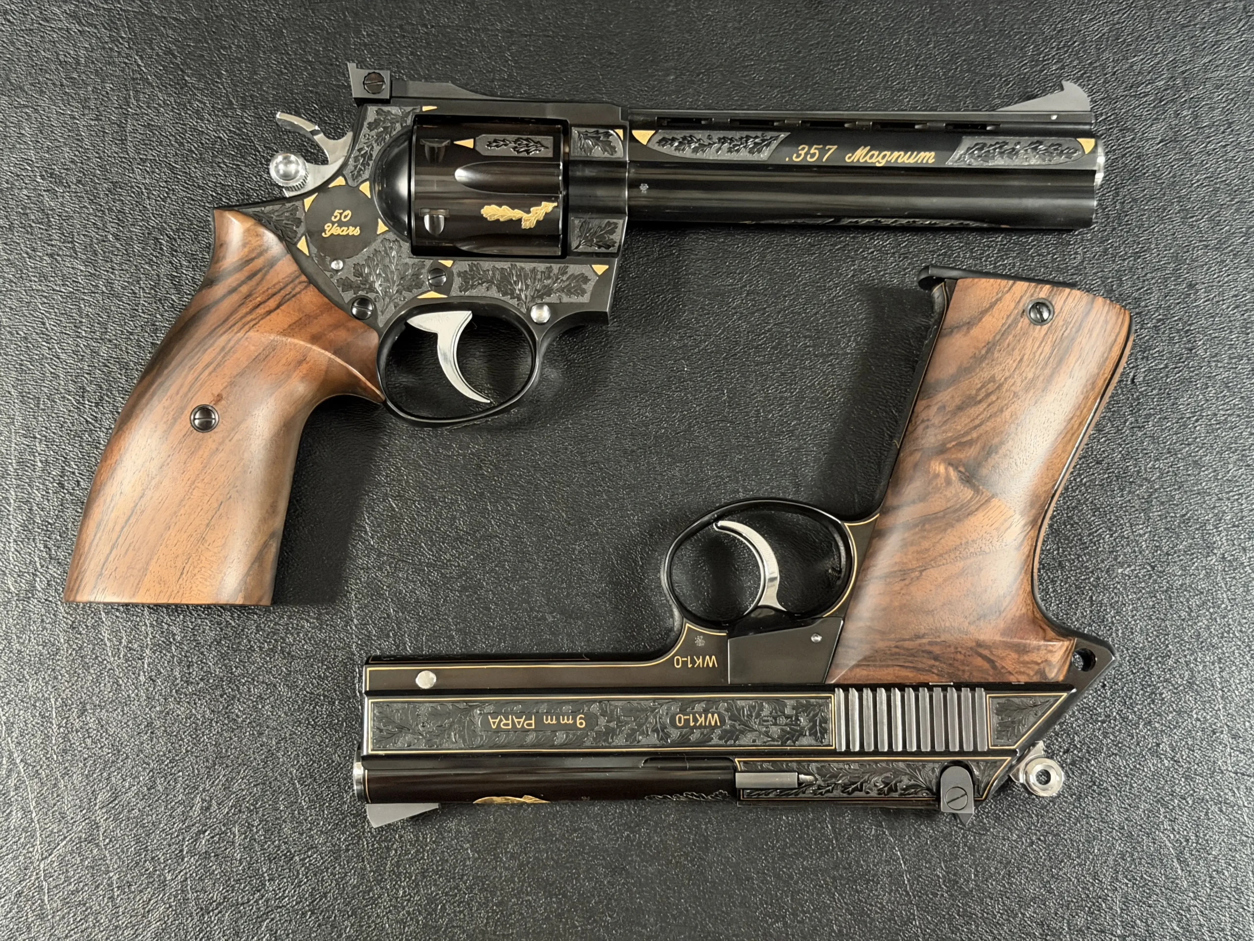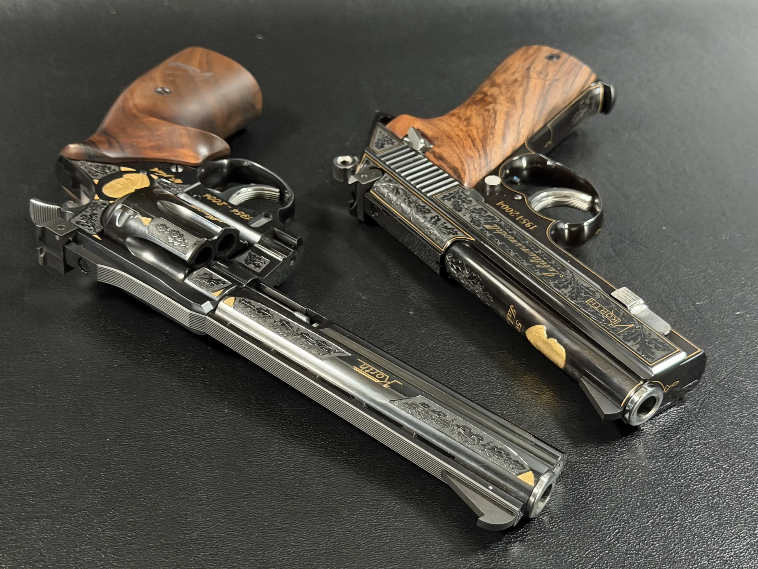 This set includes a 9mm semi-automatic pistol and a .357 Magnum revolver, each finished to an uncompromising standard. Both pieces share a unified visual language: deep, mirror-polished bluing, elaborate full-coverage engraving, and elegant 24k gold inlay highlighting commemorative dates, signatures, and select ornamental motifs. The engraving features classic German scrollwork framed by delicate gold borders, with subtle relief elements that showcase the engraver’s depth of skill.