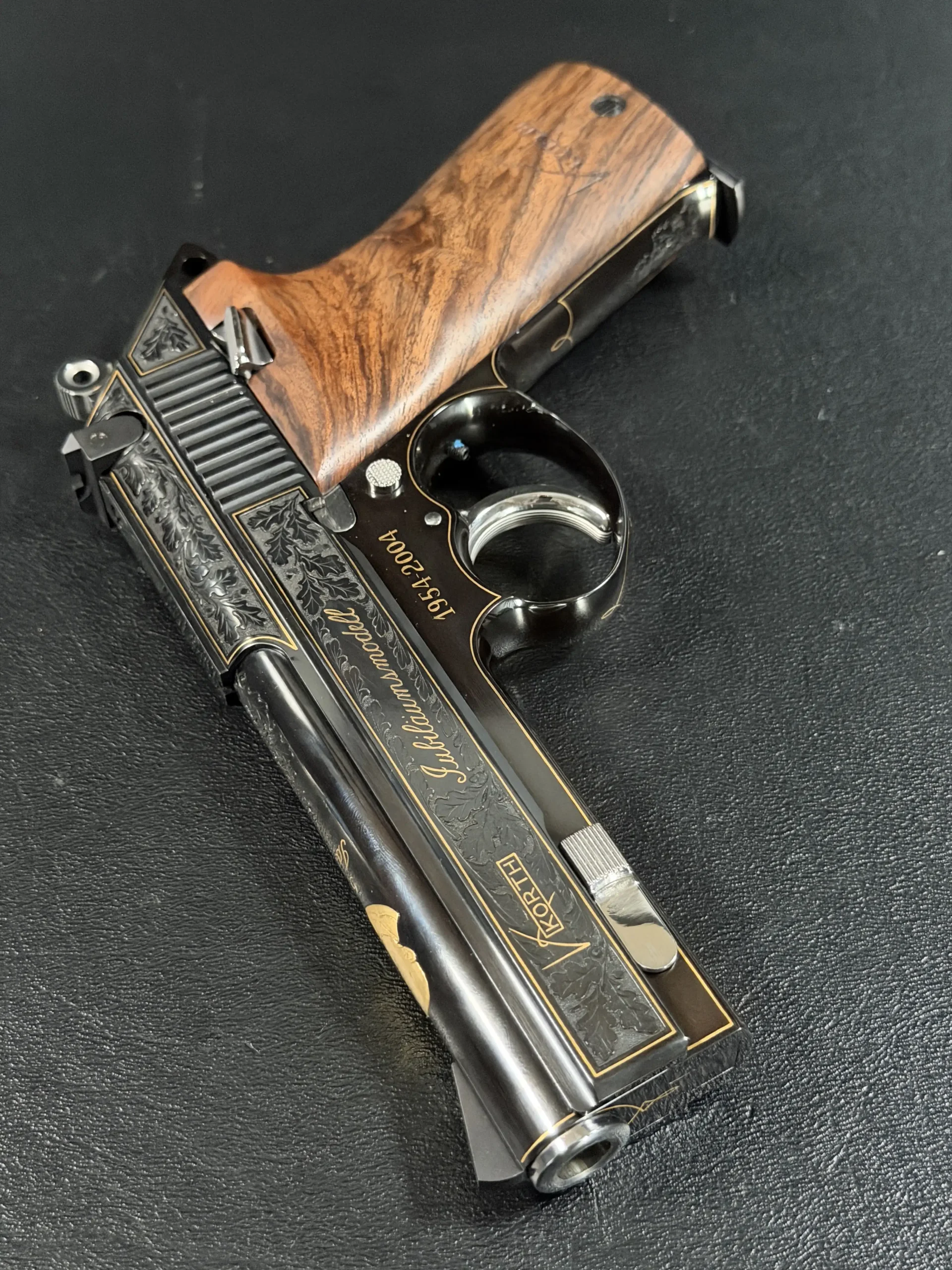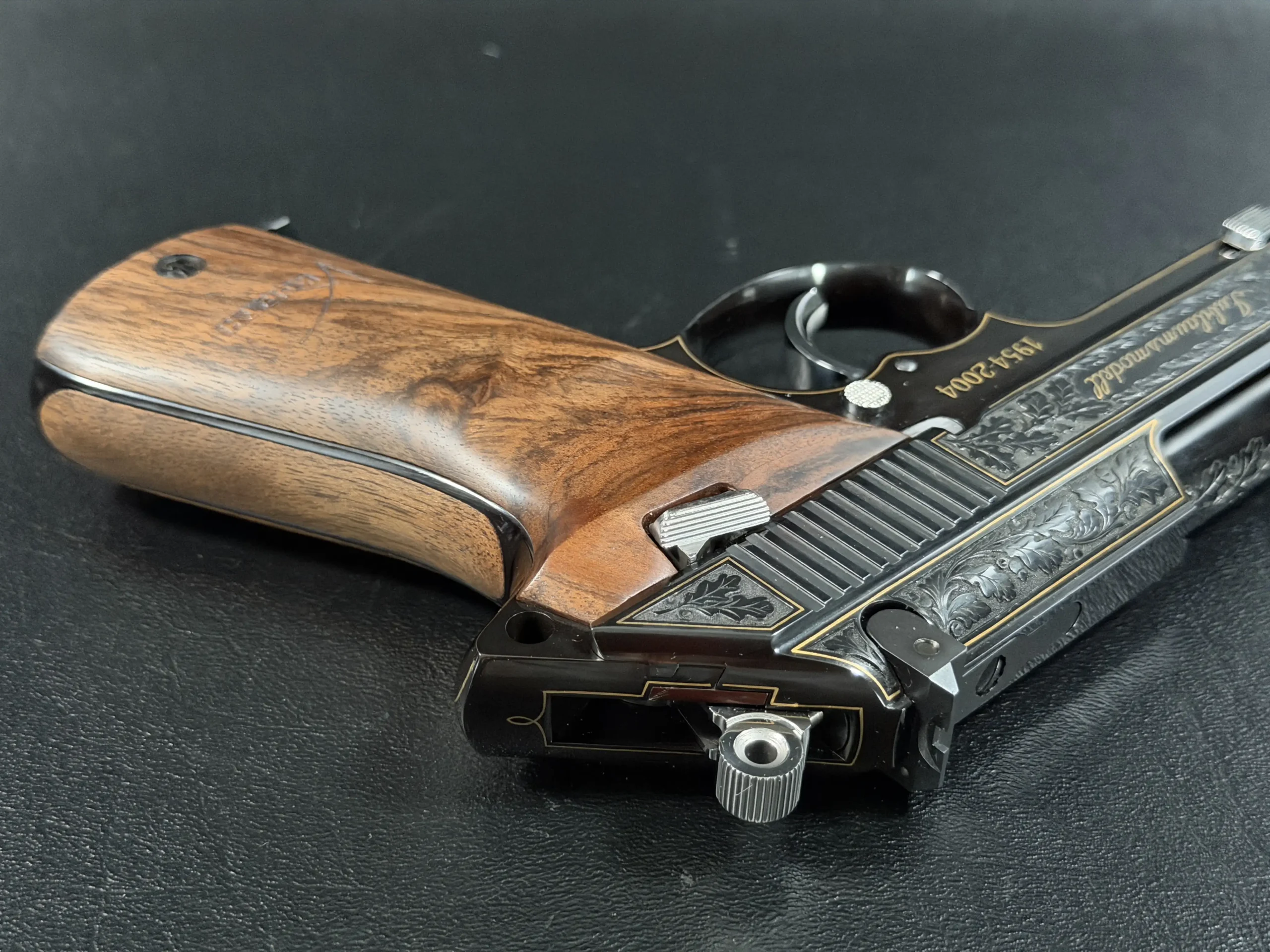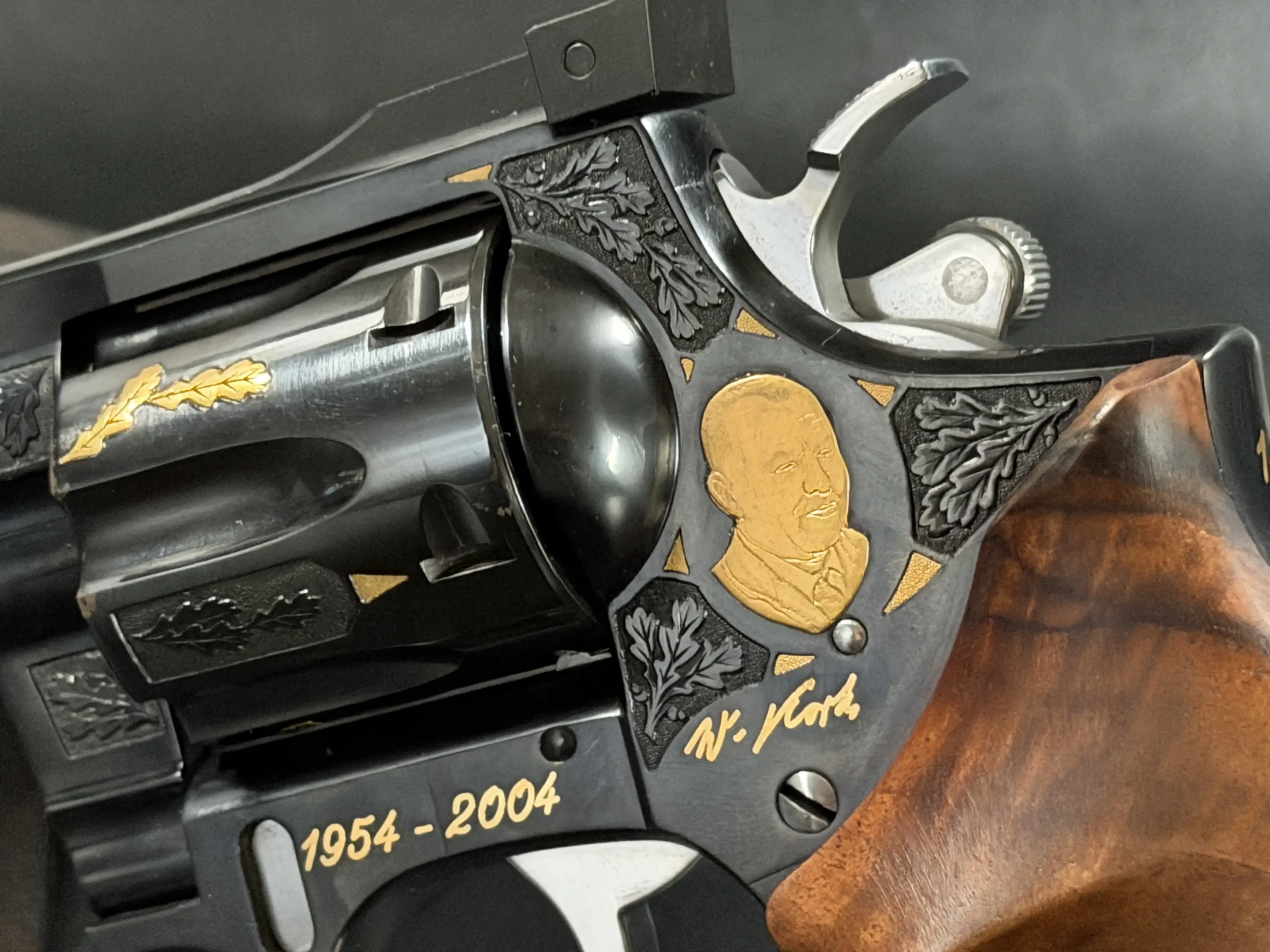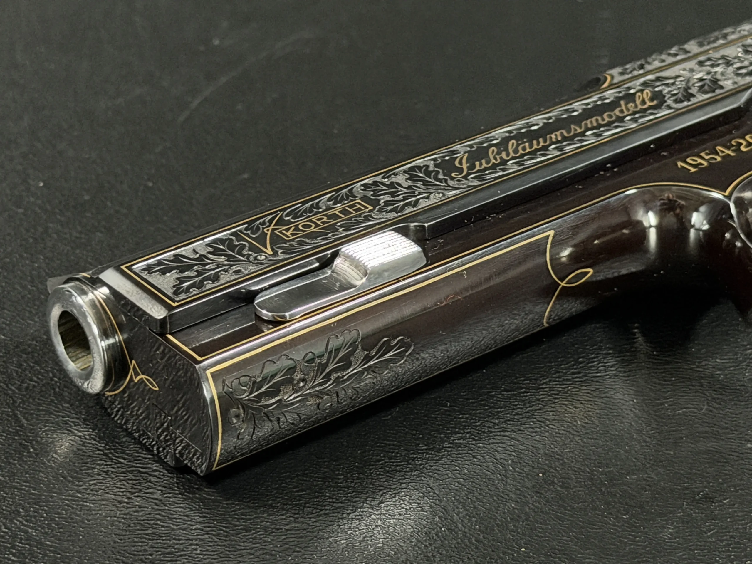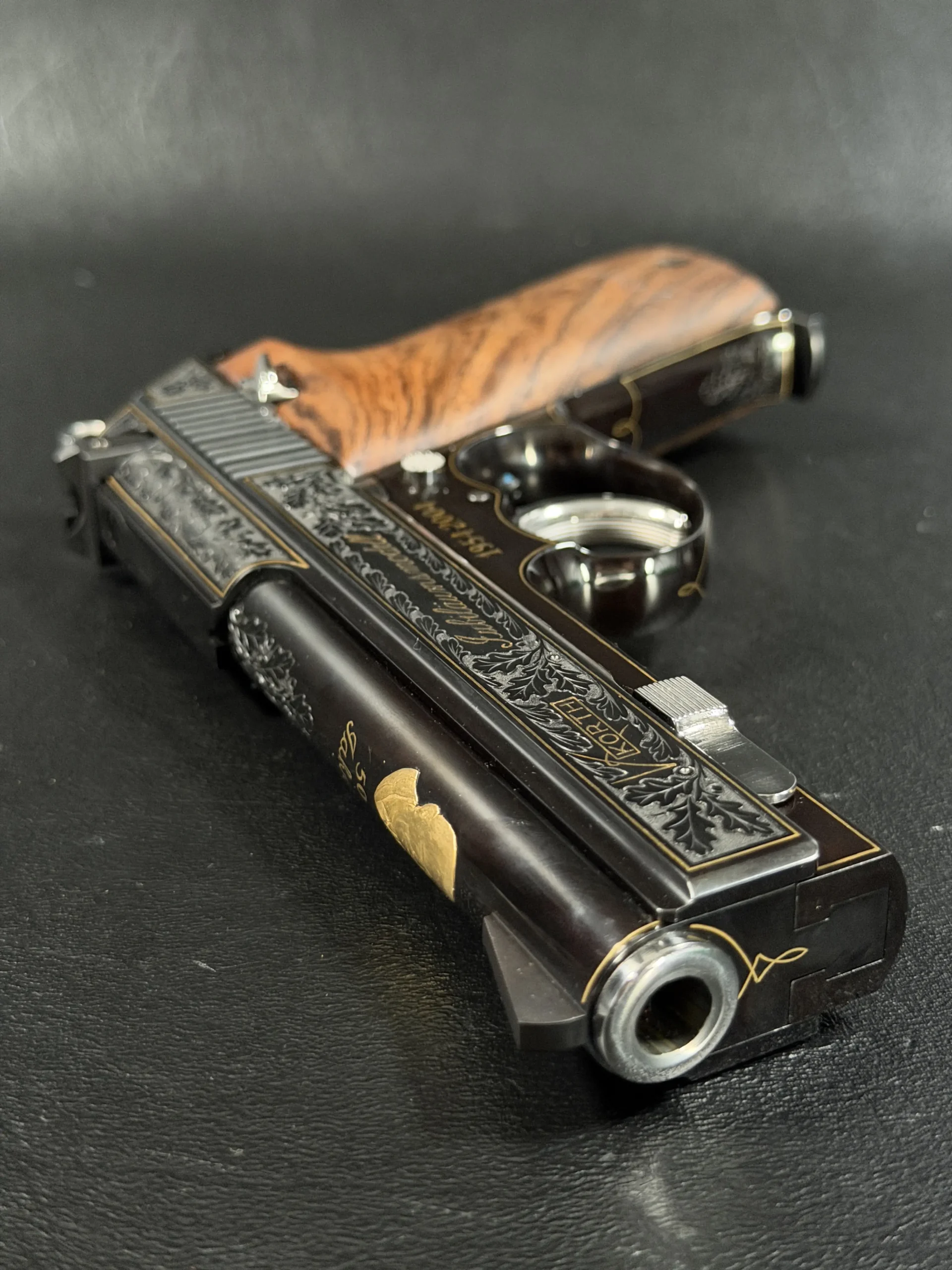 This set includes a 9mm semi-automatic pistol and a .357 Magnum revolver, each finished to an uncompromising standard. Both pieces share a unified visual language: deep, mirror-polished bluing, elaborate full-coverage engraving, and elegant 24k gold inlay highlighting commemorative dates, signatures, and select ornamental motifs. The engraving features classic German scrollwork framed by delicate gold borders, with subtle relief elements that showcase the engraver’s depth of skill.