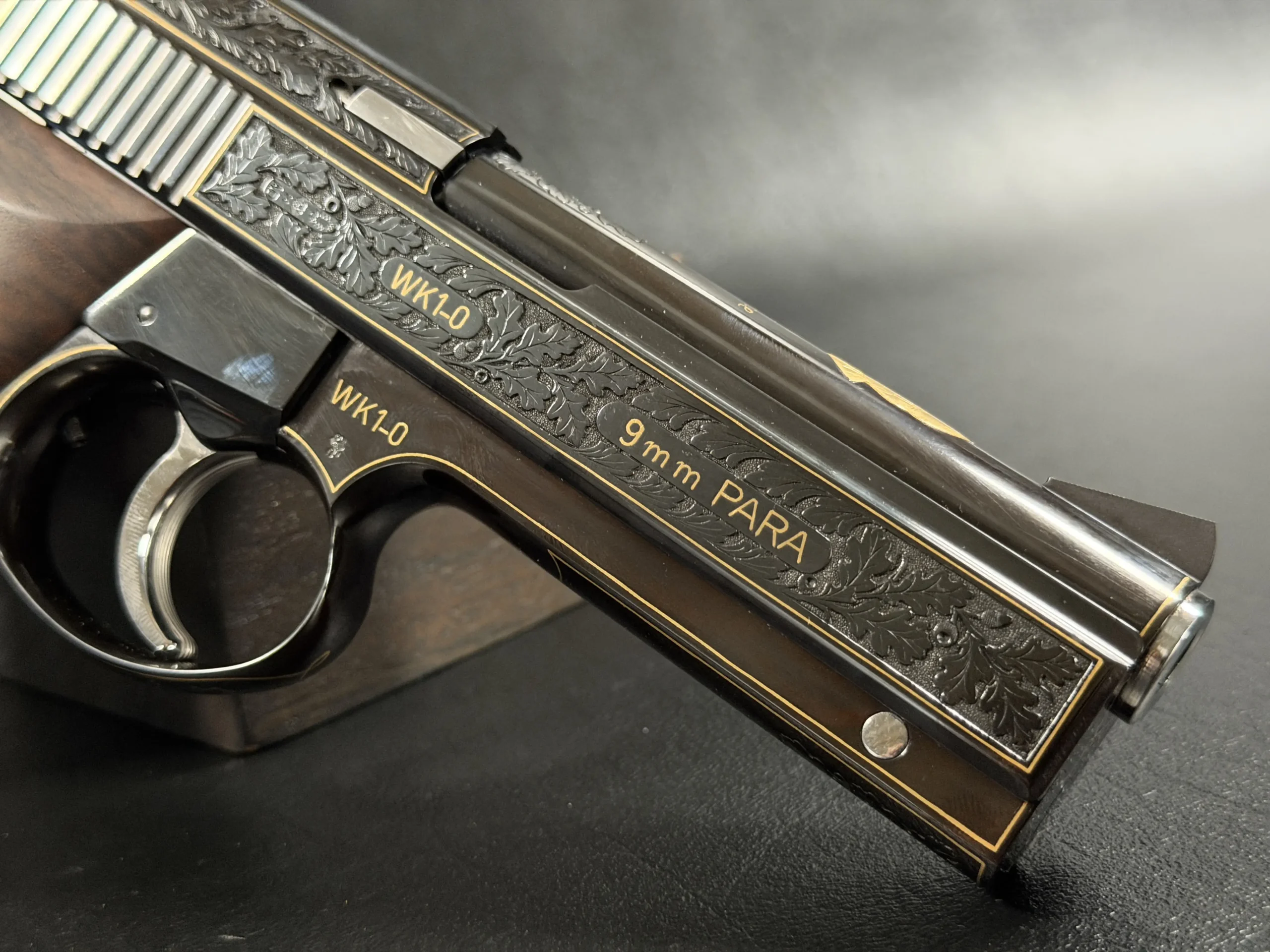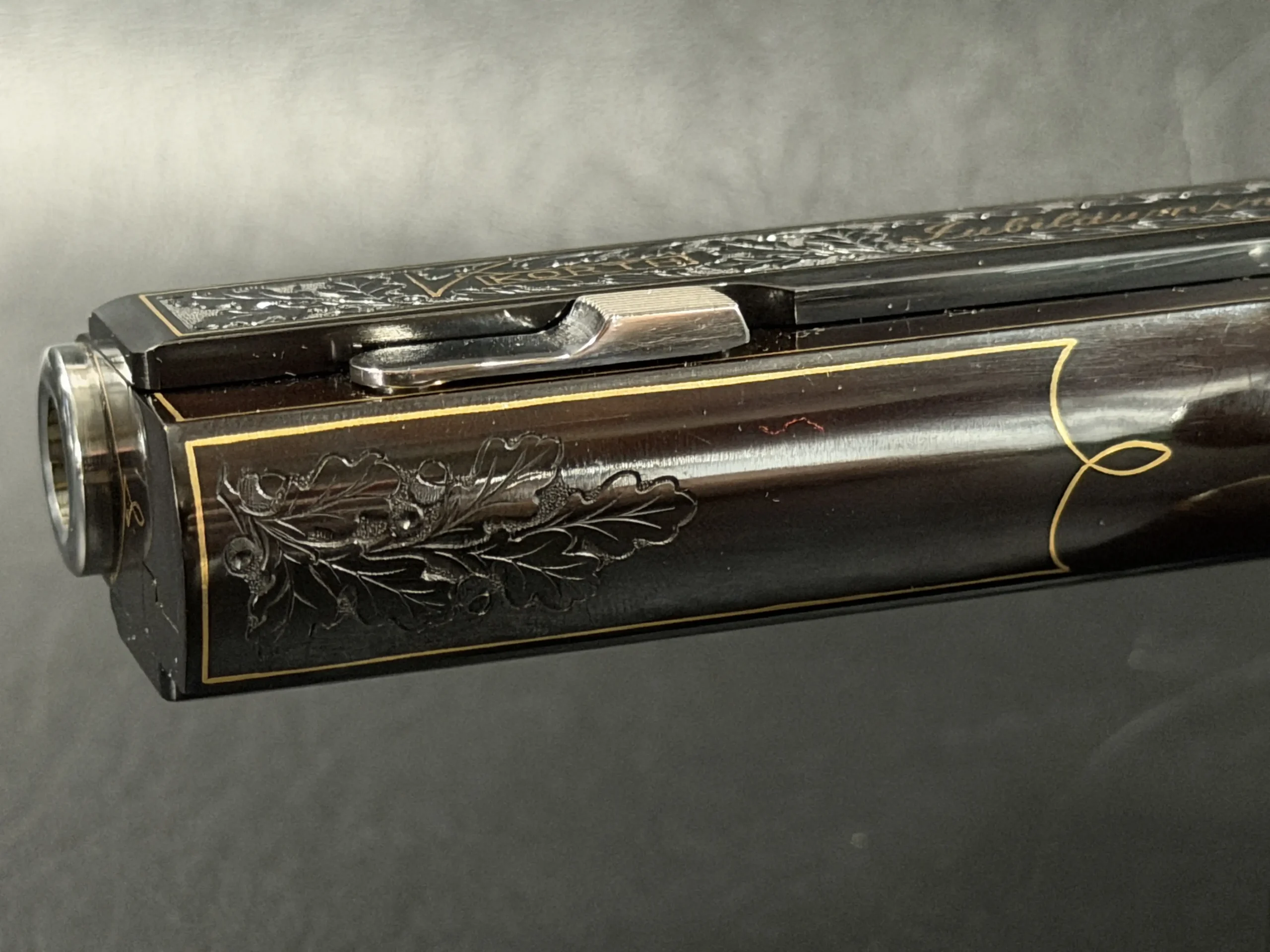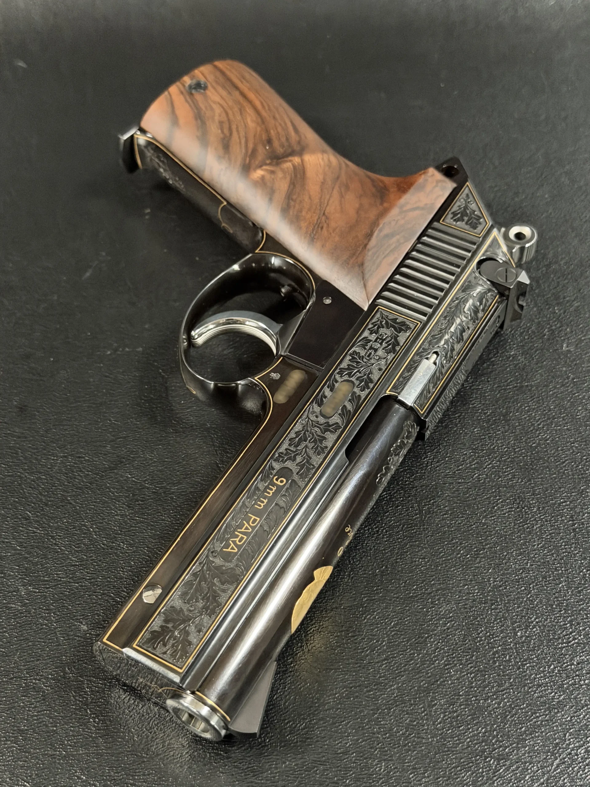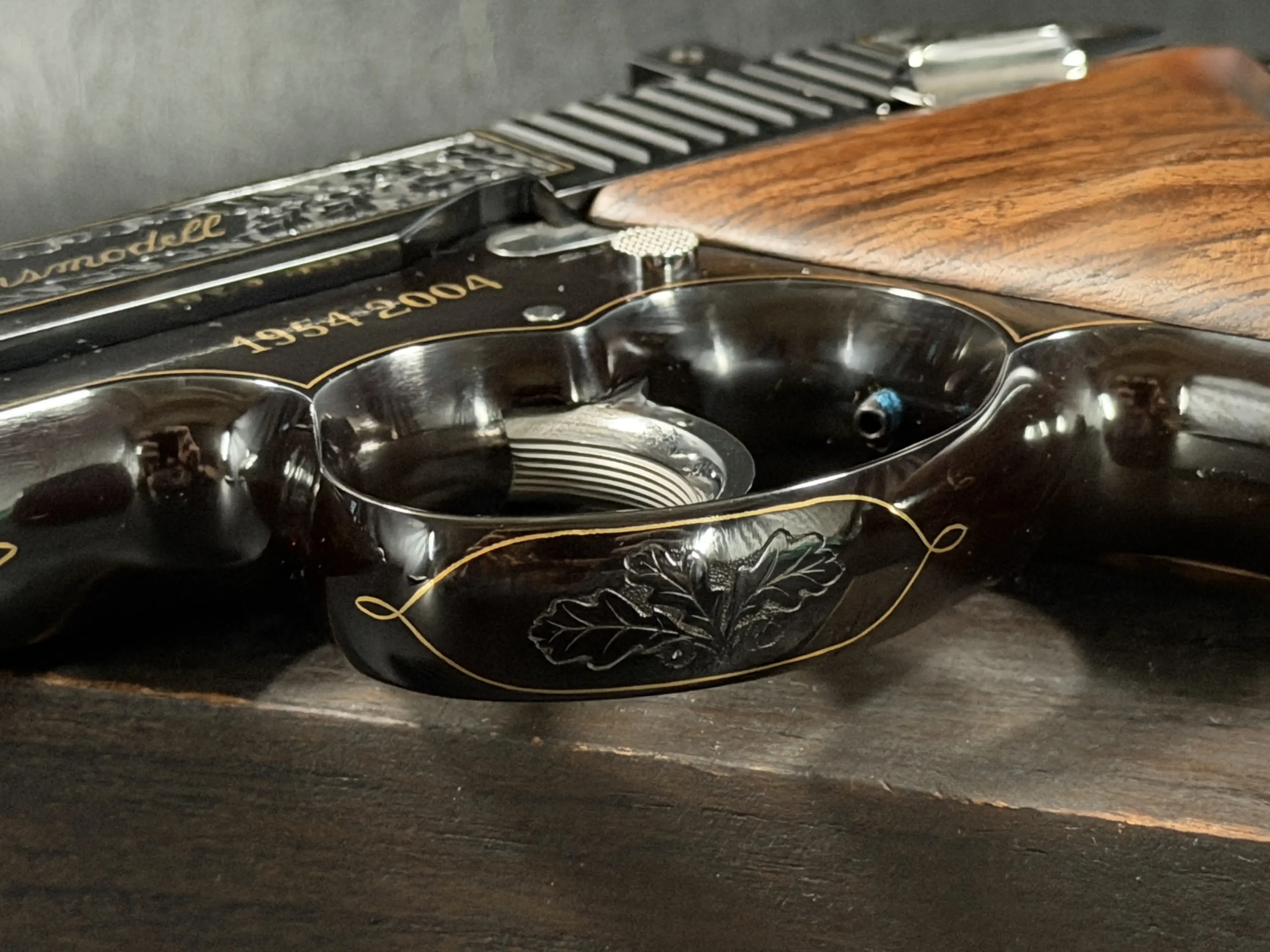 This set includes a 9mm semi-automatic pistol and a .357 Magnum revolver, each finished to an uncompromising standard. Both pieces share a unified visual language: deep, mirror-polished bluing, elaborate full-coverage engraving, and elegant 24k gold inlay highlighting commemorative dates, signatures, and select ornamental motifs. The engraving features classic German scrollwork framed by delicate gold borders, with subtle relief elements that showcase the engraver’s depth of skill.