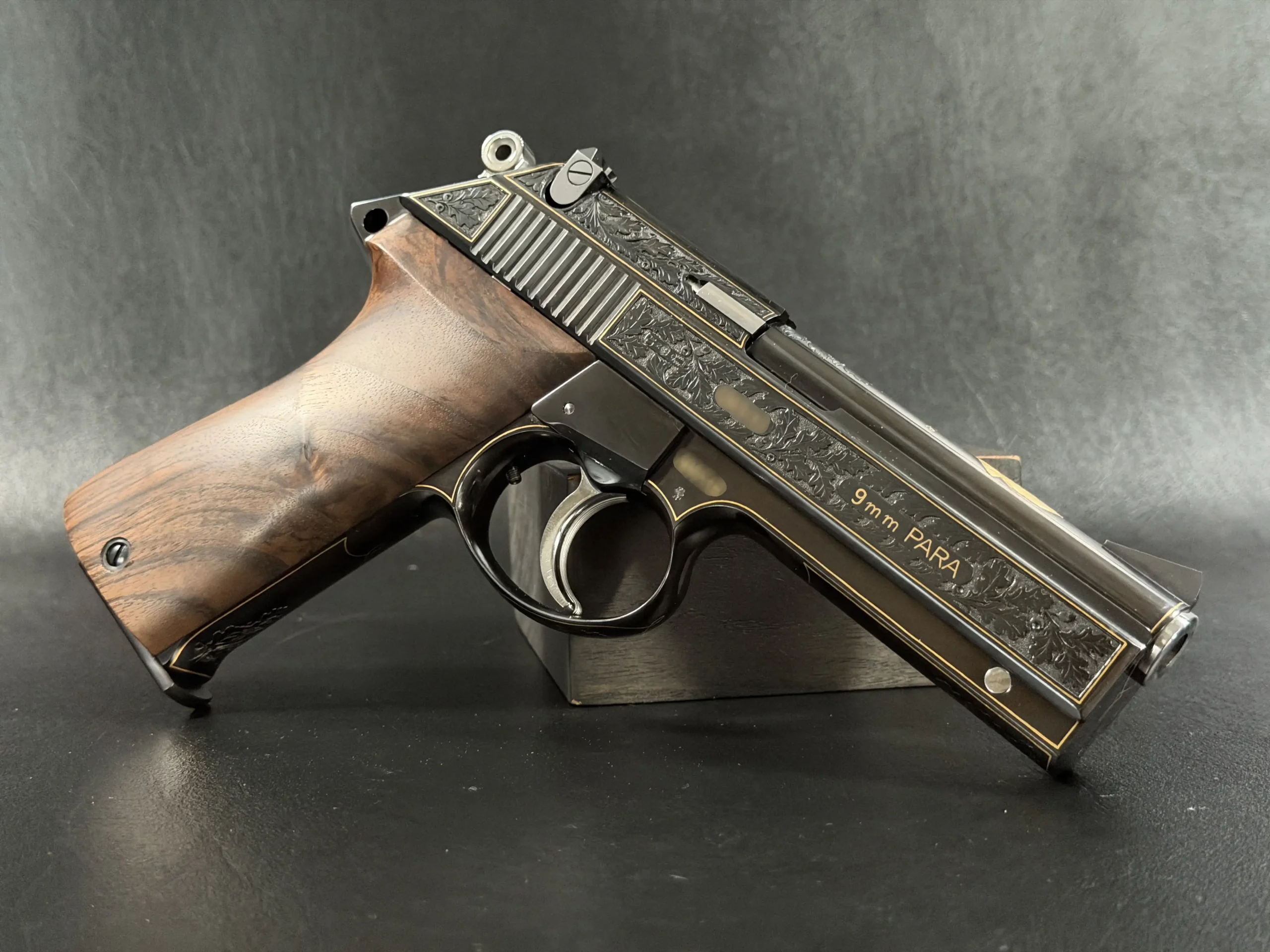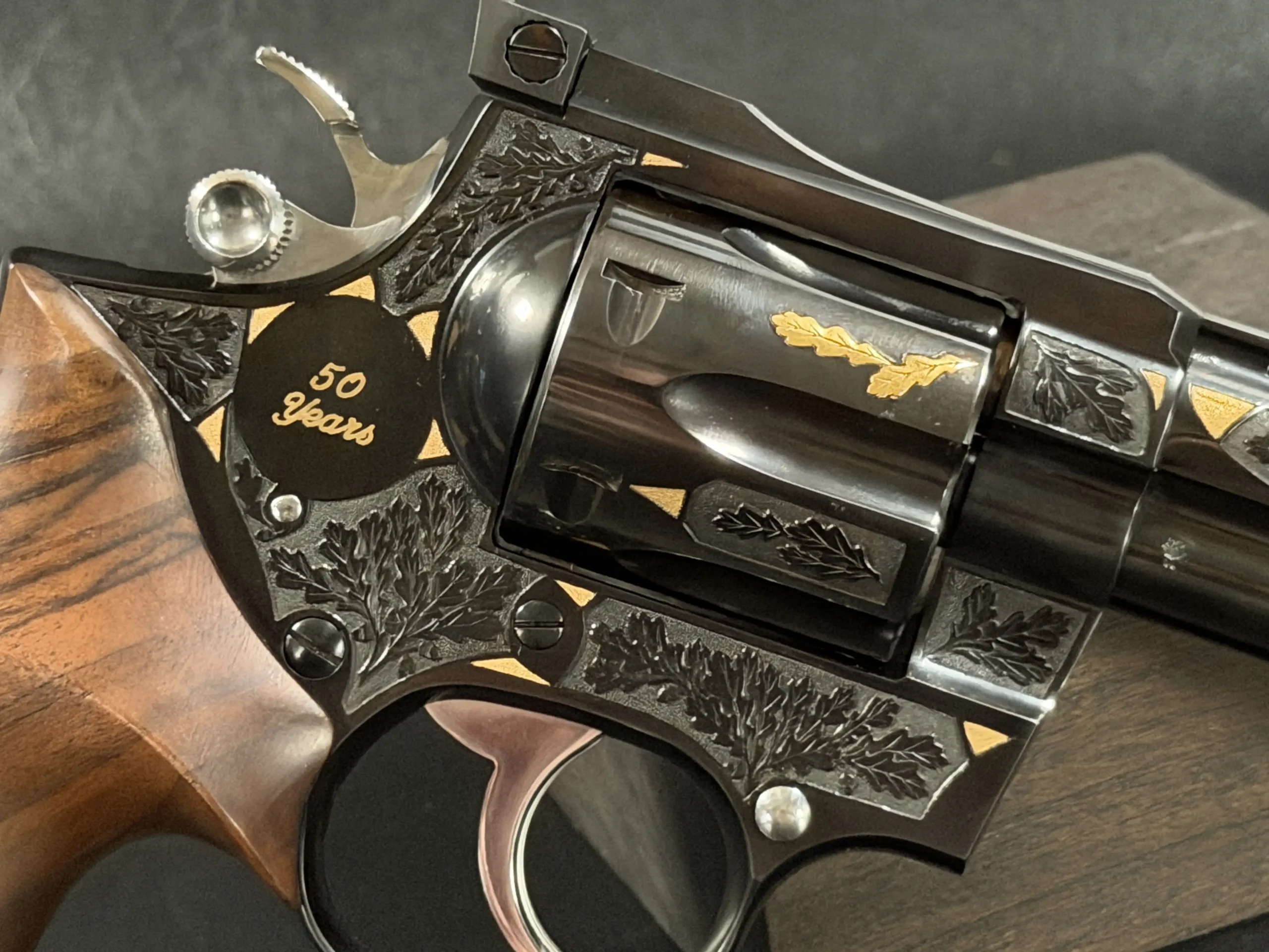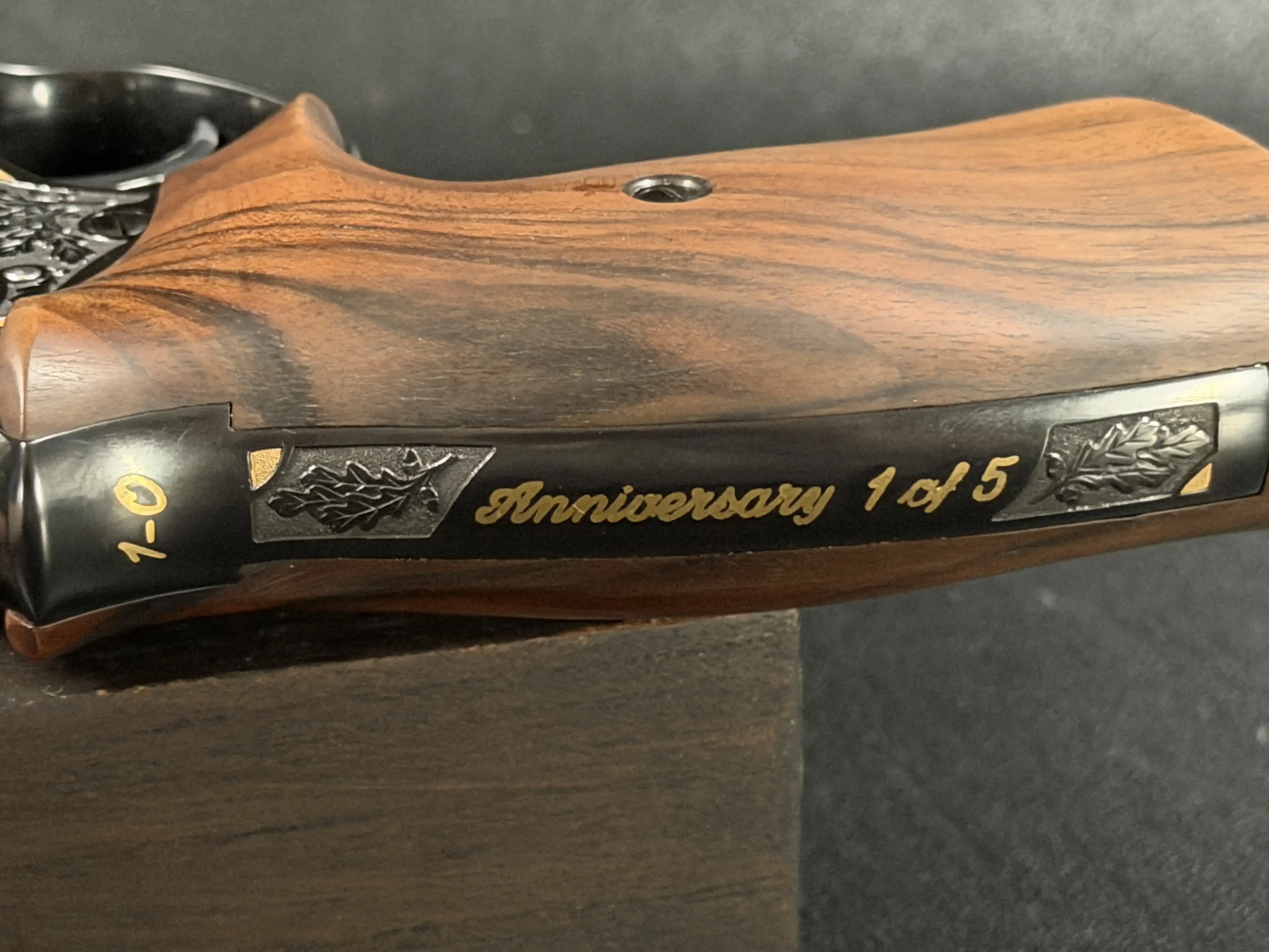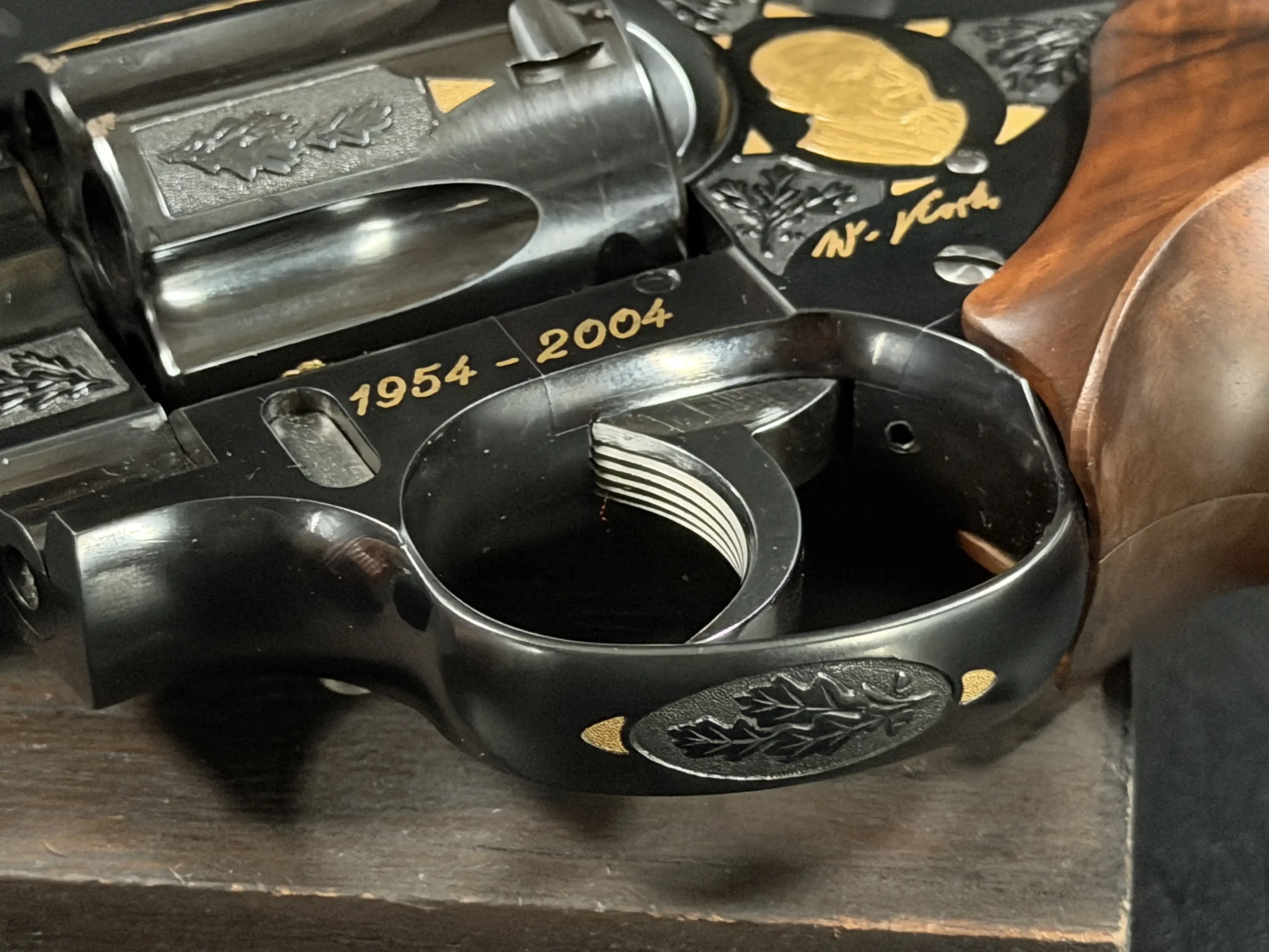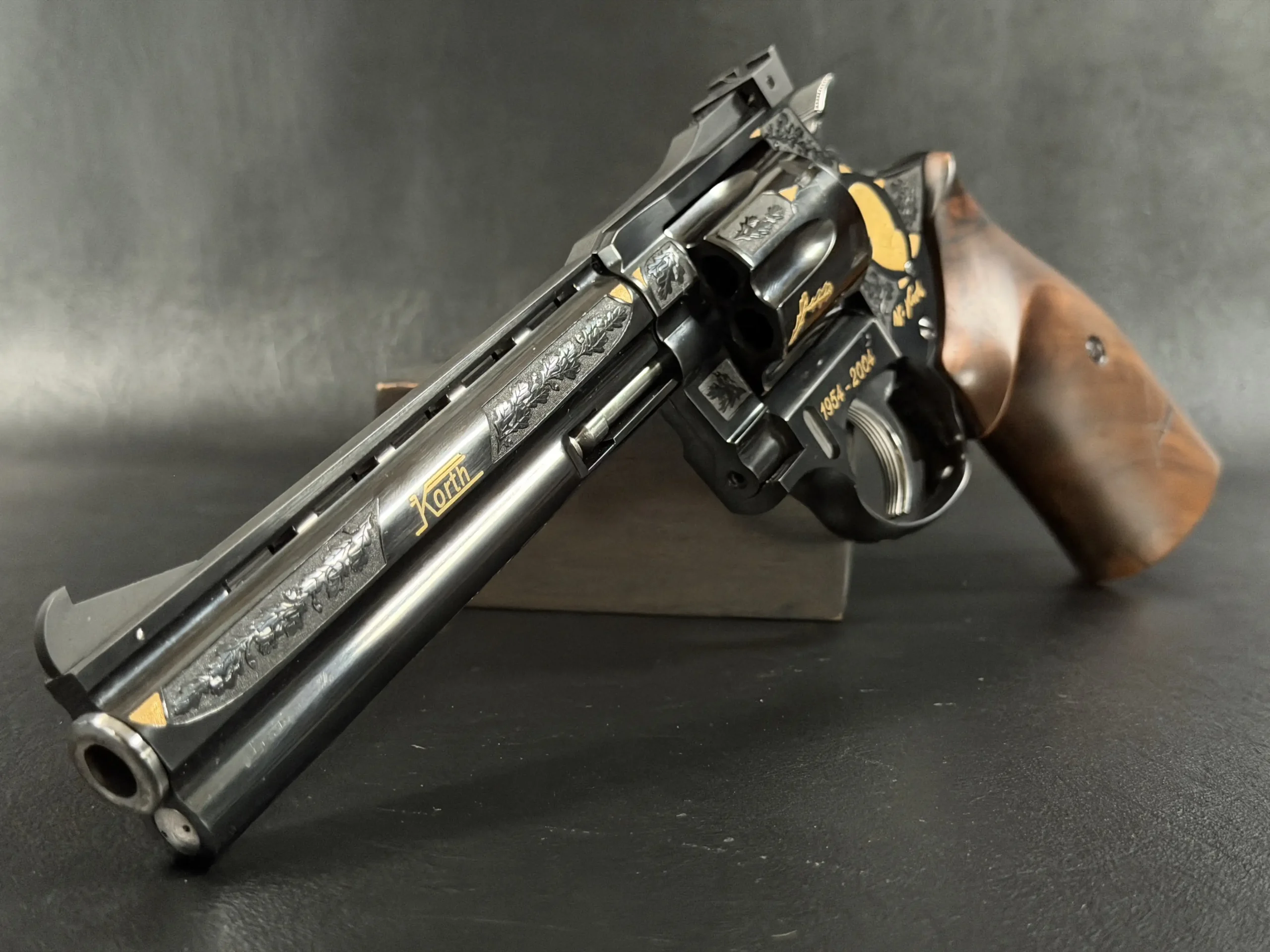 This set includes a 9mm semi-automatic pistol and a .357 Magnum revolver, each finished to an uncompromising standard. Both pieces share a unified visual language: deep, mirror-polished bluing, elaborate full-coverage engraving, and elegant 24k gold inlay highlighting commemorative dates, signatures, and select ornamental motifs. The engraving features classic German scrollwork framed by delicate gold borders, with subtle relief elements that showcase the engraver’s depth of skill.