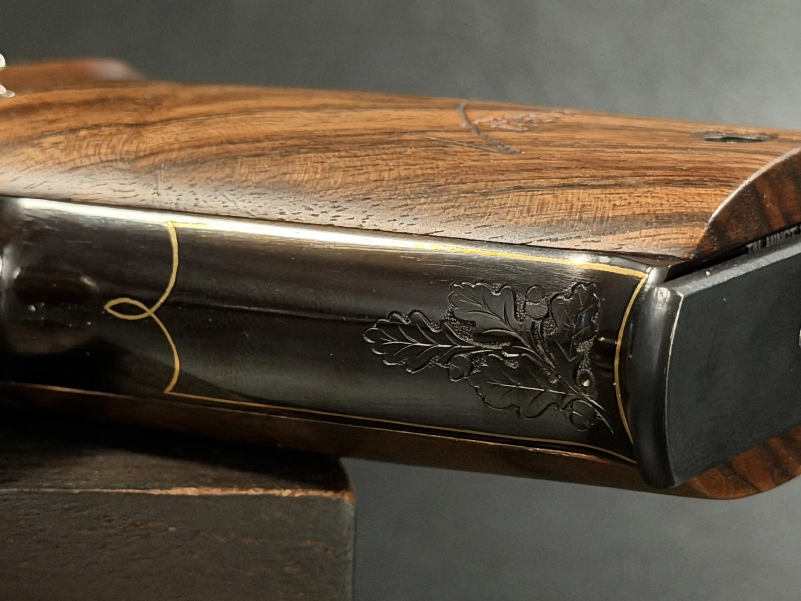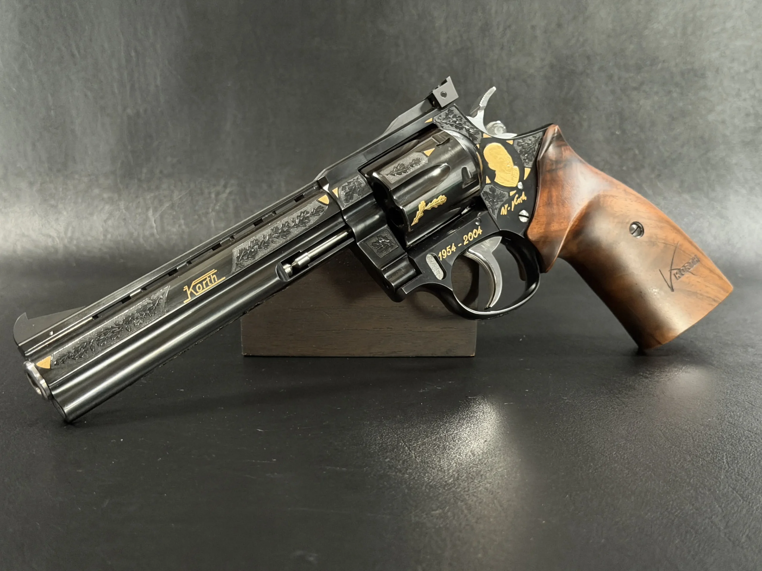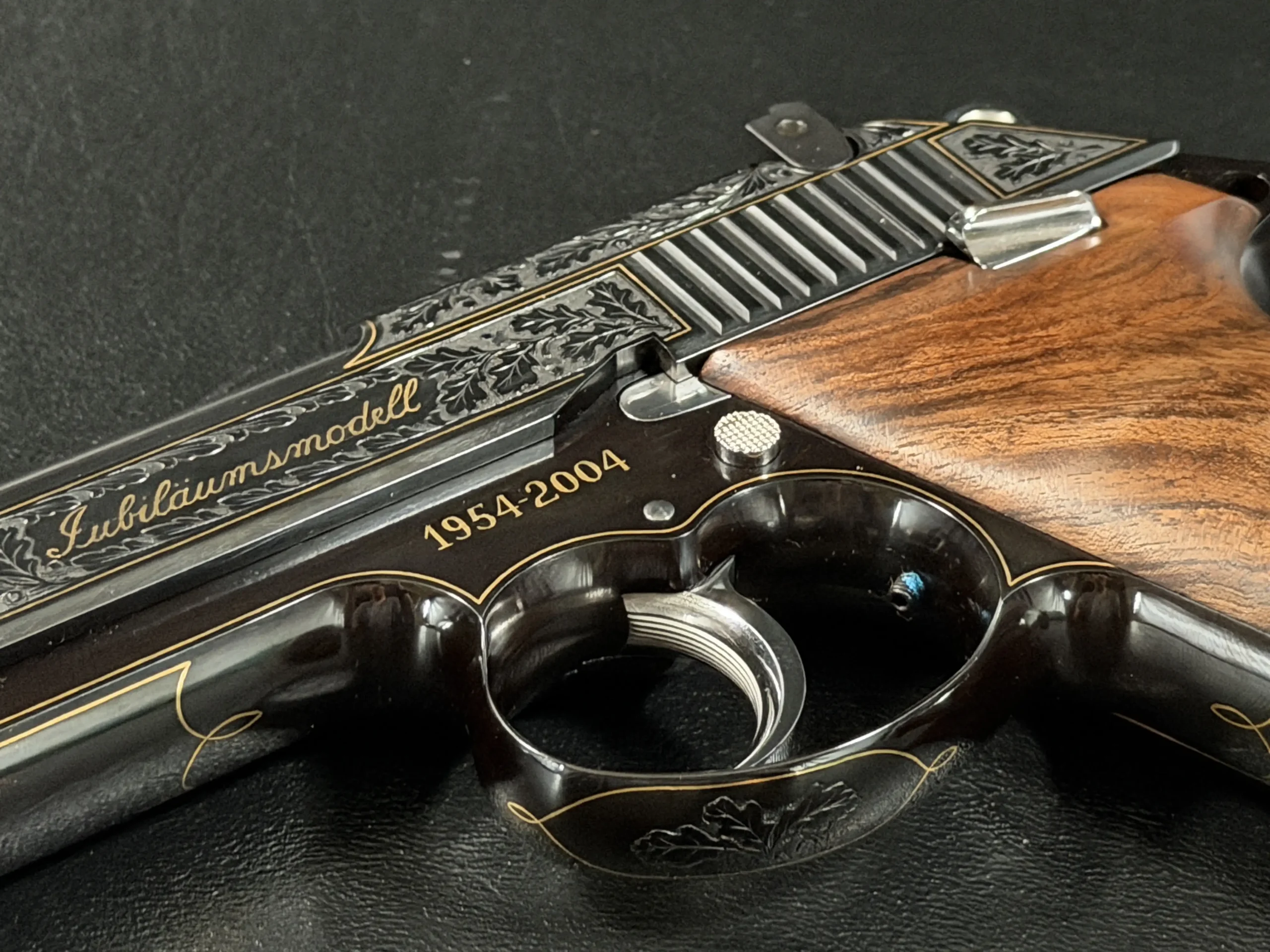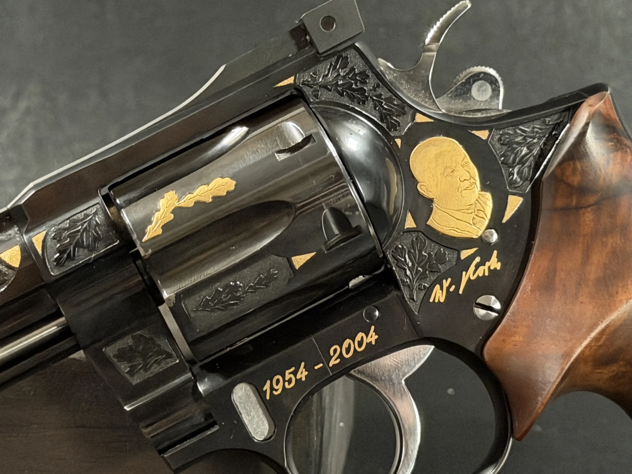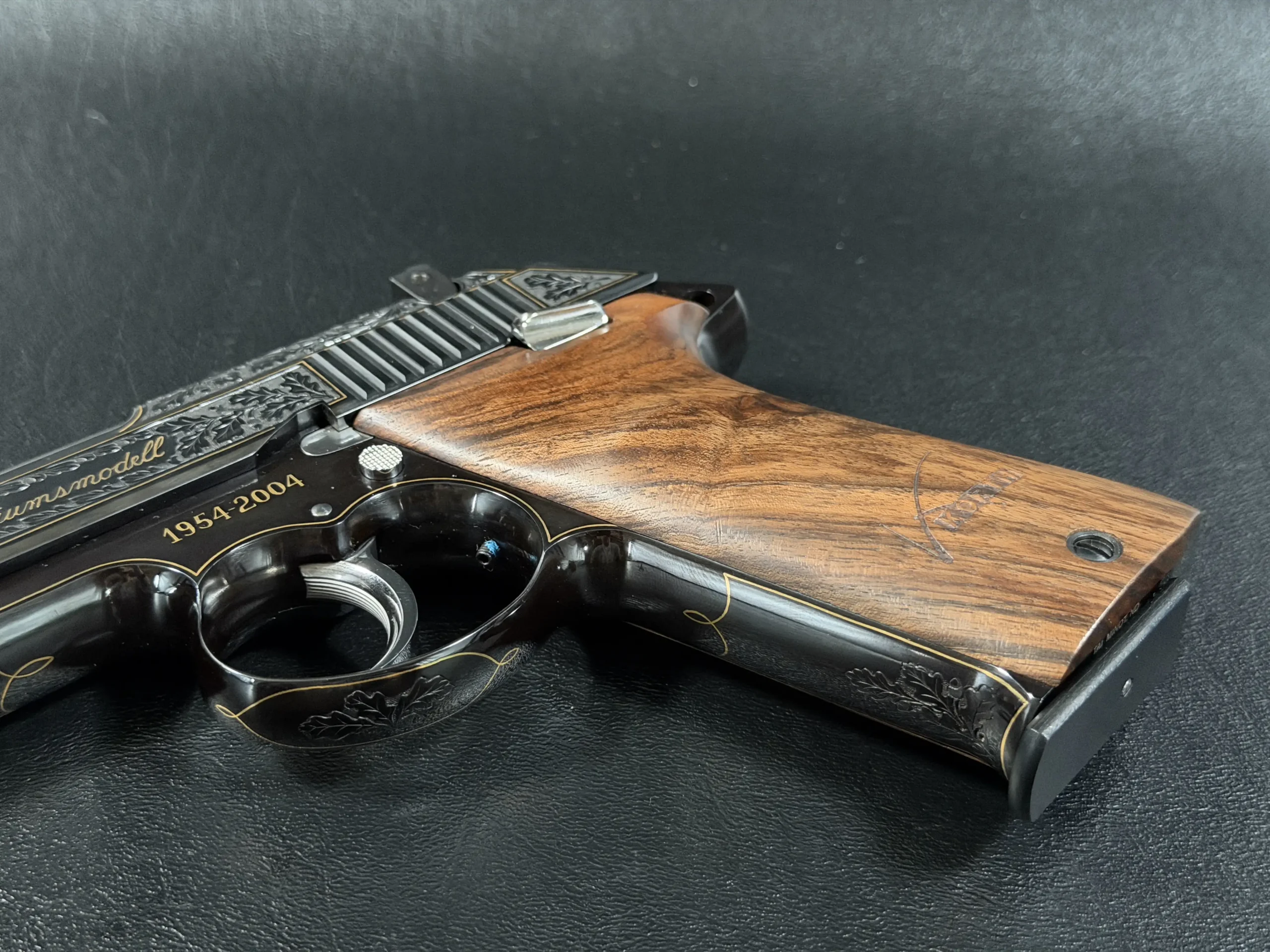 This set includes a 9mm semi-automatic pistol and a .357 Magnum revolver, each finished to an uncompromising standard. Both pieces share a unified visual language: deep, mirror-polished bluing, elaborate full-coverage engraving, and elegant 24k gold inlay highlighting commemorative dates, signatures, and select ornamental motifs. The engraving features classic German scrollwork framed by delicate gold borders, with subtle relief elements that showcase the engraver’s depth of skill.