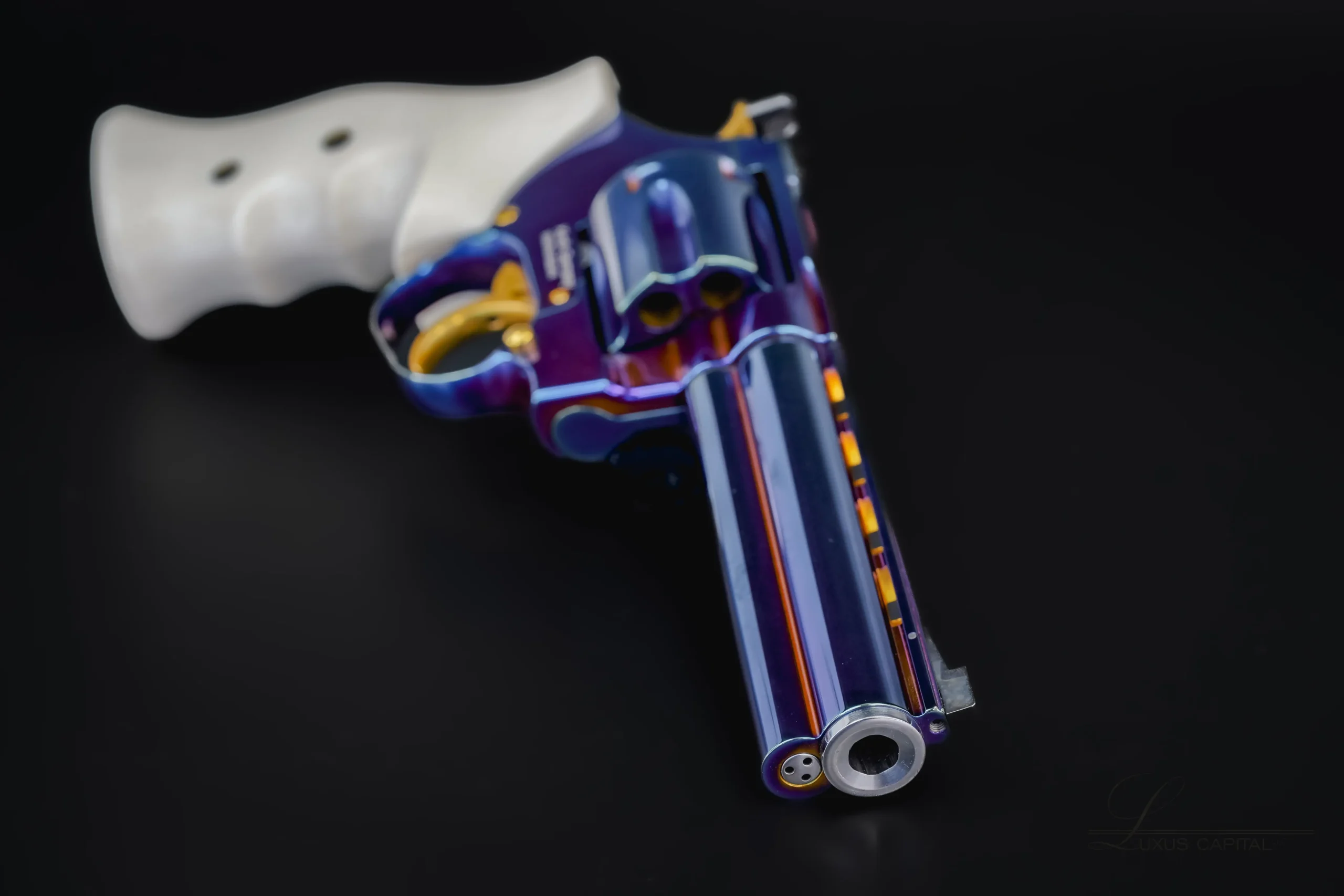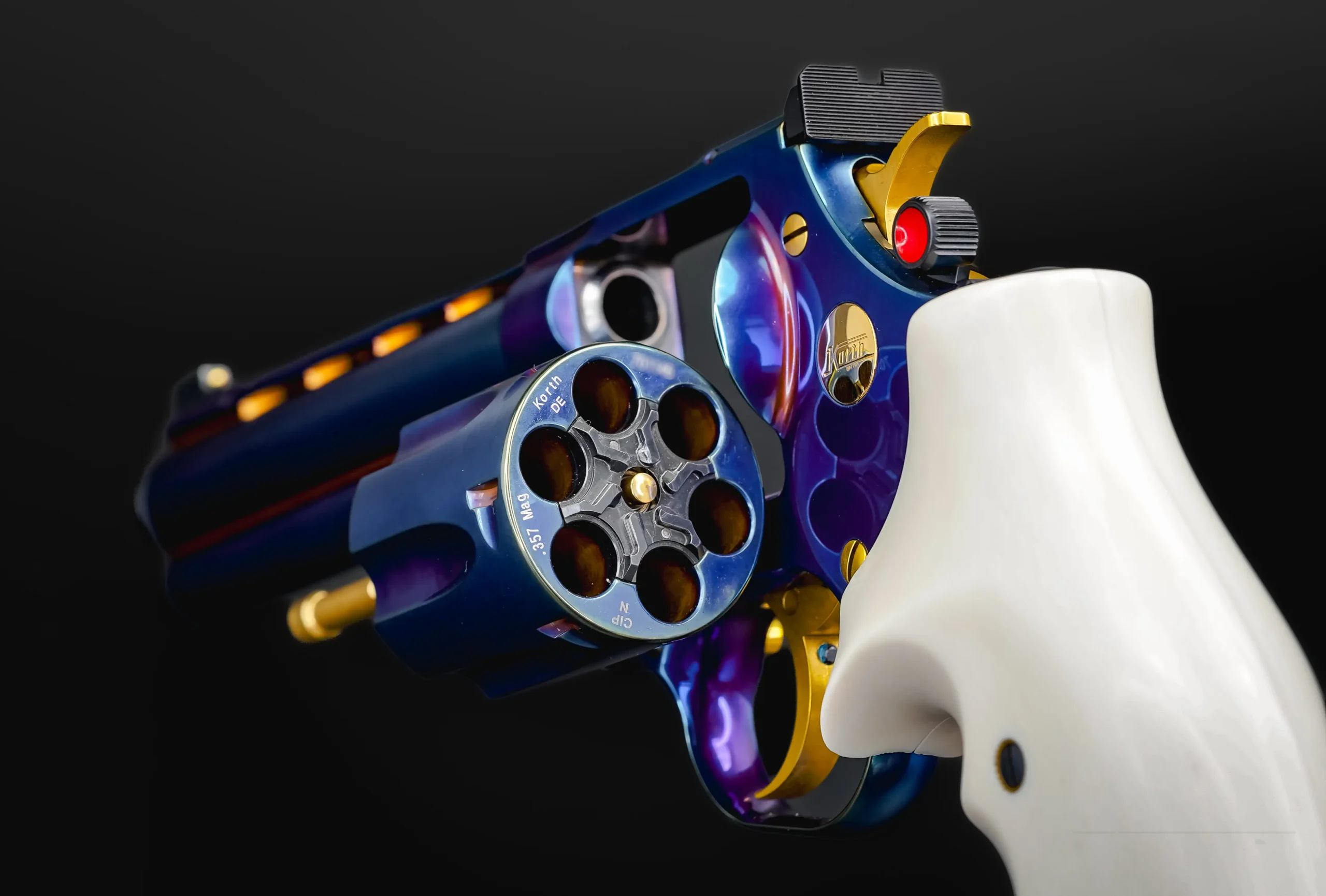 Under shifting light, the surface transforms continuously, deep sapphire giving way to electric violet, then rolling into hues of indigo and liquid cobalt. It’s not a static color but a living spectrum, achieved through advanced plasma treatment that enhances both durability and visual depth. The finish flows seamlessly across the frame, barrel, and cylinder, accentuating the revolver’s sculpted lines and vent rib profile.