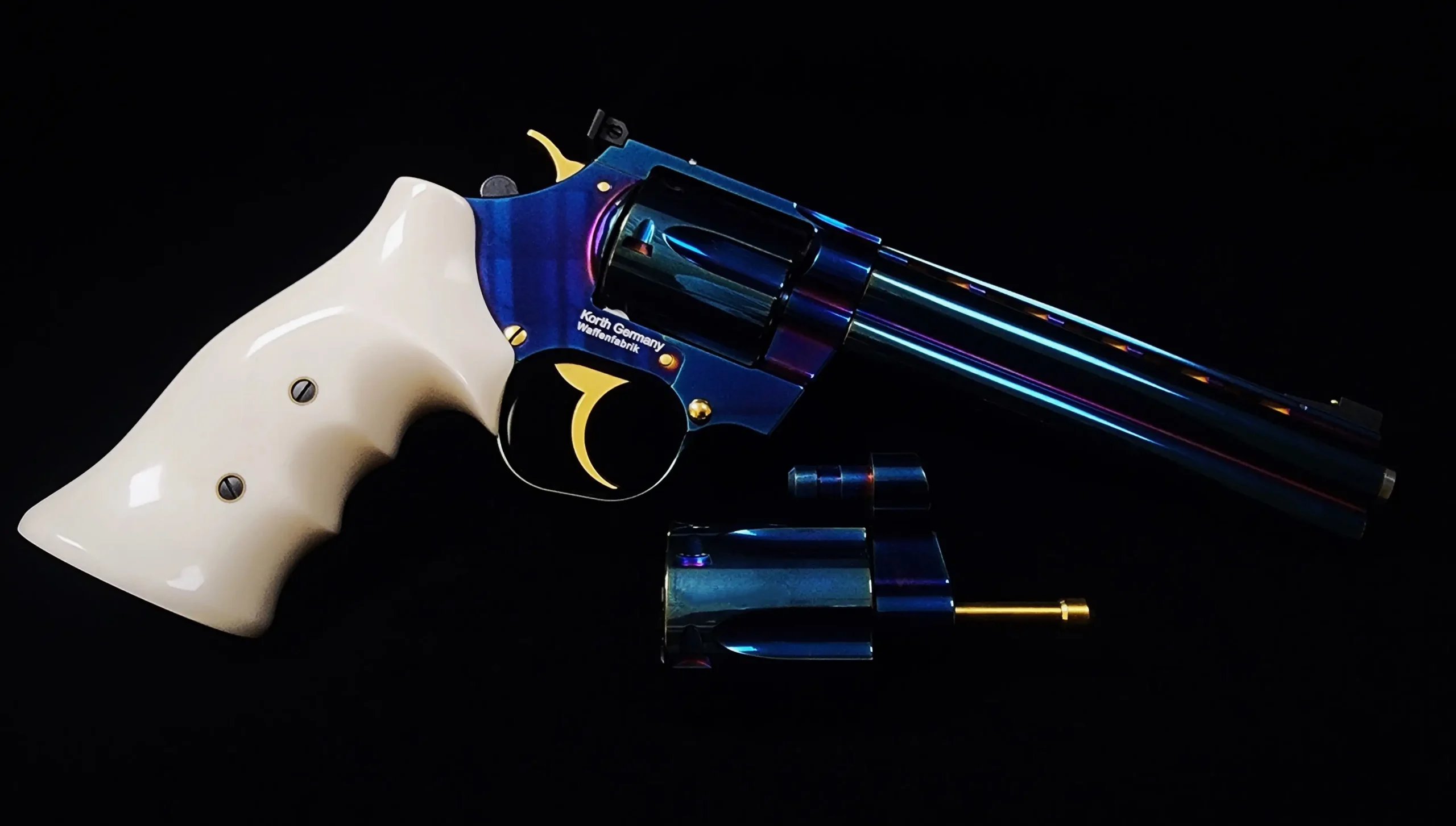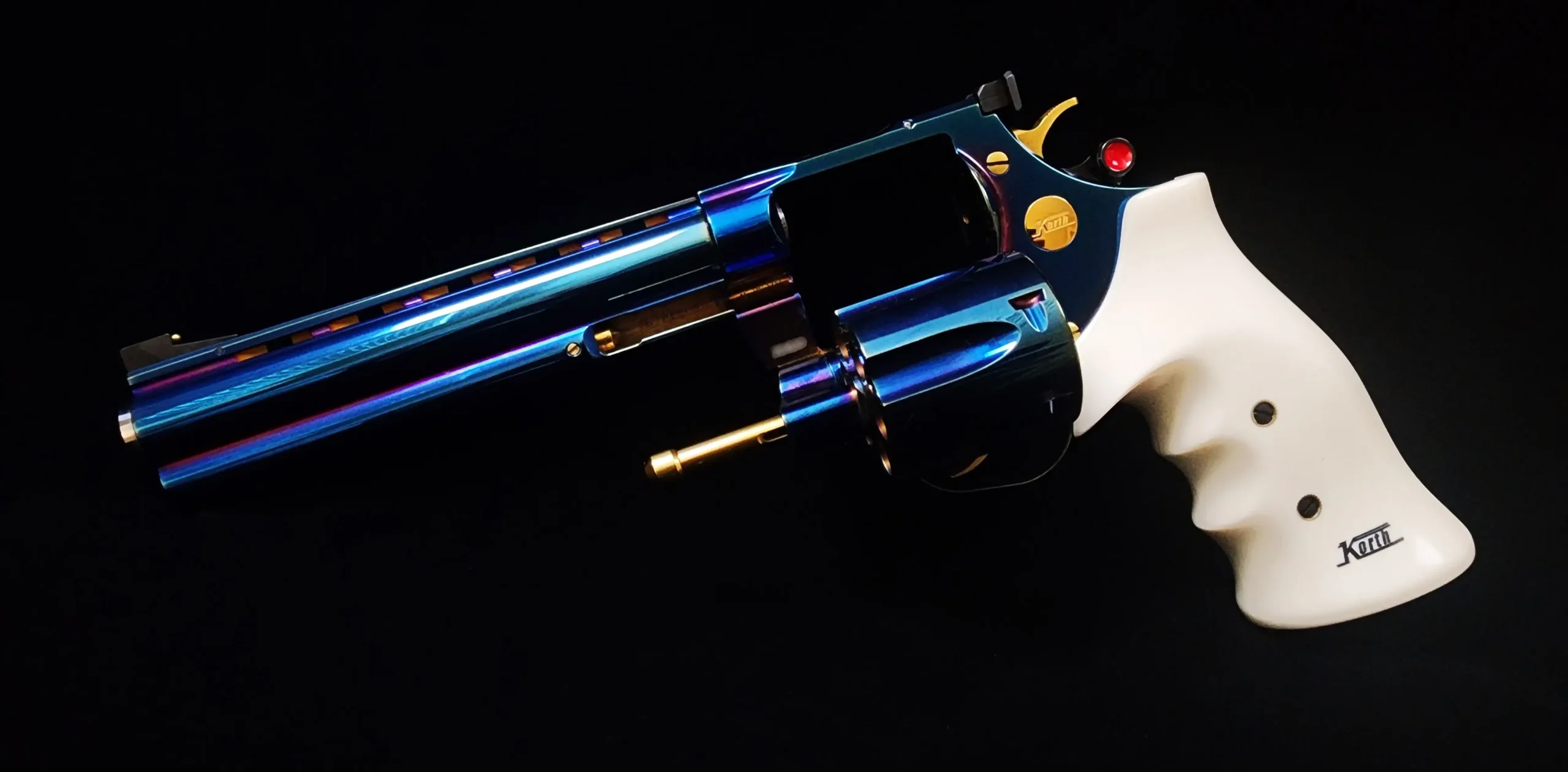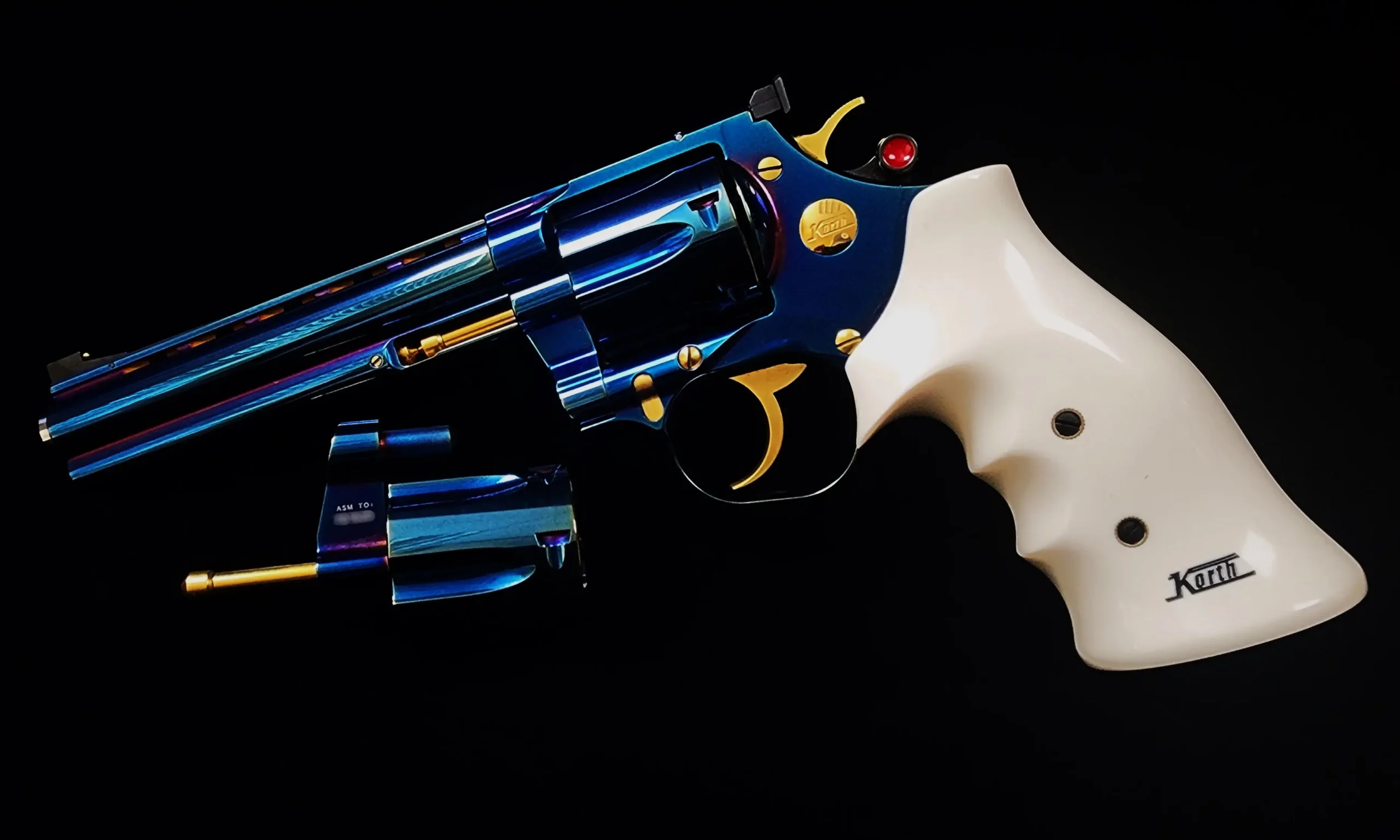 Finished with a vivid, high-polish plasma-spectrum treatment, the revolver displays an extraordinary interplay of deep sapphire blues, violets, and electric highlights that shift with light and movement. The finish is flawlessly executed across the frame, barrel, and cylinders, creating a cohesive visual flow that feels more akin to a bespoke timepiece than a traditional firearm. Gold-tone controls, including the trigger, hammer, cylinder release, and accent hardware, provide striking contrast against the iridescent steel, reinforcing the revolver’s unmistakably presentation-grade character.
