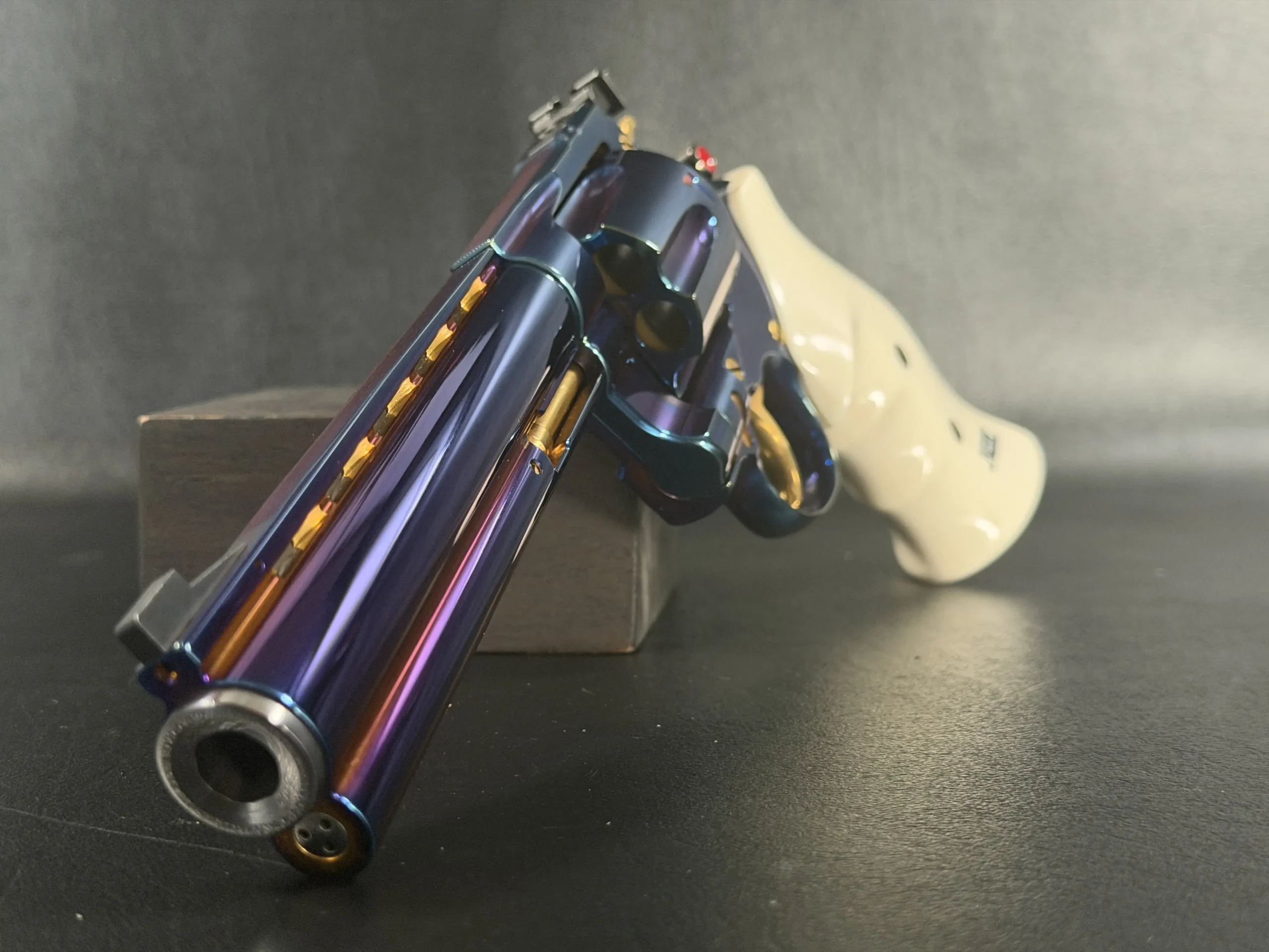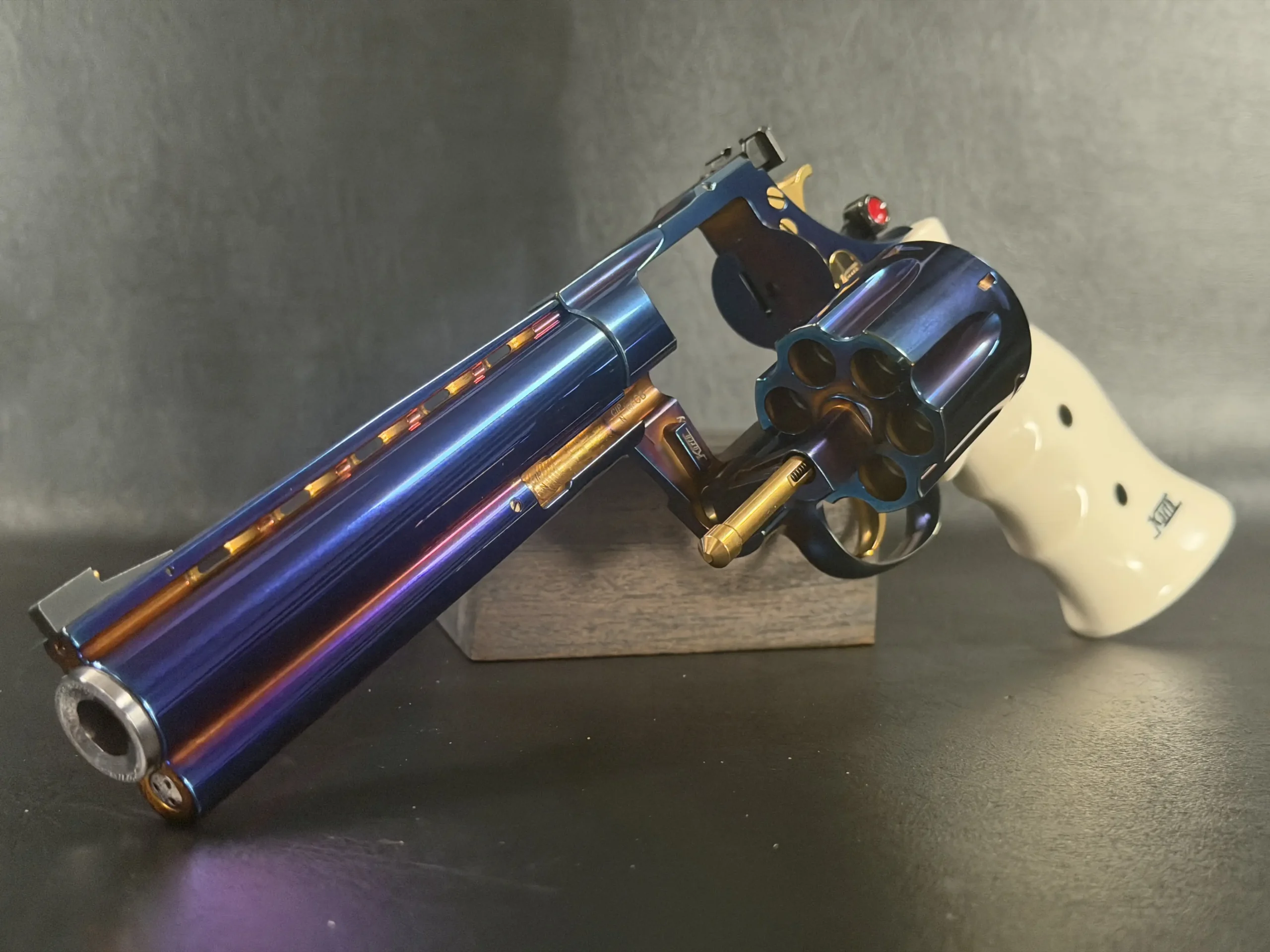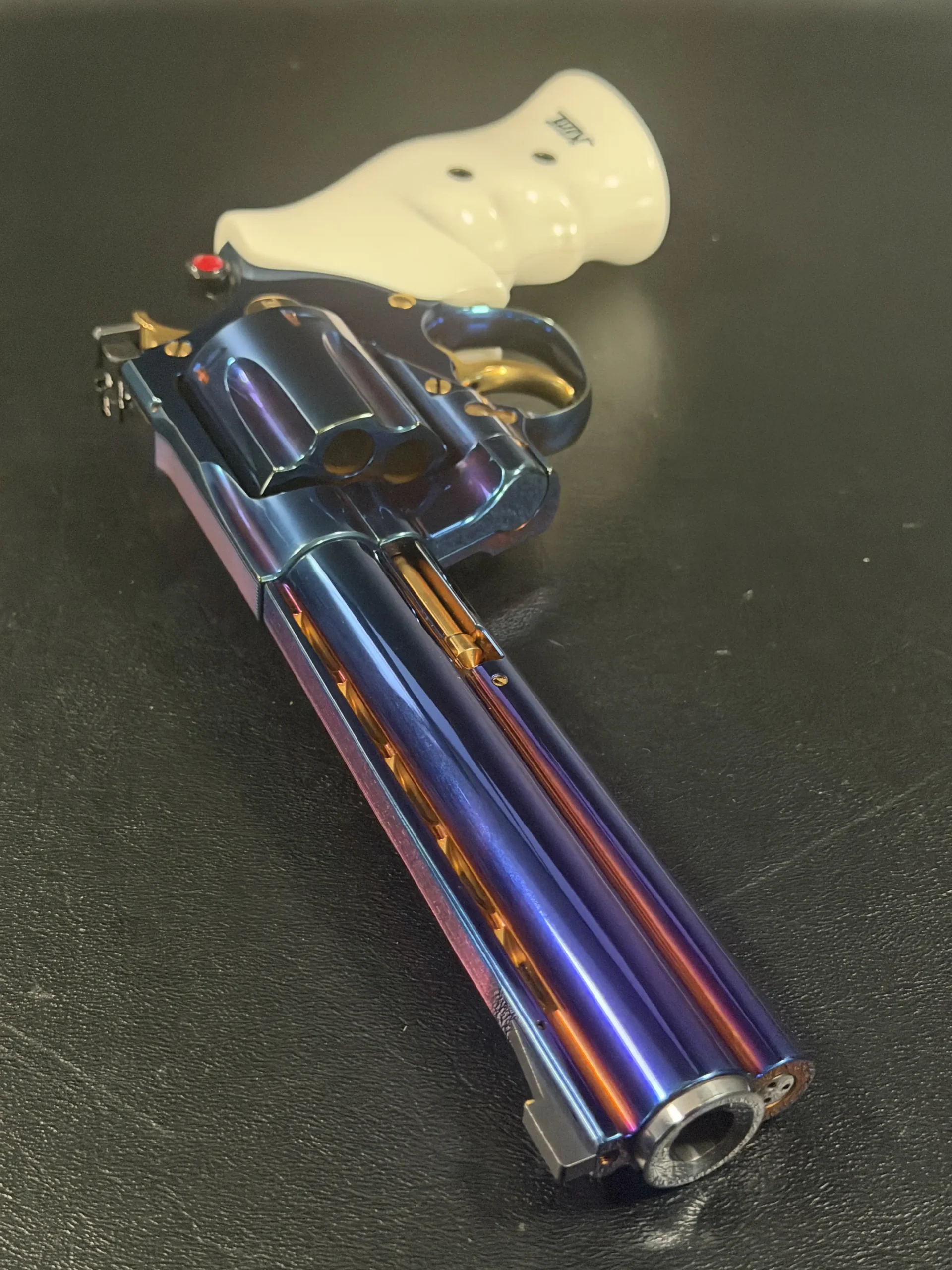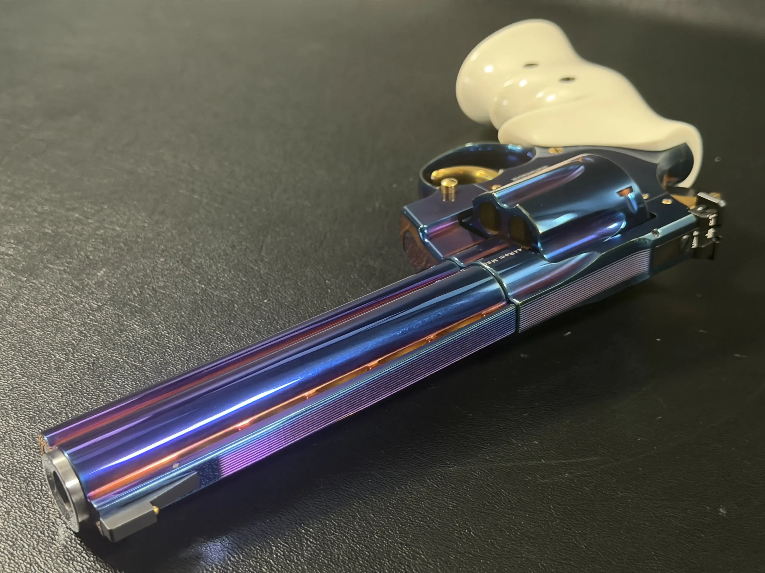 Complementing the finish are elegant ivory-tone grips, their smooth, organic profile providing both visual contrast and ergonomic comfort. The light coloration frames the revolver beautifully, allowing the iridescent steelwork and gold-tone accents, trigger, hammer, and controls to stand forward with striking clarity.