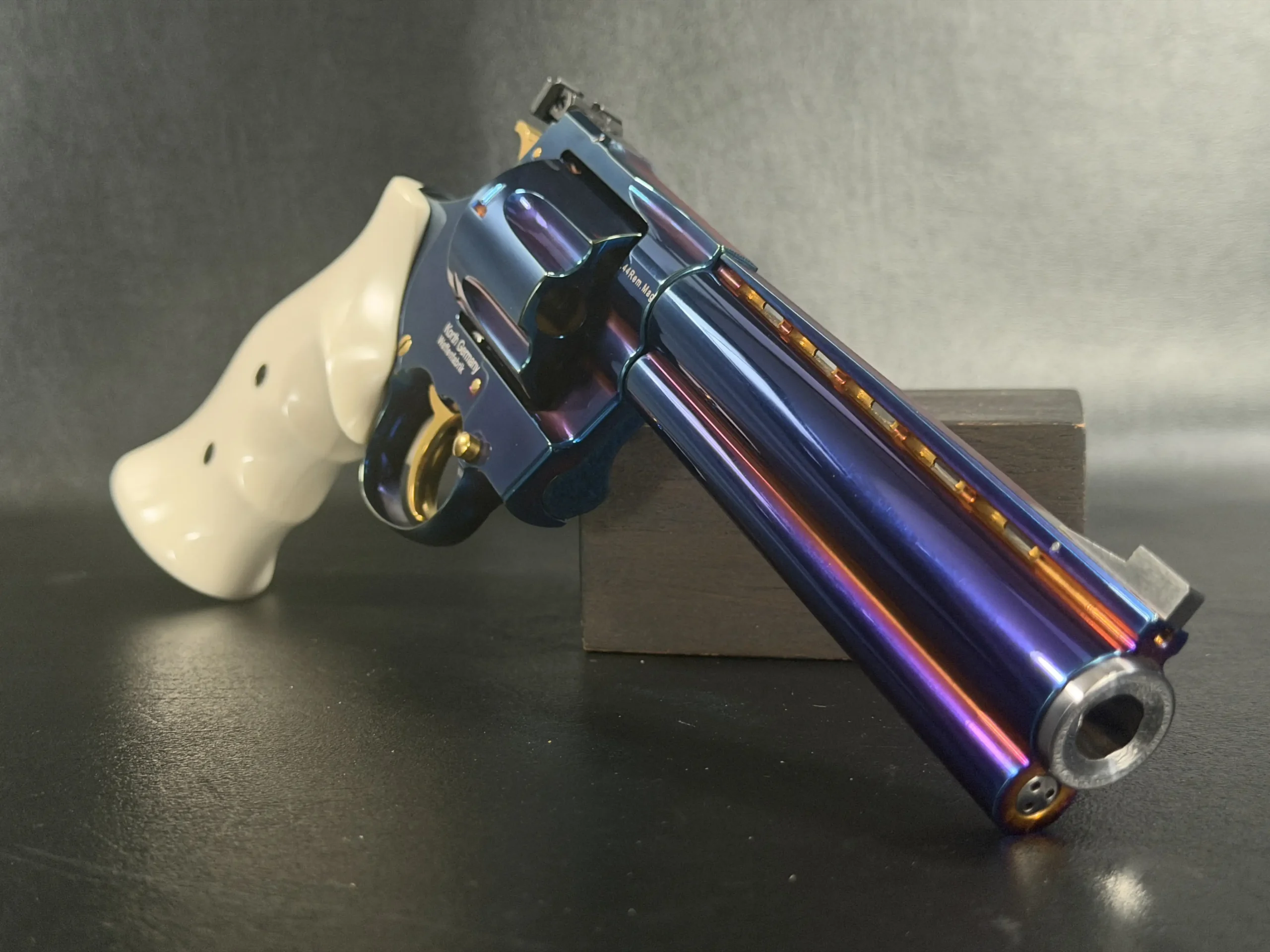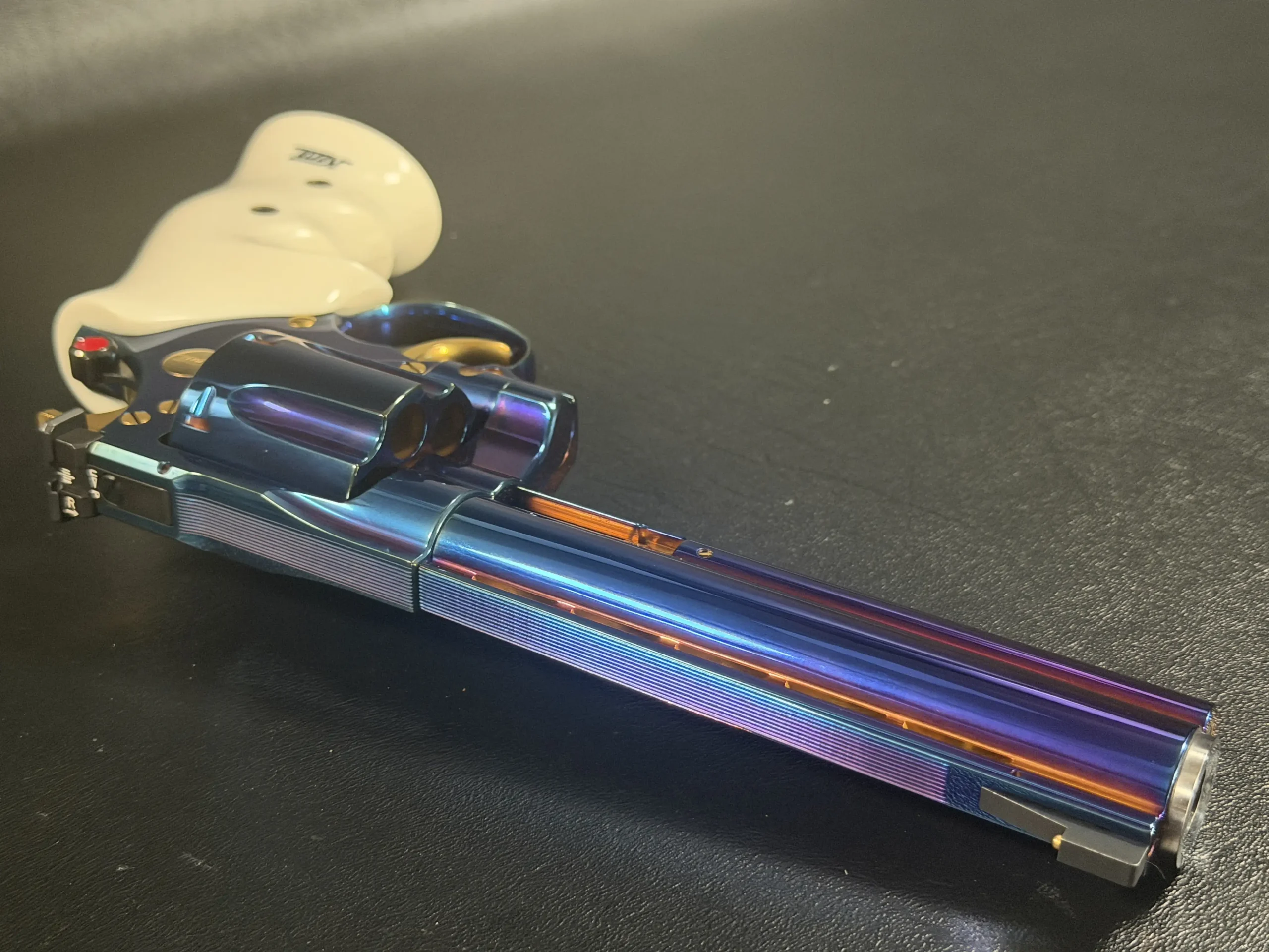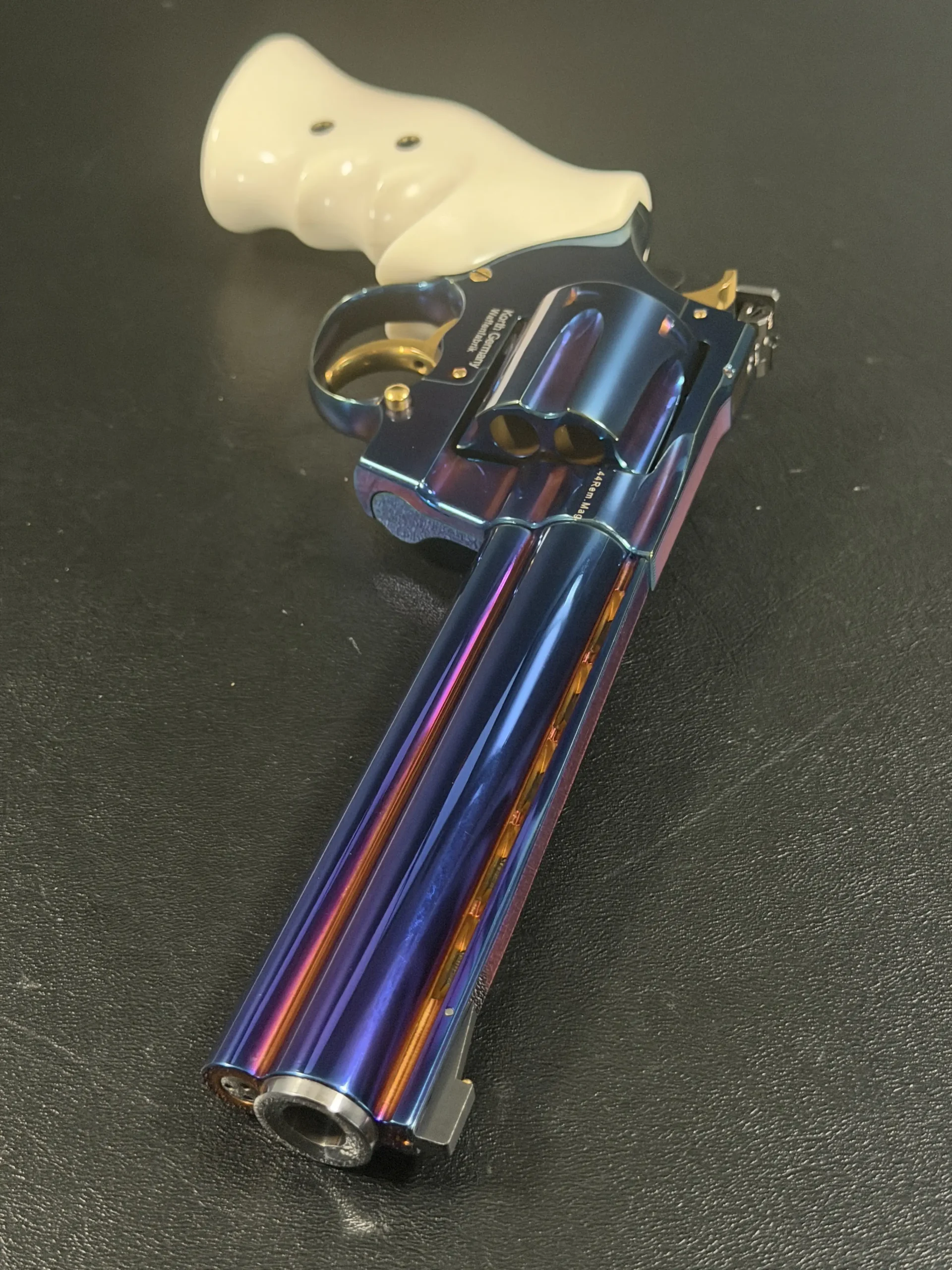 Complementing the finish are elegant ivory-tone grips, their smooth, organic profile providing both visual contrast and ergonomic comfort. The light coloration frames the revolver beautifully, allowing the iridescent steelwork and gold-tone accents, trigger, hammer, and controls to stand forward with striking clarity.