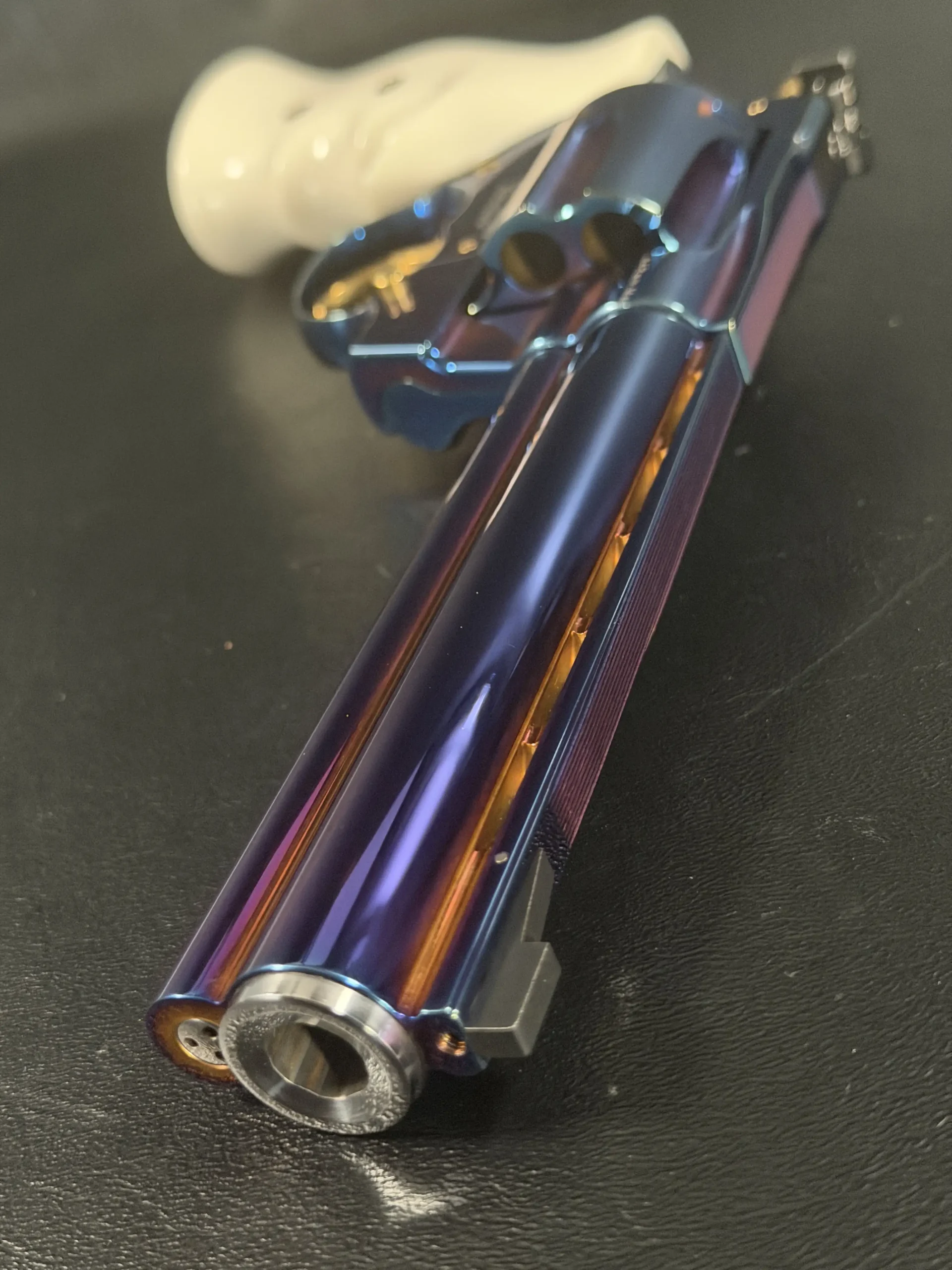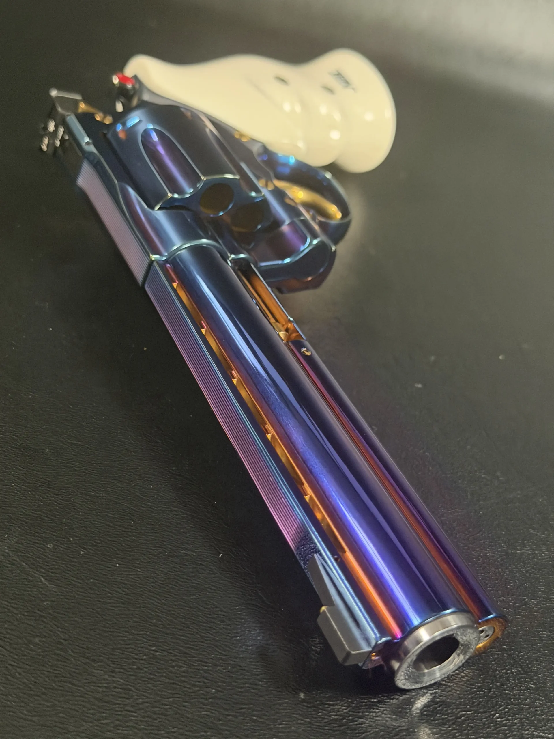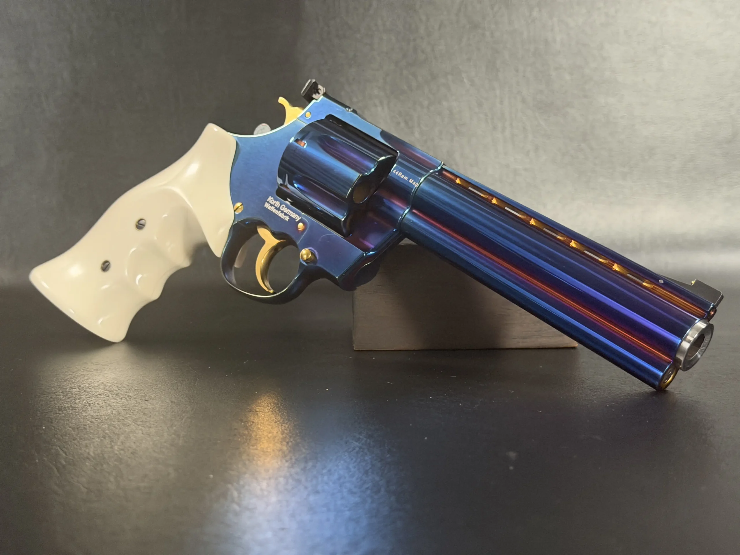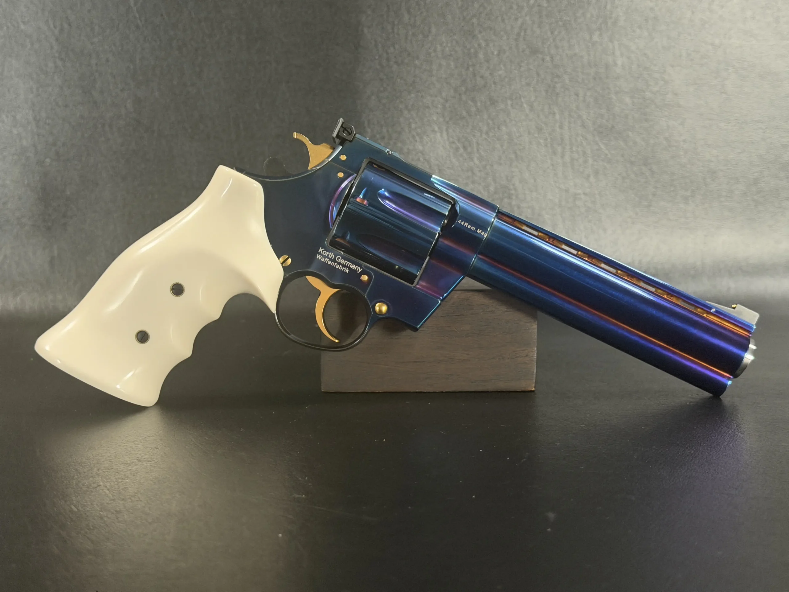 Complementing the finish are elegant ivory-tone grips, their smooth, organic profile providing both visual contrast and ergonomic comfort. The light coloration frames the revolver beautifully, allowing the iridescent steelwork and gold-tone accents, trigger, hammer, and controls to stand forward with striking clarity.