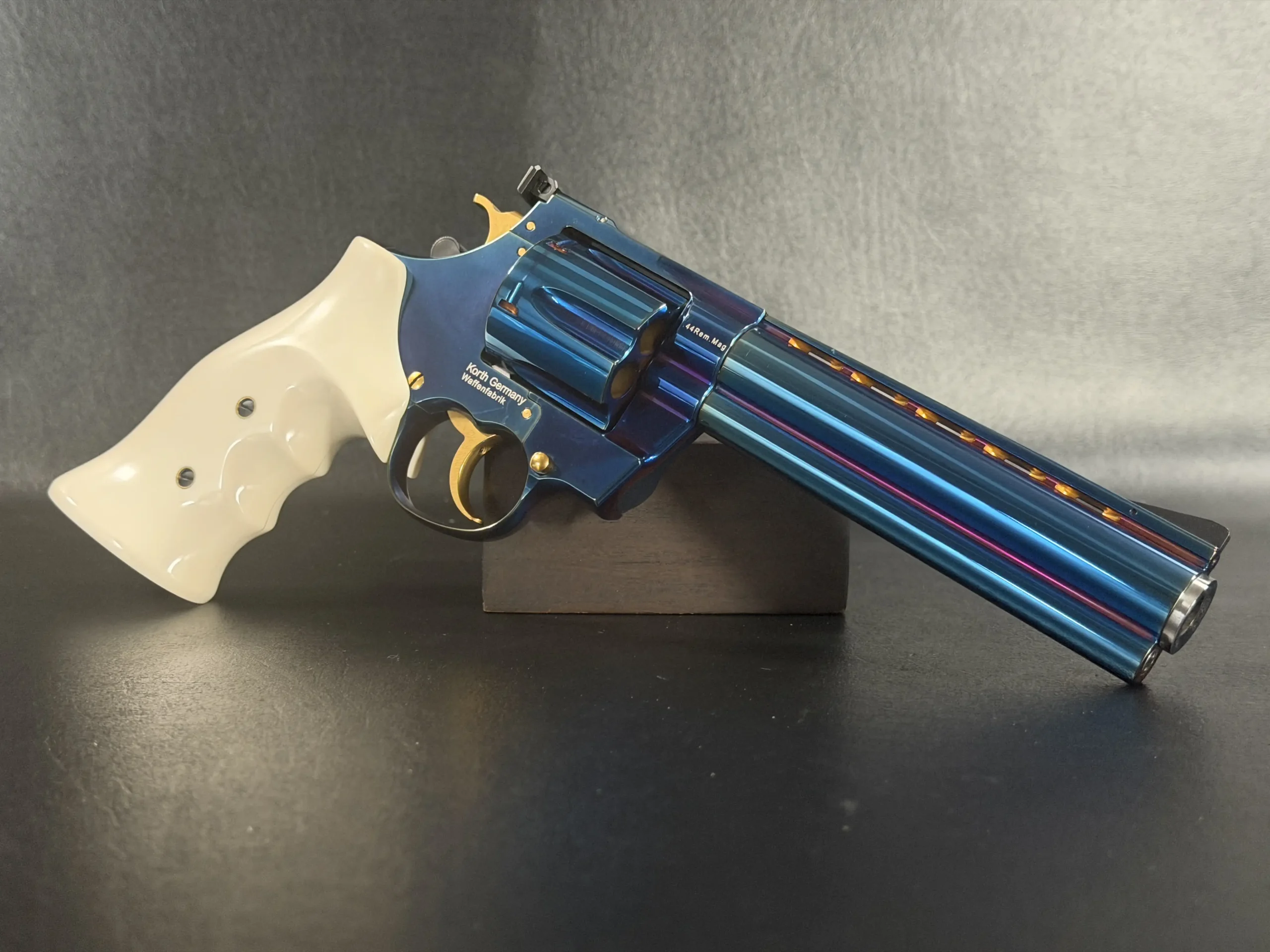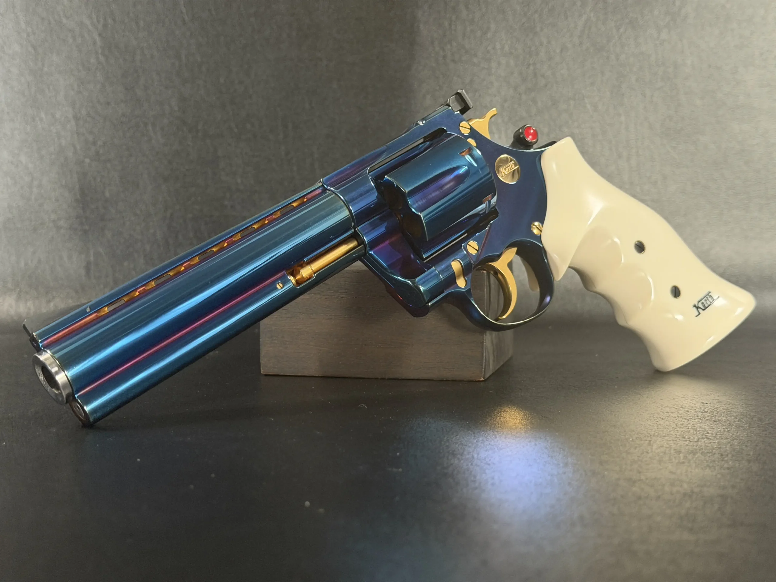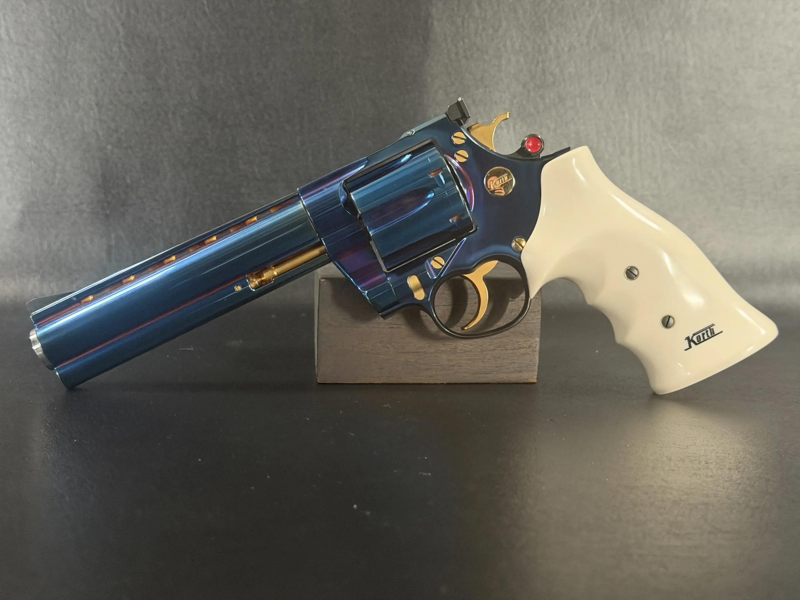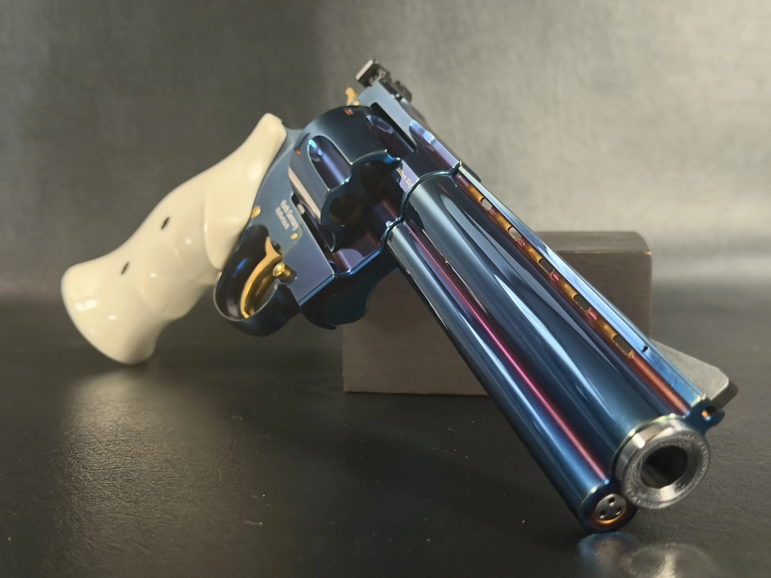 Finished in a vivid multi-spectrum Physical Vapor Deposition (PVD) treatment, the revolver displays a dynamic interplay of deep sapphire blues, violets, and oil-slick iridescence that shift with light and angle. This high-polish finish is executed to Korth’s exacting standards, accentuating the revolver’s sculpted lines, ventilated rib, and precision-machined contours.