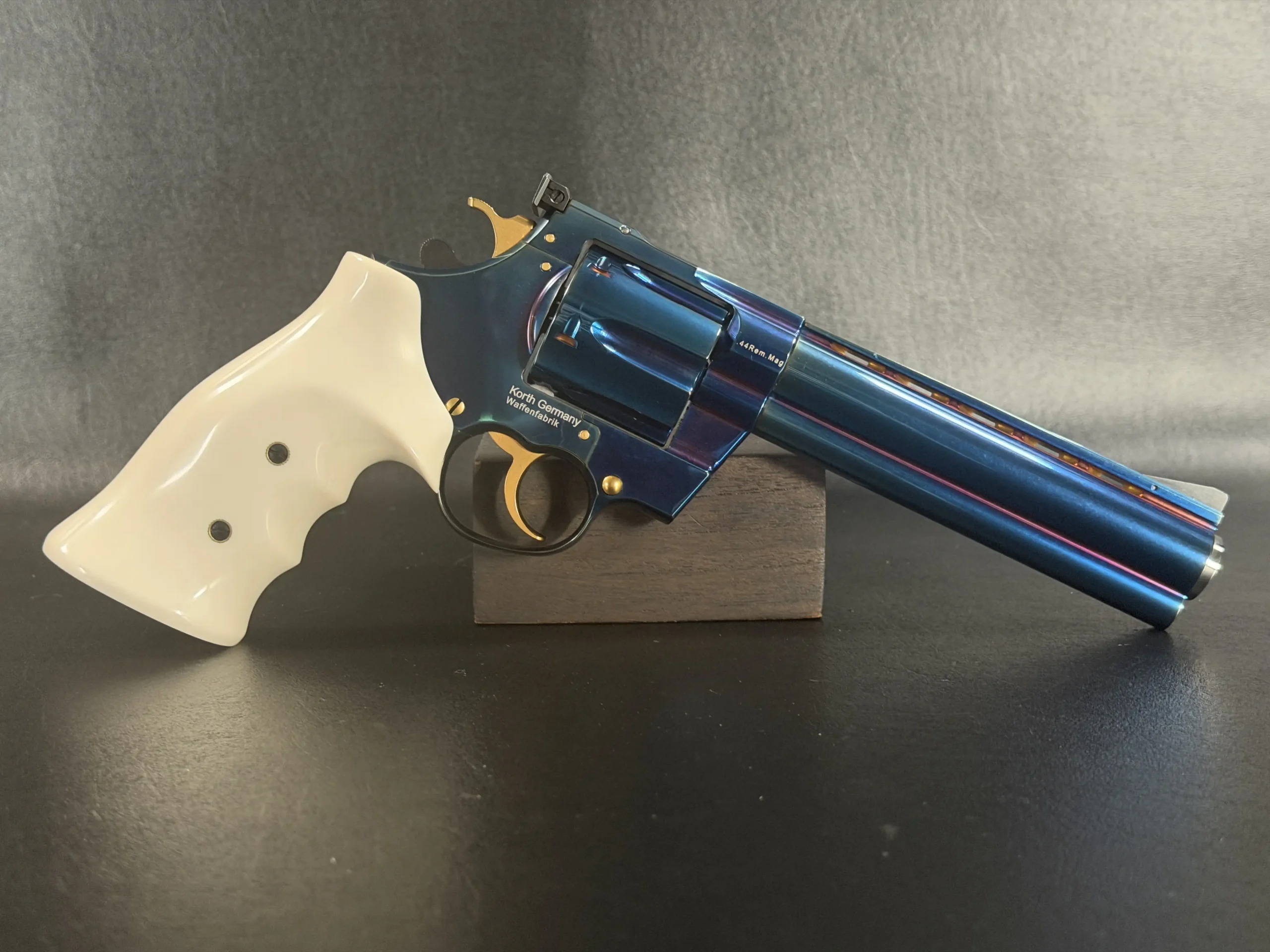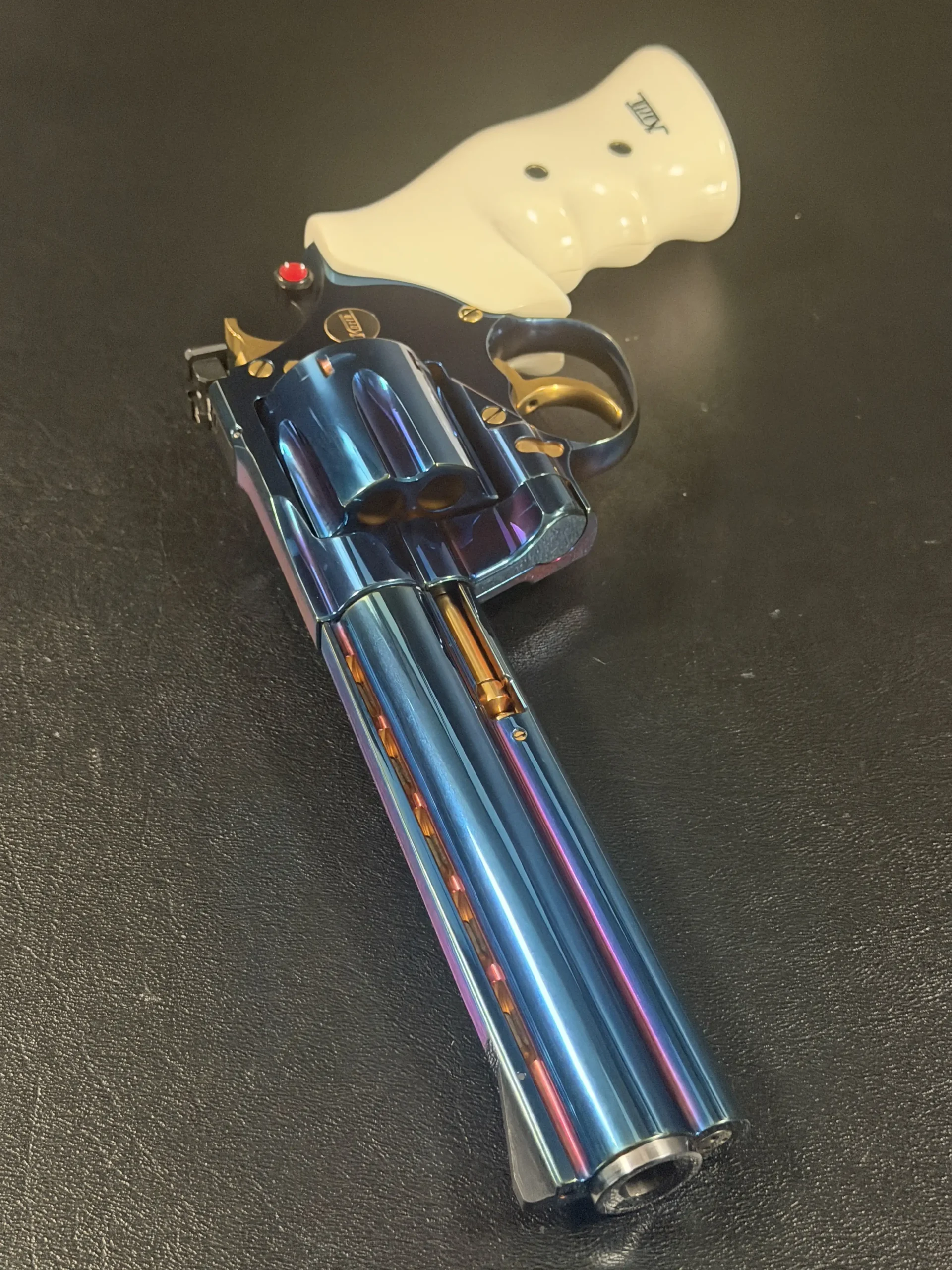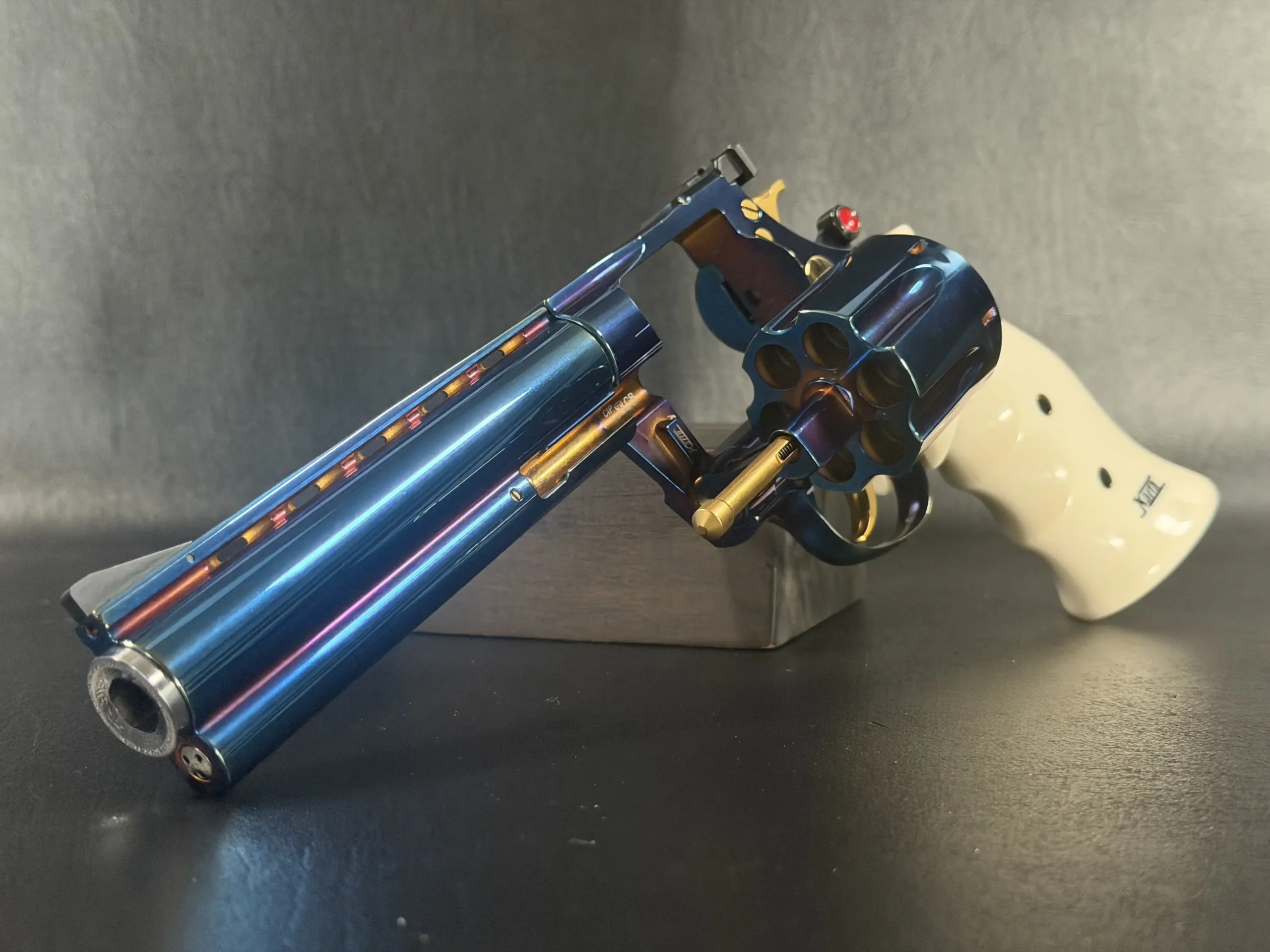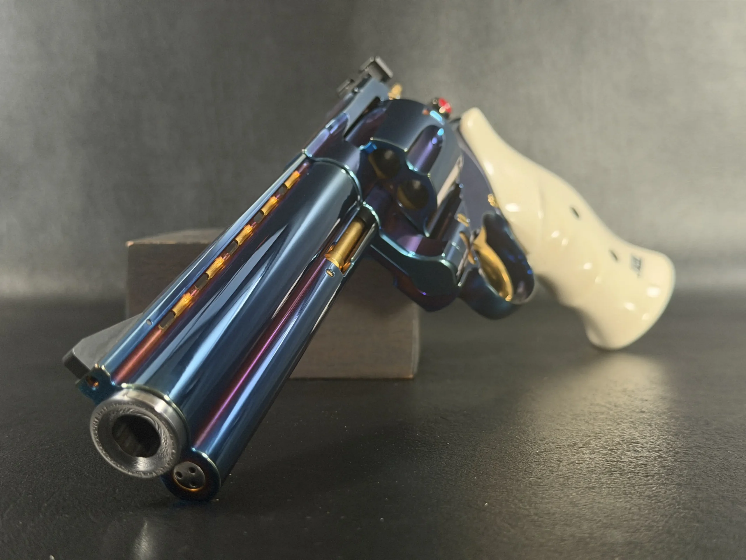 Finished in a vivid multi-spectrum Physical Vapor Deposition (PVD) treatment, the revolver displays a dynamic interplay of deep sapphire blues, violets, and oil-slick iridescence that shift with light and angle. This high-polish finish is executed to Korth’s exacting standards, accentuating the revolver’s sculpted lines, ventilated rib, and precision-machined contours.