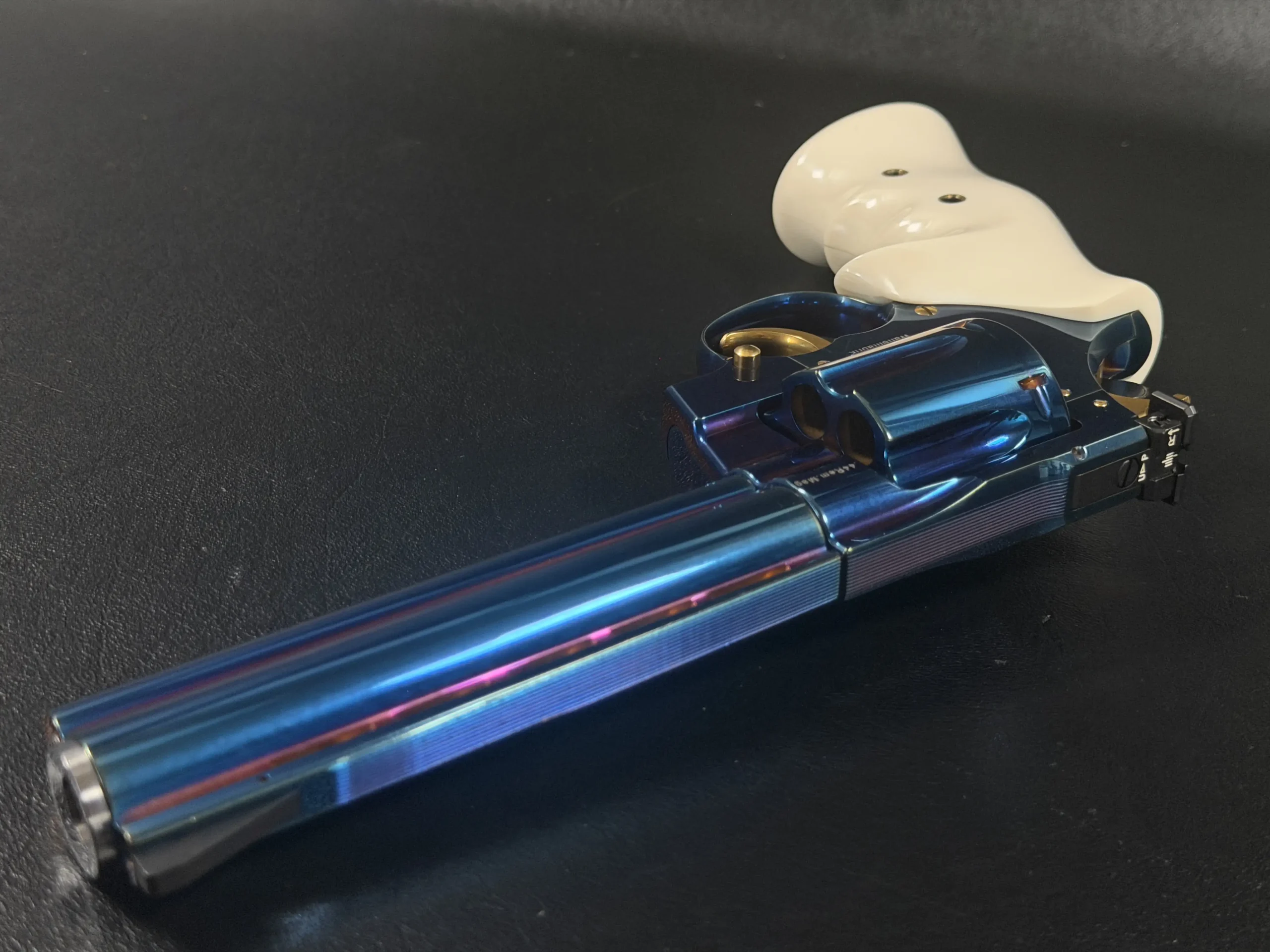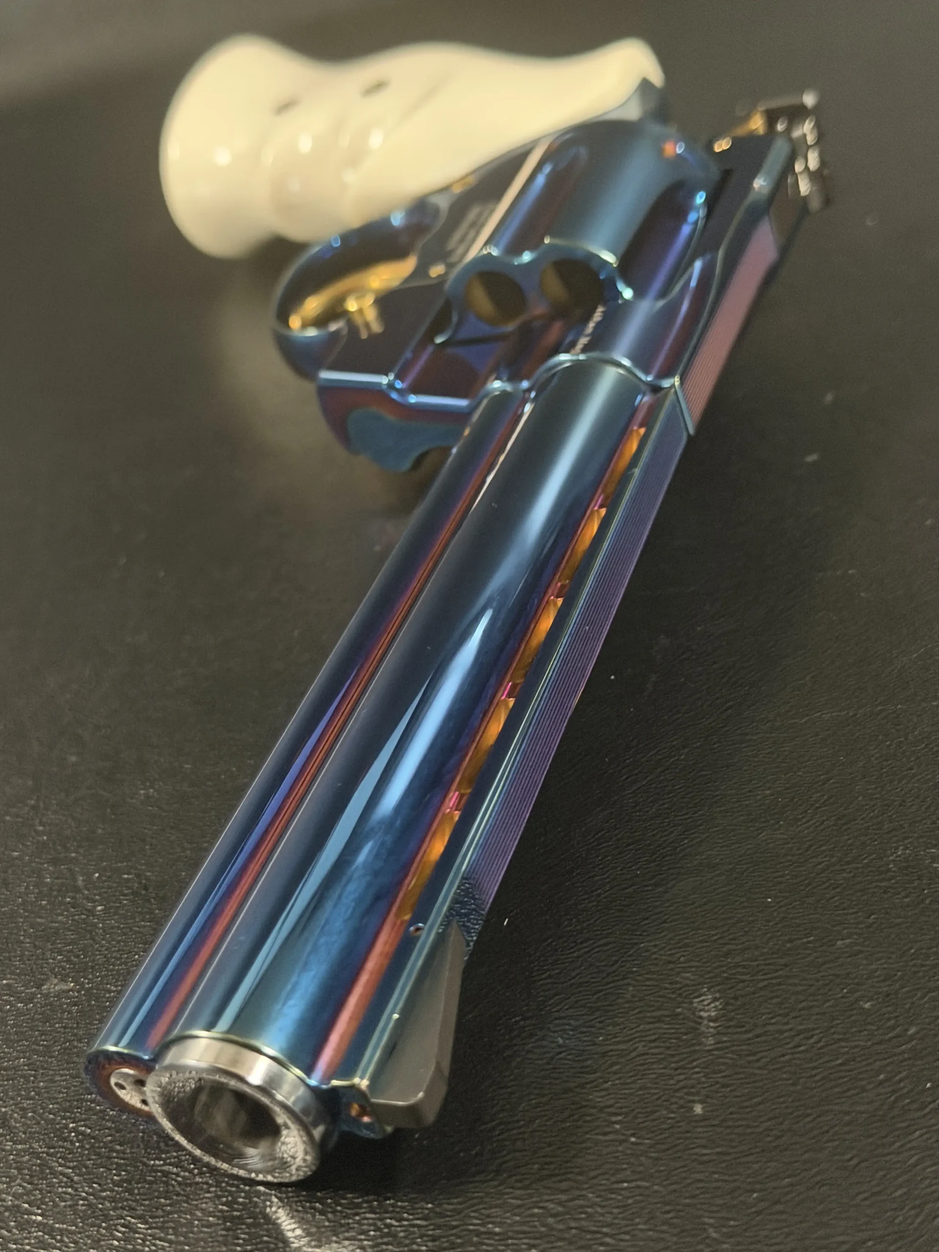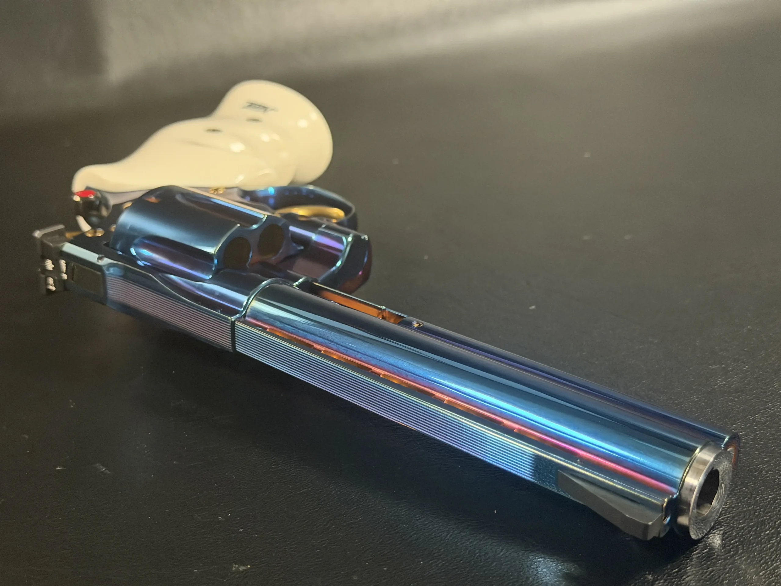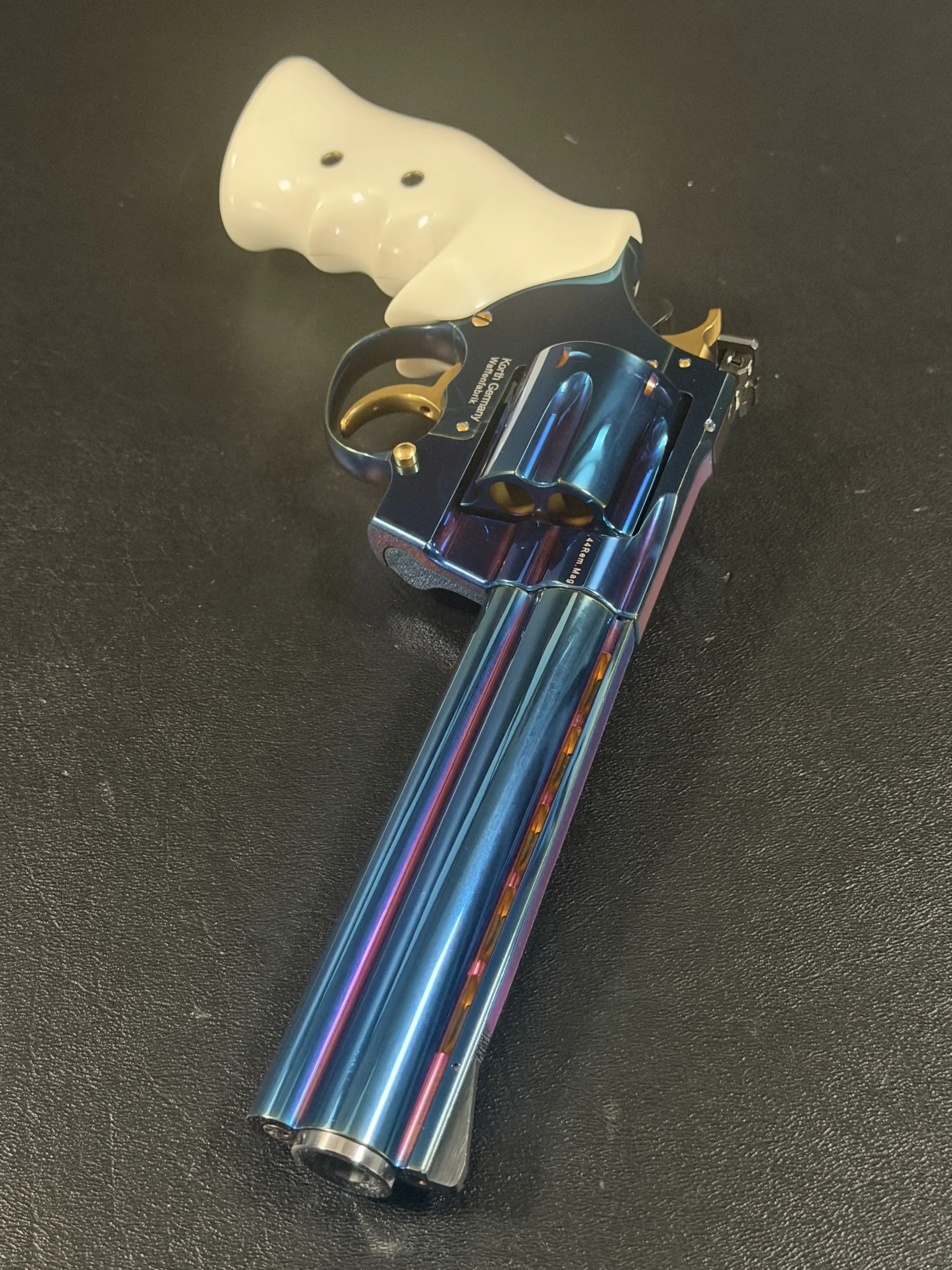 Finished in a vivid multi-spectrum Physical Vapor Deposition (PVD) treatment, the revolver displays a dynamic interplay of deep sapphire blues, violets, and oil-slick iridescence that shift with light and angle. This high-polish finish is executed to Korth’s exacting standards, accentuating the revolver’s sculpted lines, ventilated rib, and precision-machined contours.