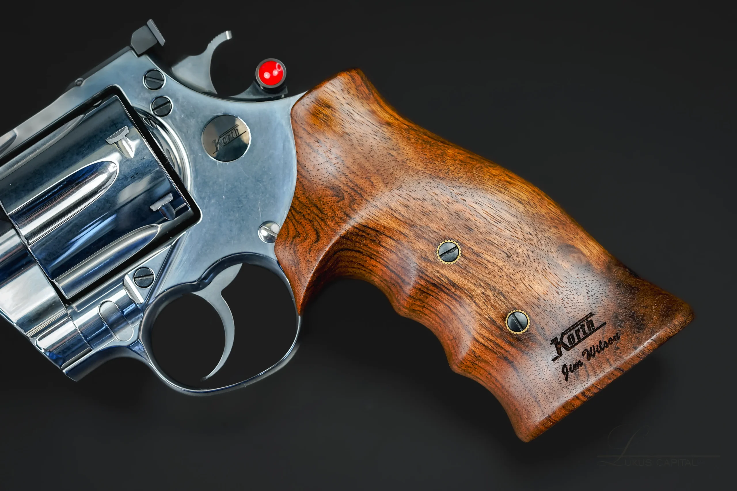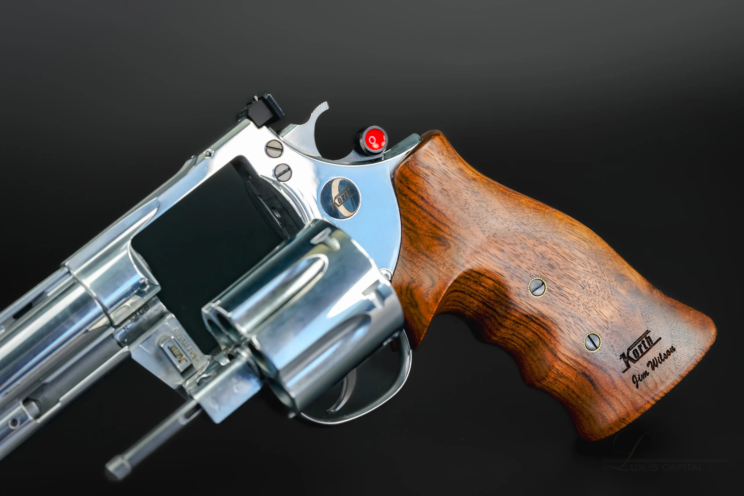 One of the most striking visual contrasts comes from the grips. Richly figured walnut with deep natural grain patterns adds warmth against the cool stainless steel. The ergonomic shaping fills the hand comfortably, and the inlaid Korth medallion alongside the factory grip inscription underscores its authenticity and presentation-grade status. It’s a pairing of materials that feels both functional and refined, exactly what Korth has always done best.