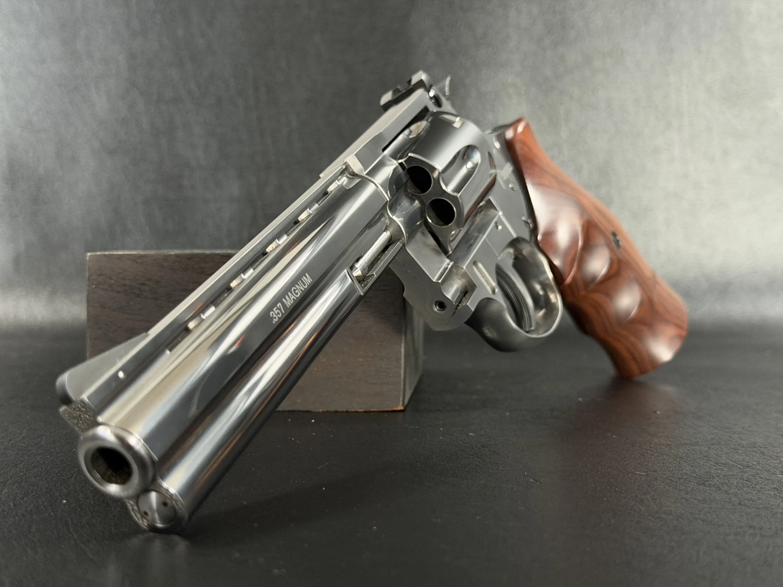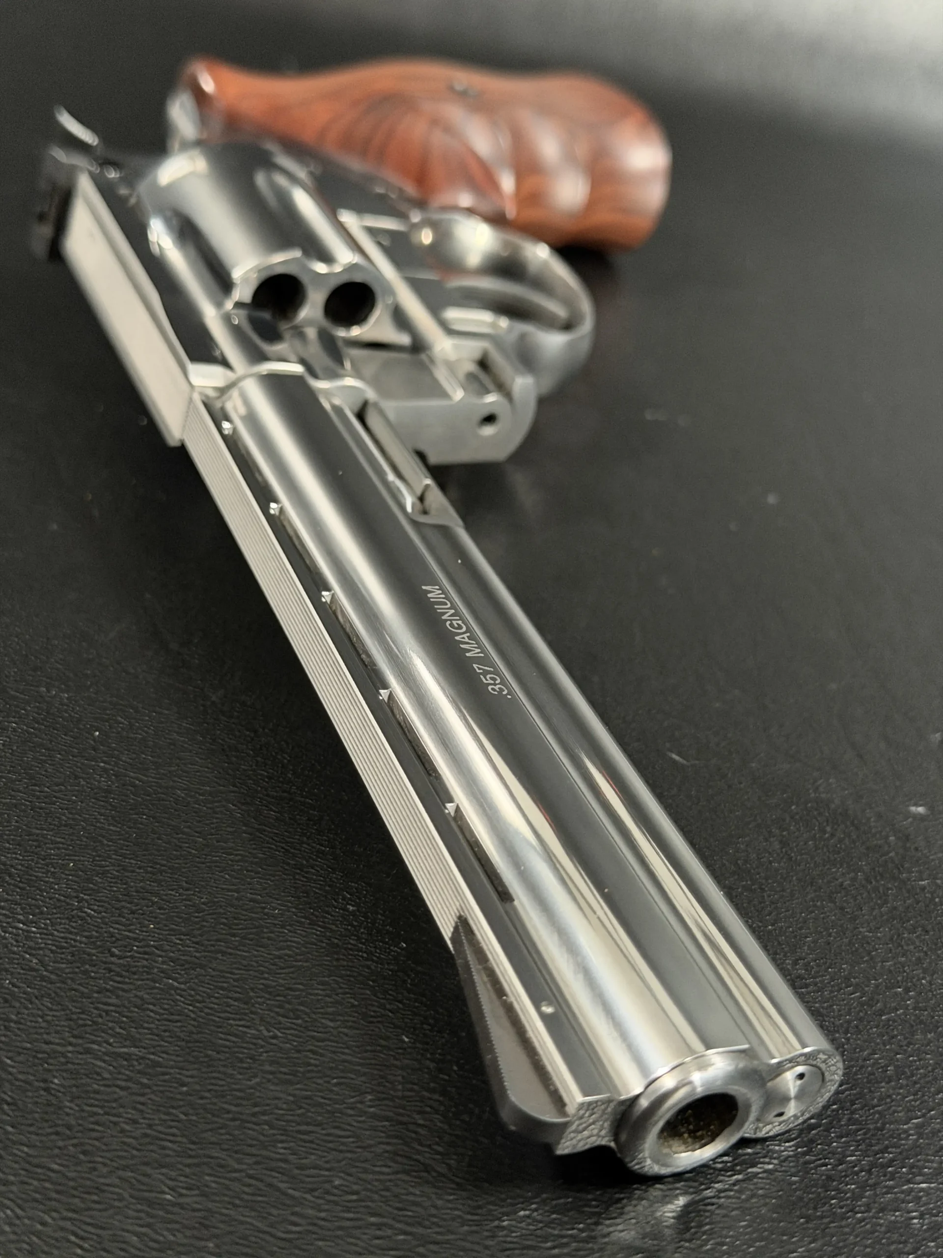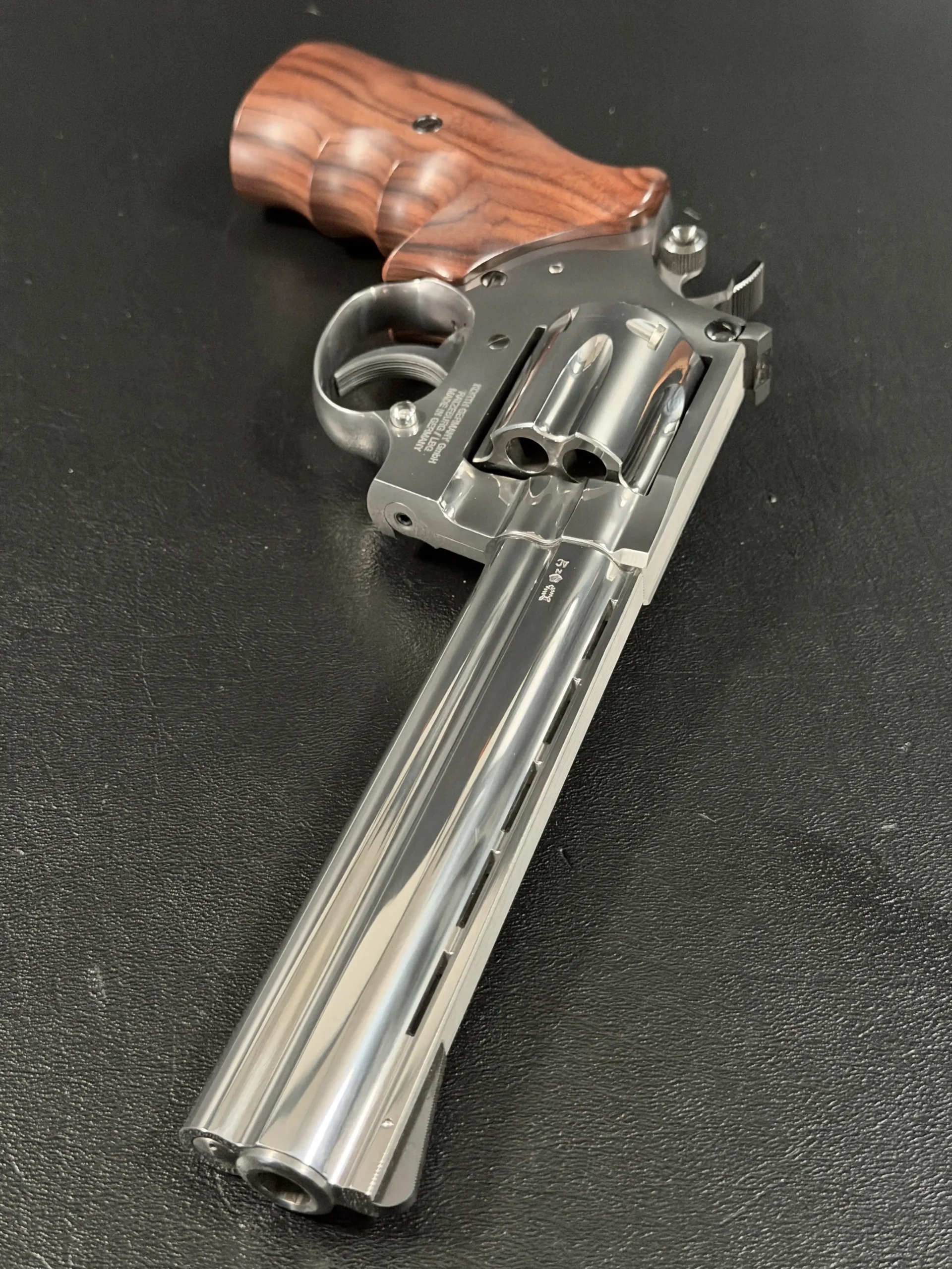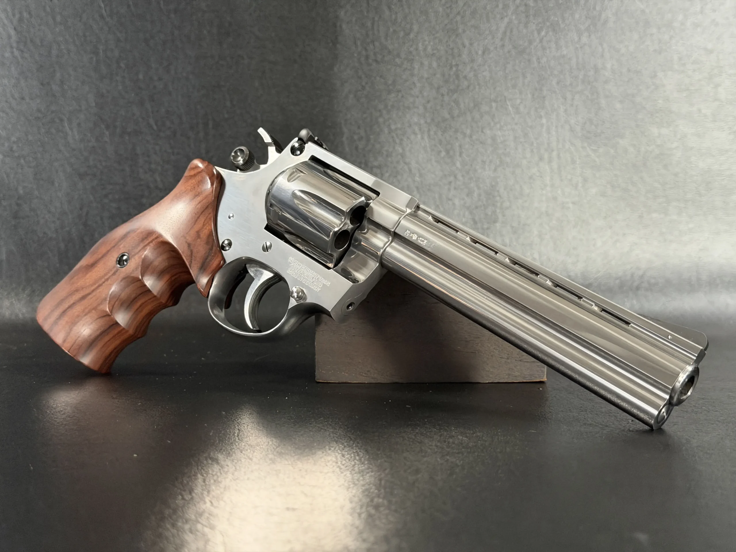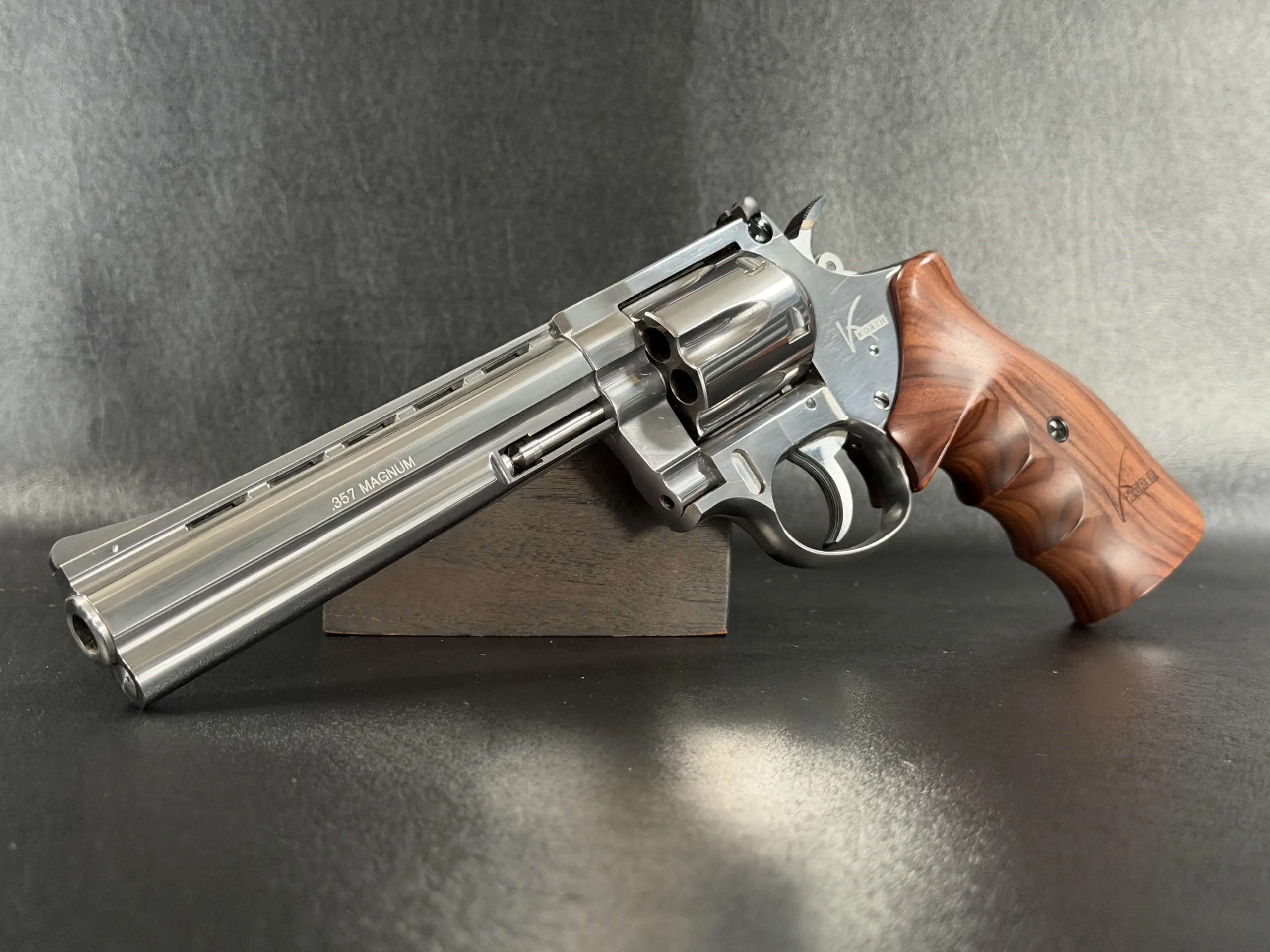 Built on Korth’s legendary Combat platform and chambered in .357 Magnum, this revolver represents the pinnacle of German revolver engineering, elevated even further by its exceptionally rare plasma finish, a treatment seldom seen and even less frequently encountered in this configuration. The result is a surface that dances between brushed satin and liquid metallic depth, shifting character as light moves across its contours.