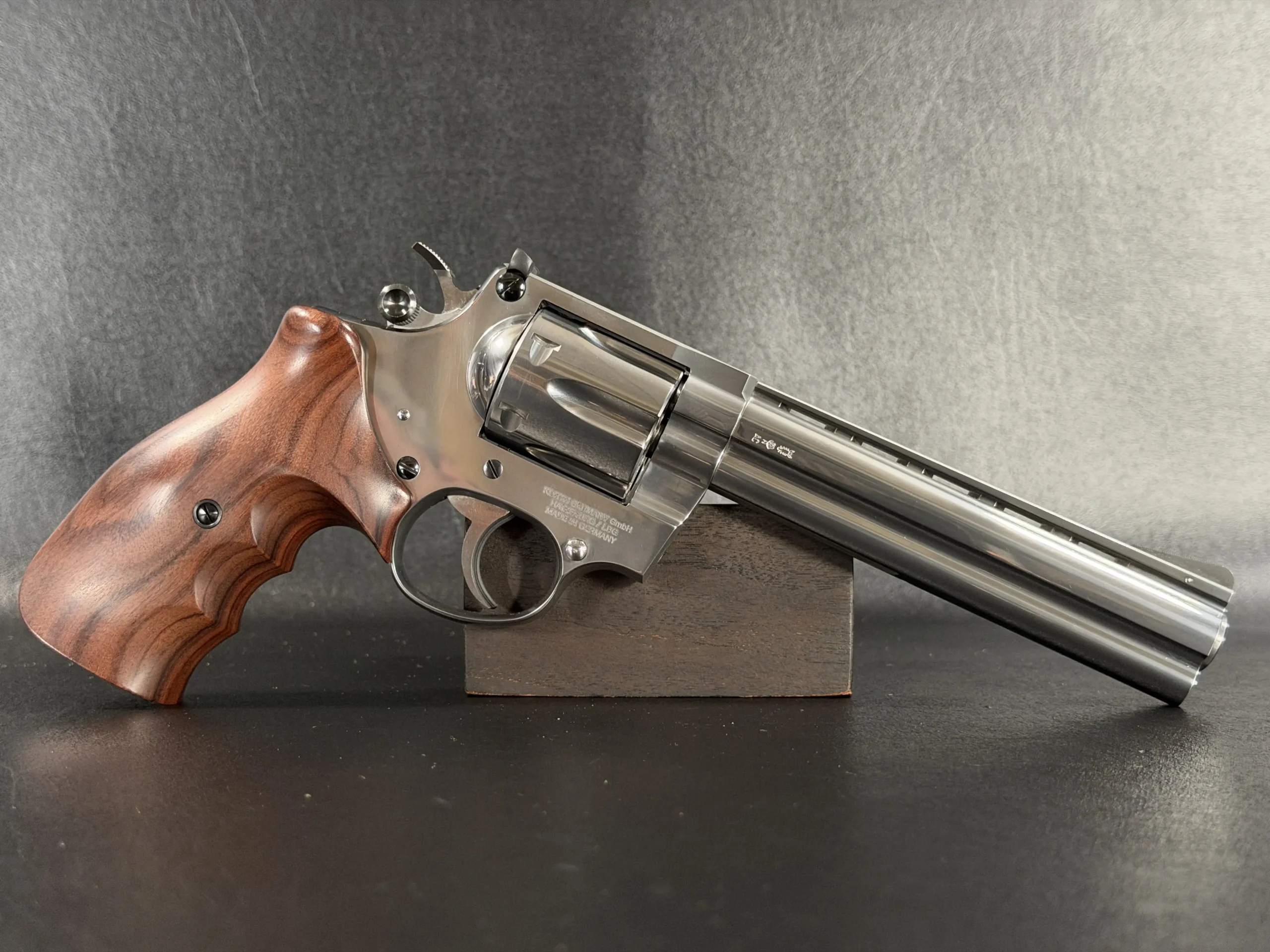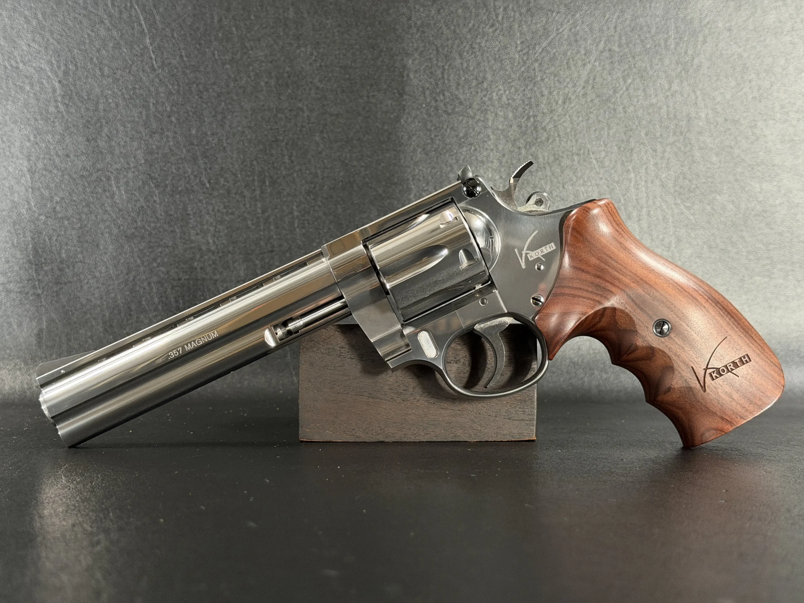 Every interface, from the cylinder release to the crane fitment, exhibits the hand-fitted tolerances that made Korth revolvers the benchmark of European wheelgun craftsmanship.