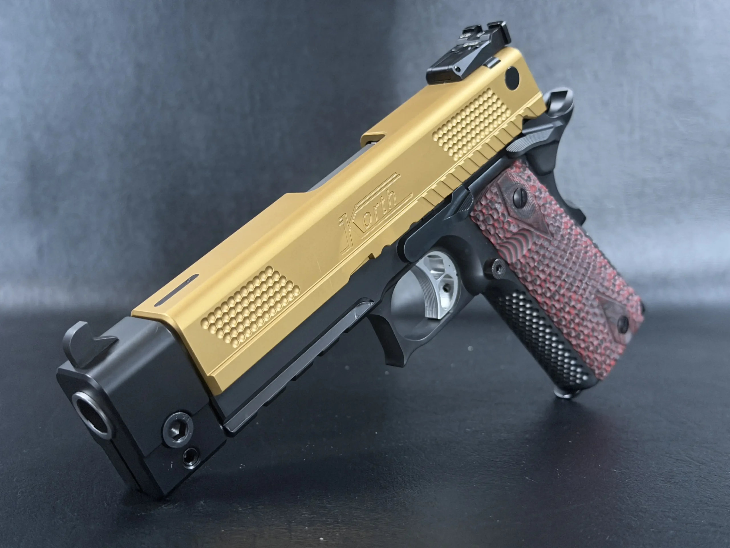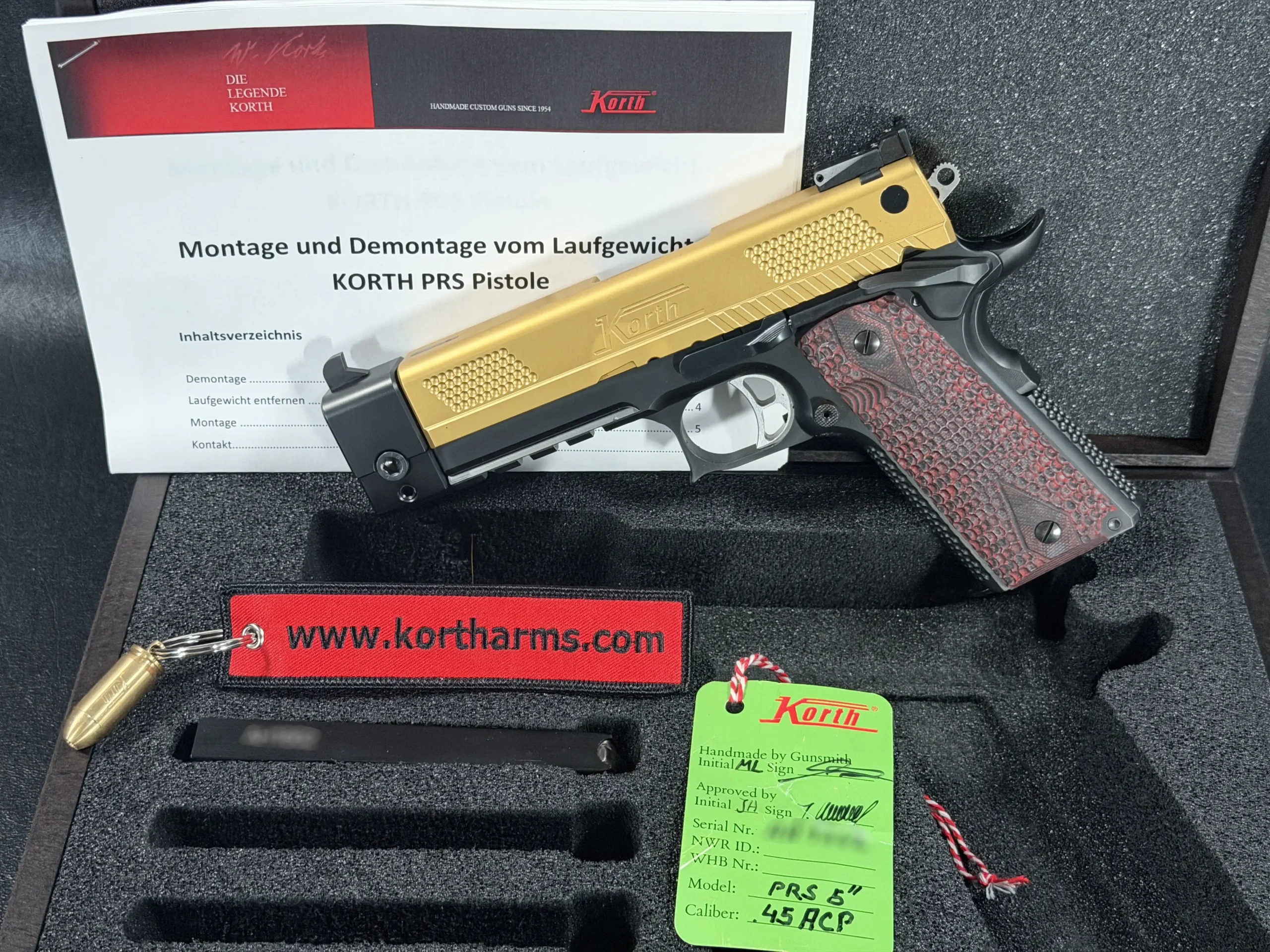 The Korth Gold and Black PRS 5” in .45 ACP stands as a striking fusion of precision engineering and unmistakable visual presence, an embodiment of Korth’s relentless pursuit of mechanical perfection paired with bold aesthetic execution. Built within the revered PRS platform, this pistol reflects the German maker’s commitment to competition-grade performance while elevating the concept into the realm of functional artistry.