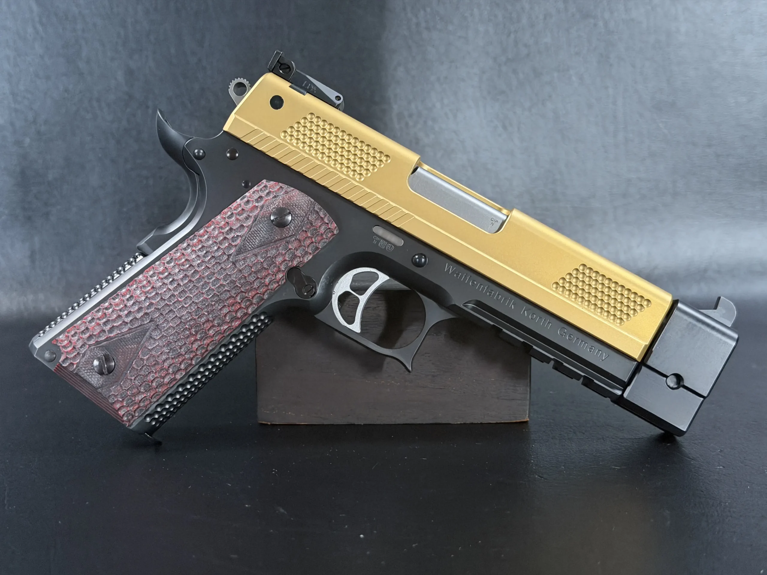Visually, the pistol commands immediate attention through its rich gold-finished slide, a dramatic contrast to the deep black frame and controls. The interplay of finishes accentuates the PRS’s sculpted lines, forward serrations, and signature Korth machining details, giving the pistol a presence that is equally at home in a high-end collection display as it is on the firing line. The textured grip panels add both visual depth and functional purchase, complementing the two-tone theme while ensuring confident handling.