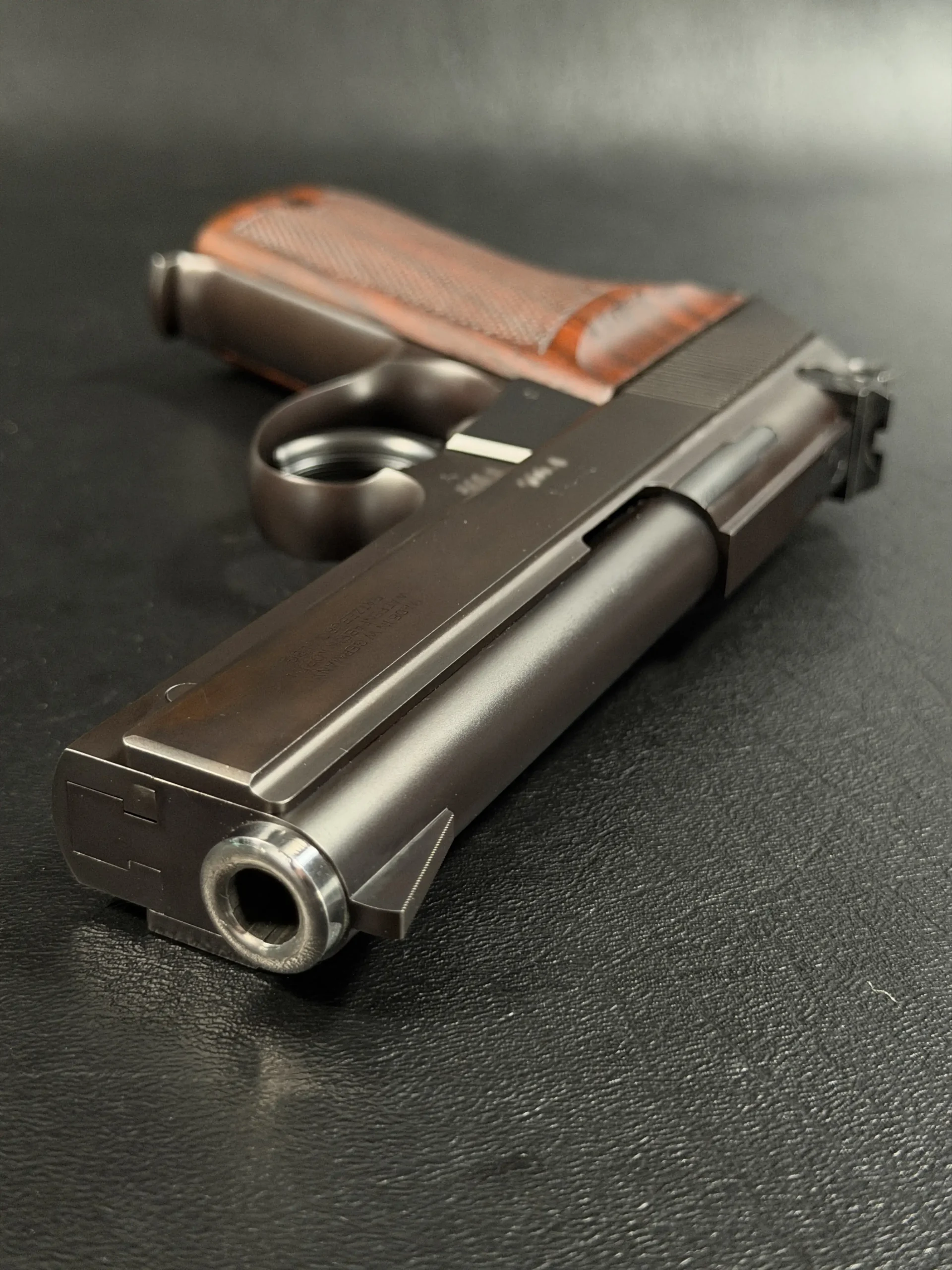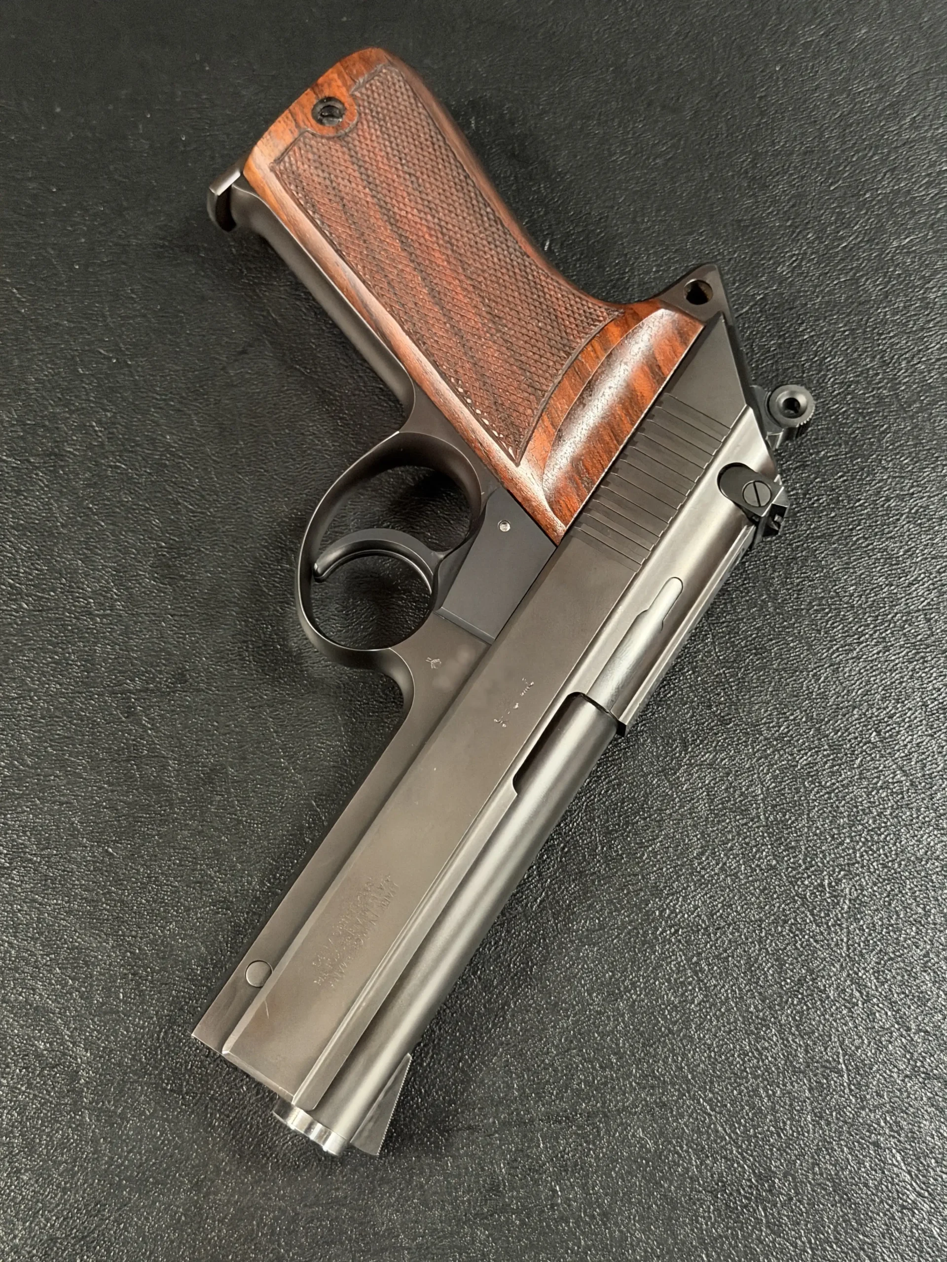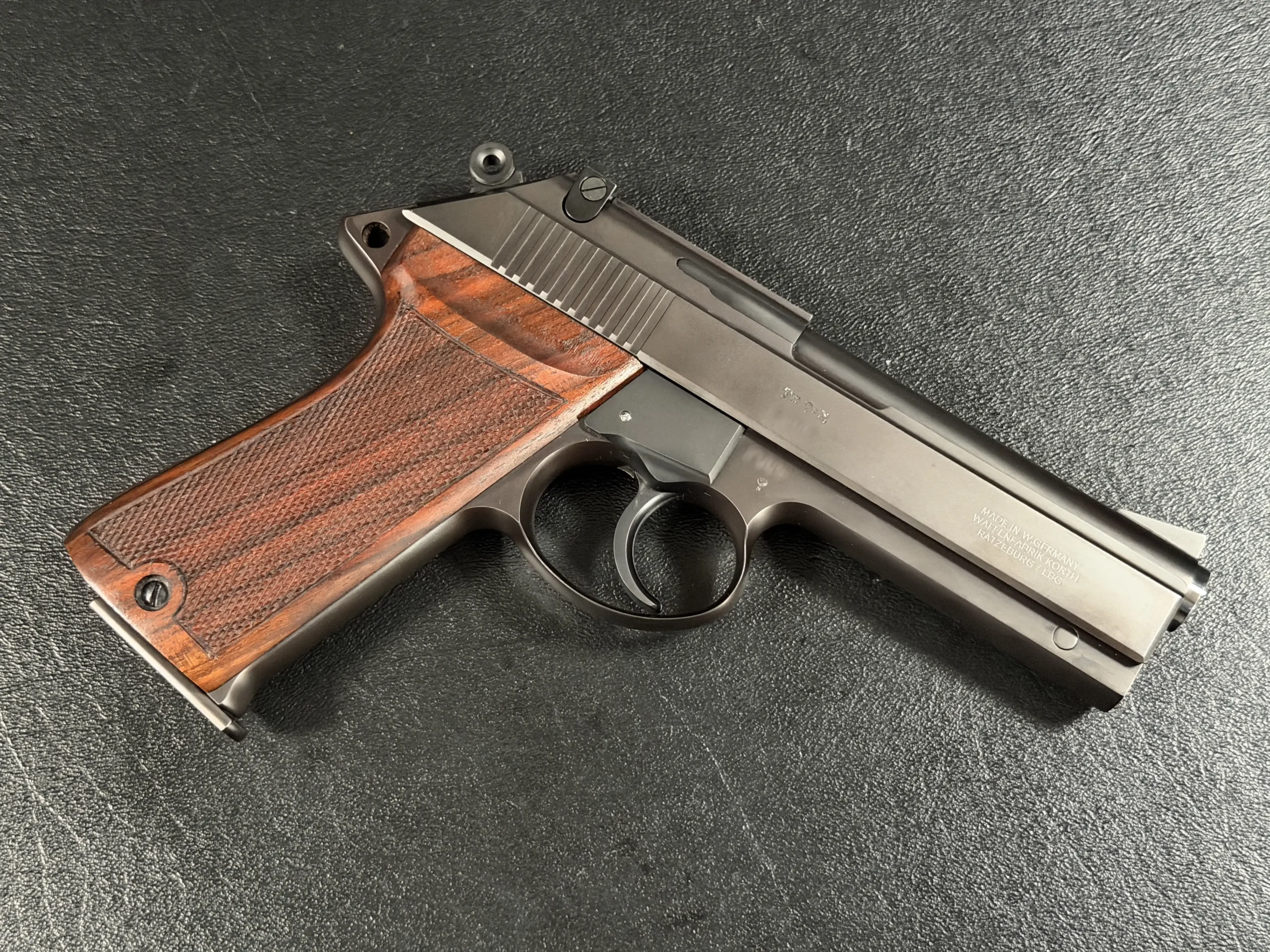 What immediately stands out is the balance between the two forms. The semi-auto carries the unmistakable Korth profile, clean, almost architectural lines; a bank-vault slide fit; and walnut grips sculpted with the subtle taper and checkering that defined the early craftsmen of Ratzeburg and later Lollar. Its matte-blued finish, deep and even, absorbs light rather than reflecting it, giving the pistol an understated sophistication.