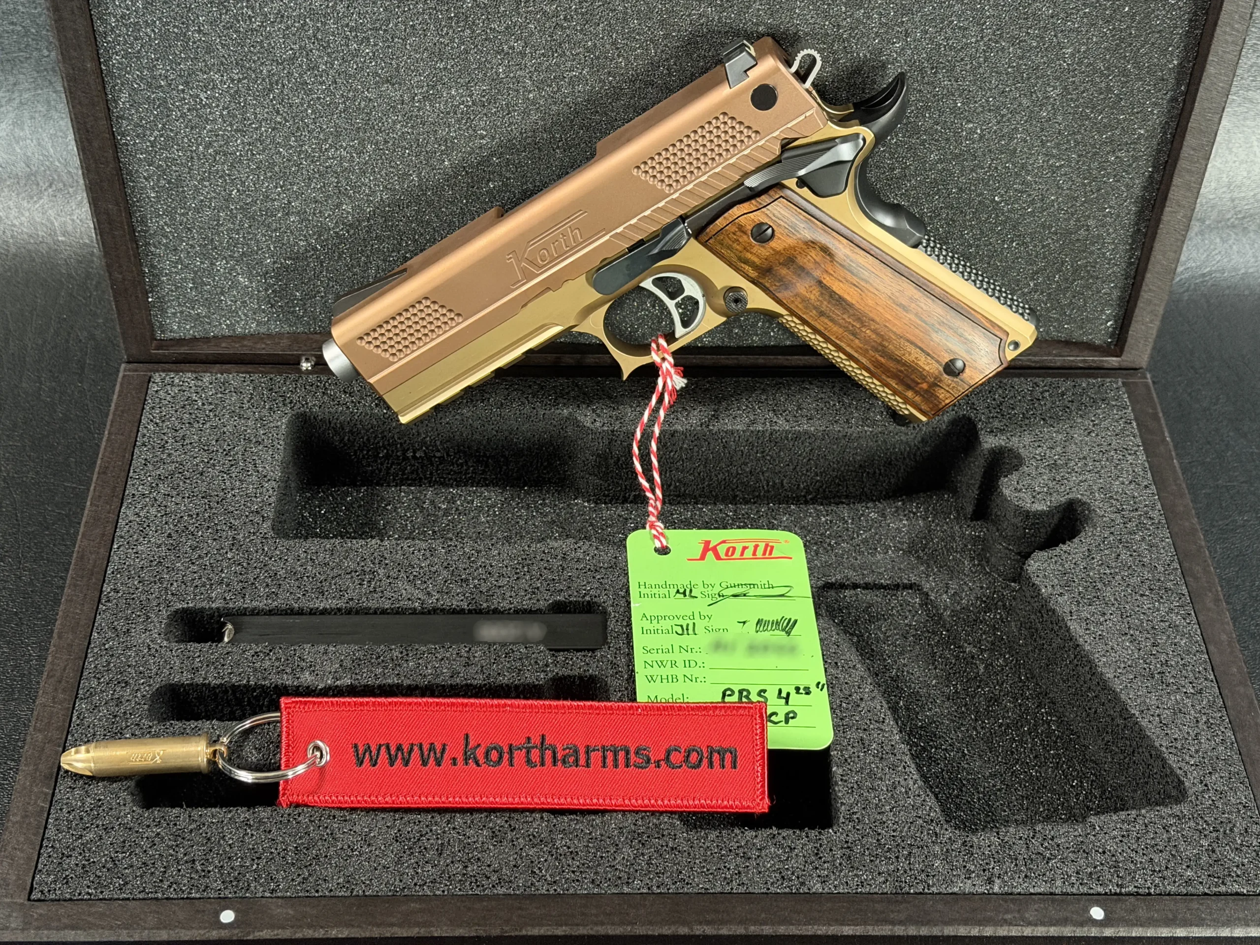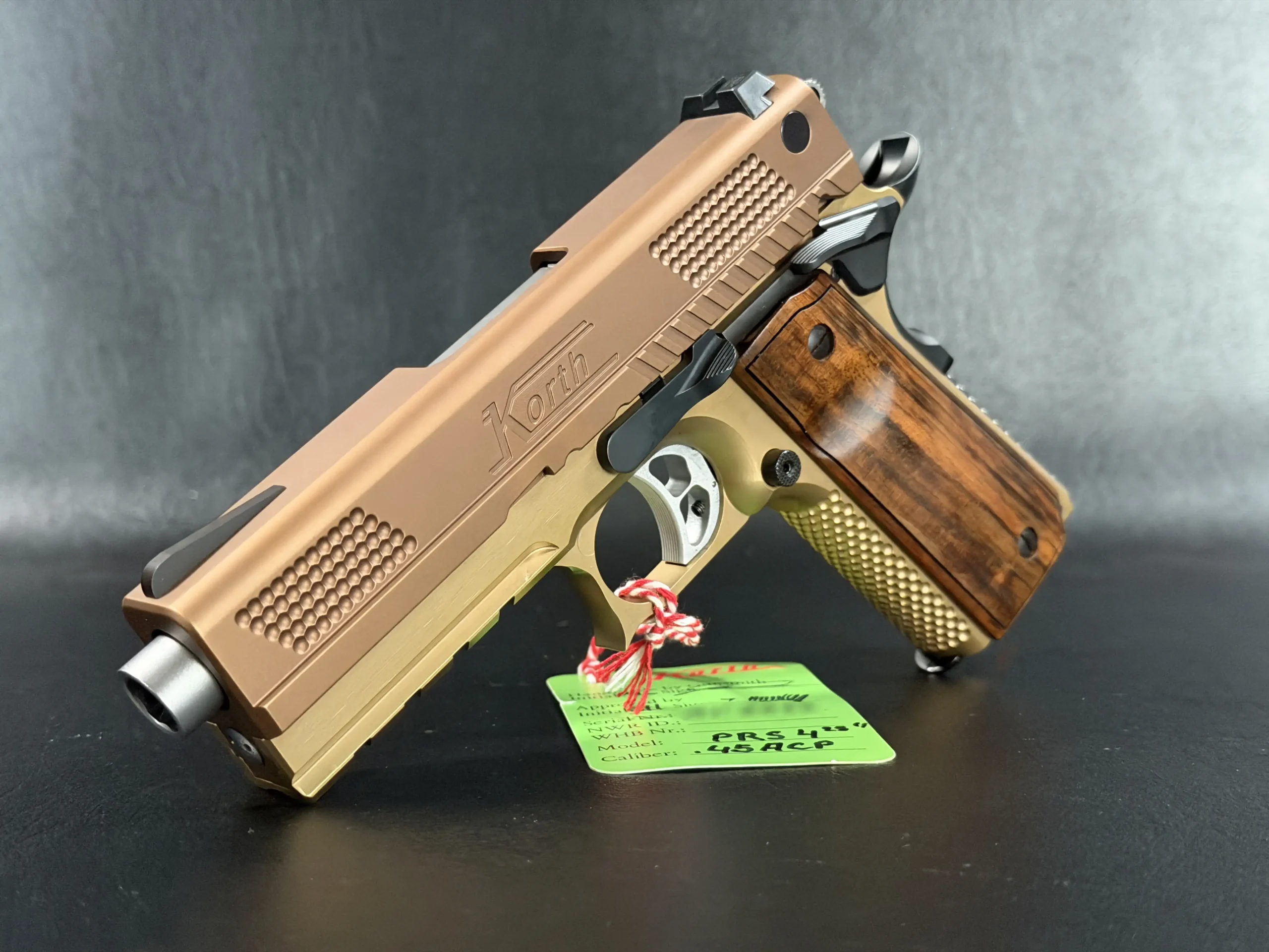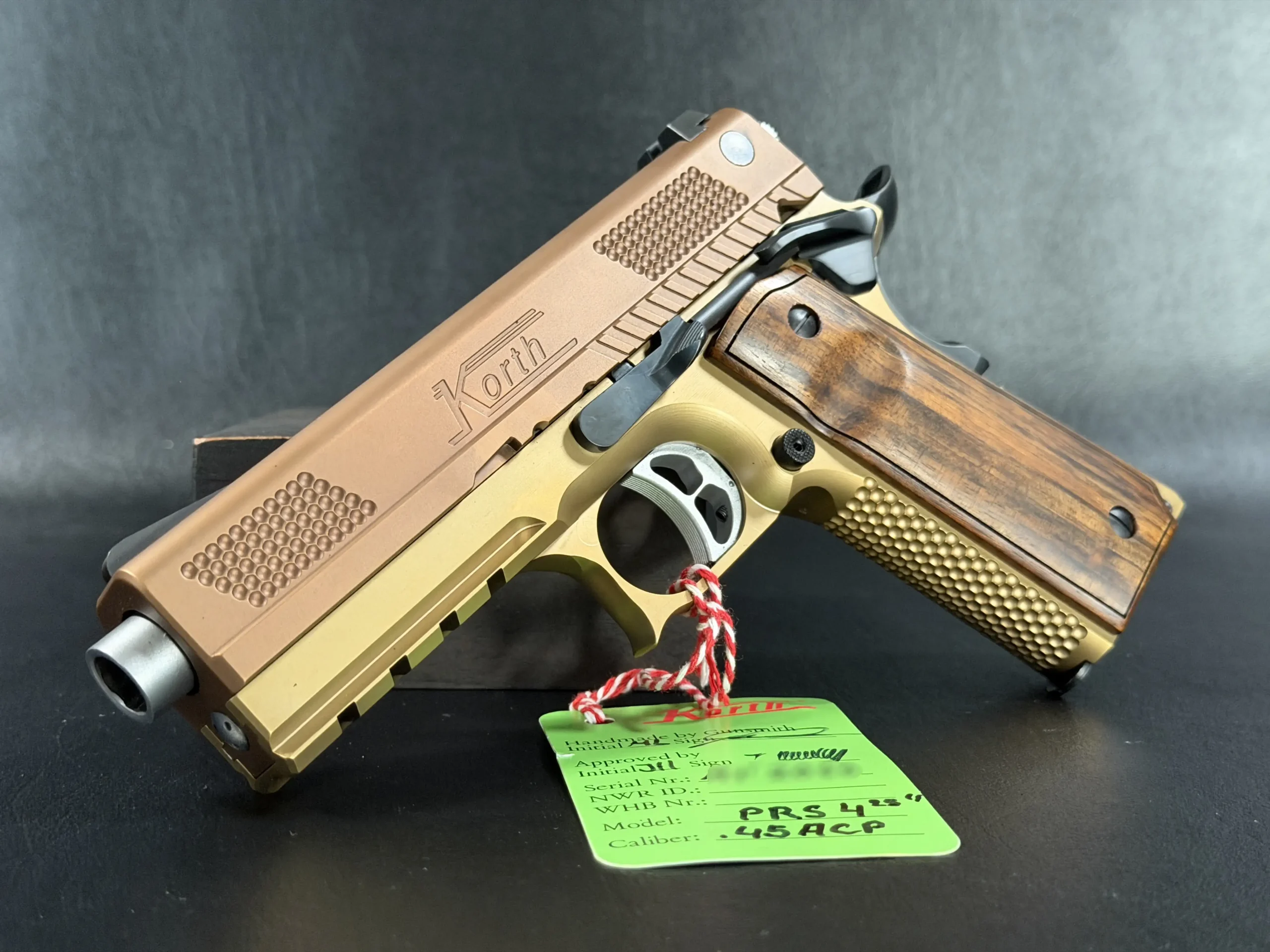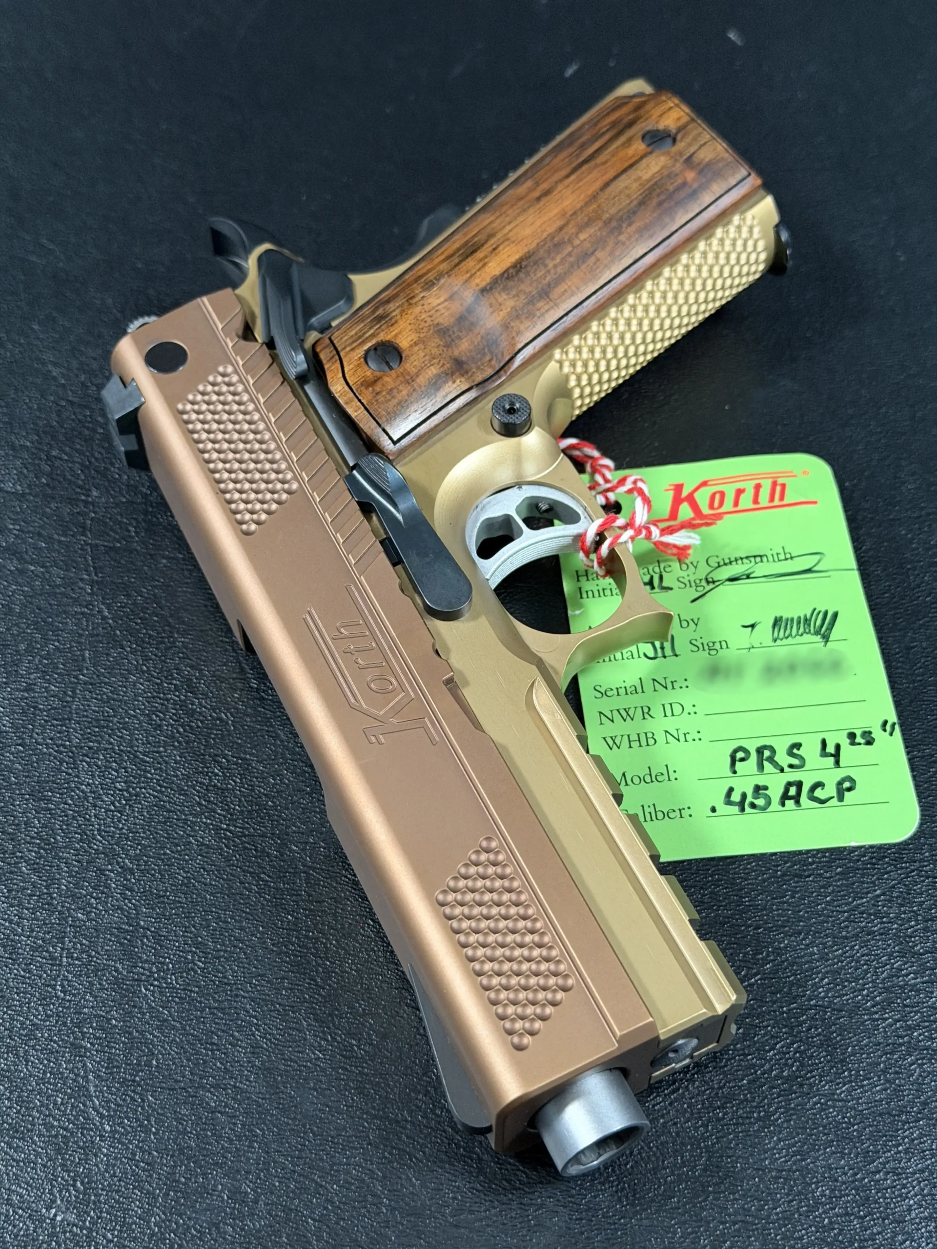 The 4.25-inch configuration gives this PRS a compact, purposeful profile, while the two-tone finish sets it apart immediately. The warm brown slide contrasts beautifully against the gold-toned frame, creating a layered look that feels both modern and unmistakably European. Under light, the finishes shift subtly, revealing the depth and texture of Korth’s surface work rather than a flat, uniform coat.